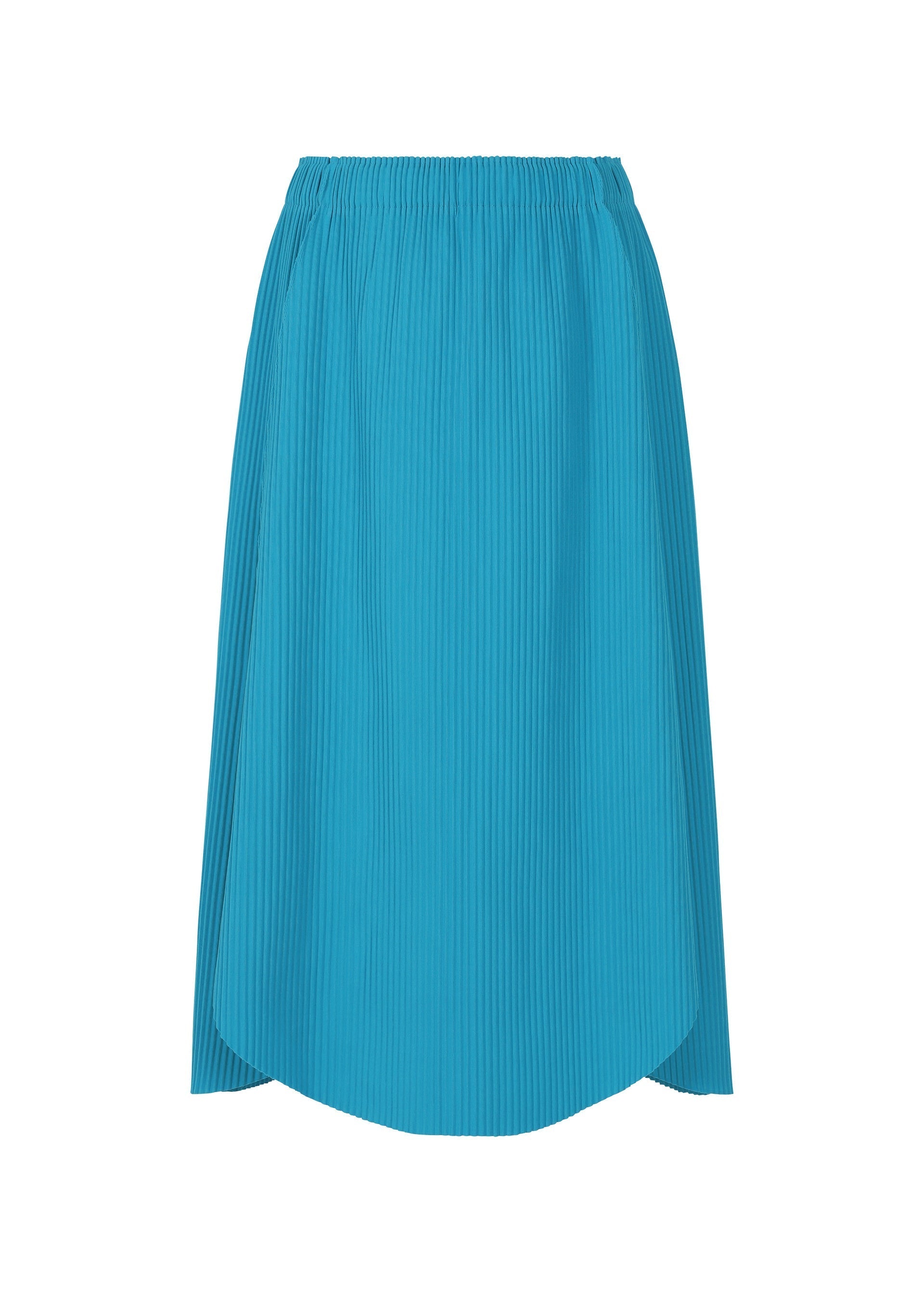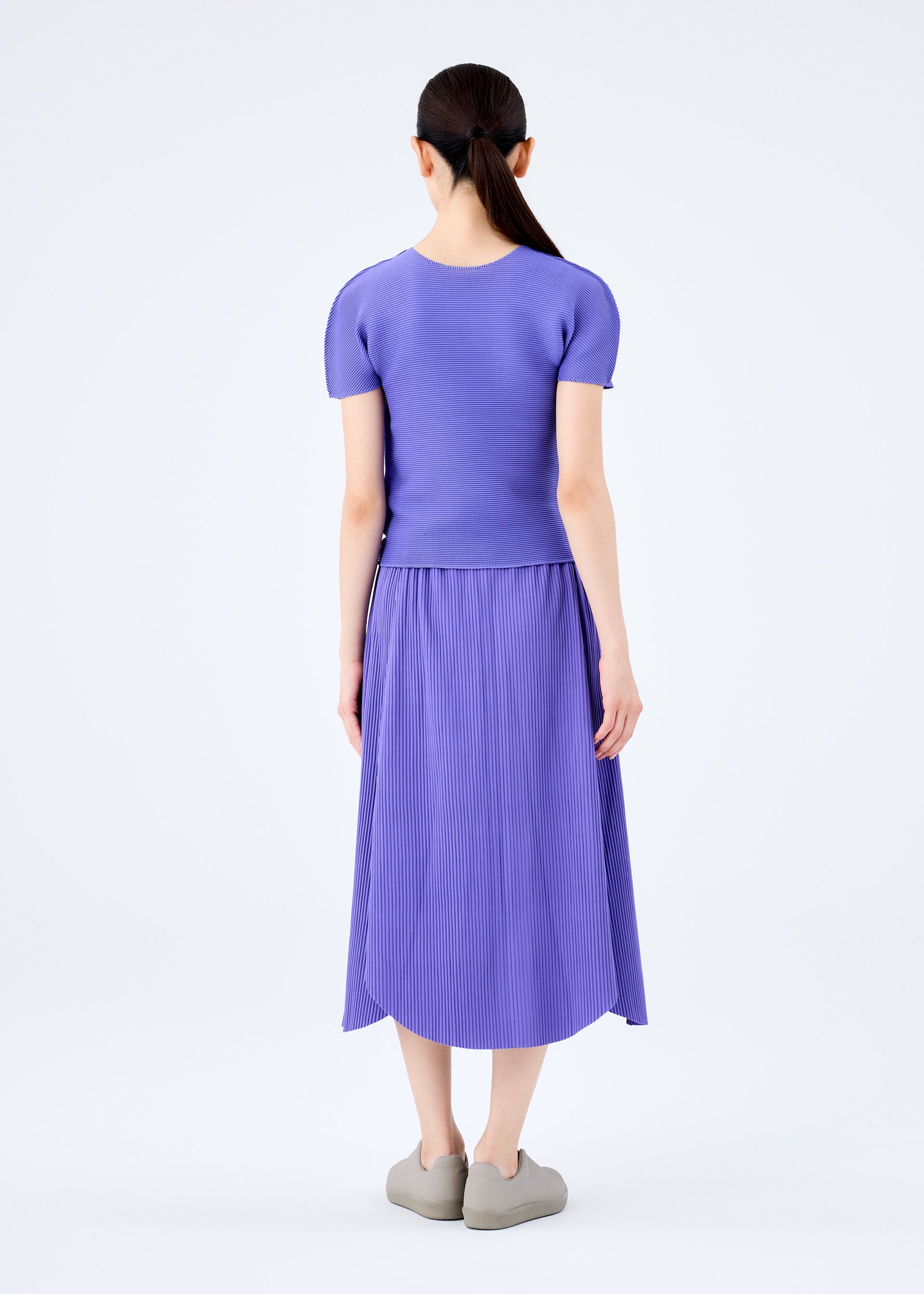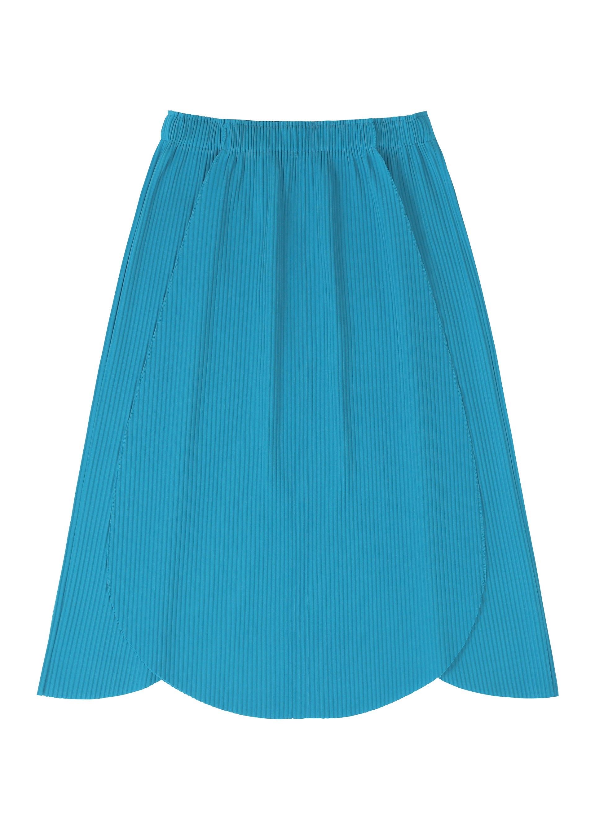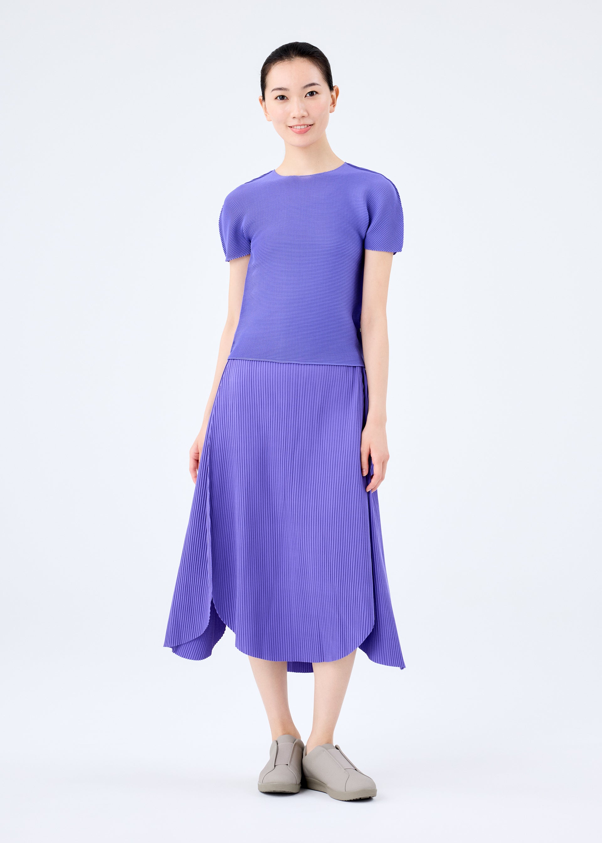 This FINE KNIT PLEATS skirt is characterized by its lightweight, soft feel and features pleats applied to knit material made with stretchy, thin, soft yarn. The design resembling four clover leaves joined together creates a moderate voluminous feel and a three-dimensional silhouette.