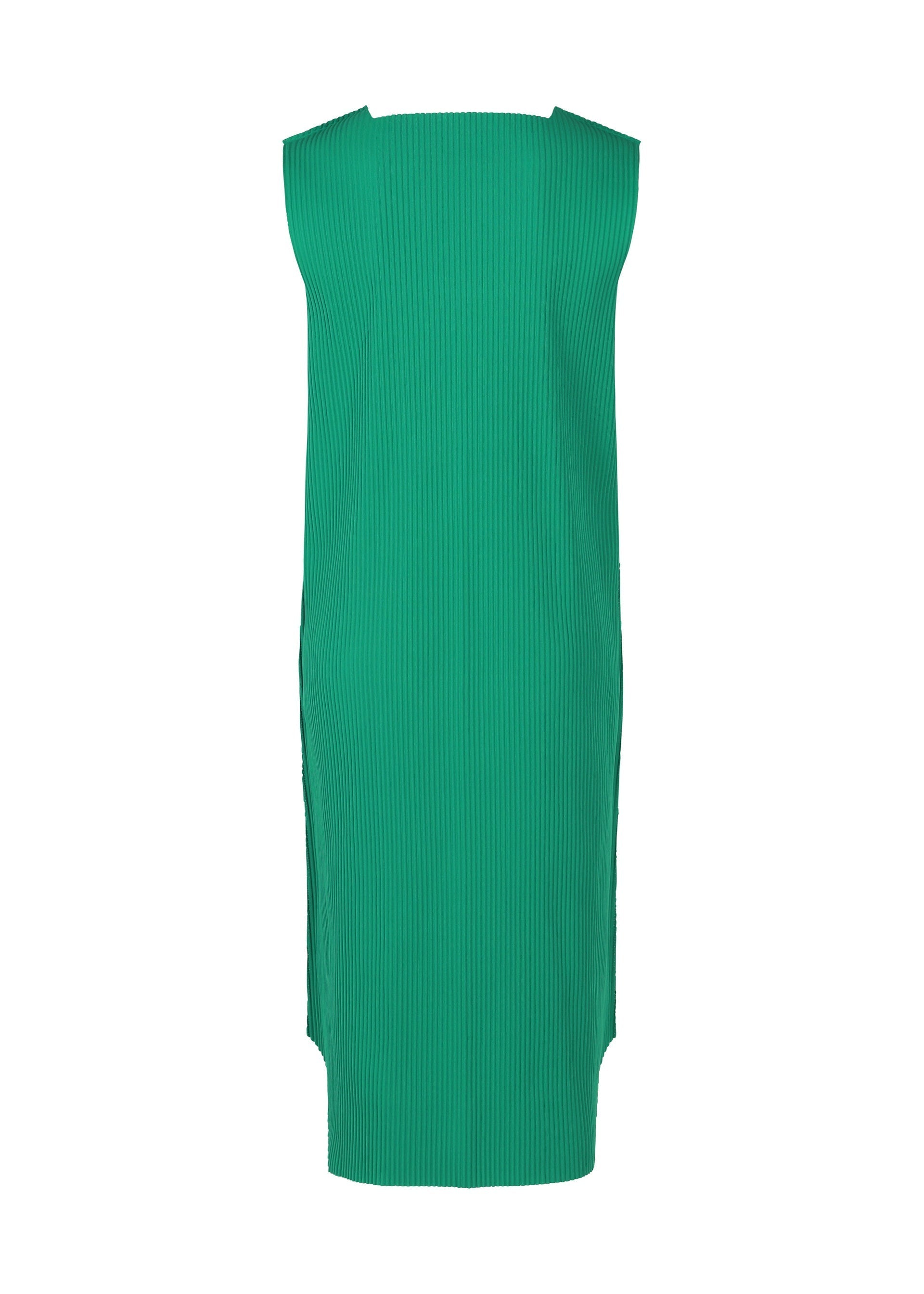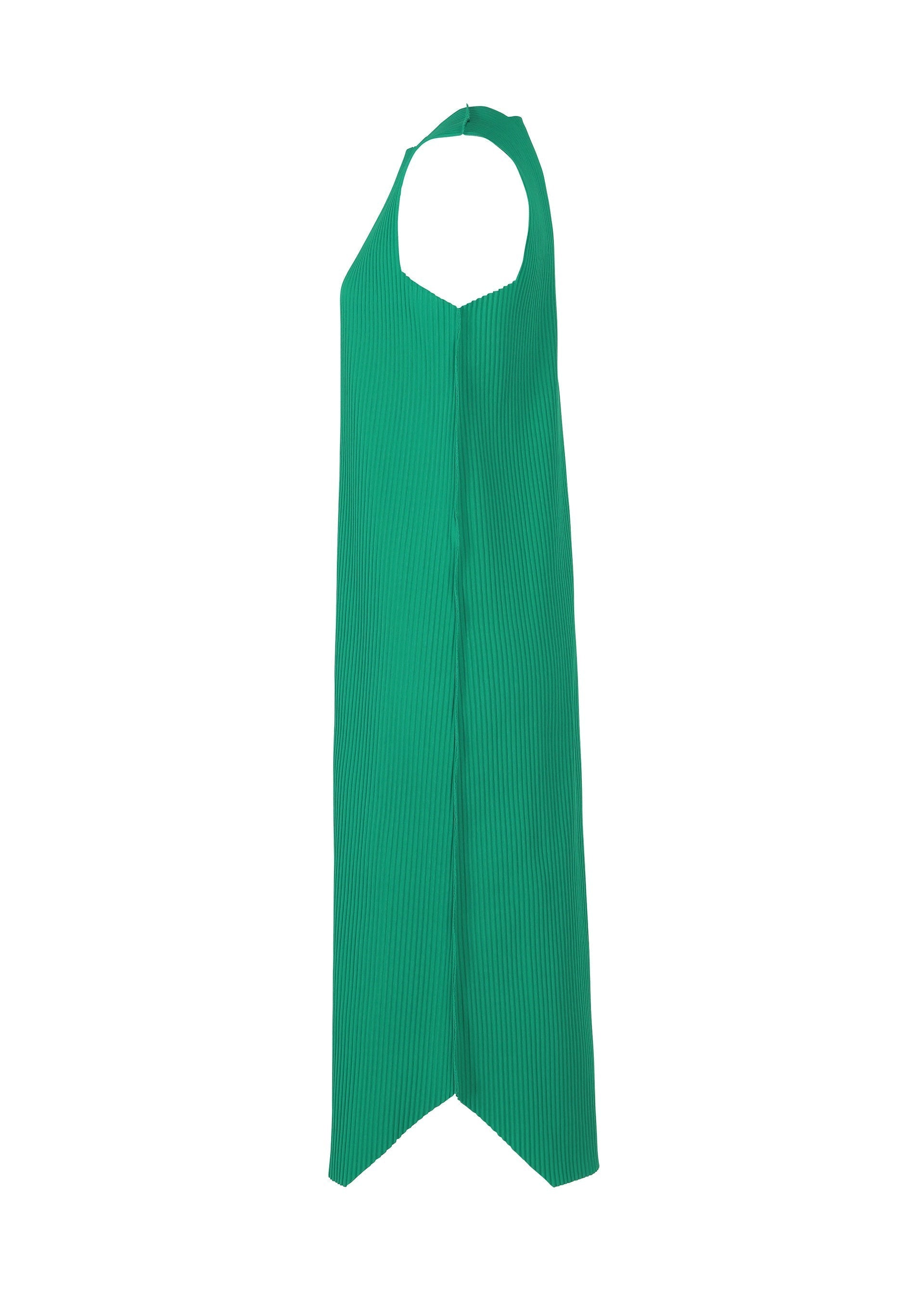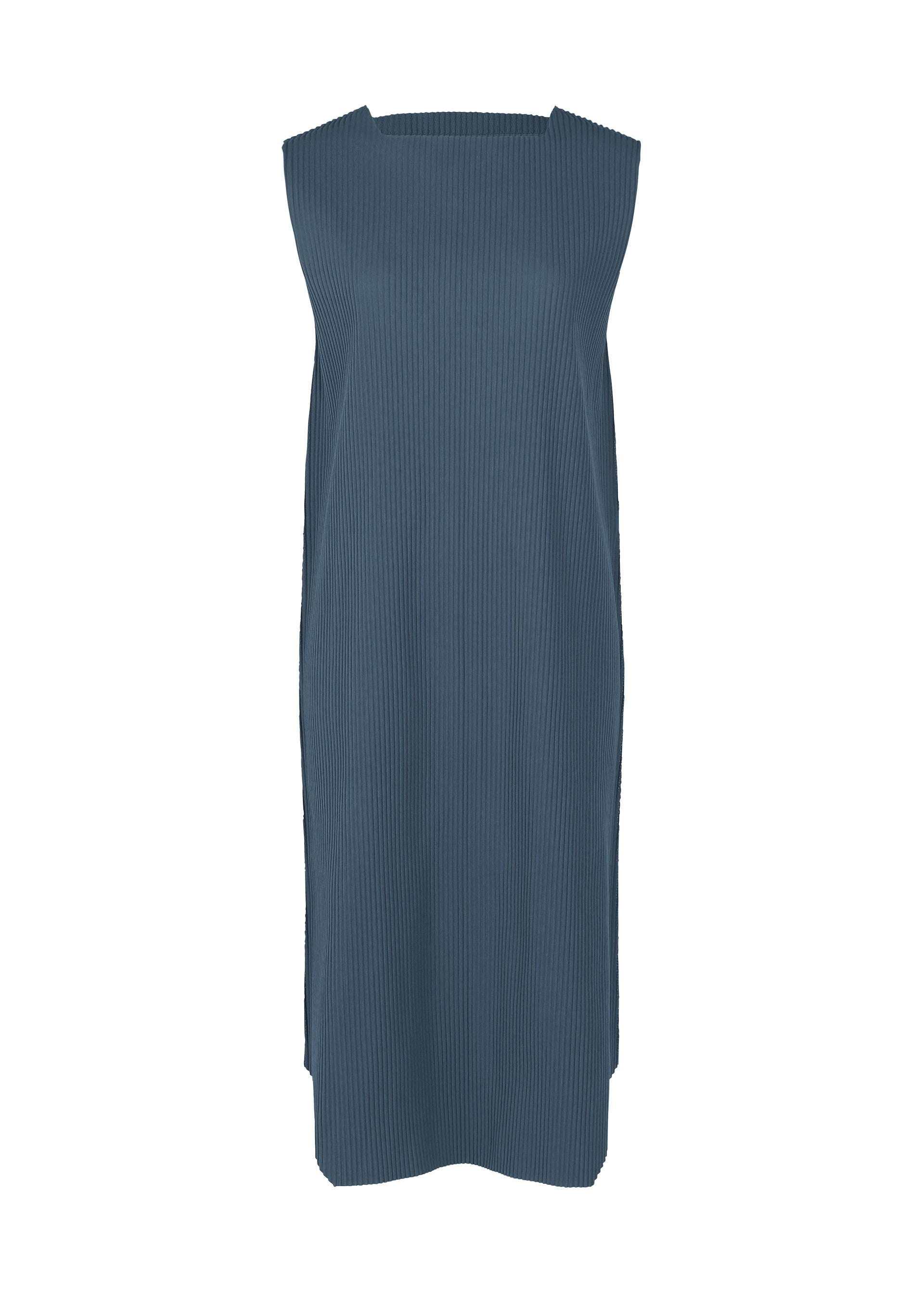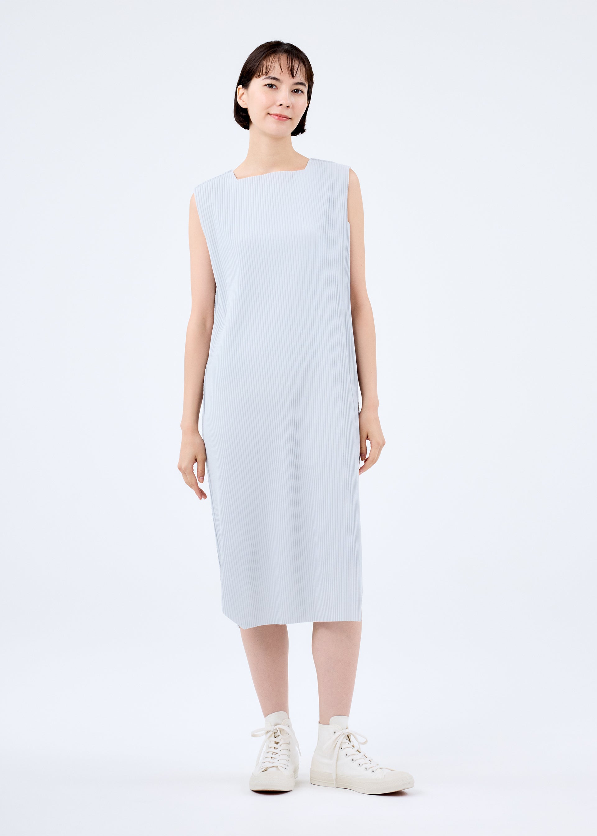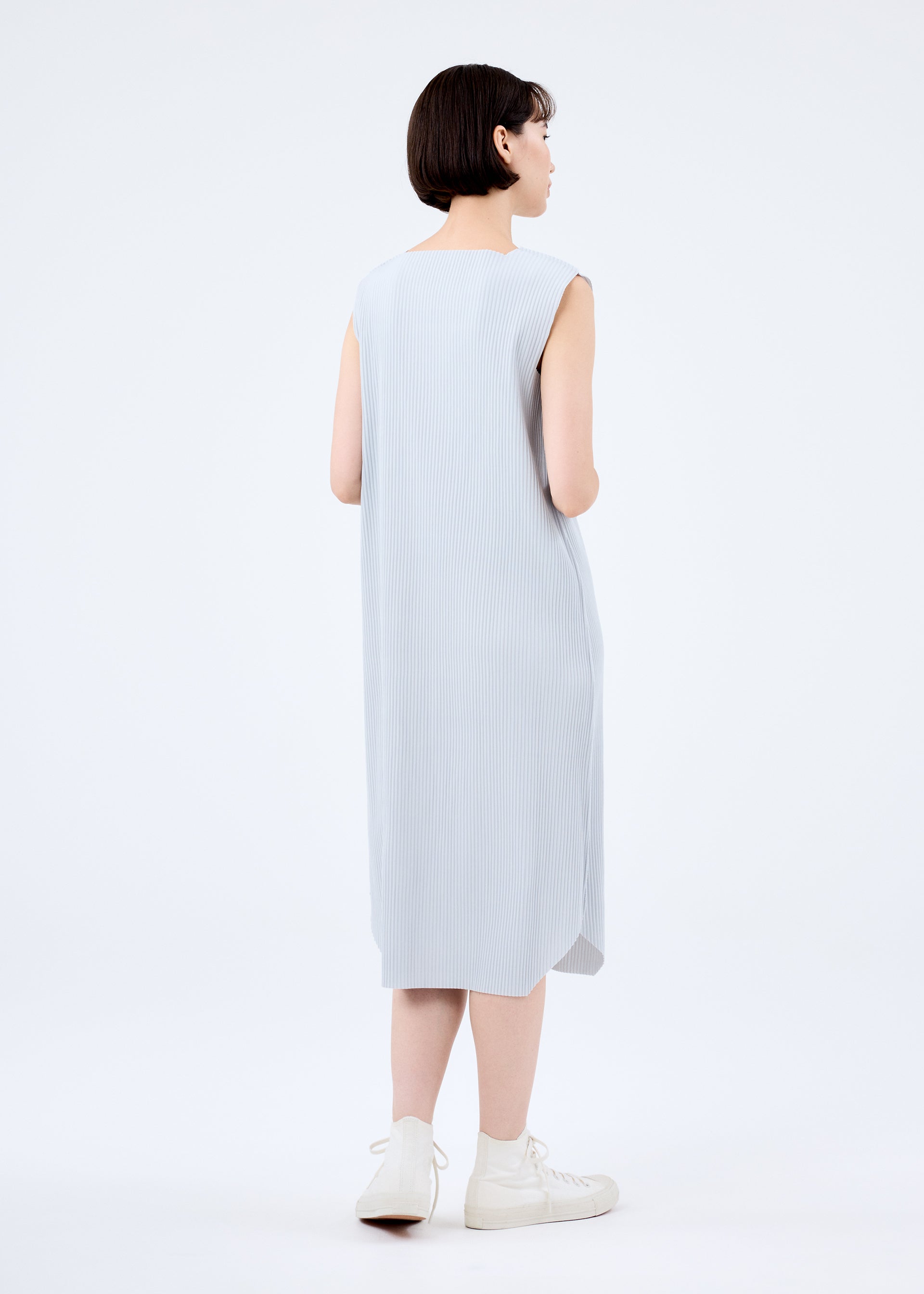 A fine knit pleated dress that is made from a thin, stretchy yarn that is pleated and is lightweight and soft to the touch. The design of the hem with rounded corners gives it a sharp impression with the image of a jewel.