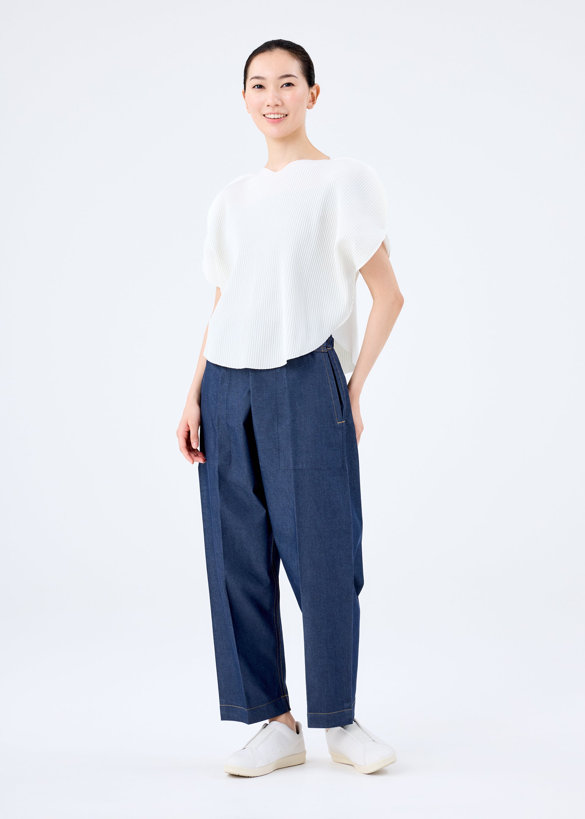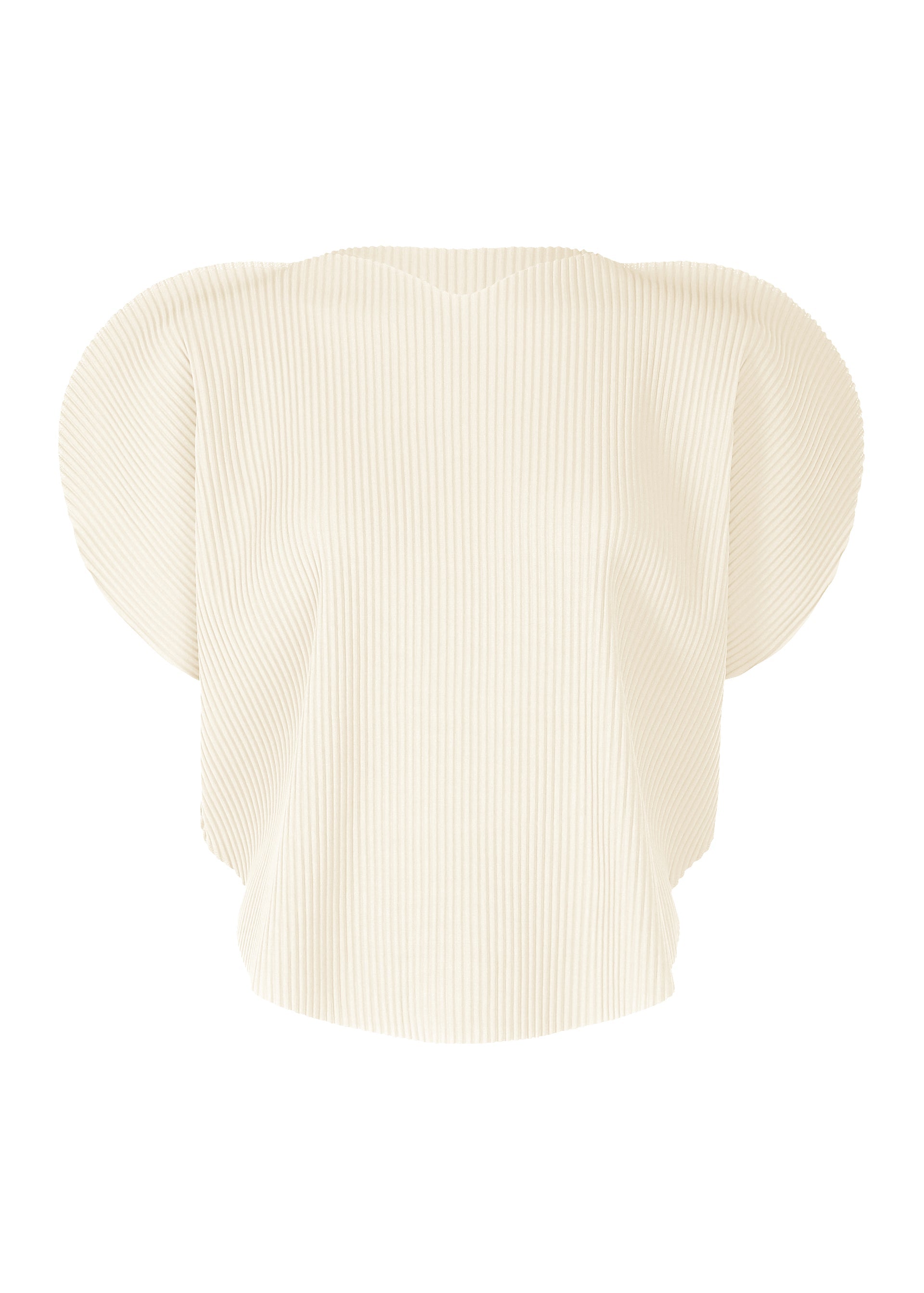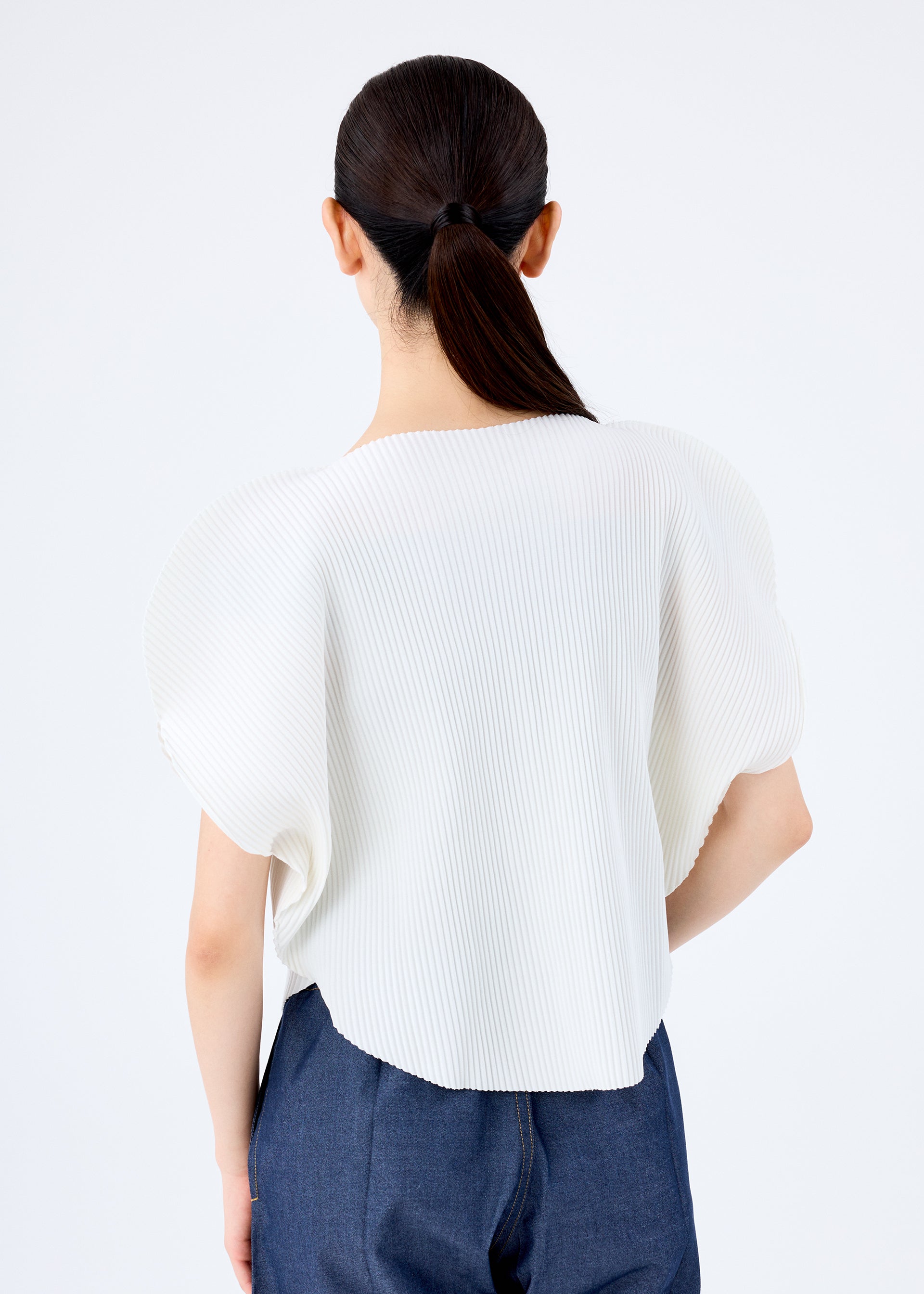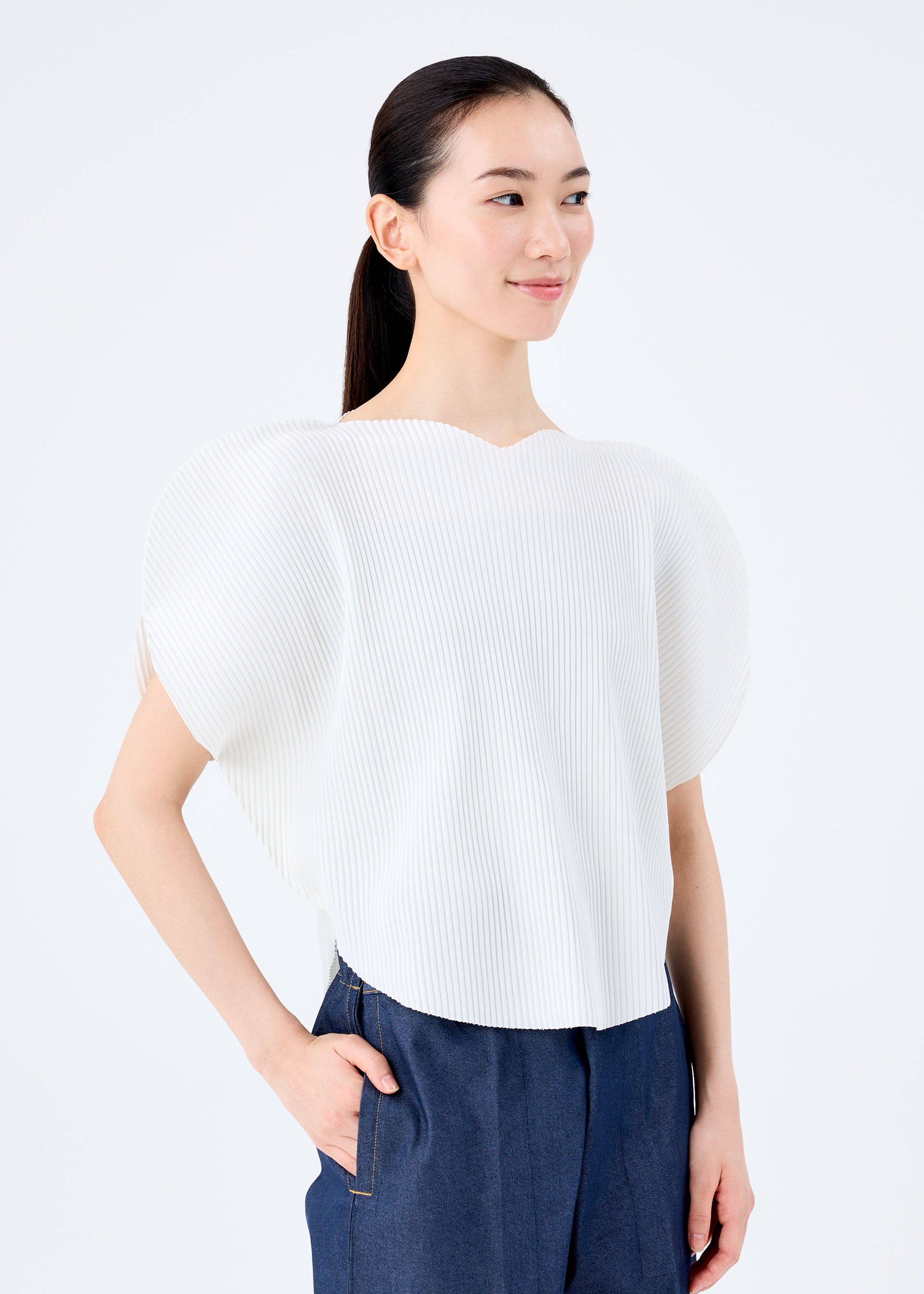 This FINE KNIT PLEATS short-sleeved top is characterized by its lightweight, soft feel and features pleats applied to knit material made with stretchy, thin, soft yarn. The neckline and form express the roundness of clover leaves.