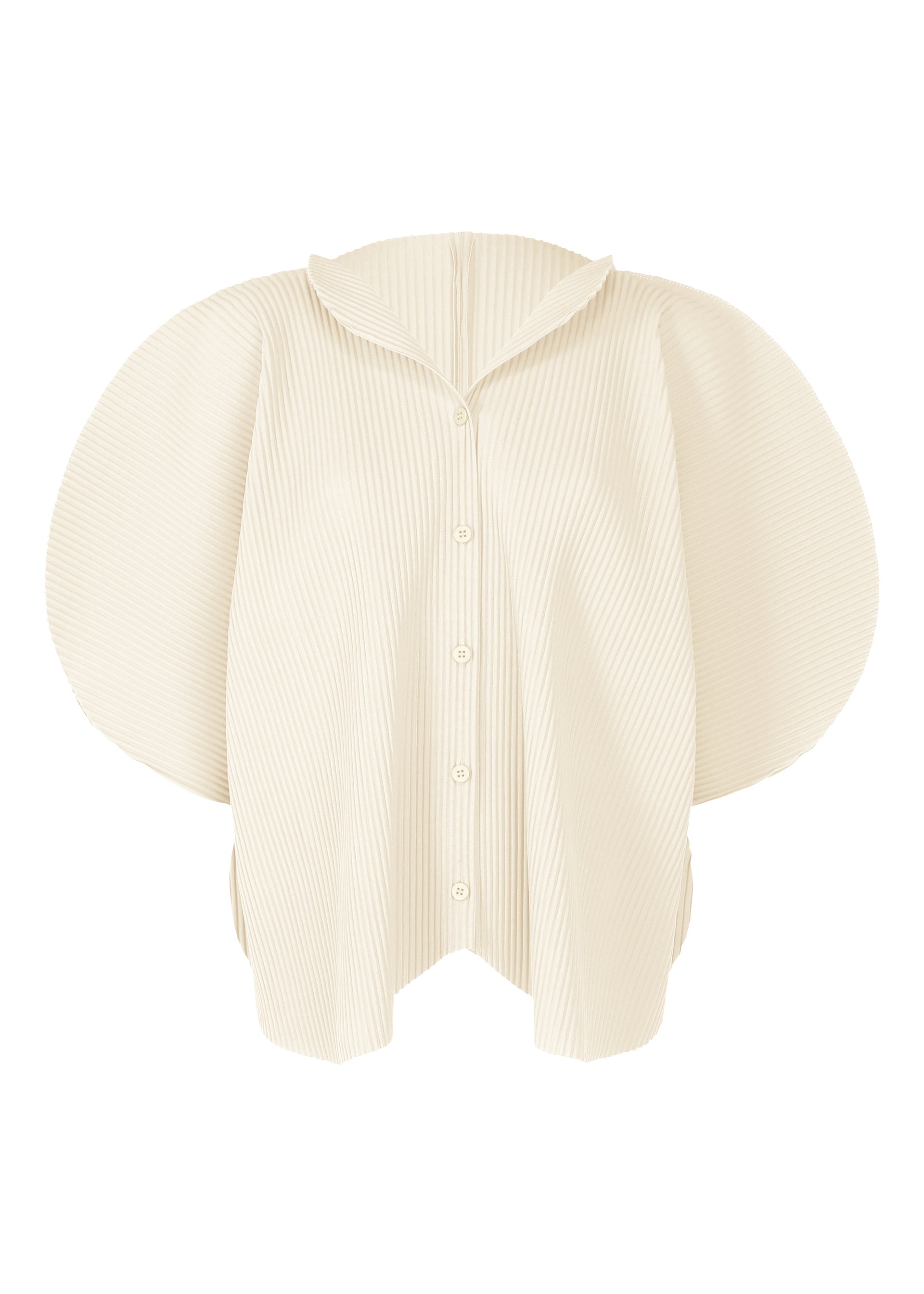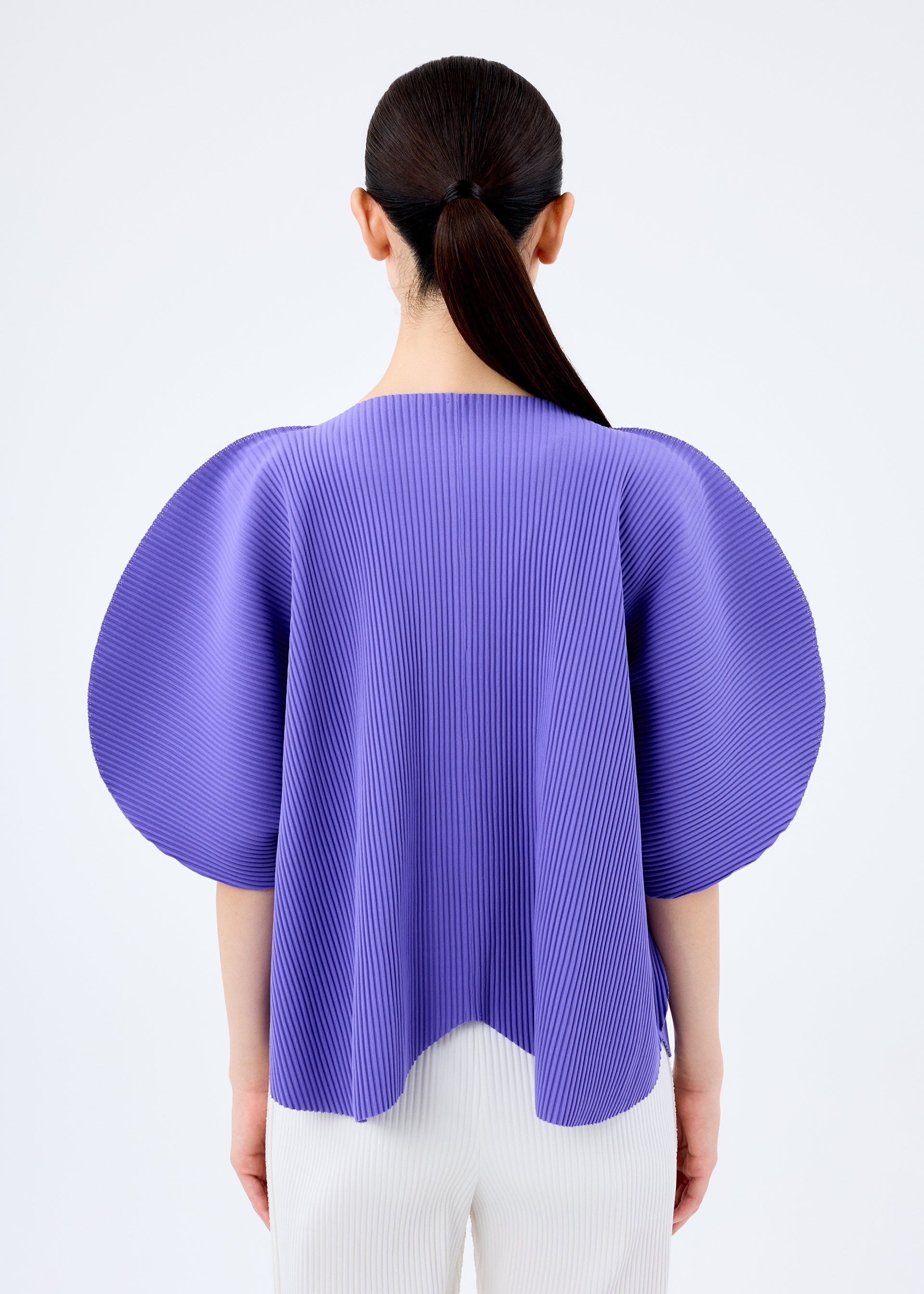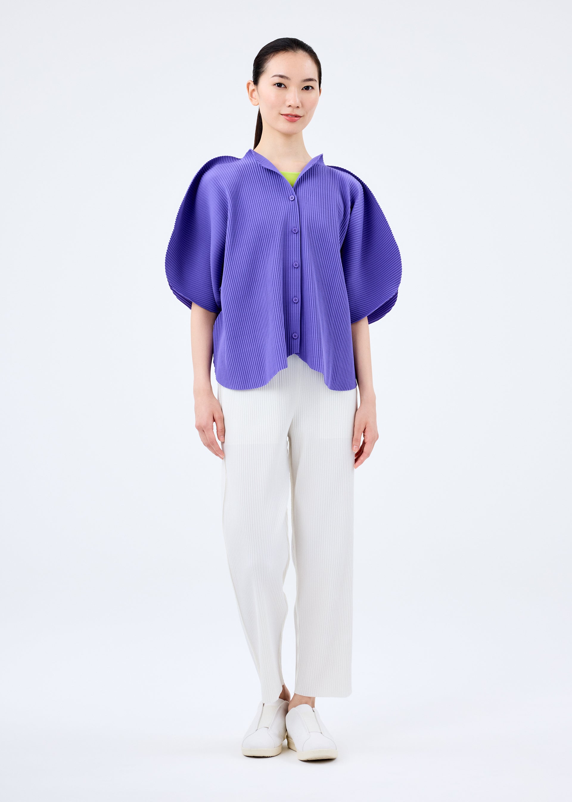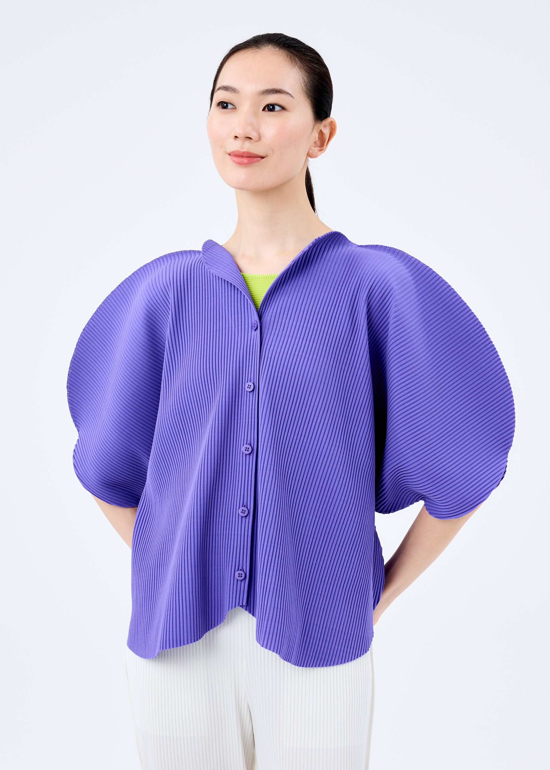This FINE KNIT PLEATS cardigan is characterized by its lightweight, soft feel and features pleats applied to knit material made with stretchy, thin, soft yarn. The form expresses the roundness of clover leaves.