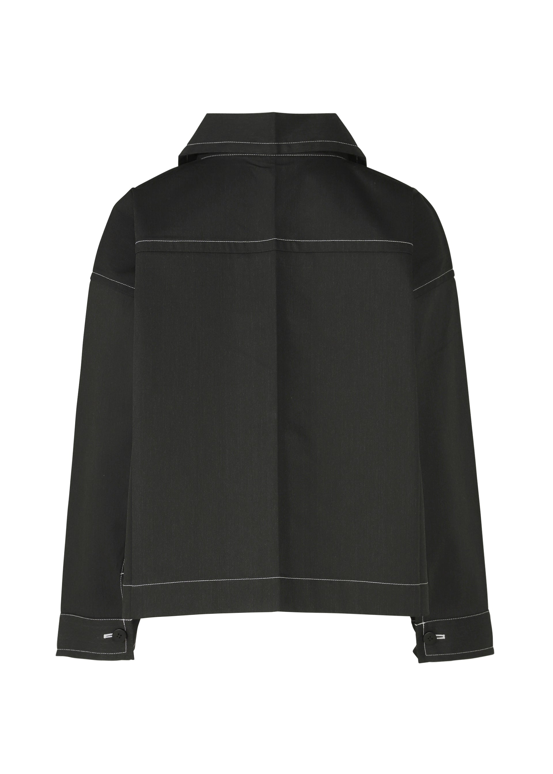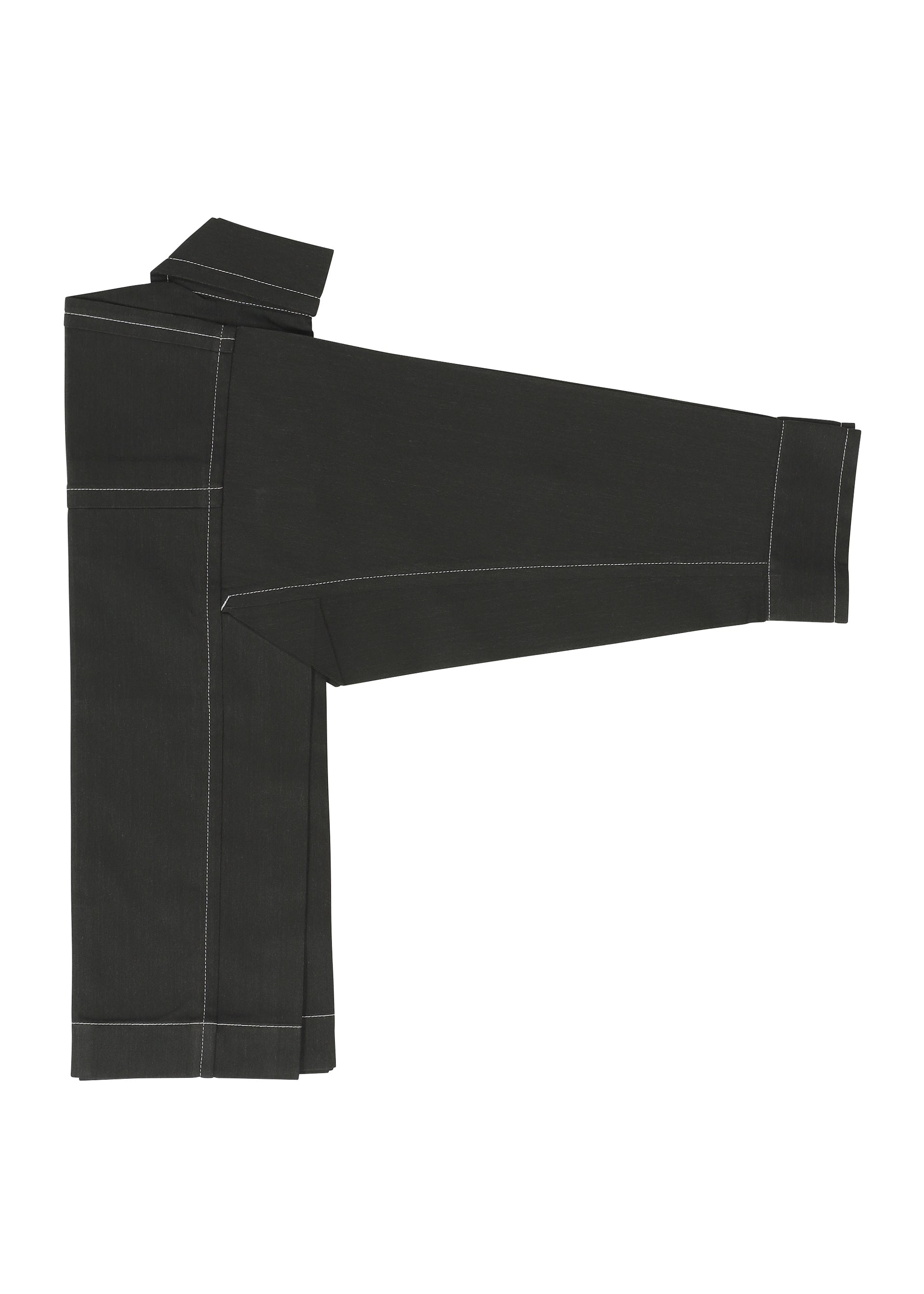 This jacket is made from recycled polyester denim fabric that folds along the creases for easy portability. In order to reproduce the subtle coloring of denim, the garment's warp is made from dope-dyed recycled polyester thread with the color mixed at the cotton stage, and washed to create a realistic denim texture. There are pockets on both sides and a left chest pocket.