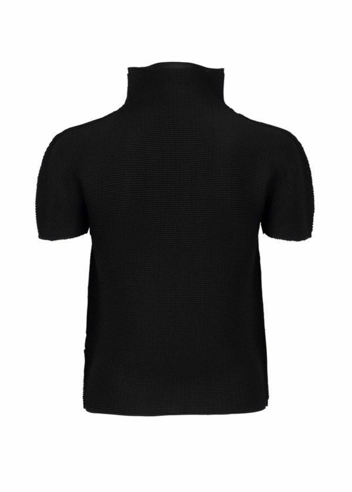 This high-neck, short-sleeved top features vertical and horizontal stretch pleats.