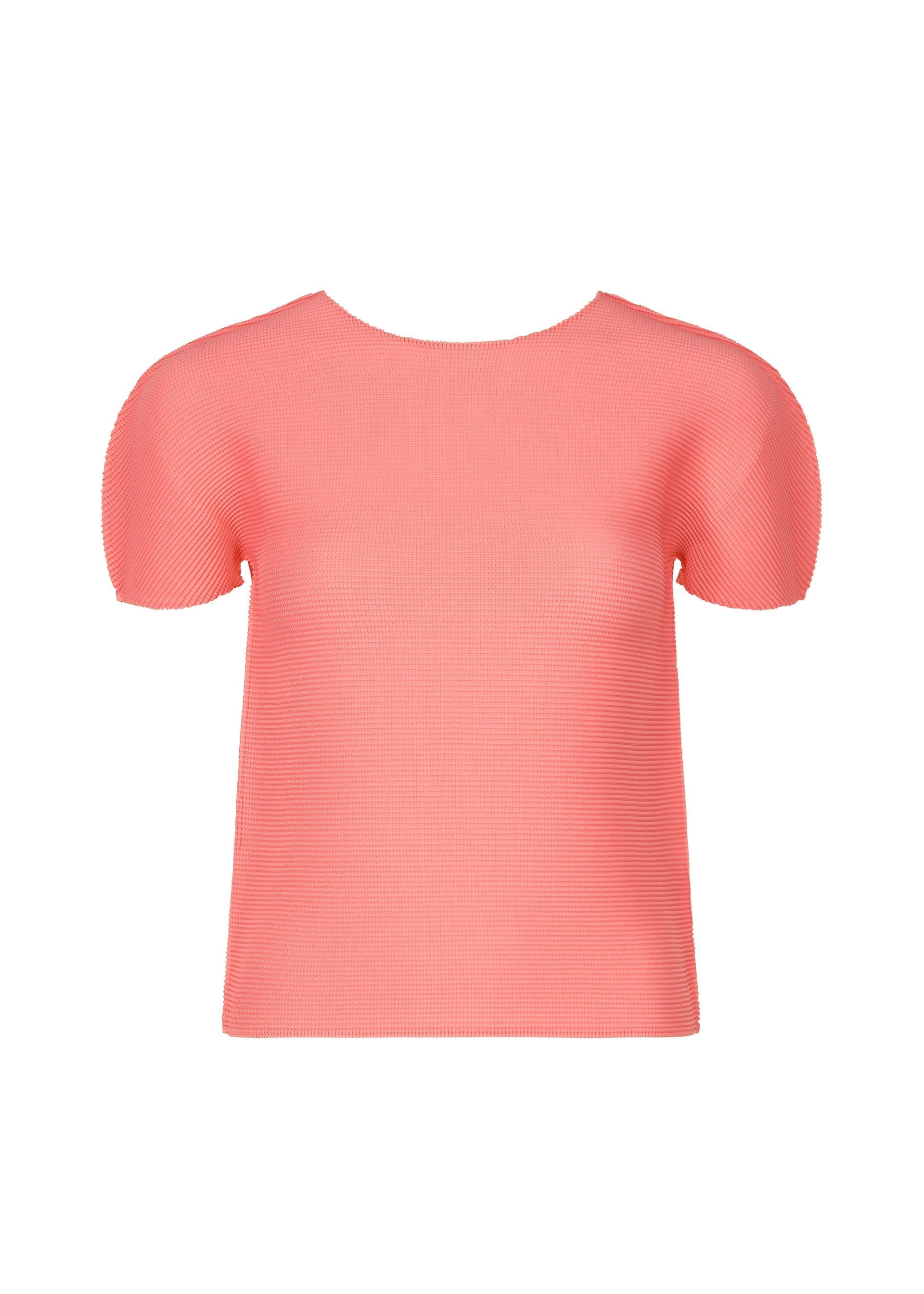 This round-neck, short-sleeved top features vertical and horizontal stretch pleats.