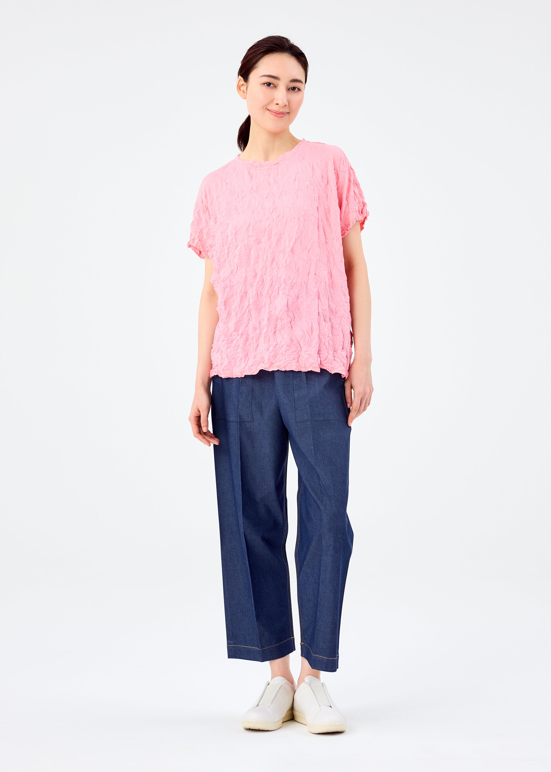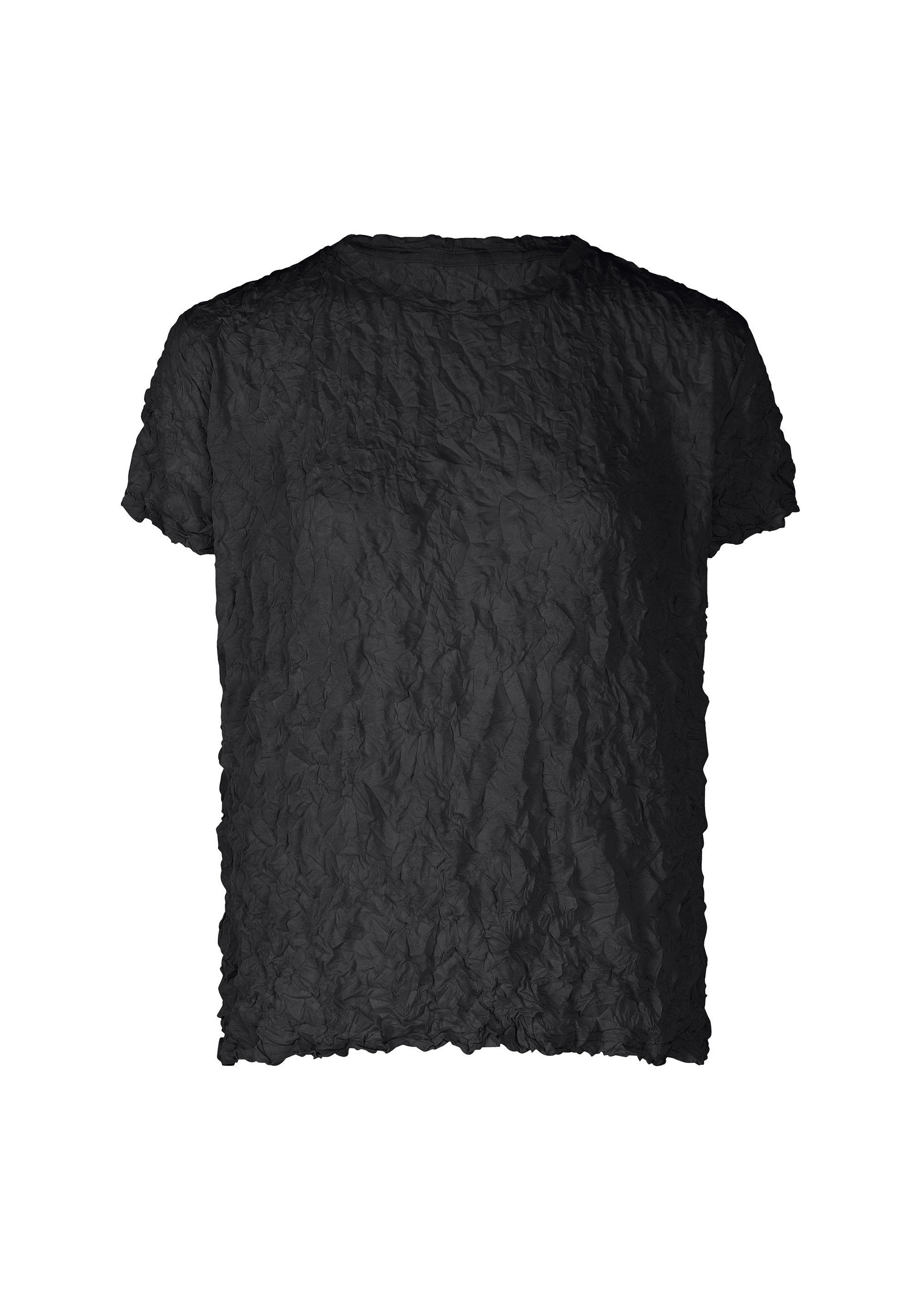 This round-neck, short-sleeved top is made from thin polyester jersey material with a crushed finish for a three-dimensional look. It is characterized by its soft, cotton-like feel.