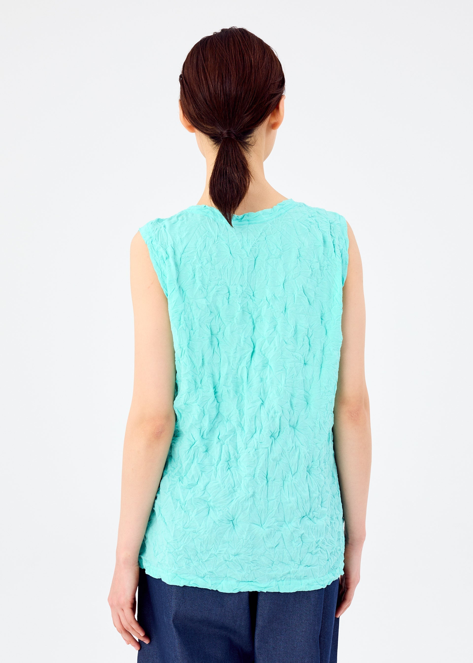 This sleeveless top is made from thin polyester jersey material with a crushed and pleated finish, giving it a three-dimensional look. It is characterized by its soft, cotton-like feel.