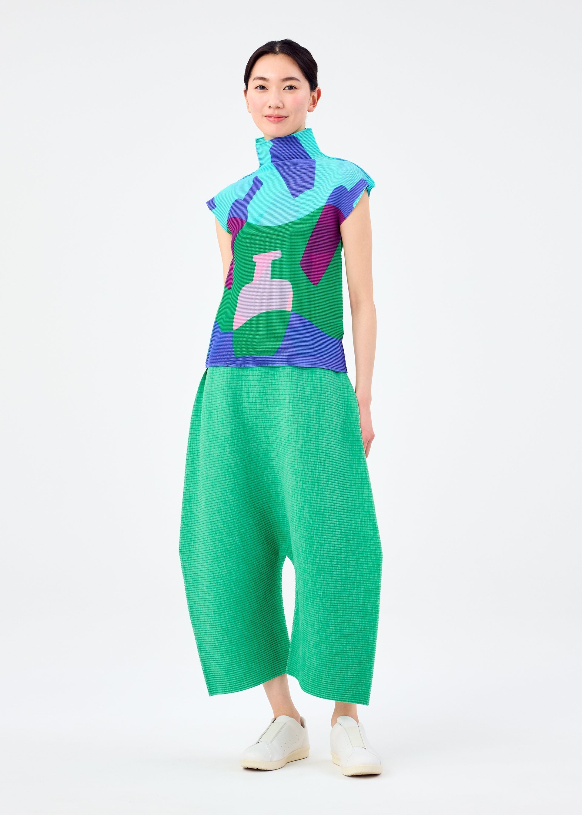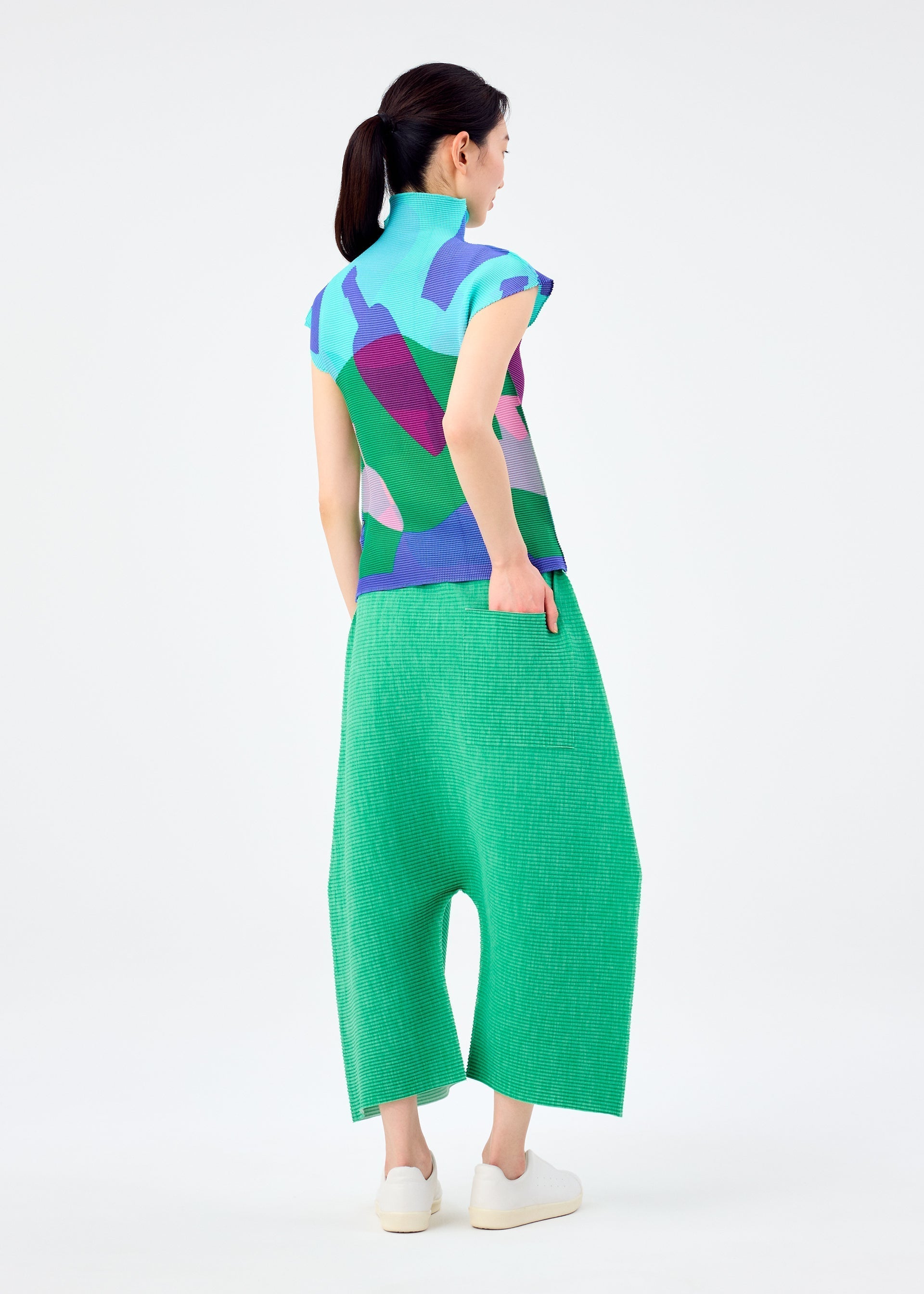 These FINE KNIT PLEATS sarouel pants are characterized by their lightweight, soft feel and feature pleats applied to knit material made with stretchy, thin, soft yarn. The mélange-like feel is expressed by mixing recycled polyester and cationic thread and dyeing them separately. The design features fun, bouncy movement created by the horizontal pleating process. There is one hip pocket.