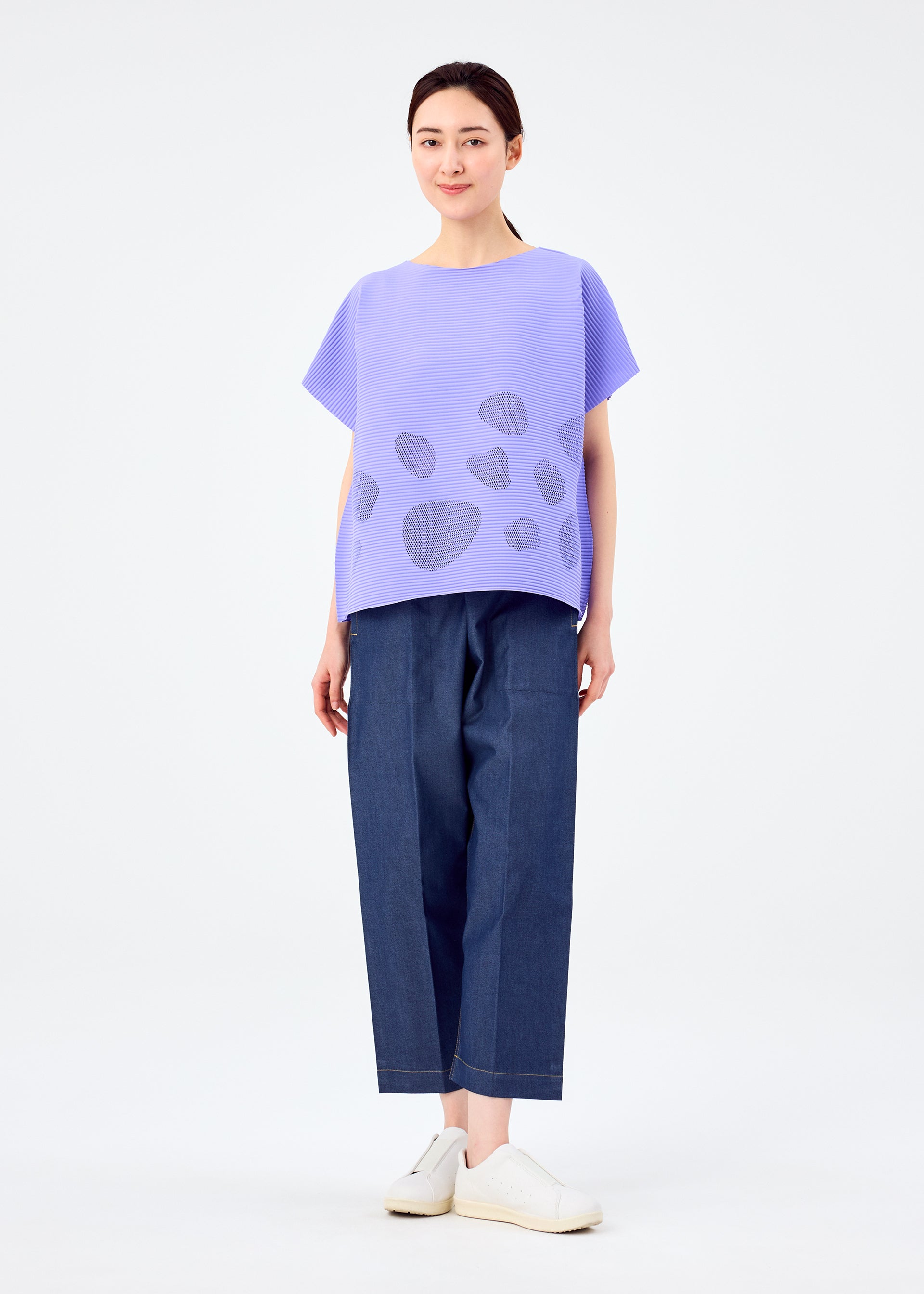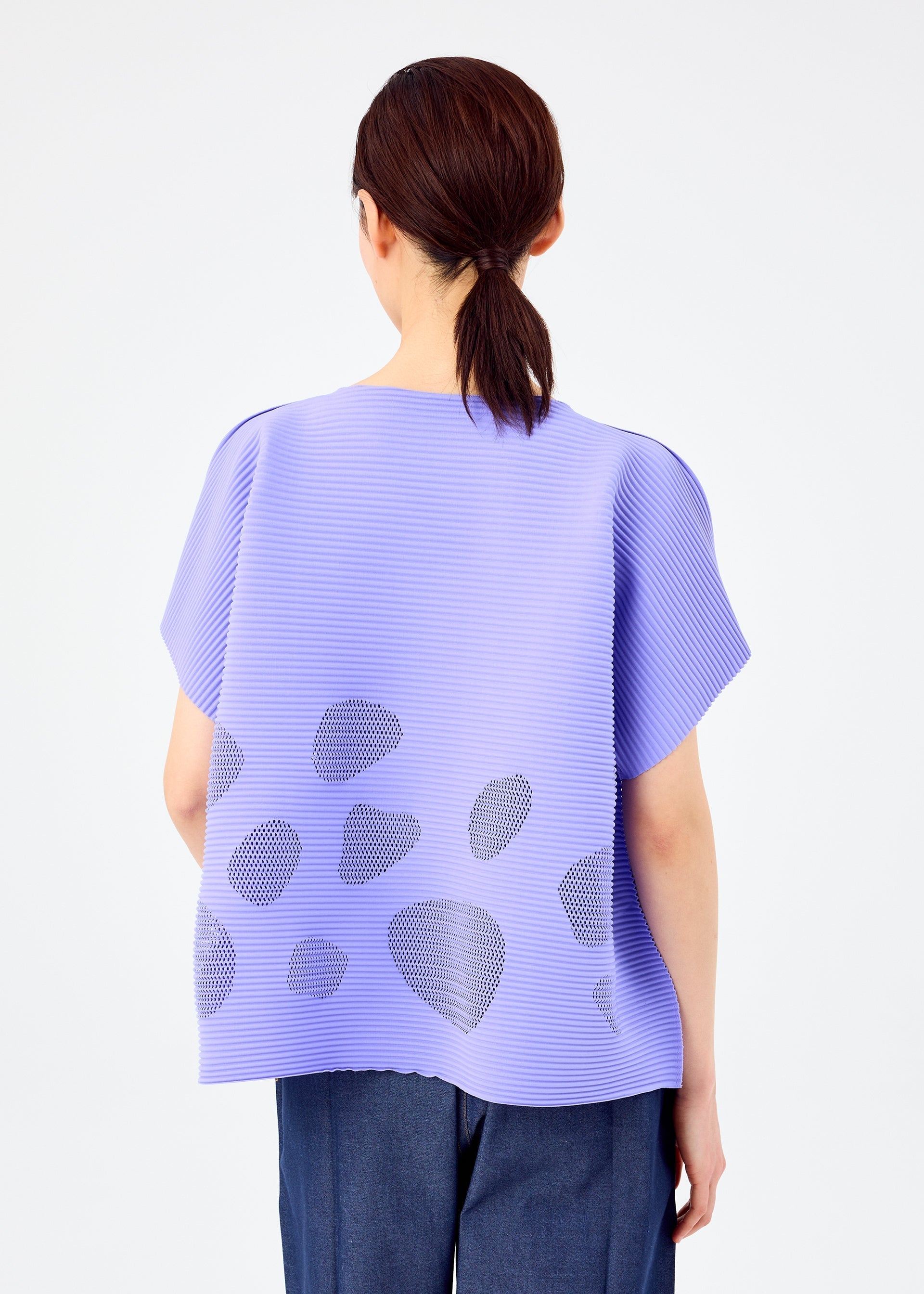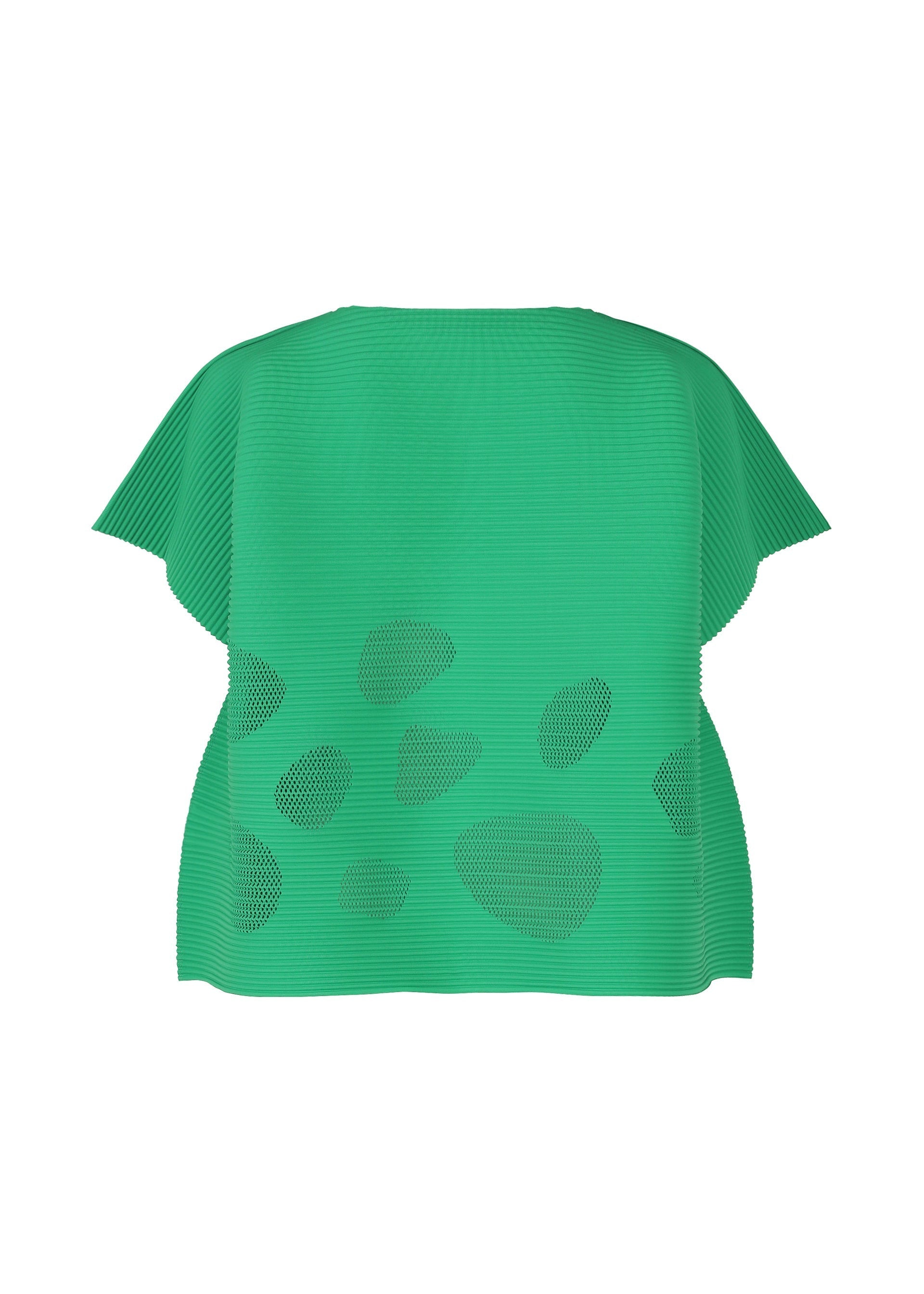 This FINE KNIT PLEATS round-neck, short-sleeved top is characterized by its lightweight, soft feel and features pleats applied to knit material made with stretchy, thin, soft yarn. The mesh structure and silhouette express the transparency and round form of sea glass. This item features fun, bouncy movement created by the horizontal pleats.