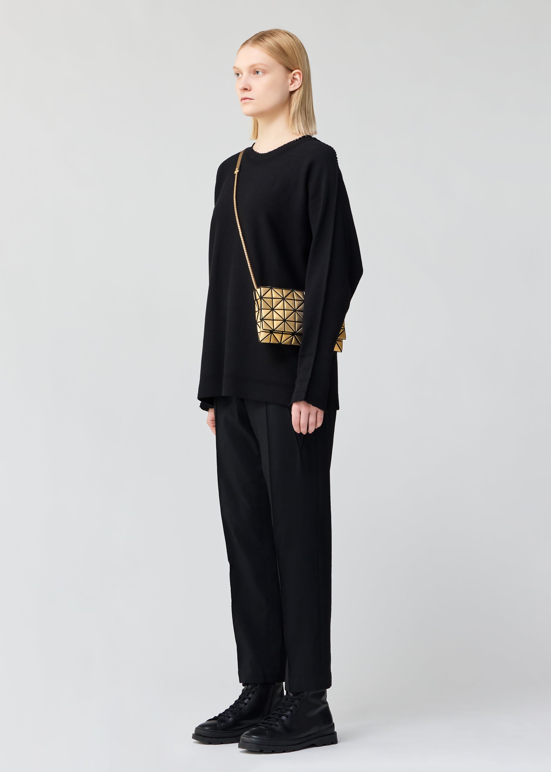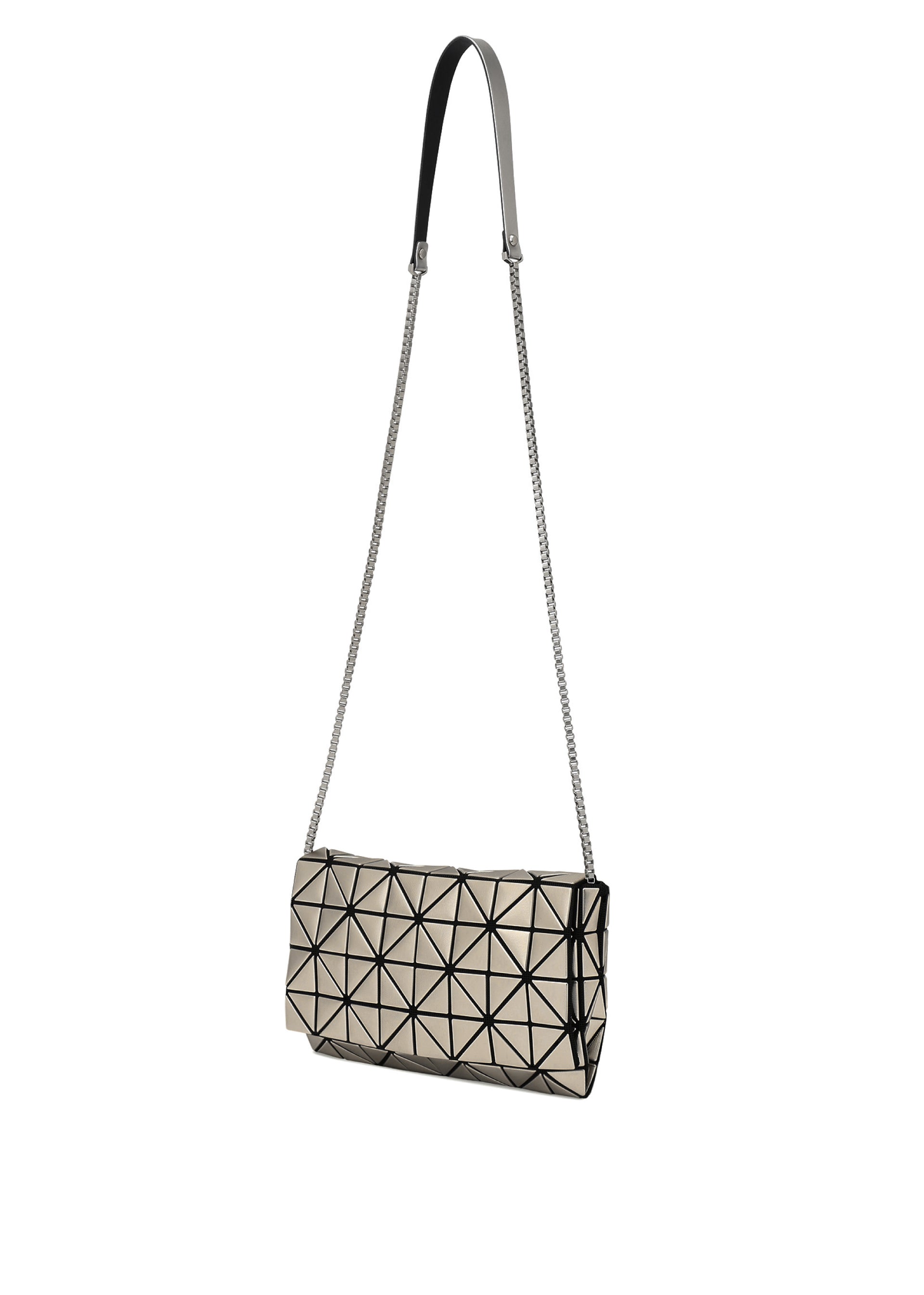 A shoulder bag from the PLATINUM series that is made of triangular pieces made of metallic material with a fabric pattern embossed on them. The entire bag can be worn as if it were a single accessory, giving it a luxurious feel that can be worn not only on special occasions, but also as an accent to your everyday outfit. It has a flap and a zipper, so you can safely store your valuables. The size allows you to store your smartphone and compact wallet.