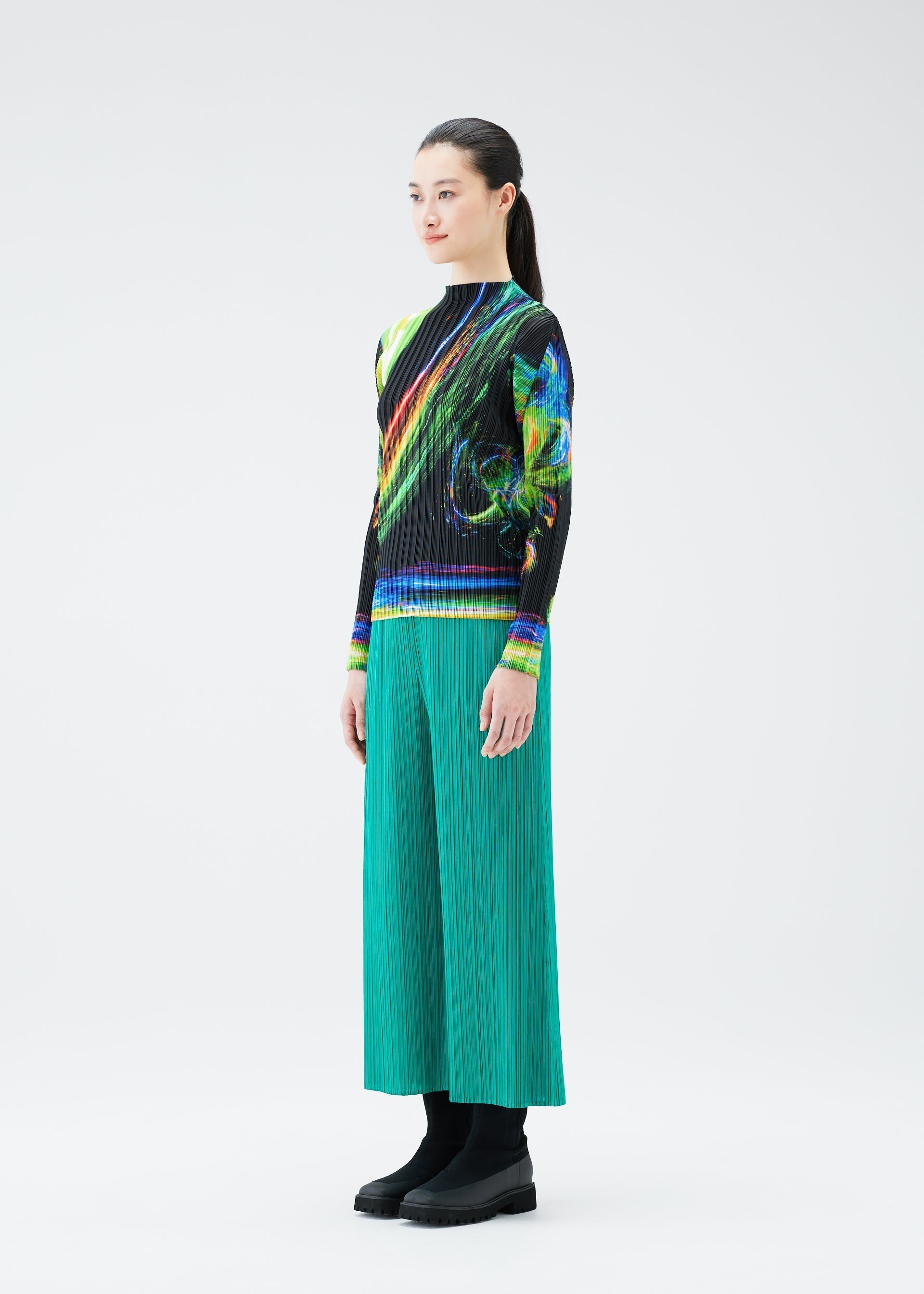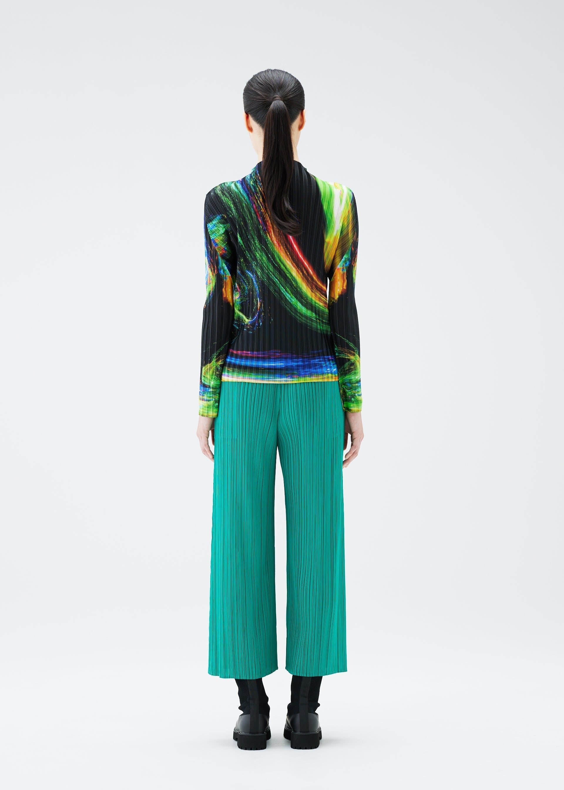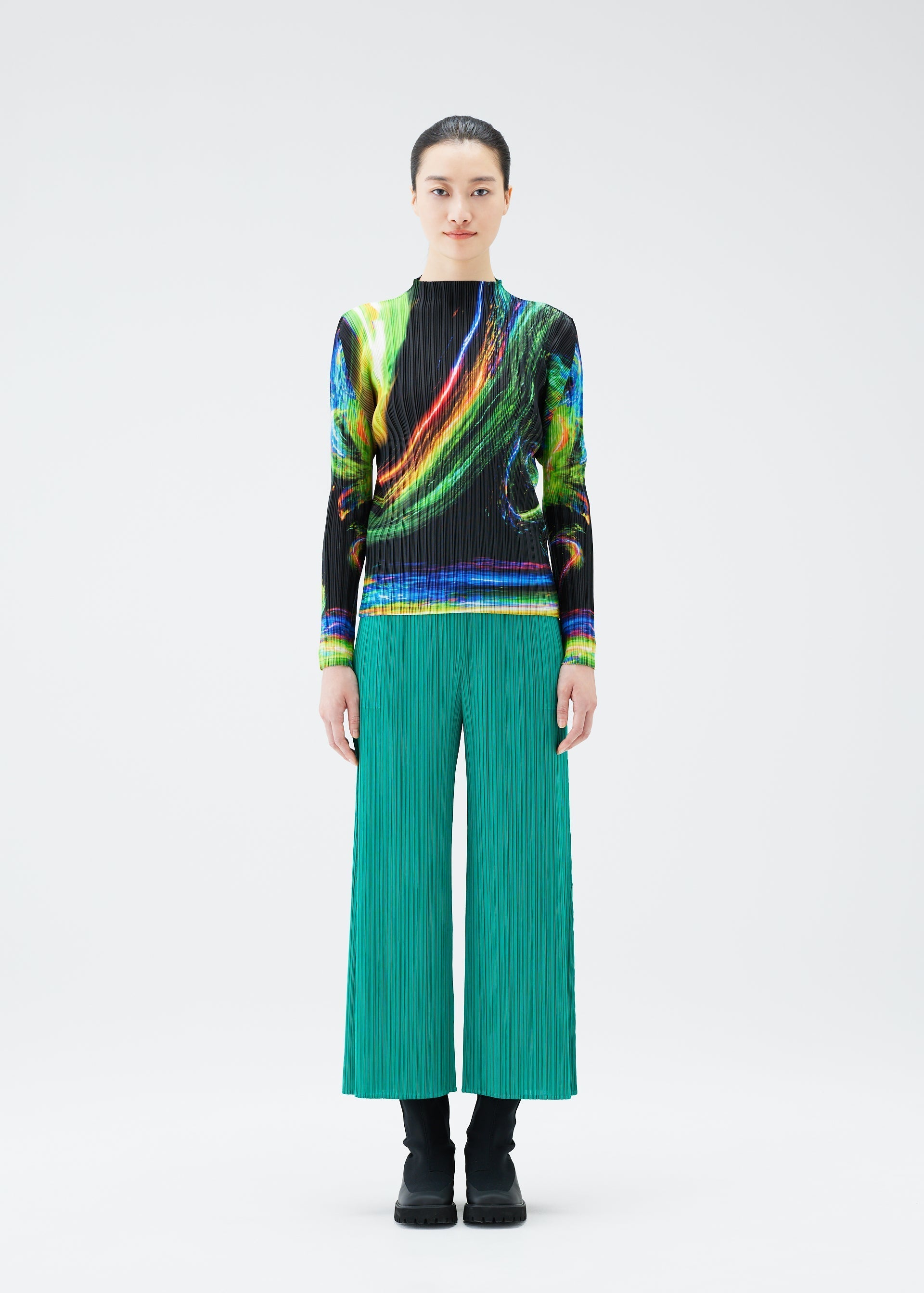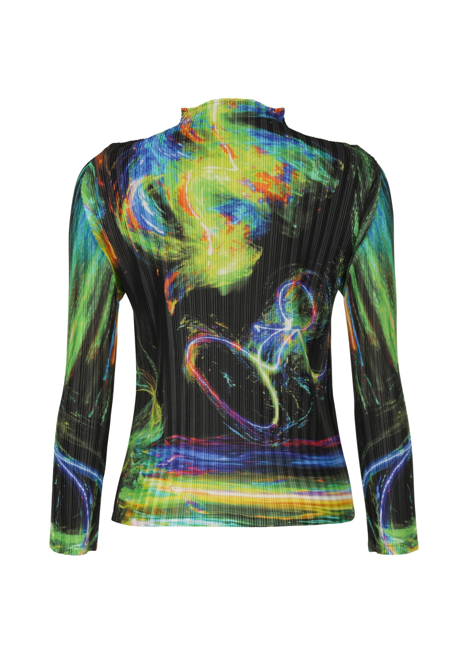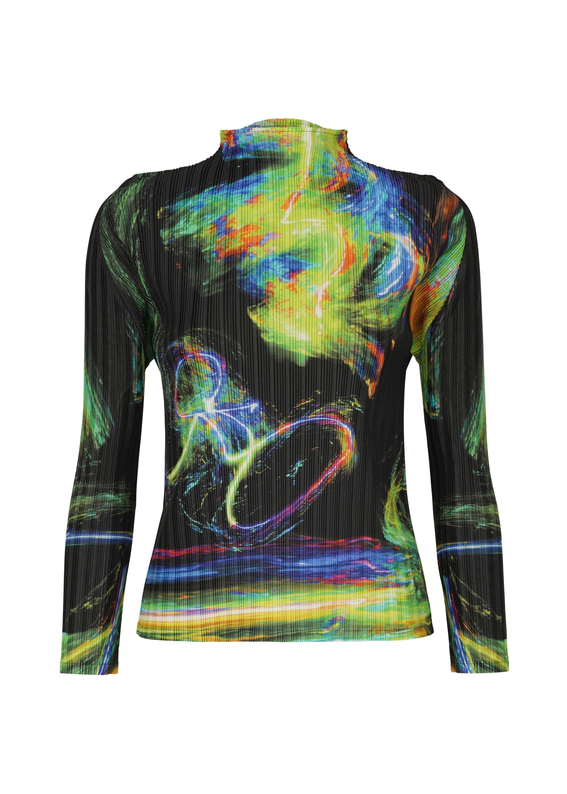 This high-neck long-sleeved shirt is made from soft fabric and is easy to style in outfits. The pattern, inspired by galaxies, planets, and outer space, was created from photographs taken with LED lights at slow shutter speeds.