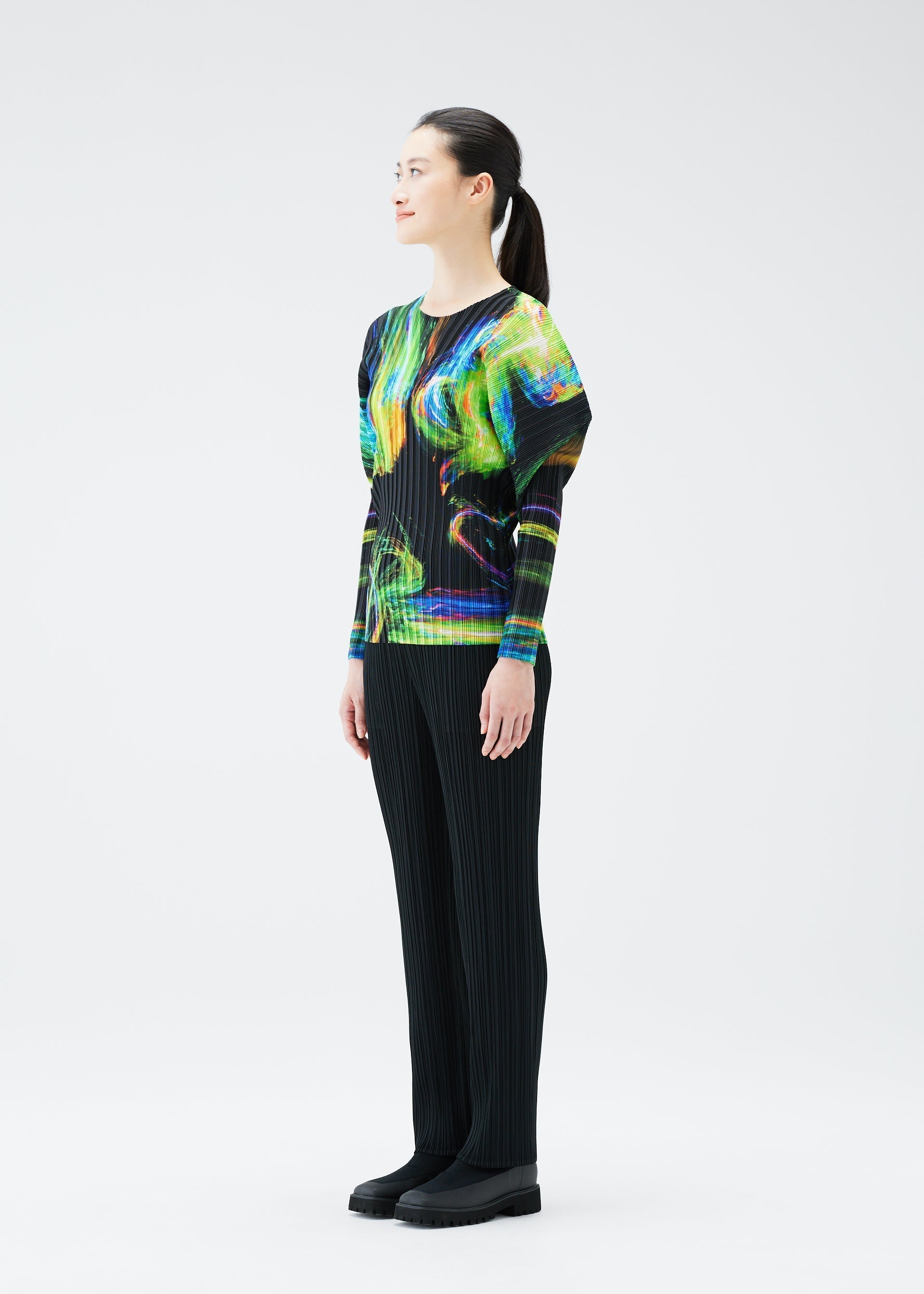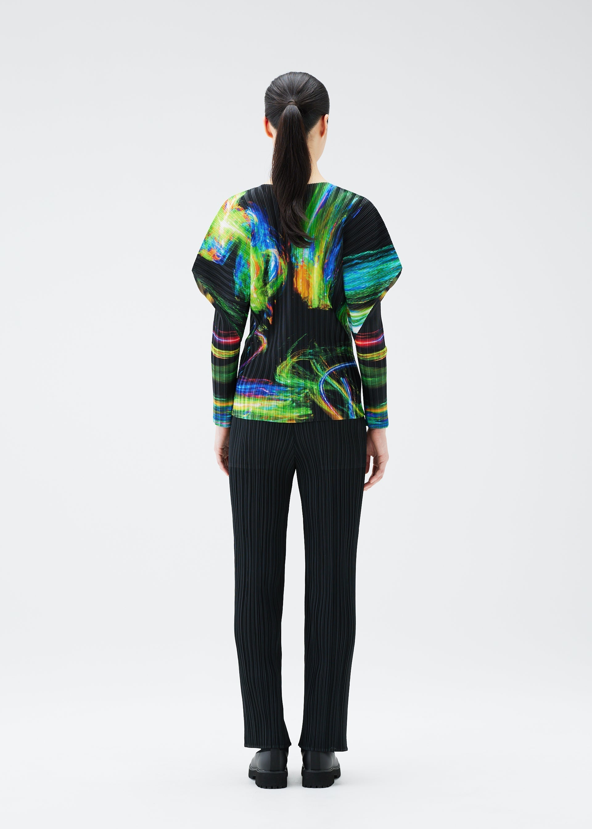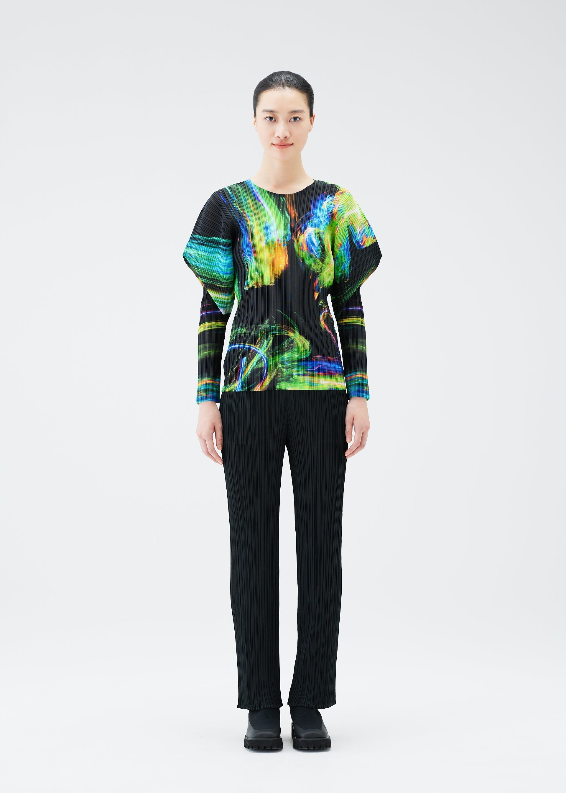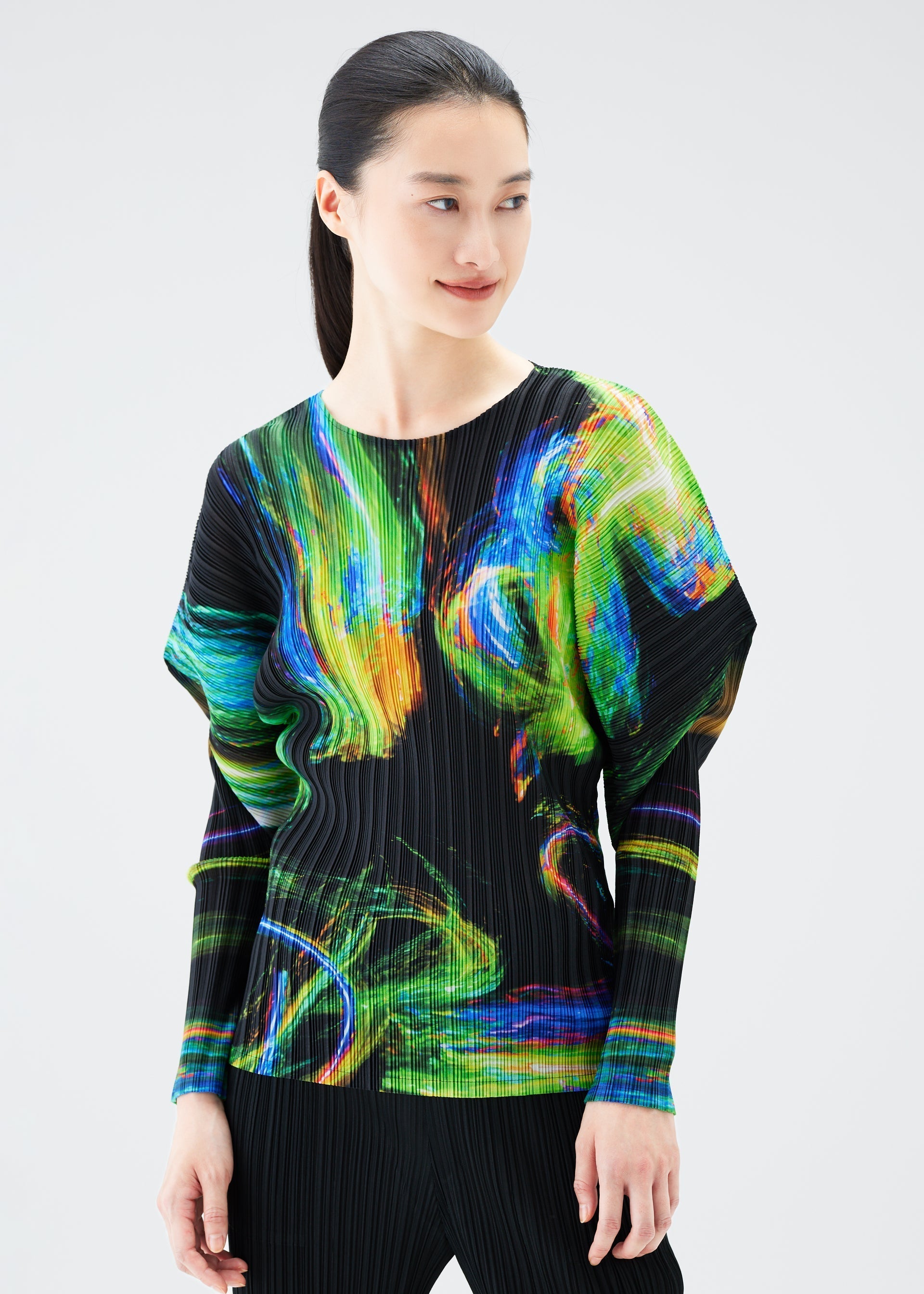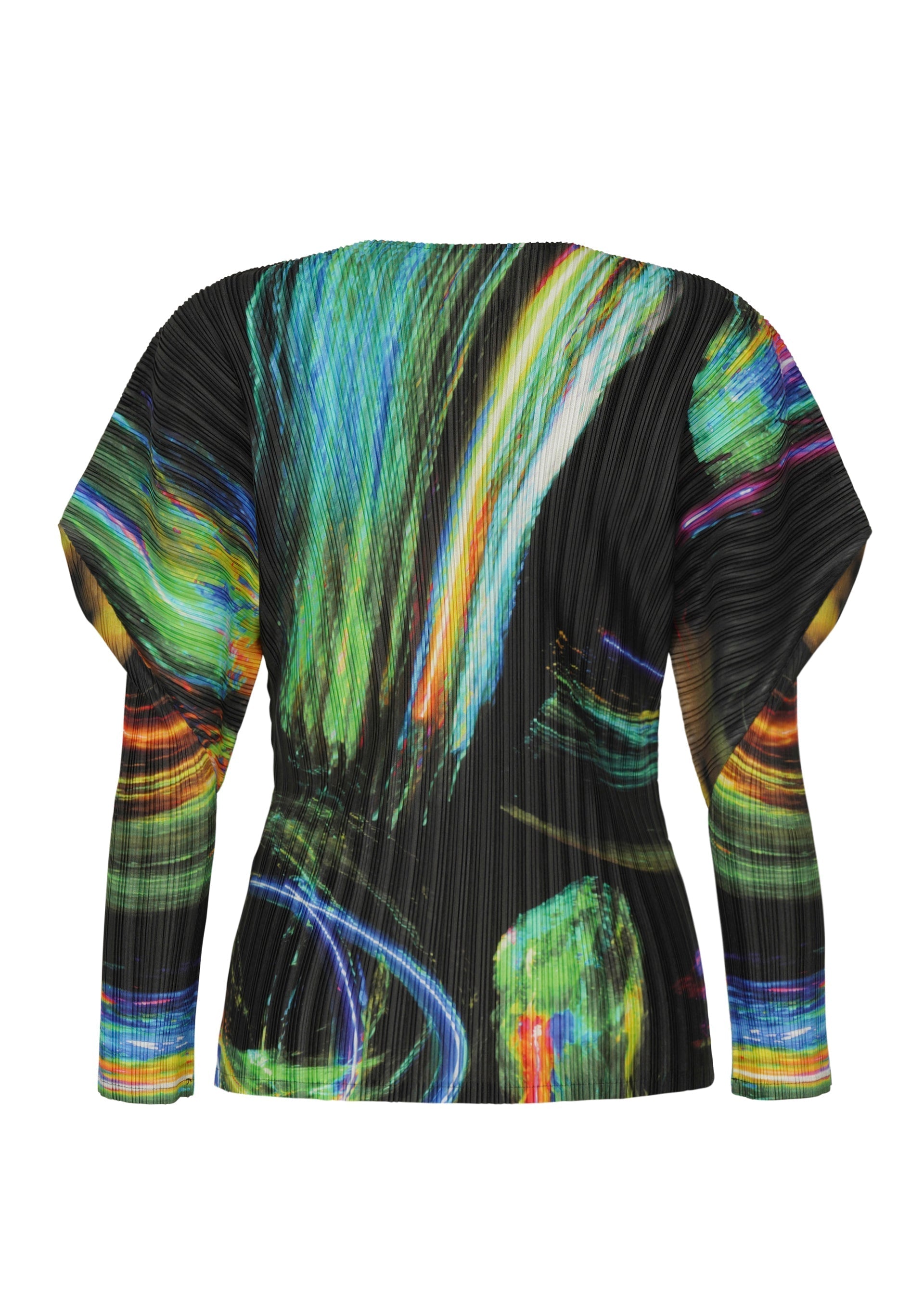 Featuring a print created by photographing LED lights at a slow shutter speed, SPECTRUM RIB is a pleated top series inspired by driving through space at warp speed.