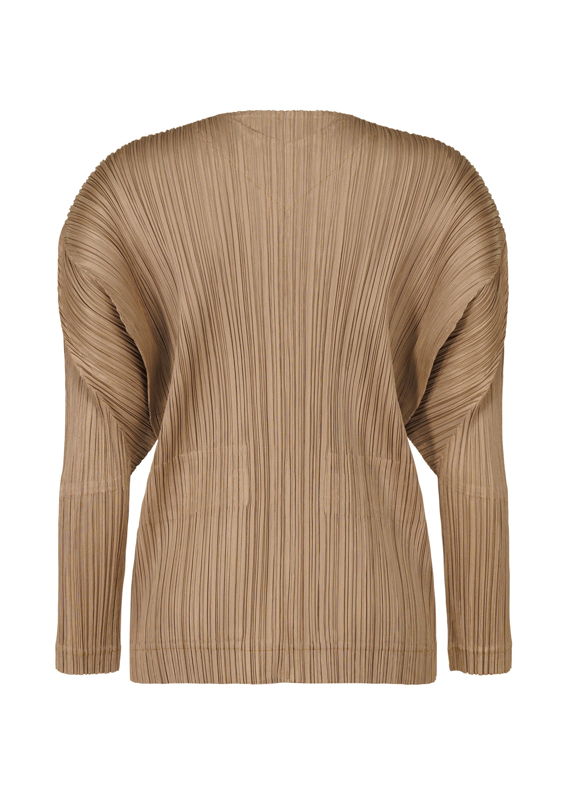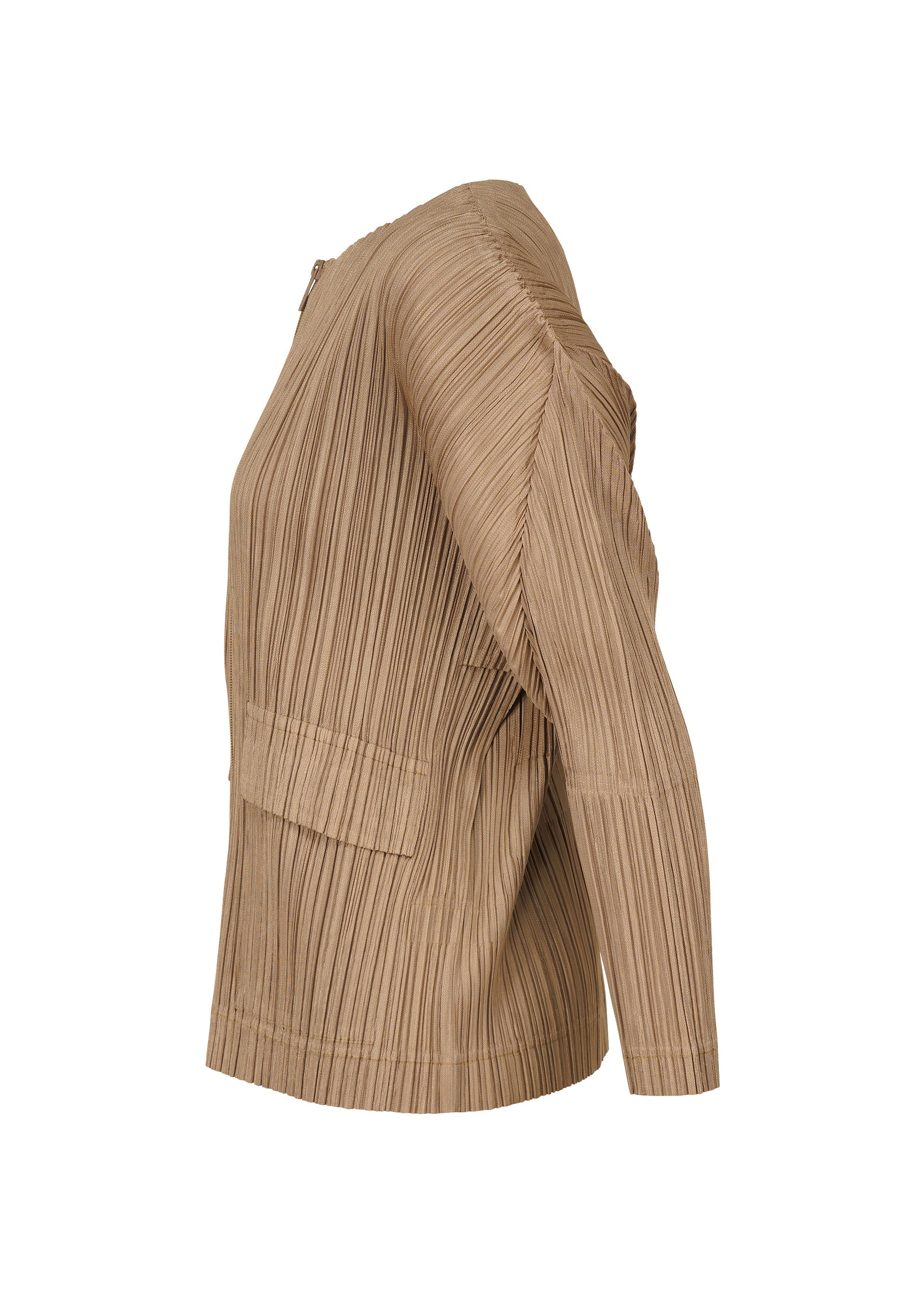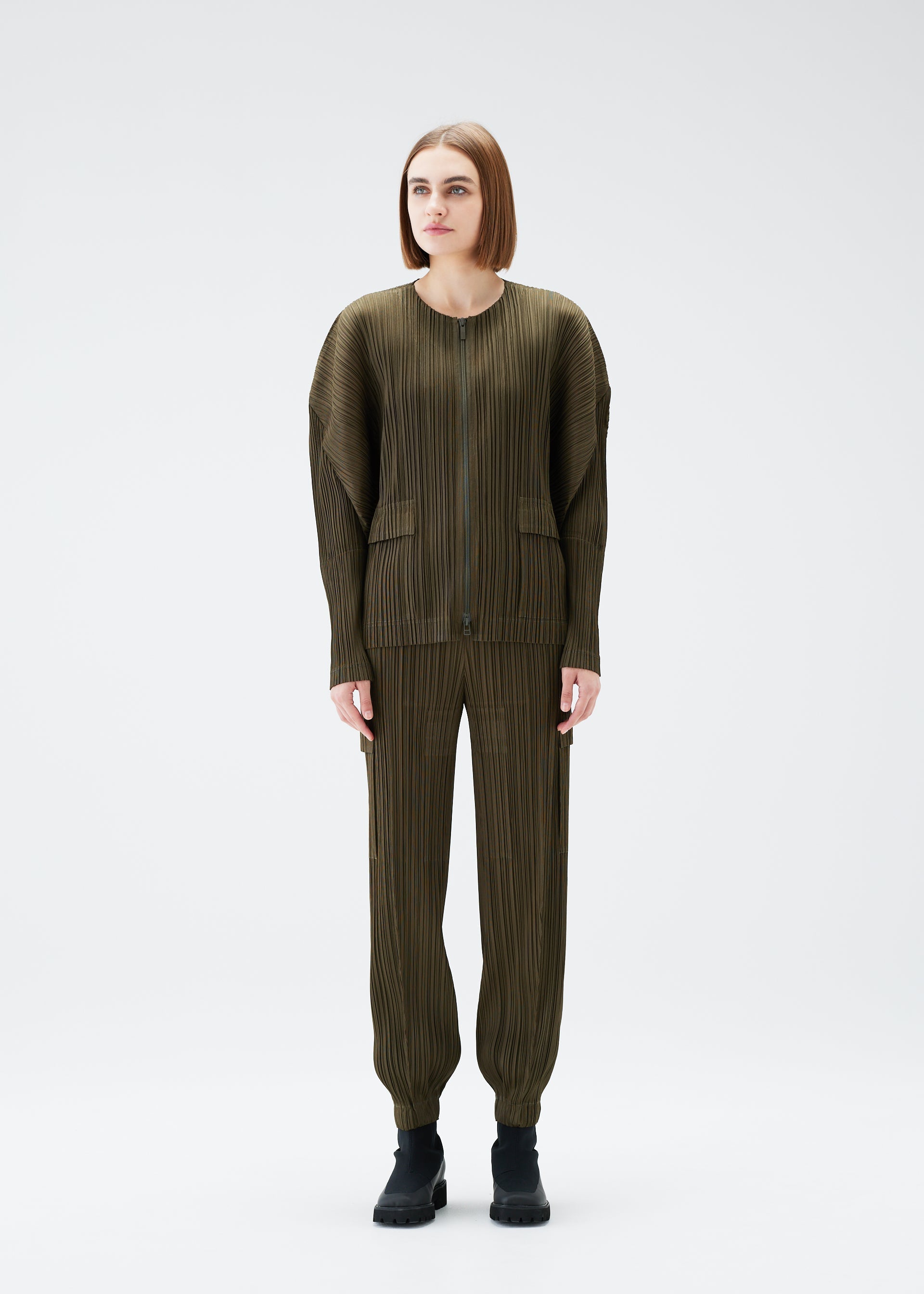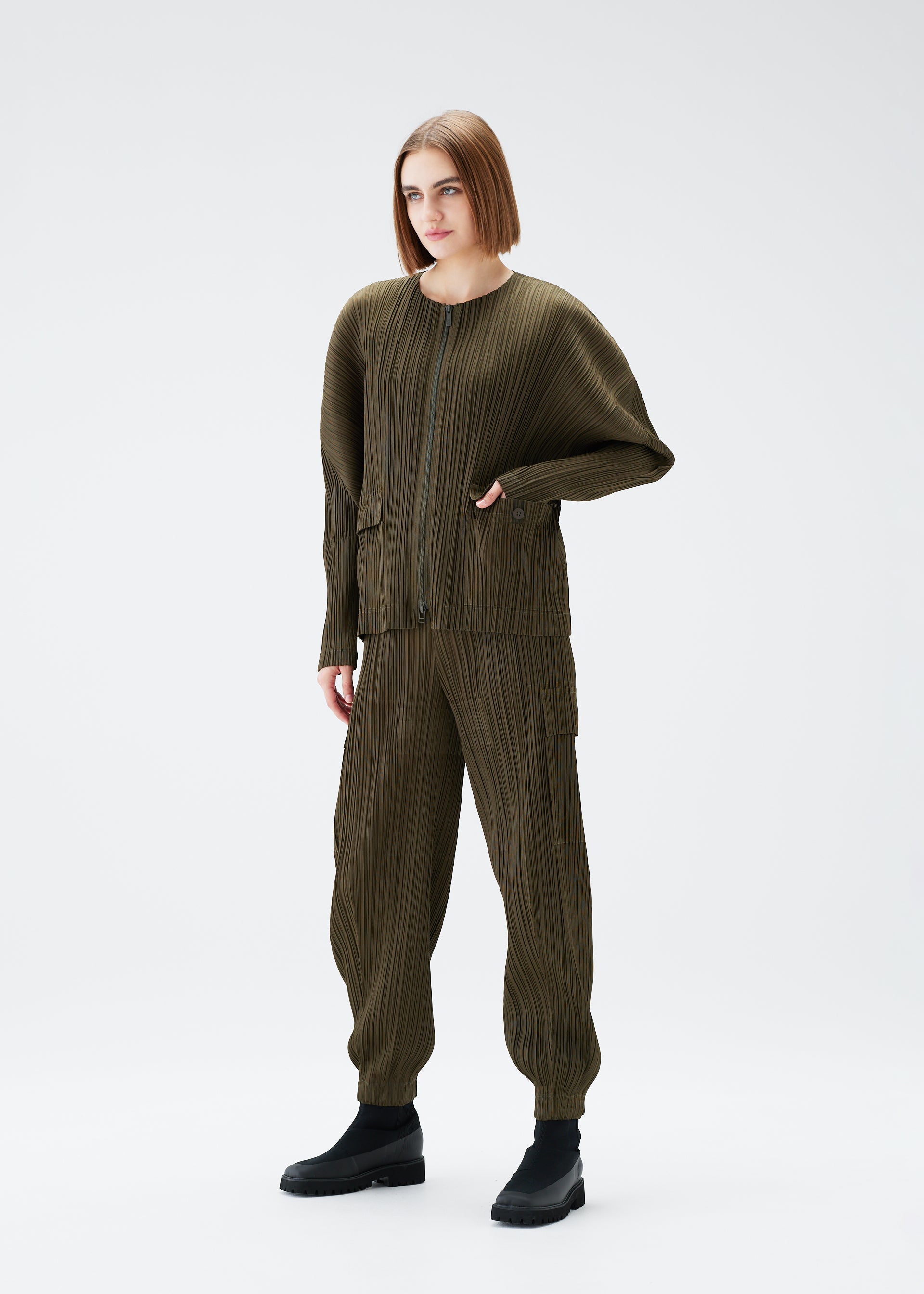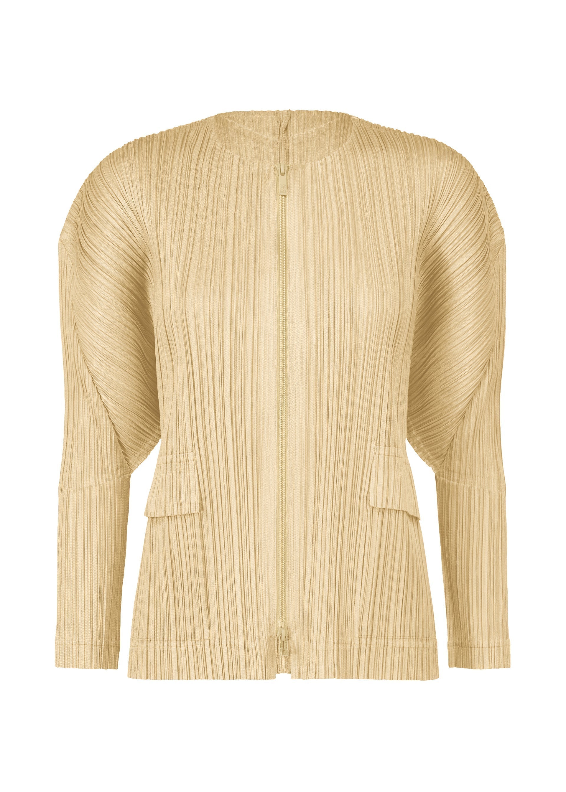 This pleated jacket has a relaxed fit, two front cargo pockets, and a two way zip closure.