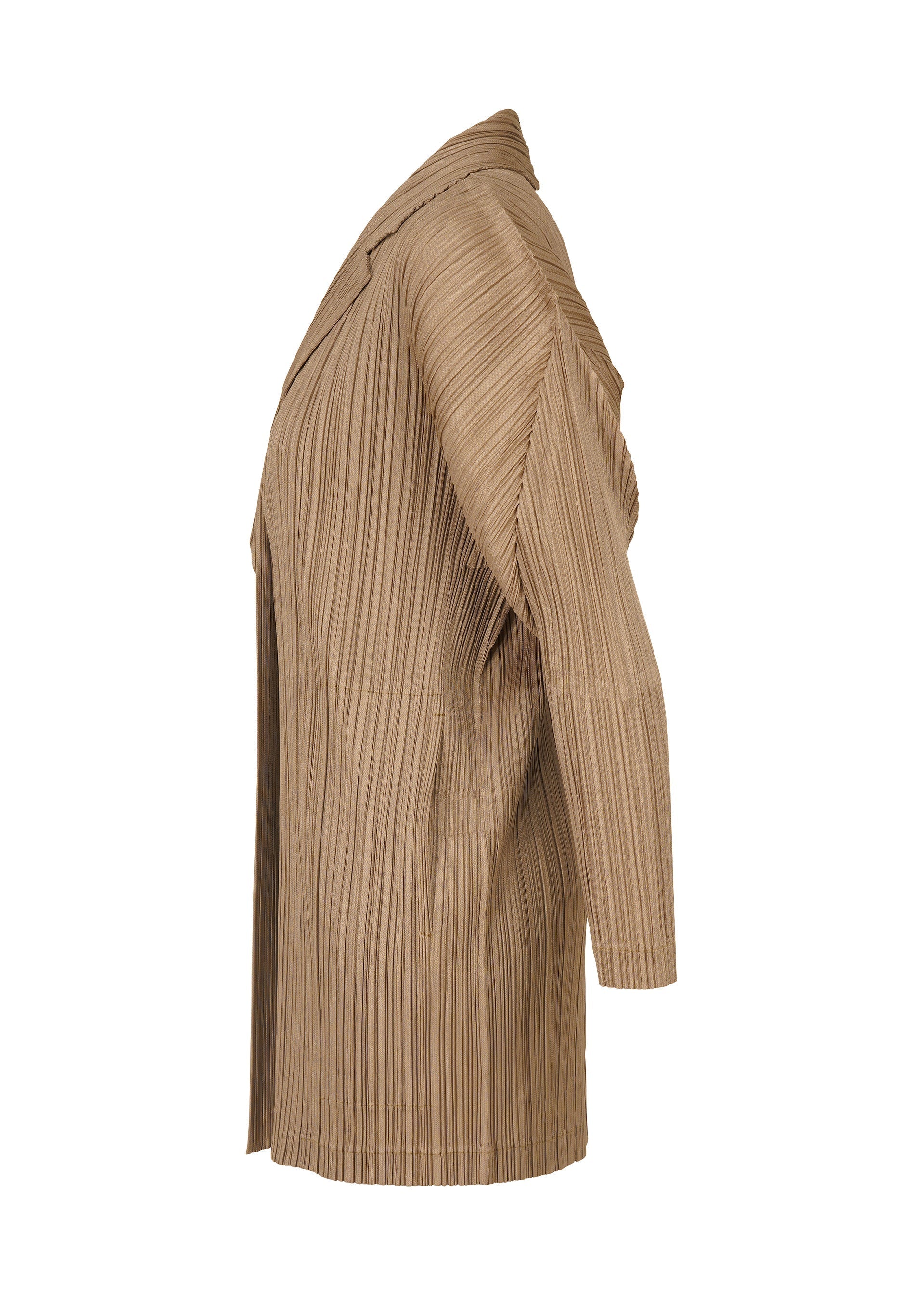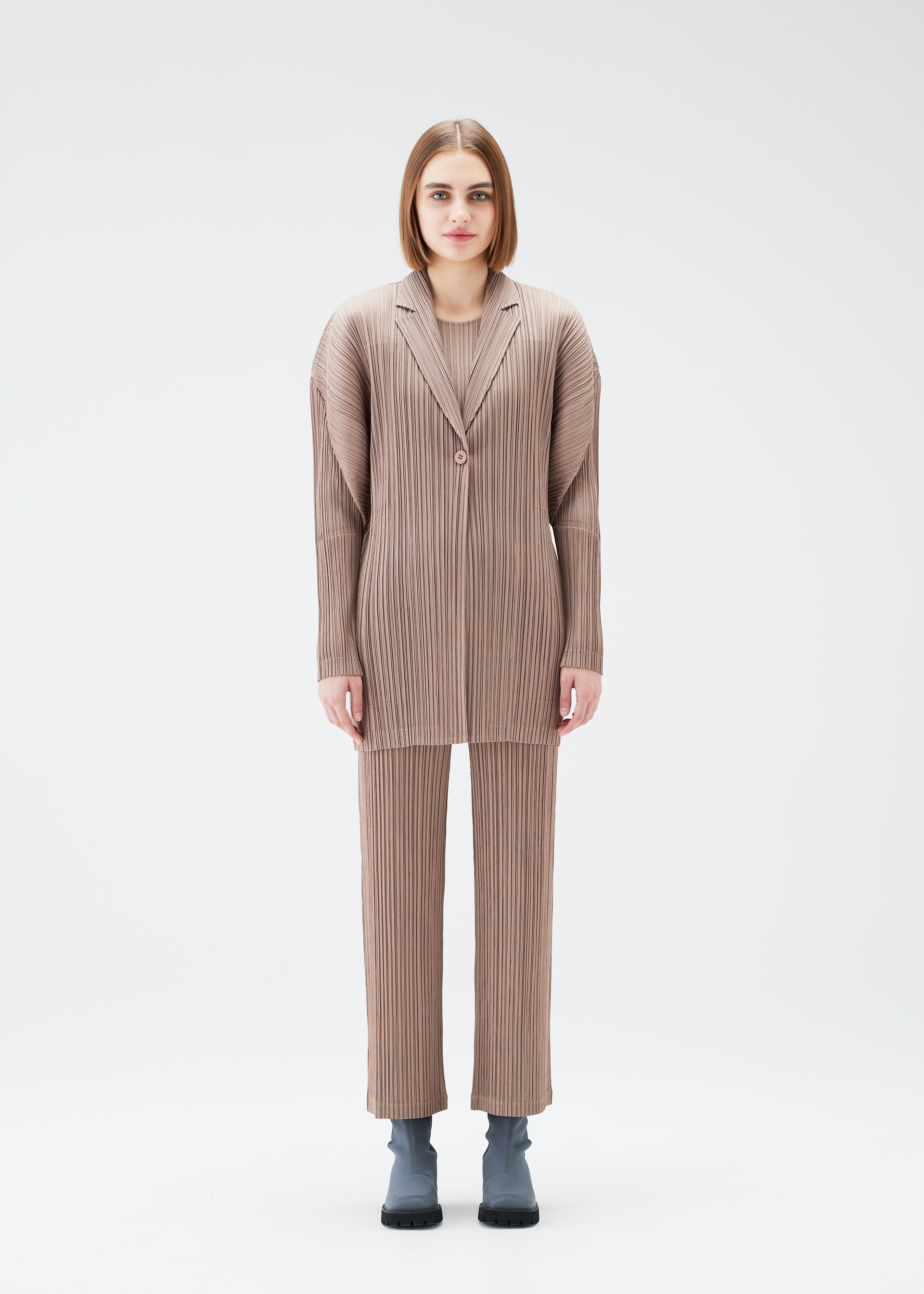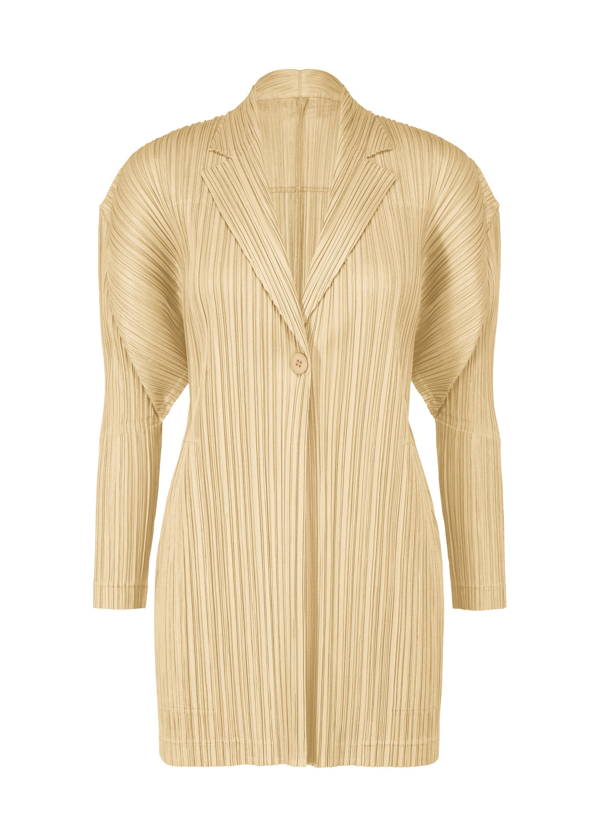 This pleated jacket has a straight fit, classic collar, one-button closure, and two side pockets.