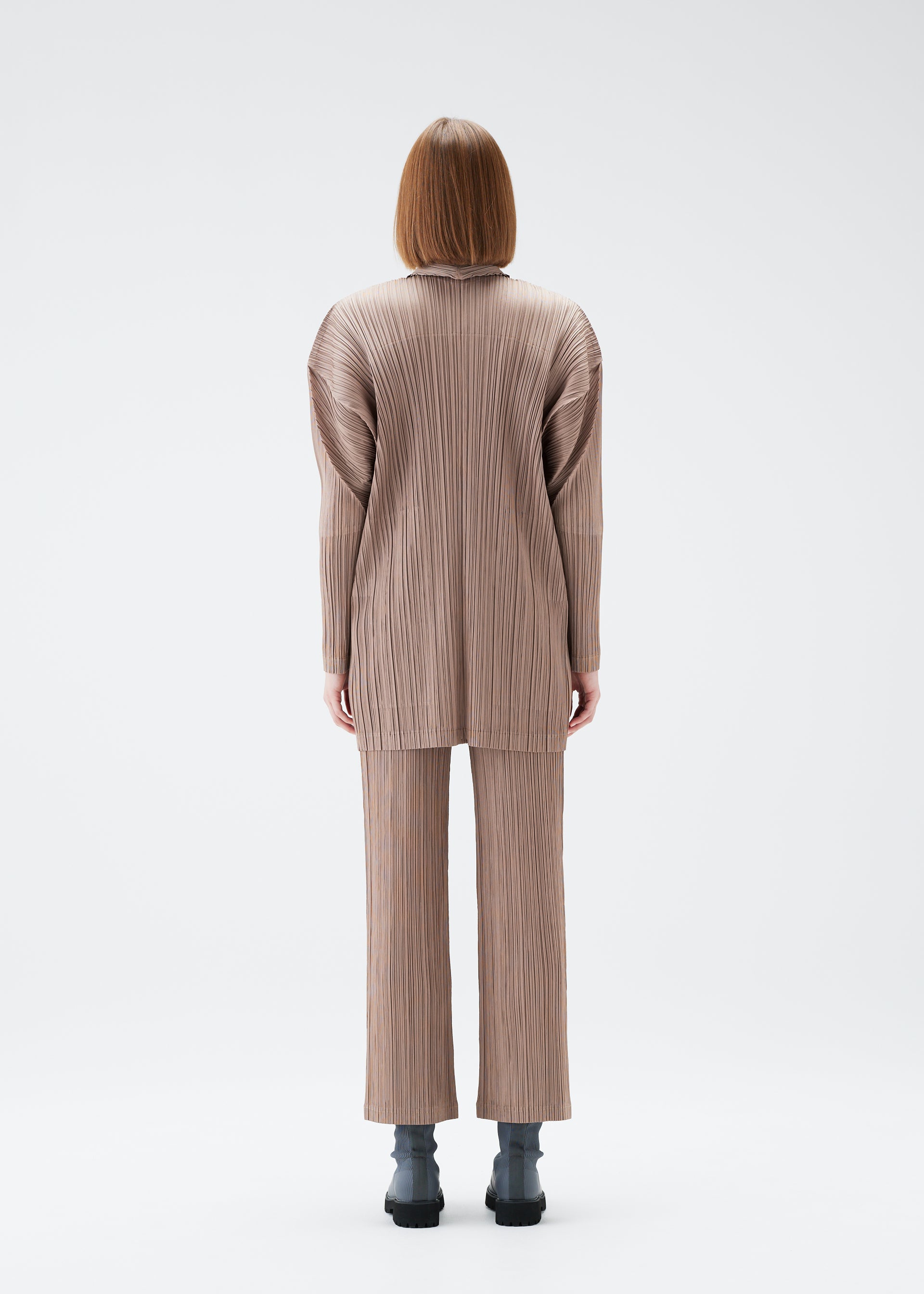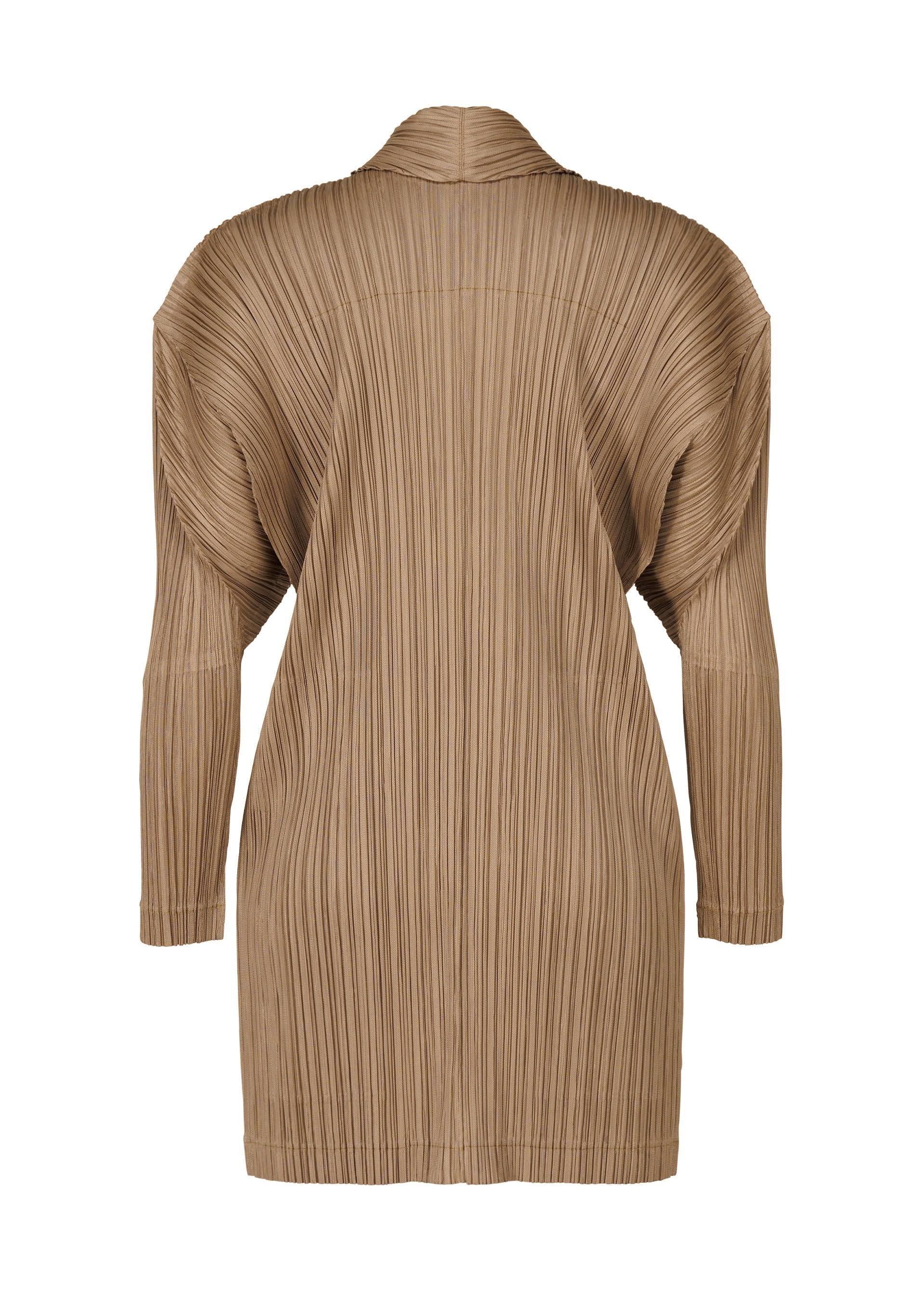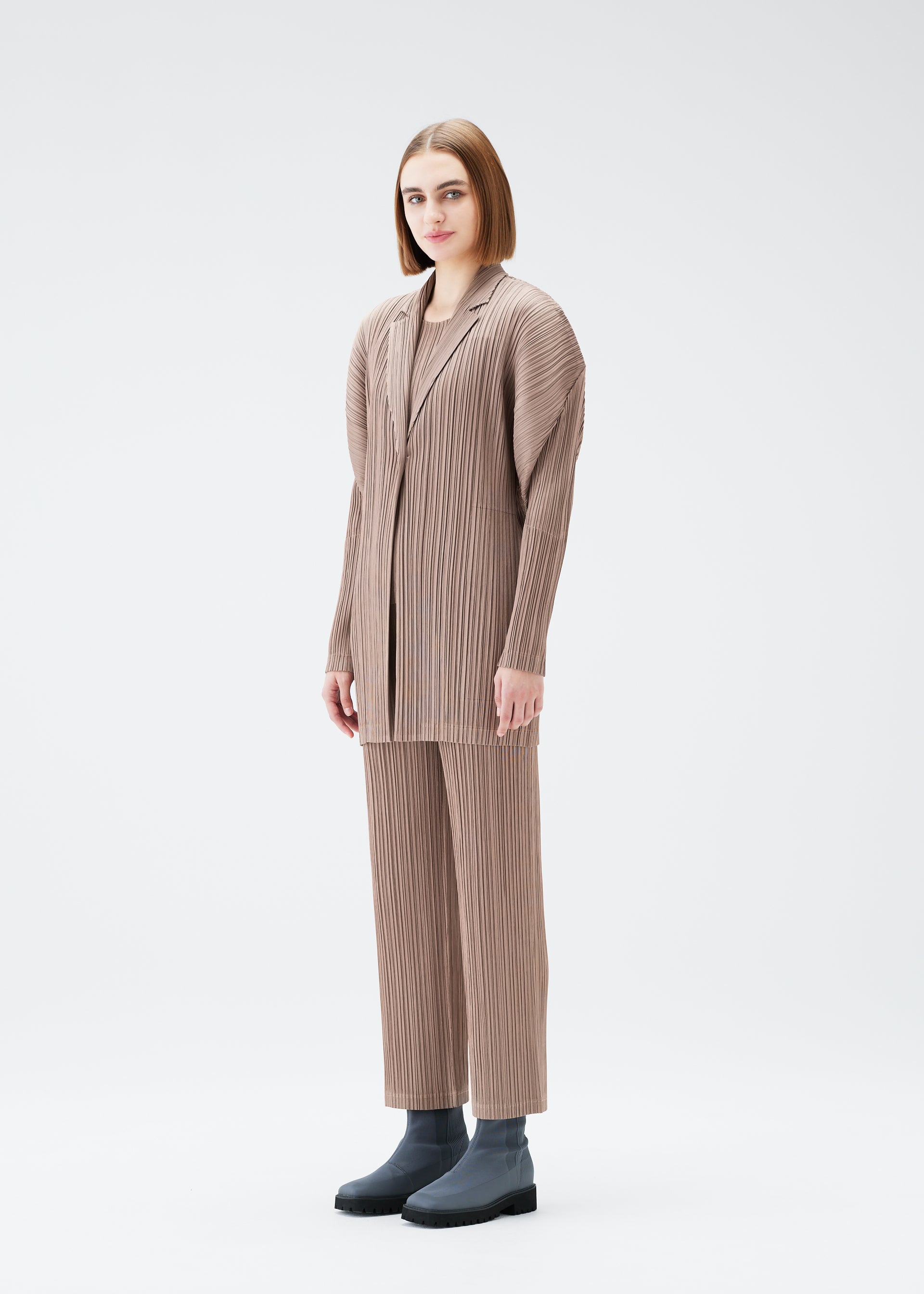 This pleated jacket has a straight fit, classic collar, one-button closure, and two side pockets.