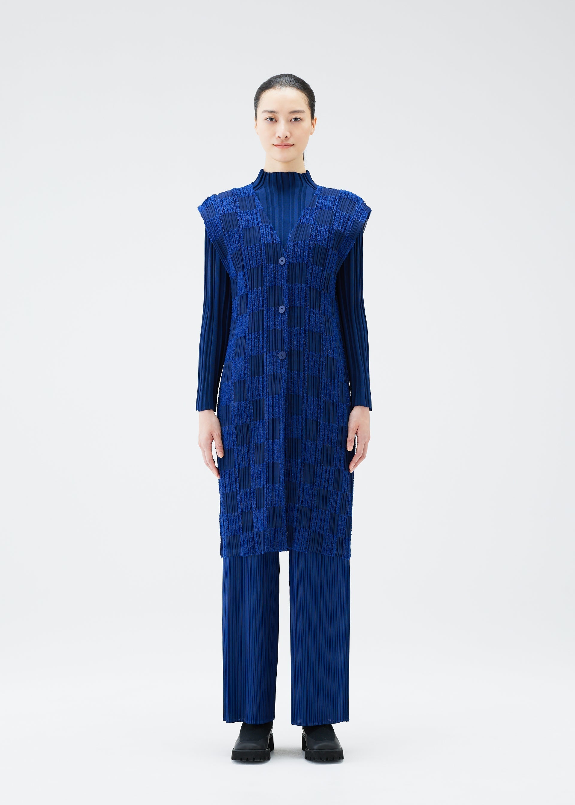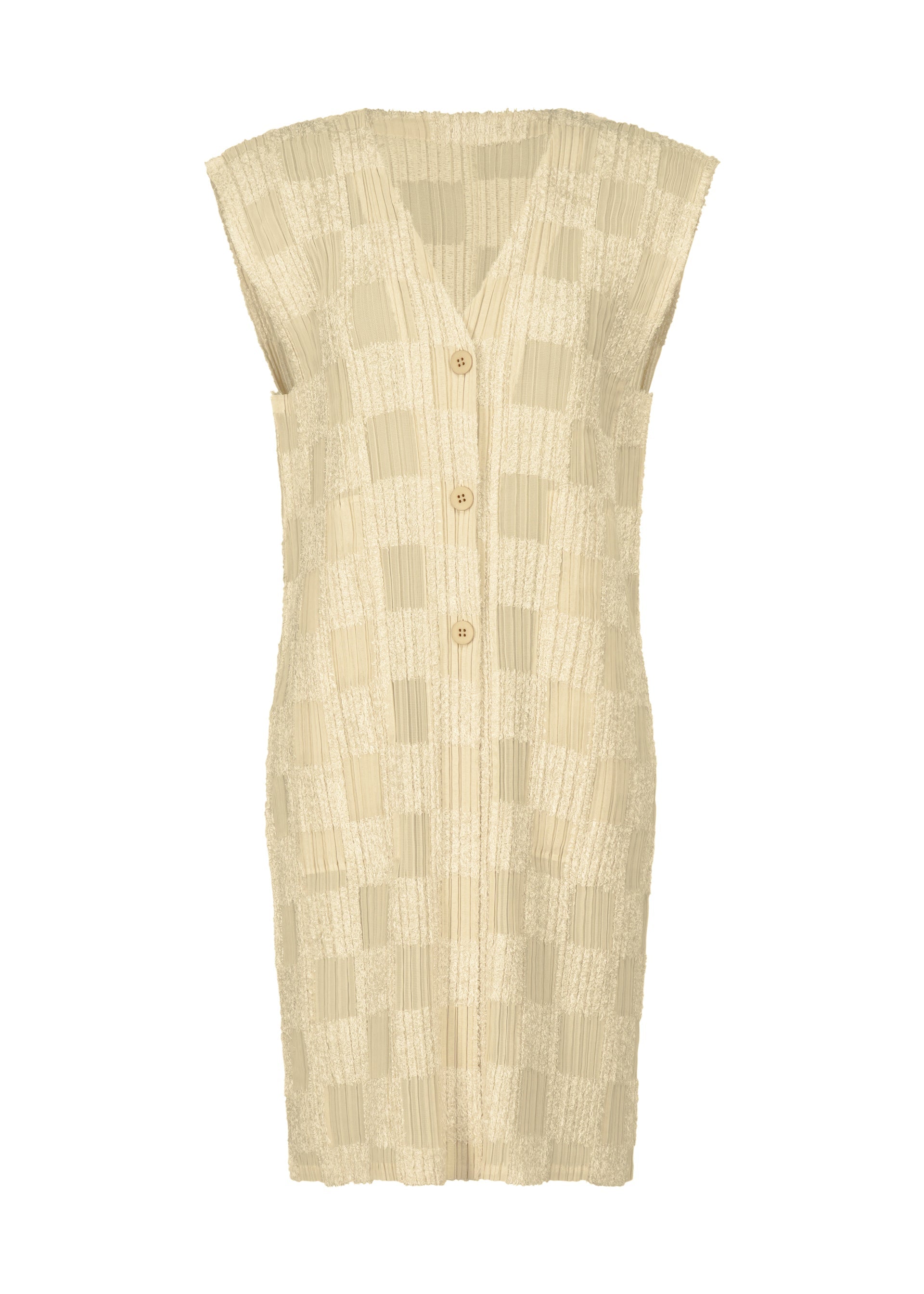 This buttoned long vest is characterized by its plaid pattern with different materials. It is sheer and can be layered with a variety of items. It has pockets on both sides.