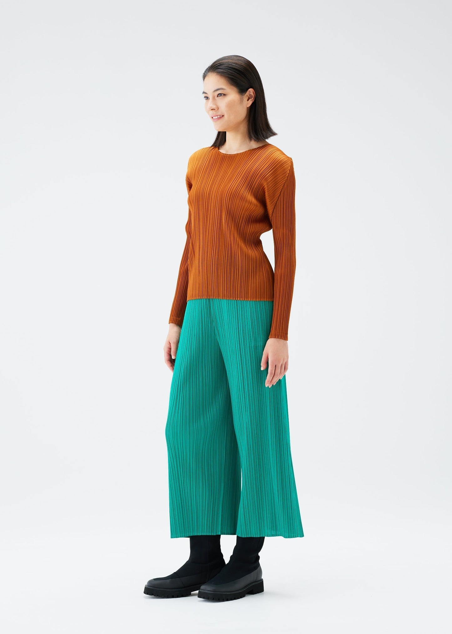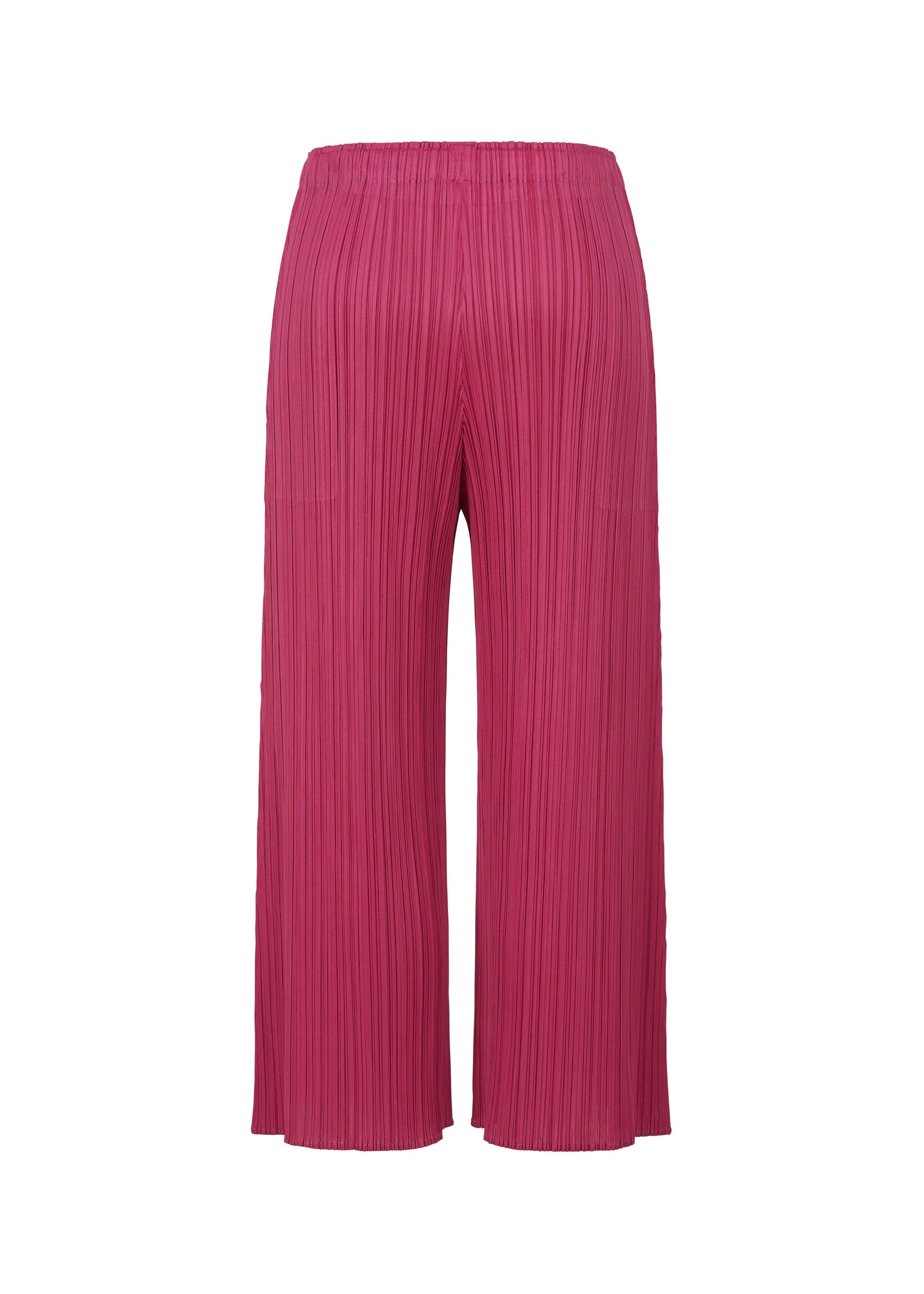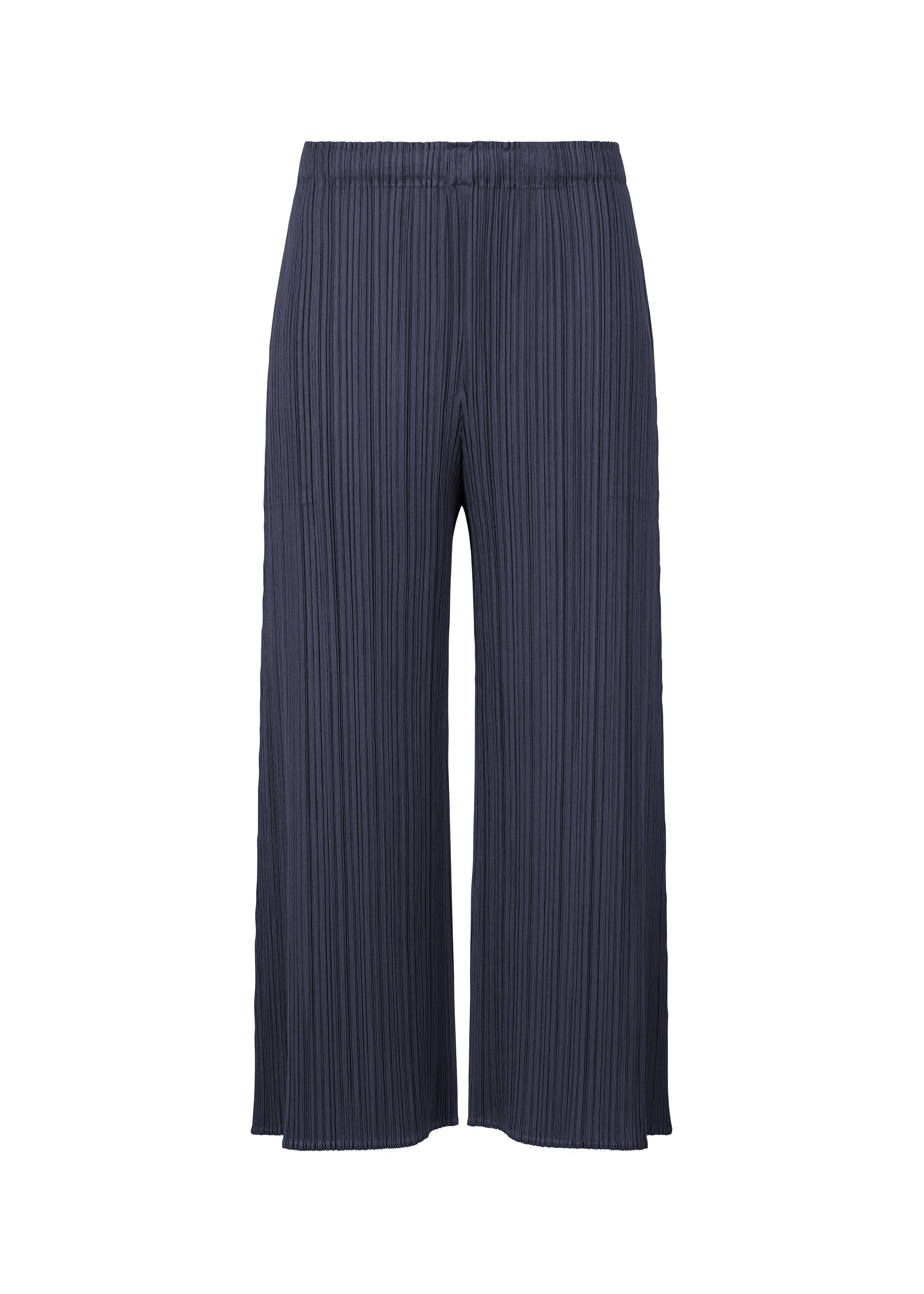 These pleated pants have a wide leg, elastic waist, and two side pockets.