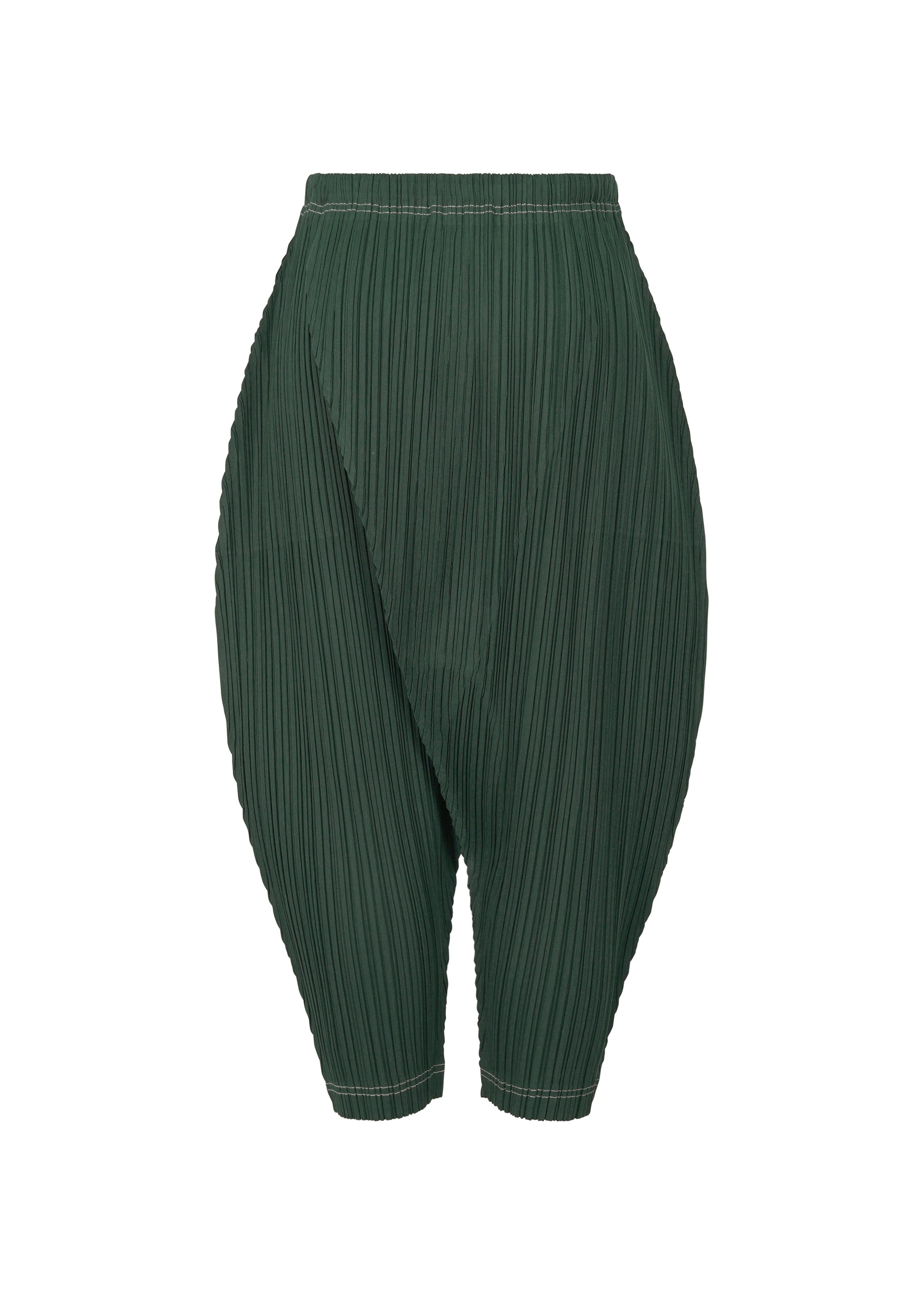 These pants are characterized by the soft texture unique to ramie. They have a distinctive wrapped silhouette. They have pockets on both sides.