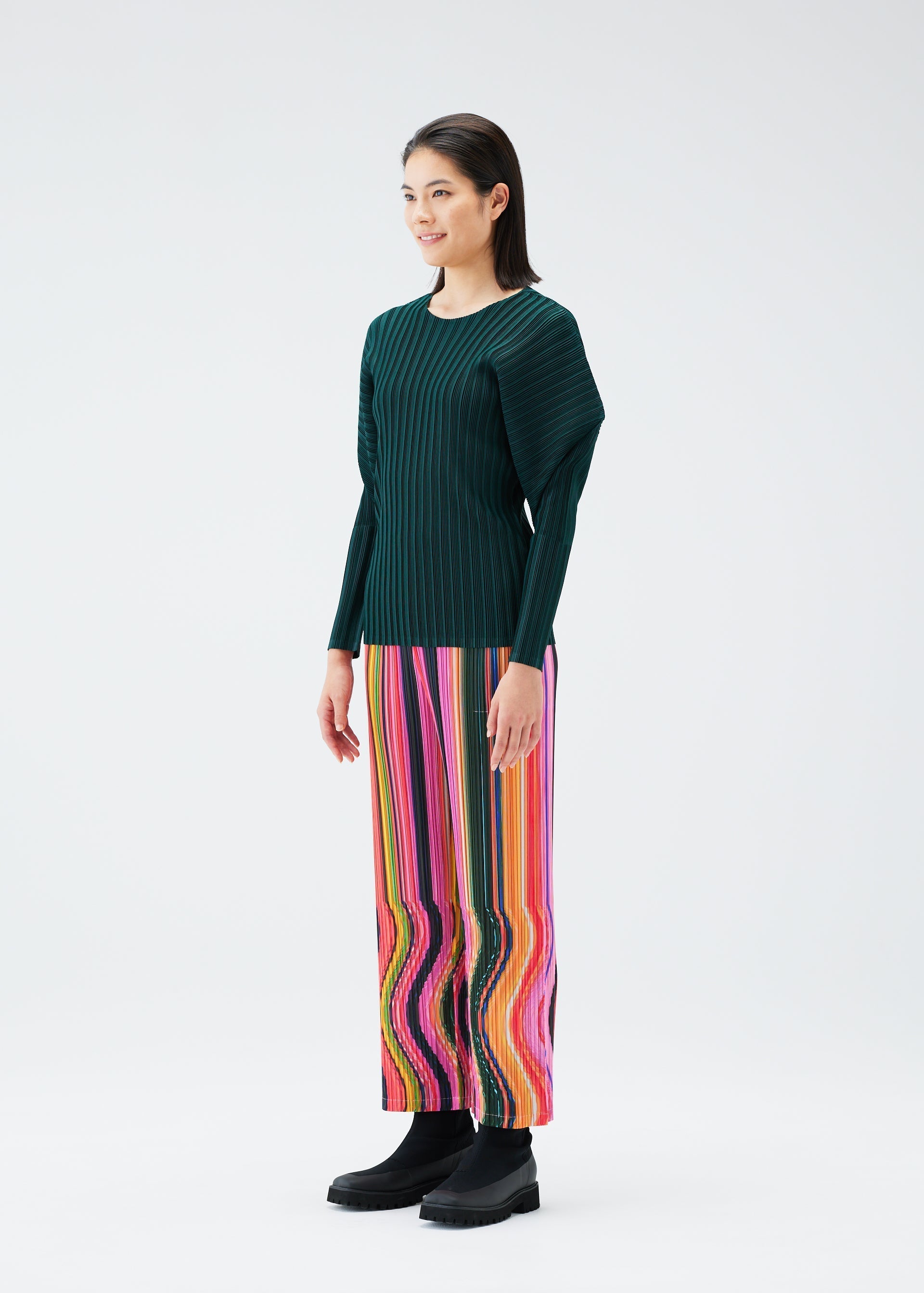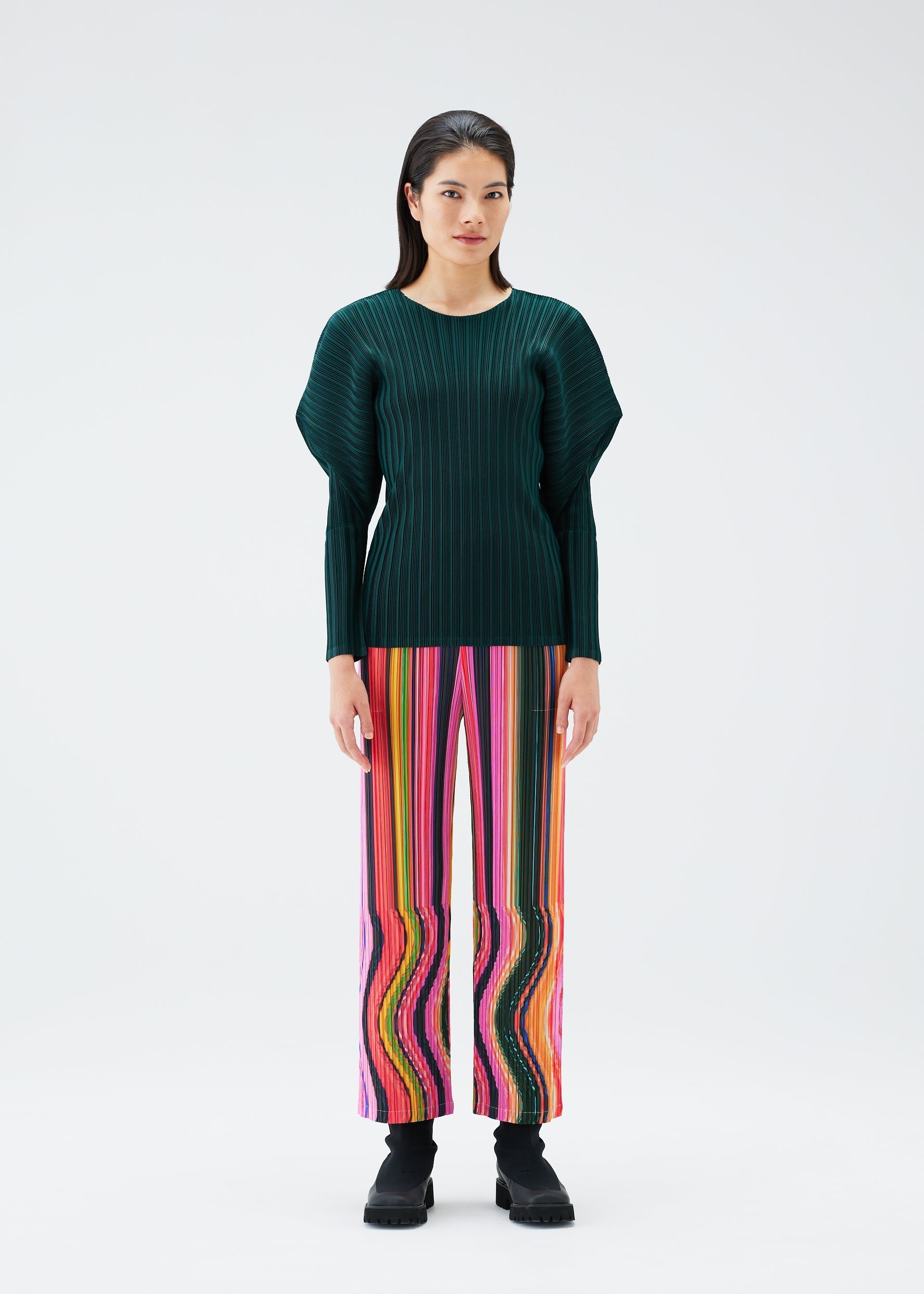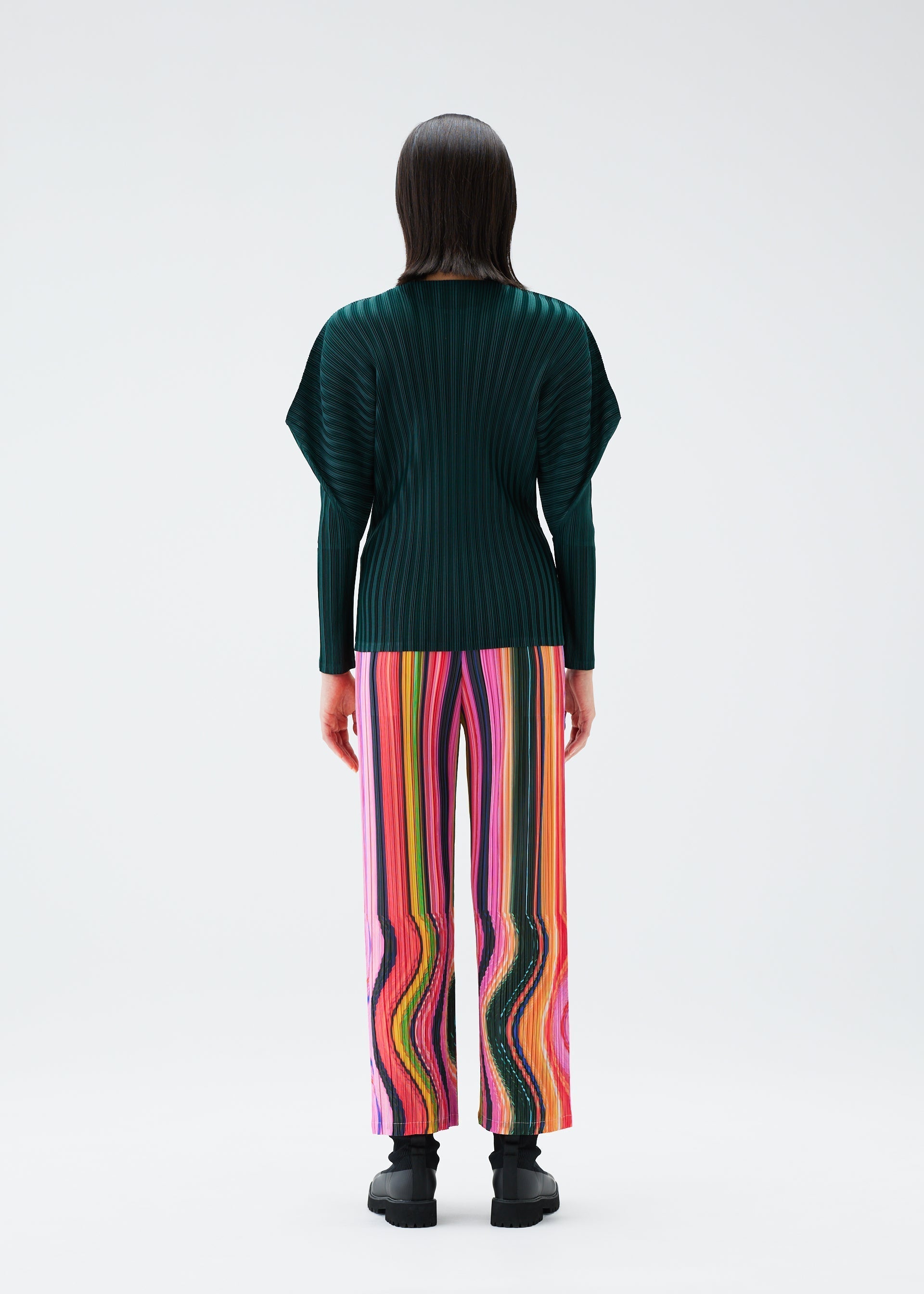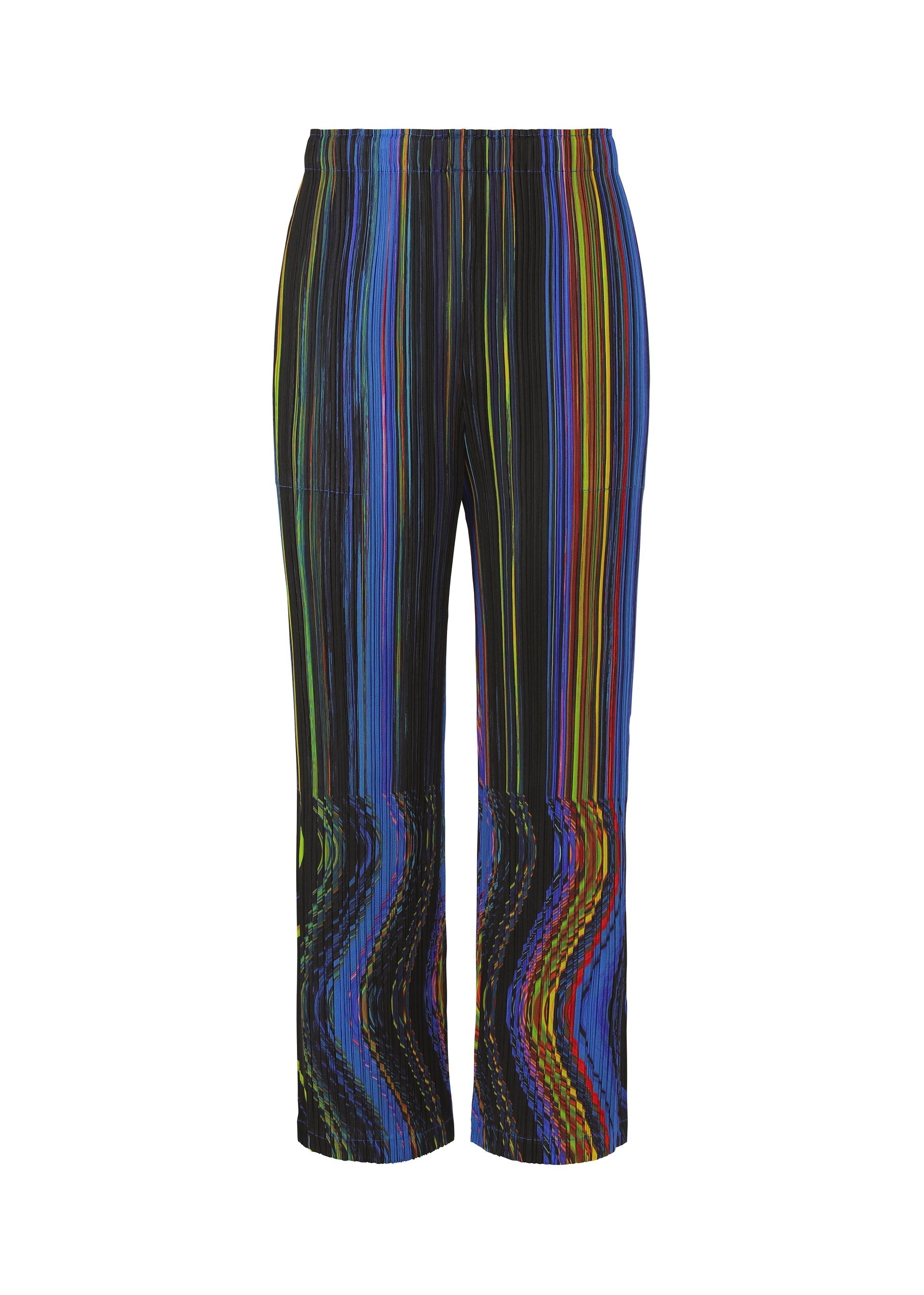 These straight pants have a print that depicts the mysterious space-time continuum passed through when warping. The pattern was created by curving film during photography and then enlarging the photograph. The pants have pockets on both sides.