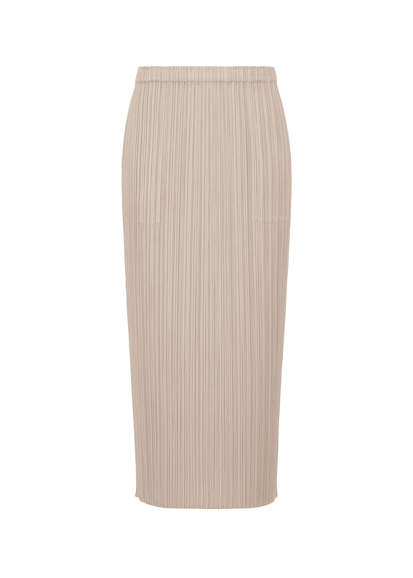 This pleated skirt features a straight, slim shape with an elastic waist and two side pockets.