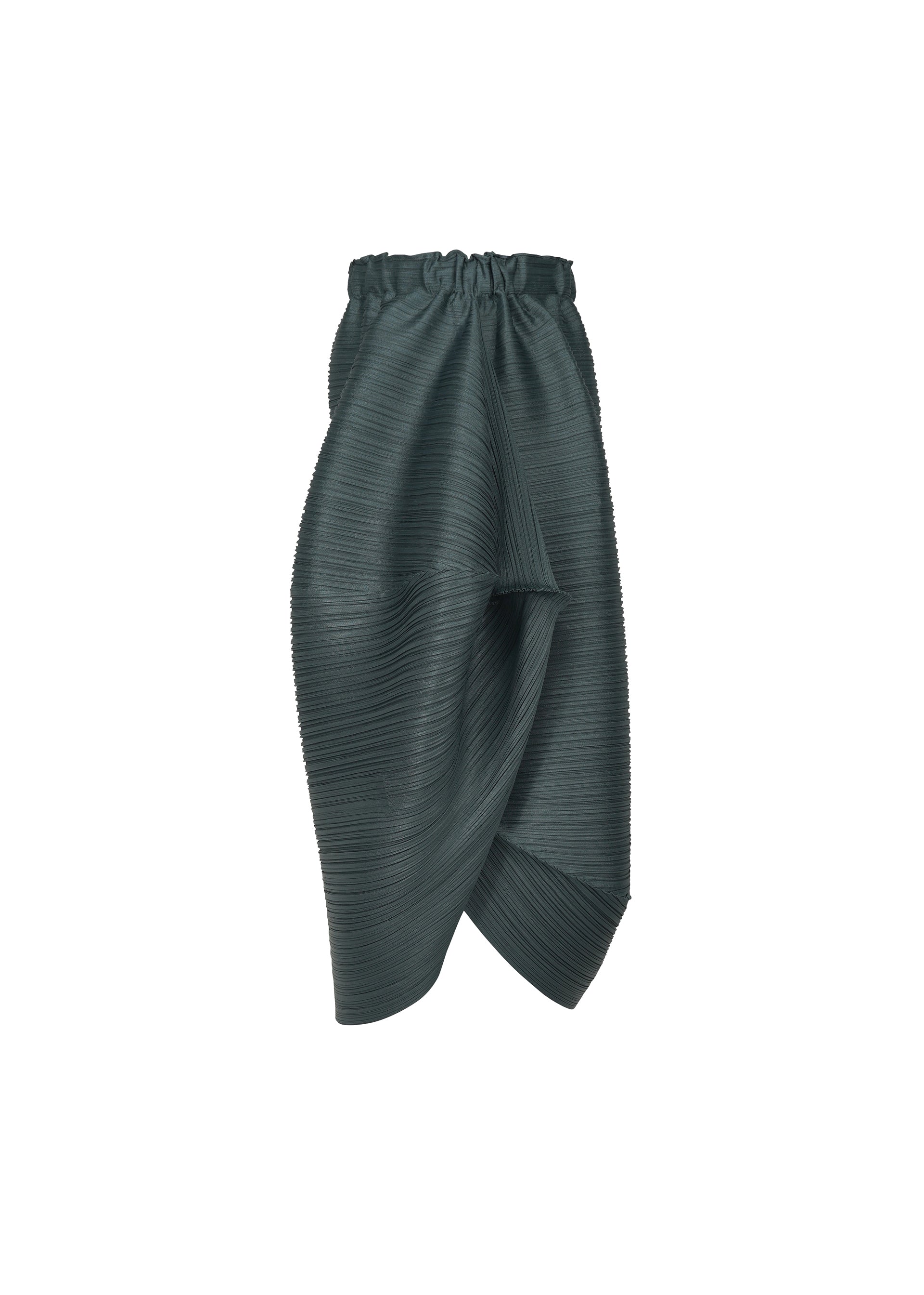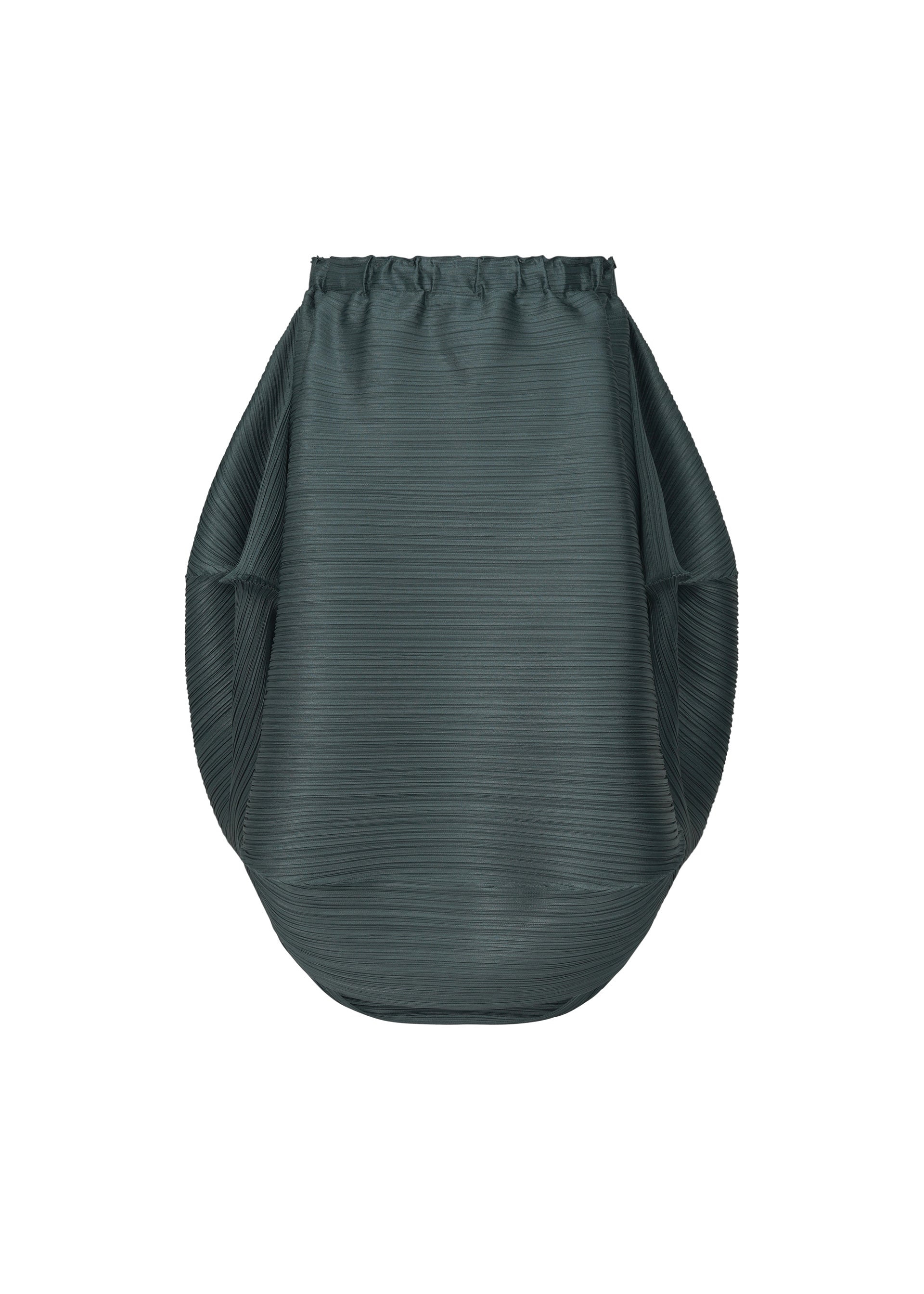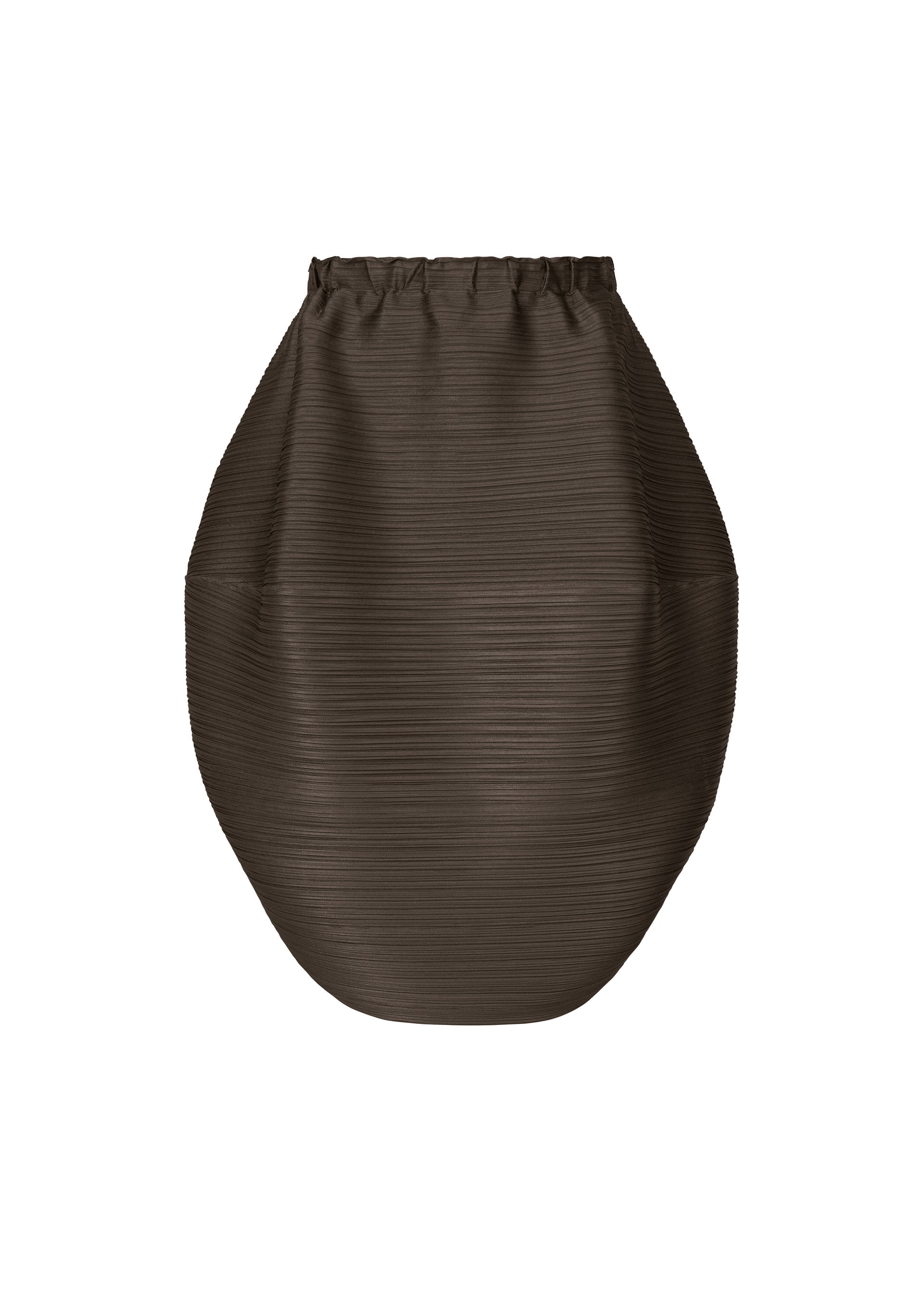 This skirt has the shape of a UFO when laid flat. Its horizontal pleats create a rounded silhouette.