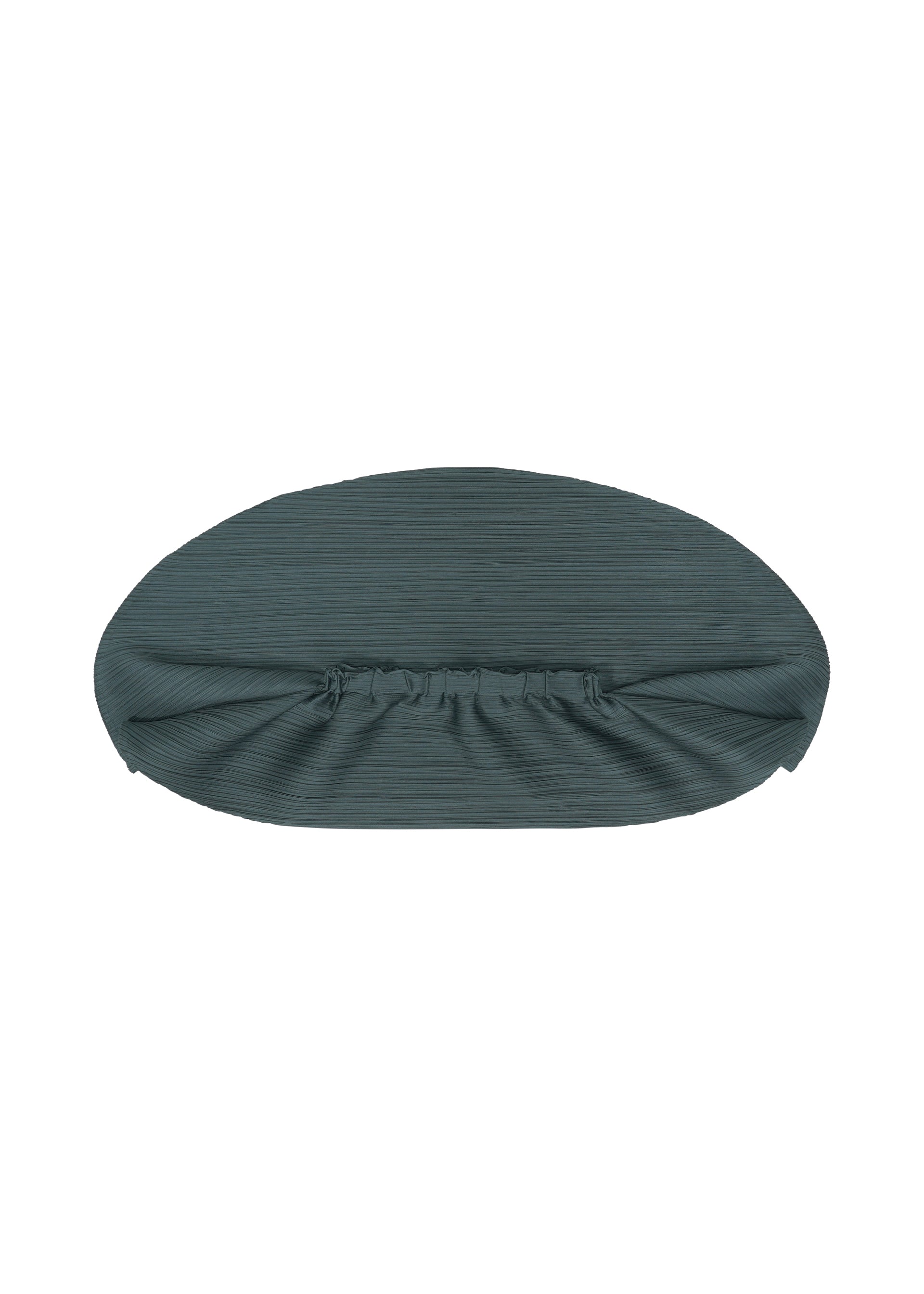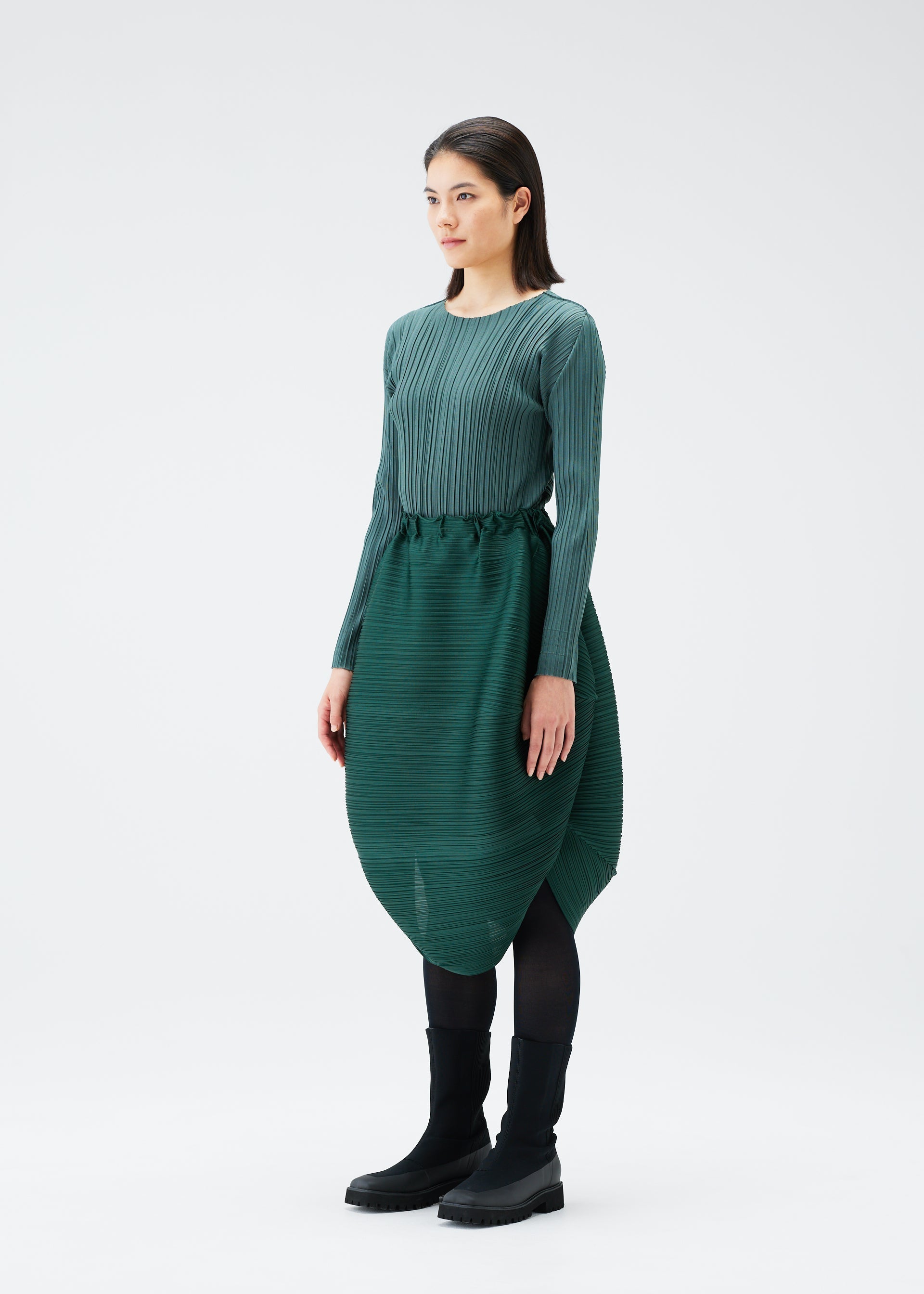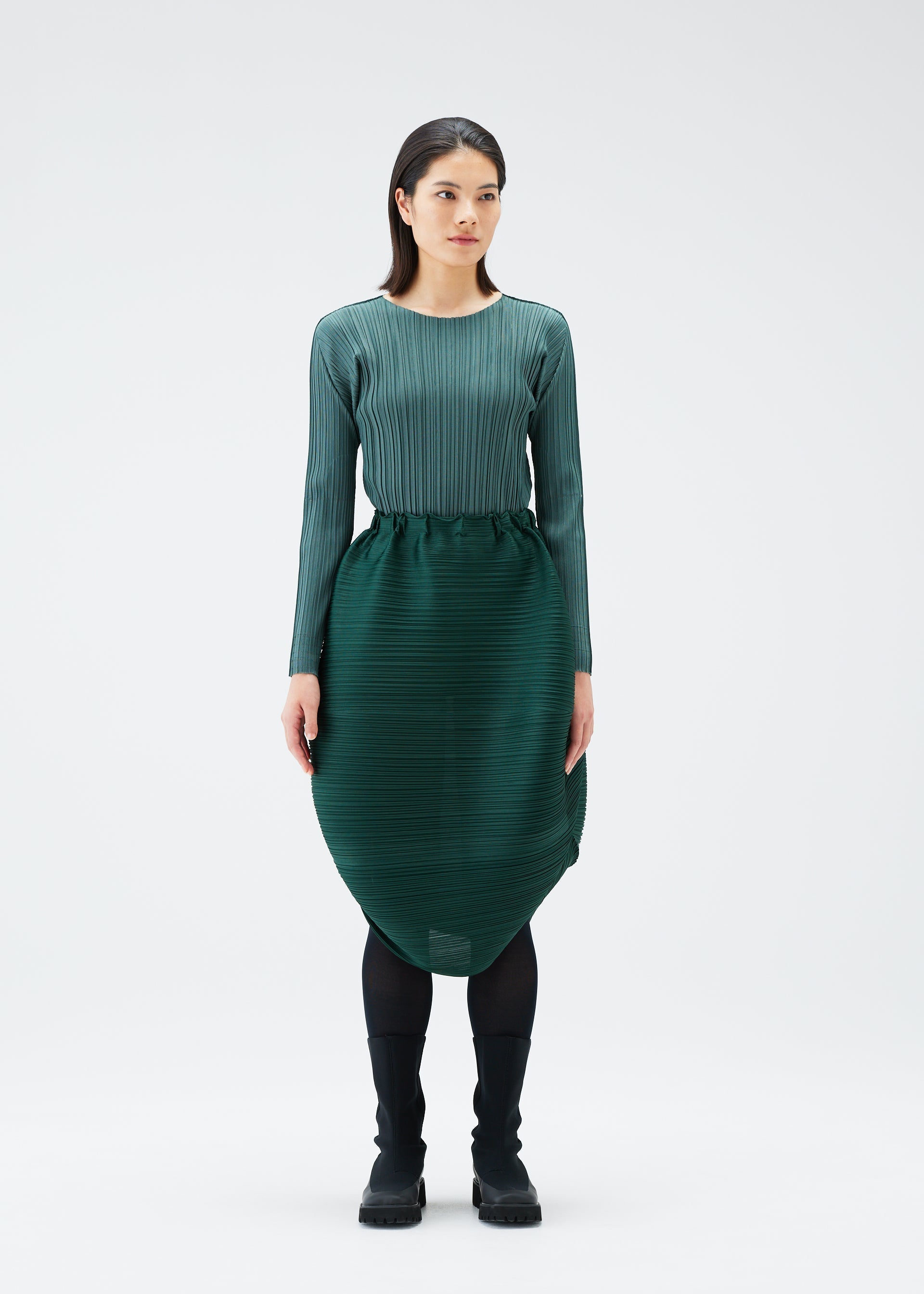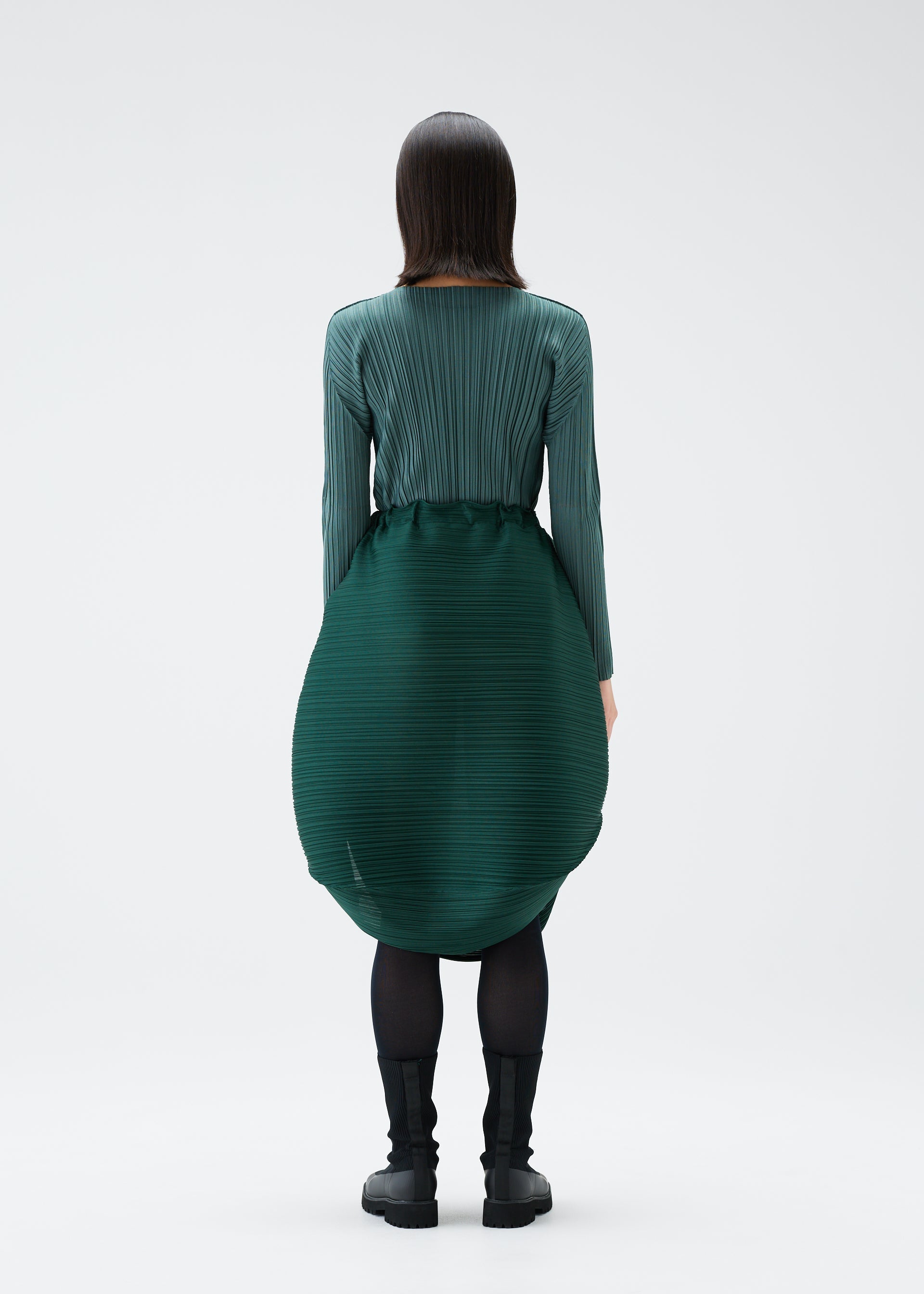 This skirt has the shape of a UFO when laid flat. Its horizontal pleats create a rounded silhouette.