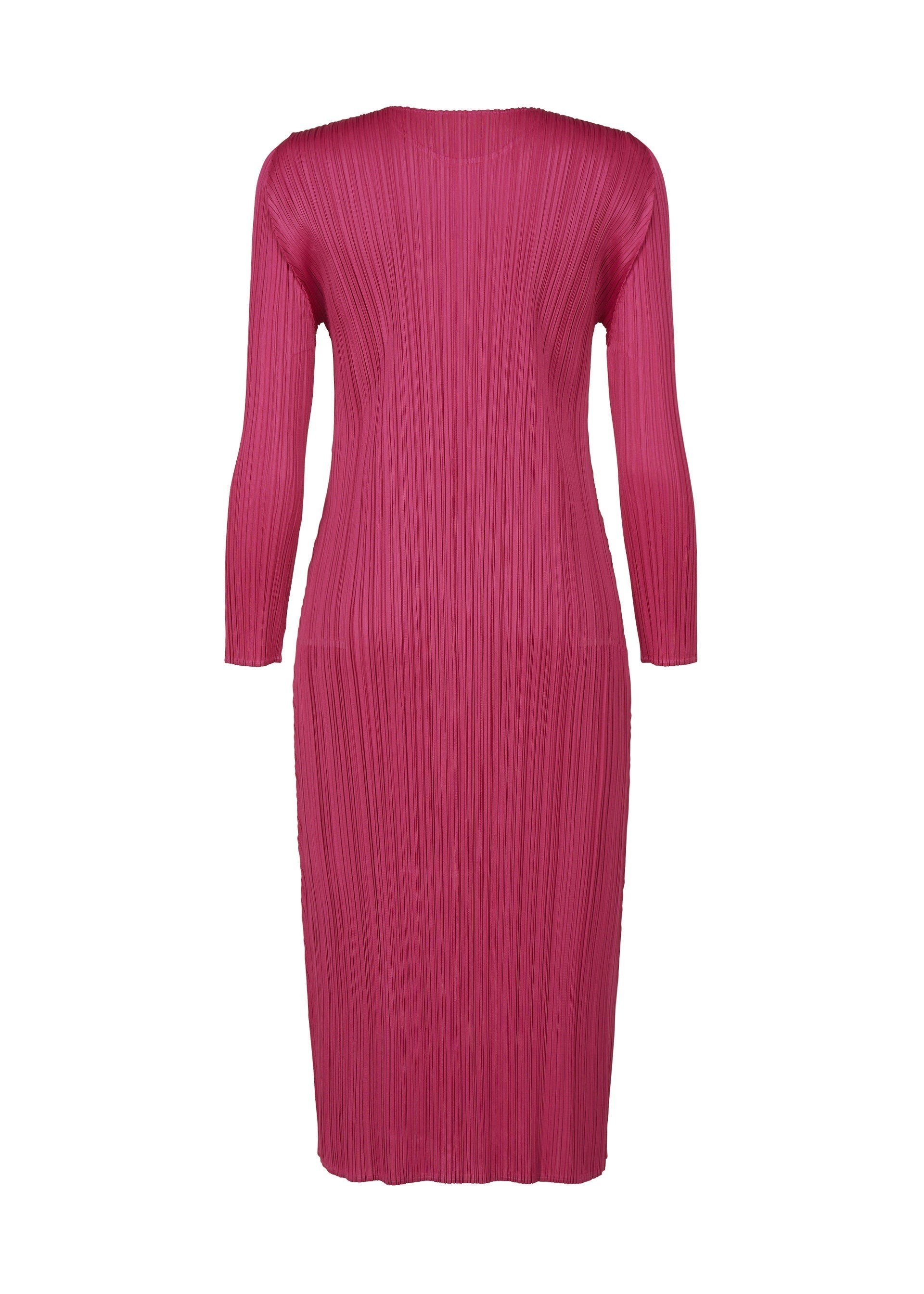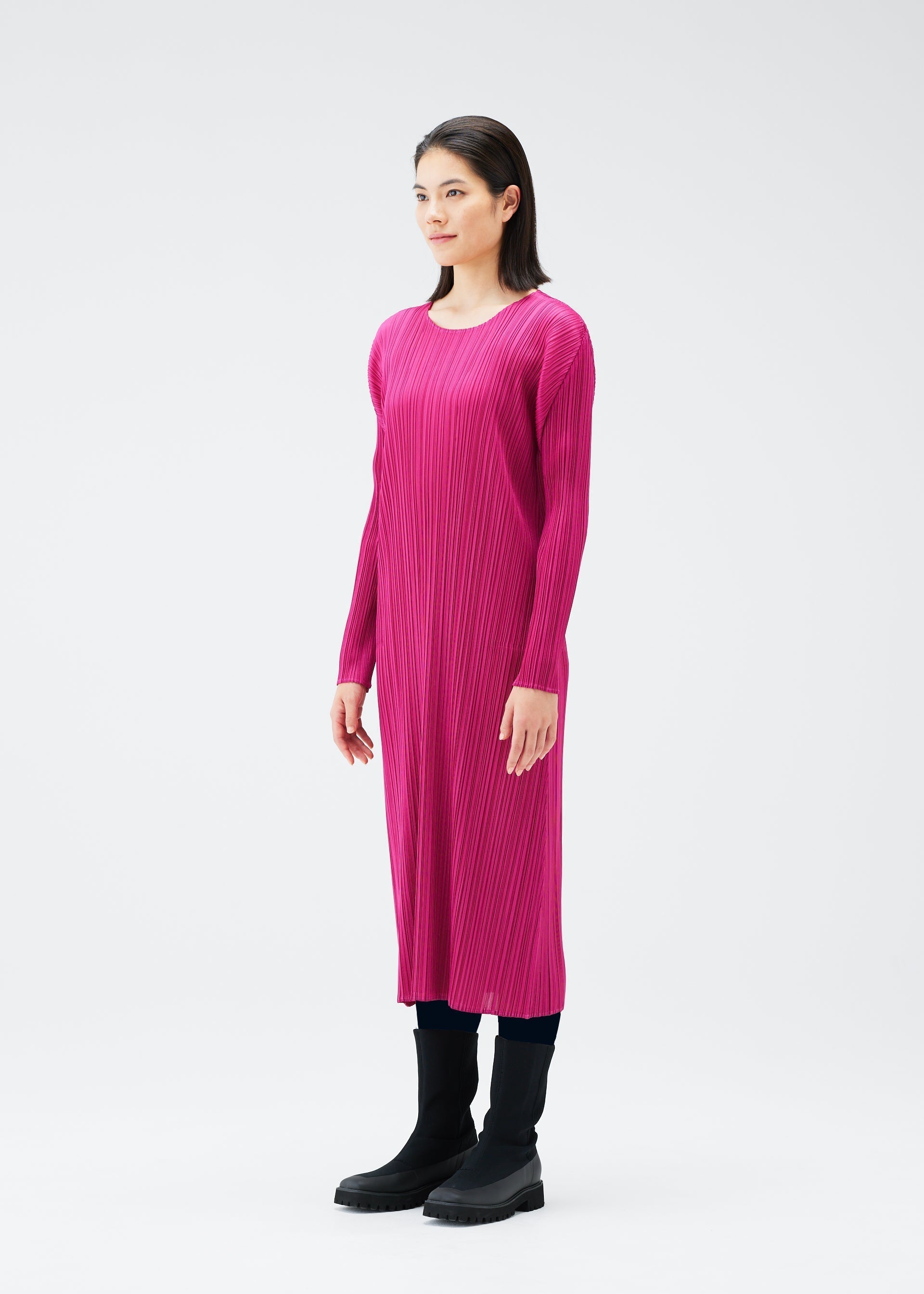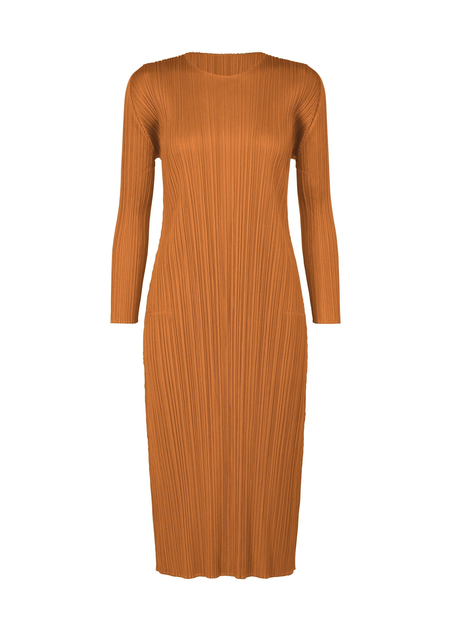 This pleated long sleeve dress has a relaxed fit, round neck, and two side pockets.
