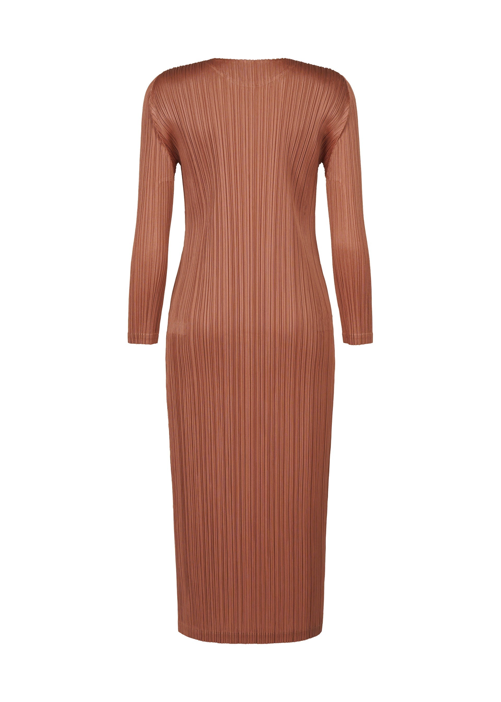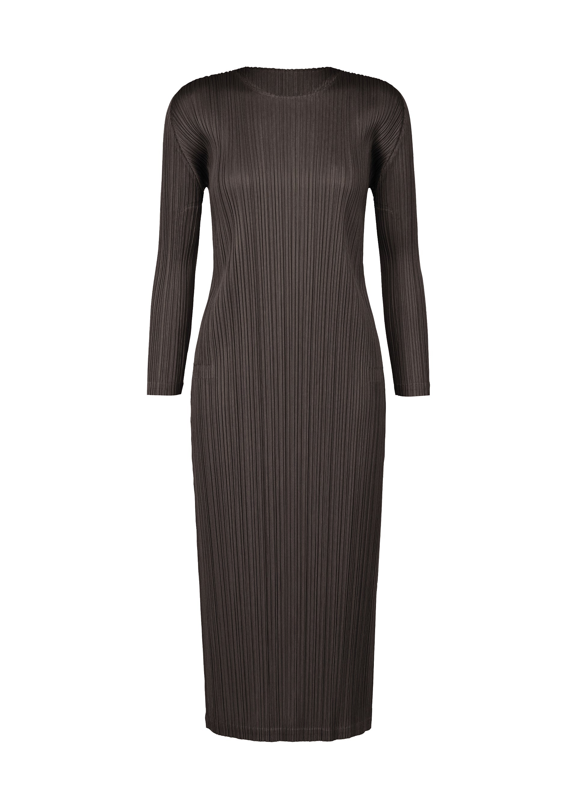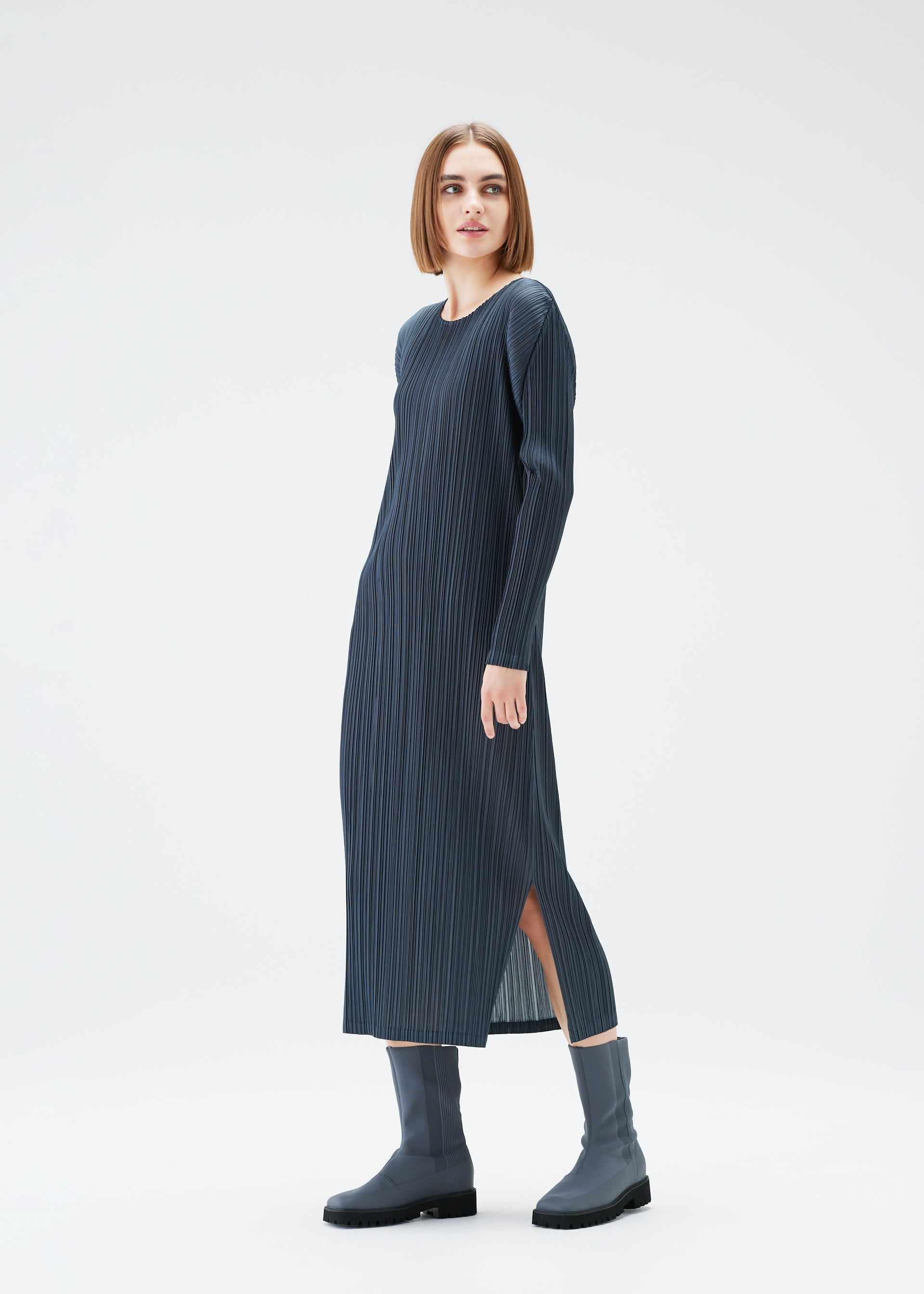 This round-neck, long-sleeved dress is available in warm, subdued colors. It has a slit on the left side.