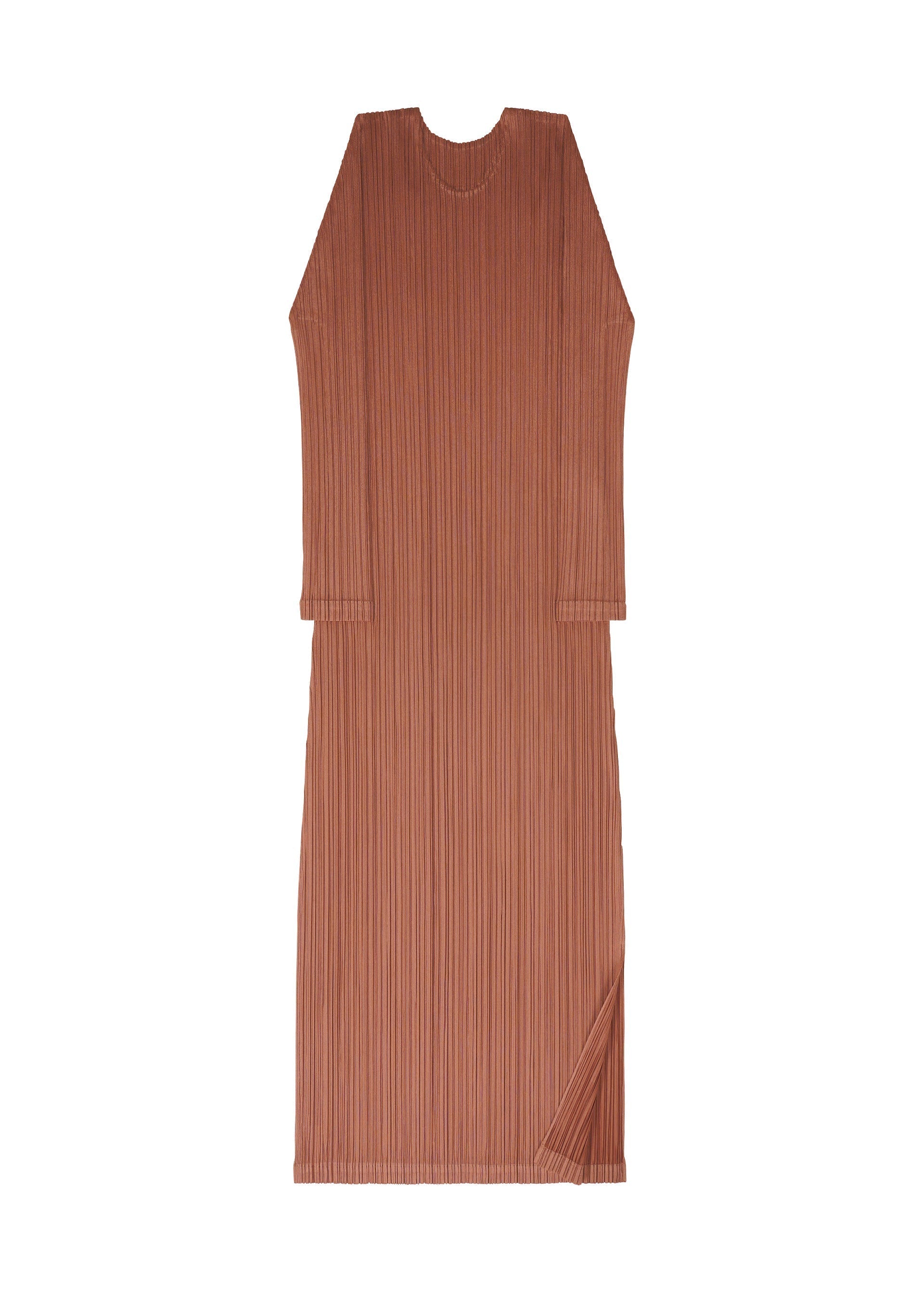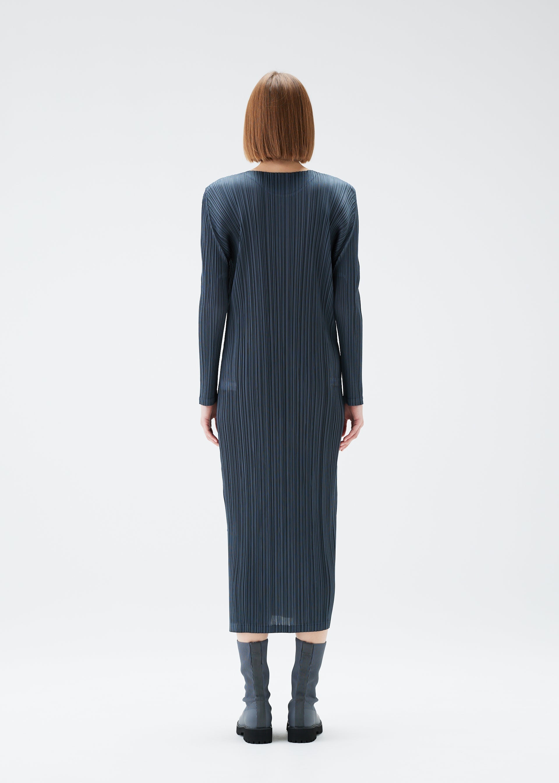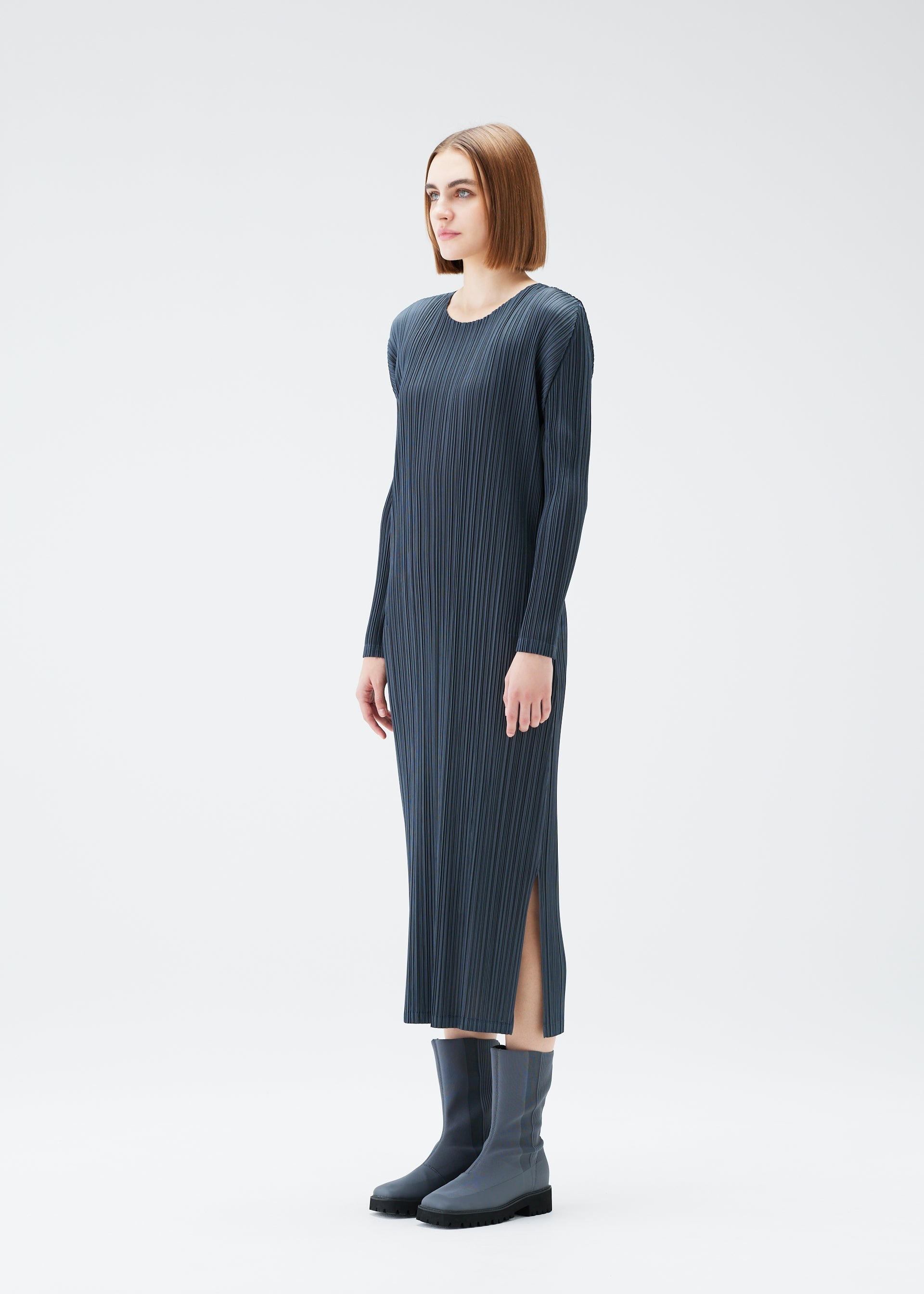 This round-neck, long-sleeved dress is available in warm, subdued colors. It has a slit on the left side.