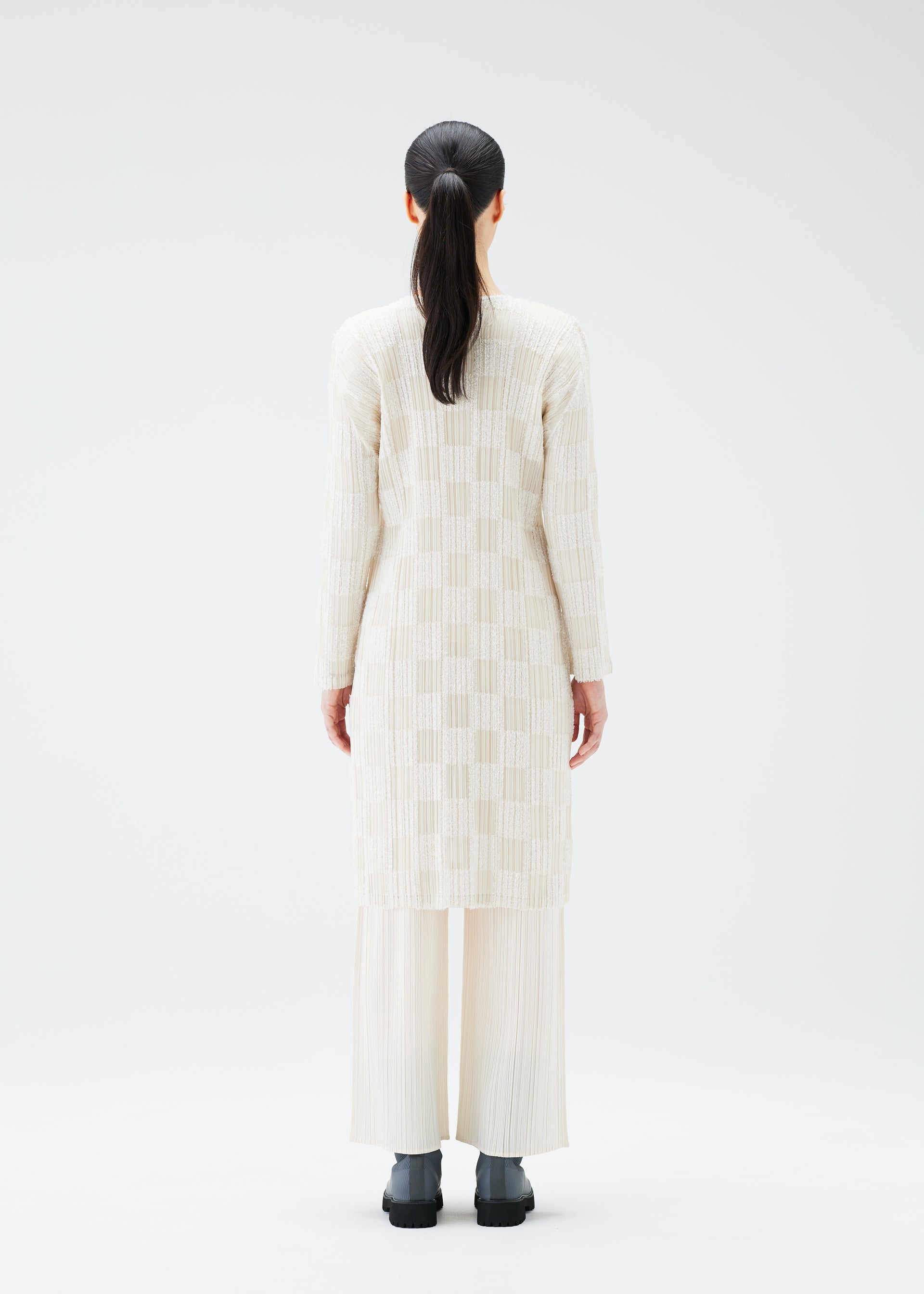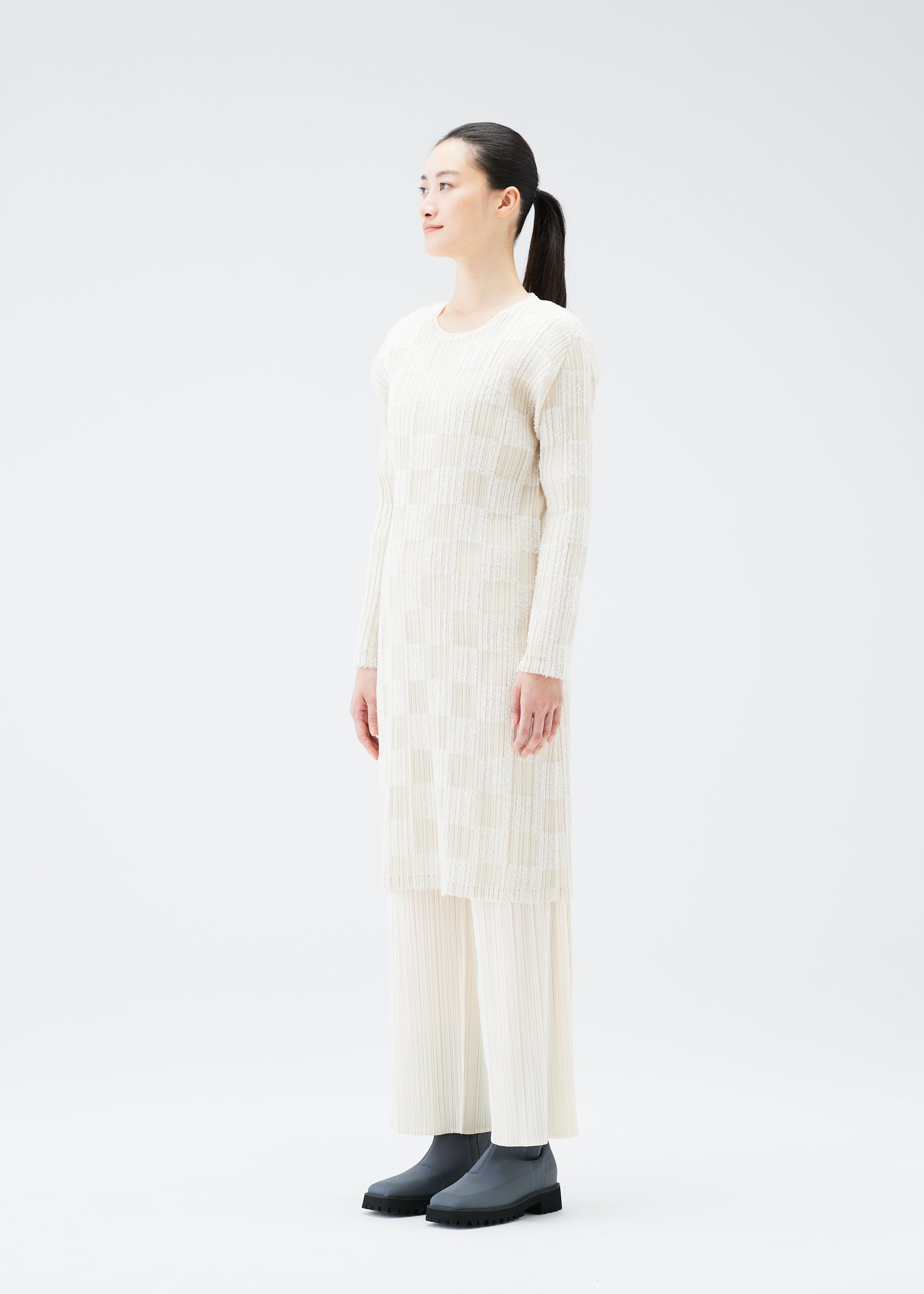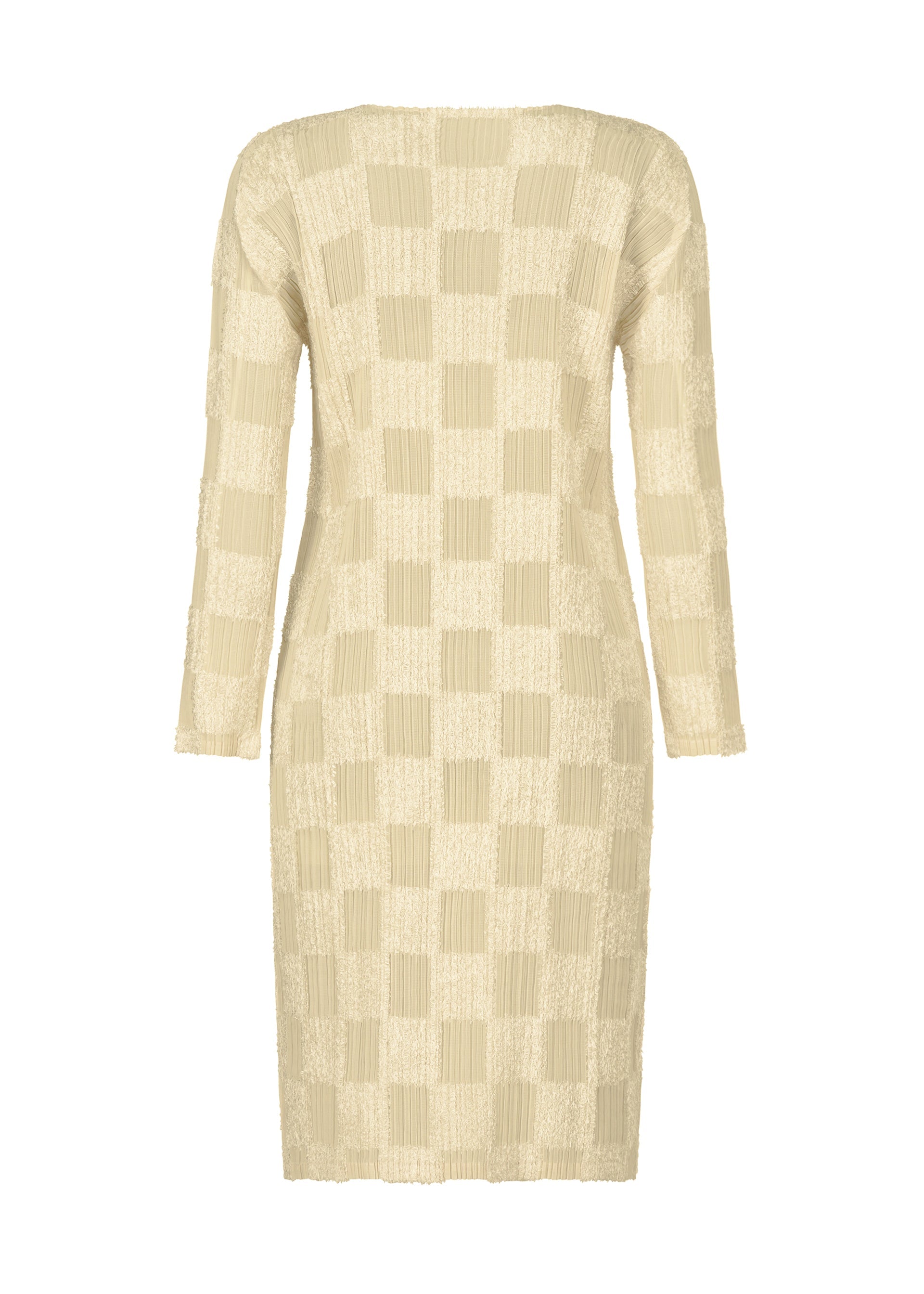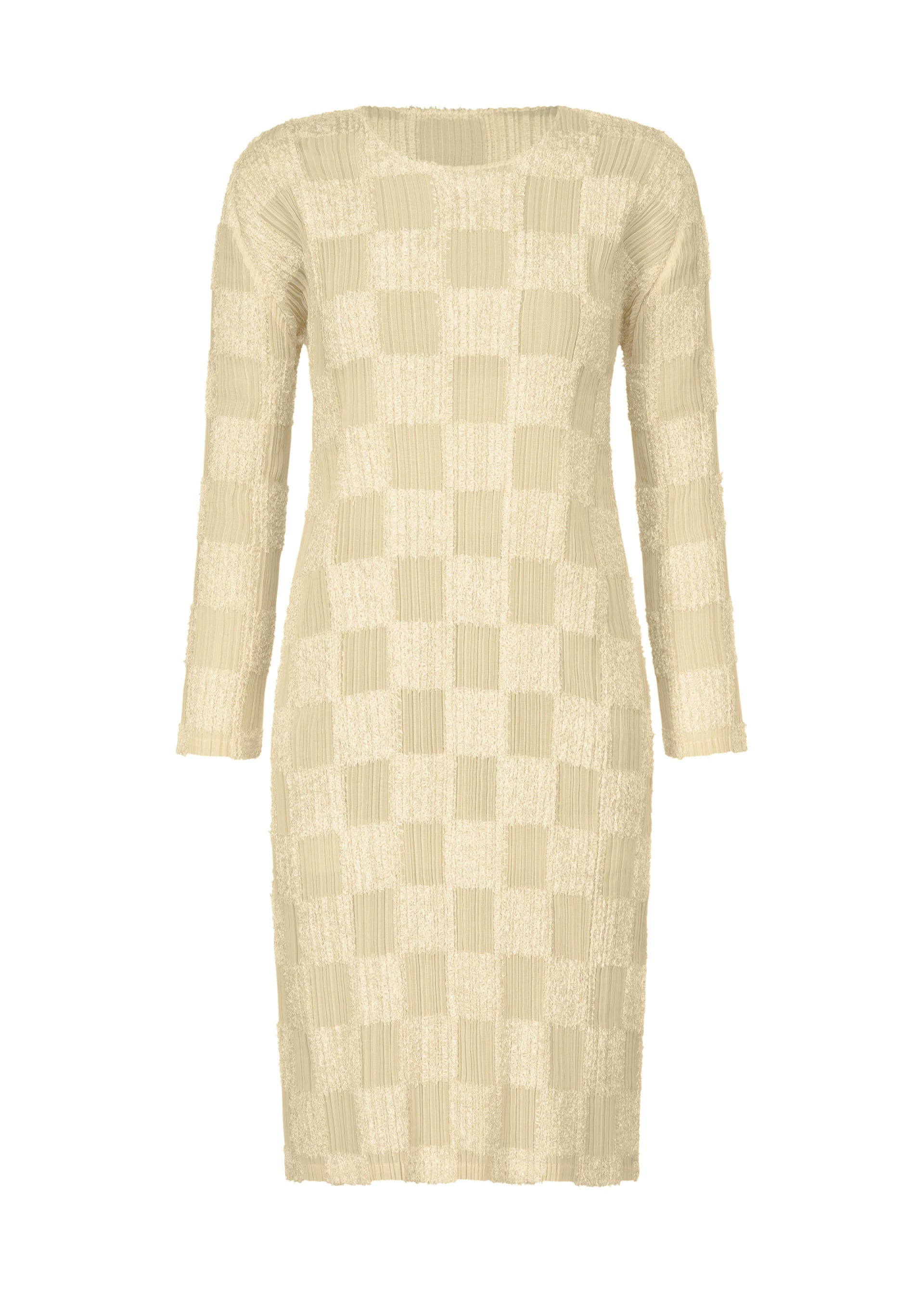 This round-neck, long-sleeved dress is characterized by its plaid pattern with different materials. It is sheer and can be layered with a variety of items.