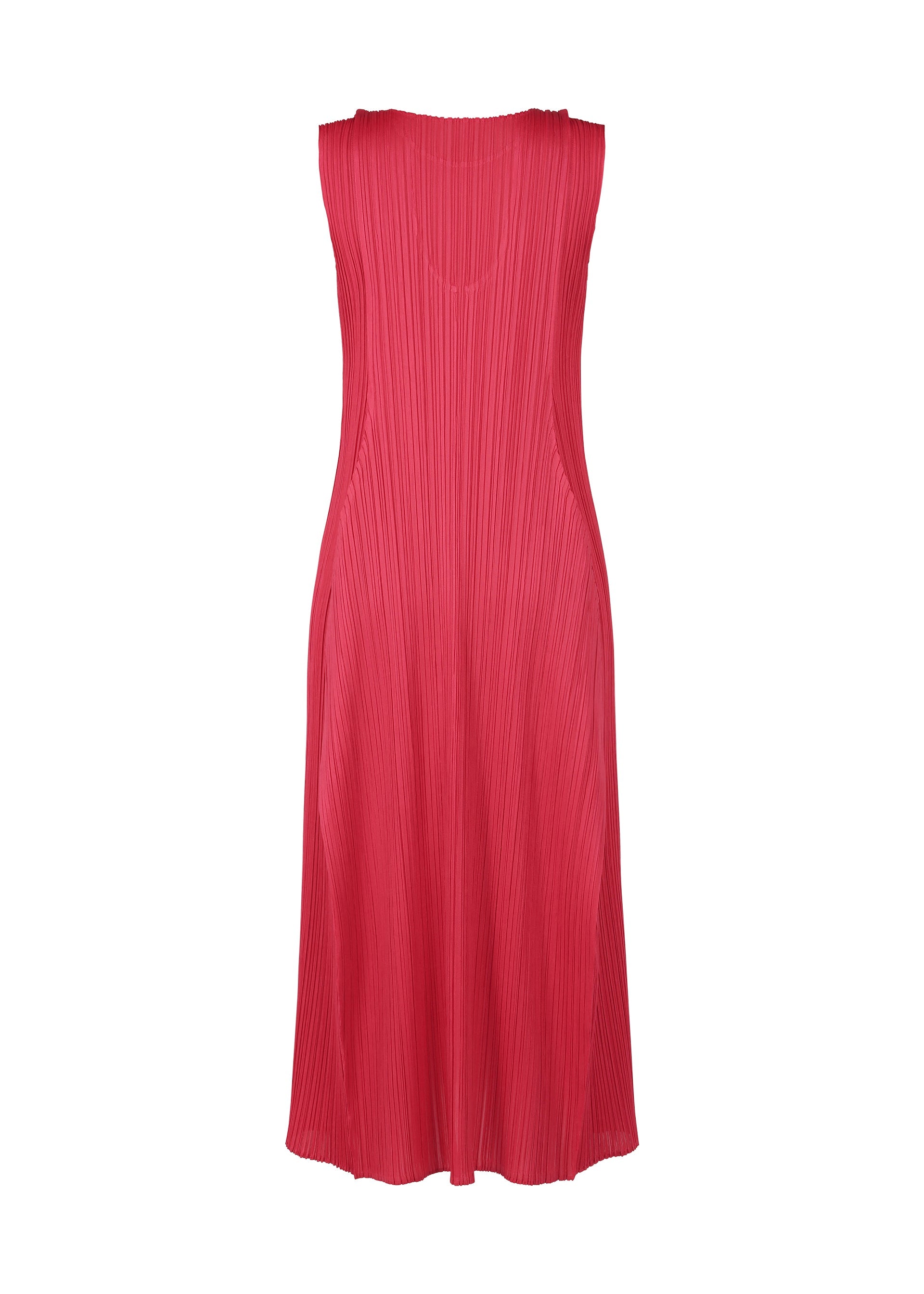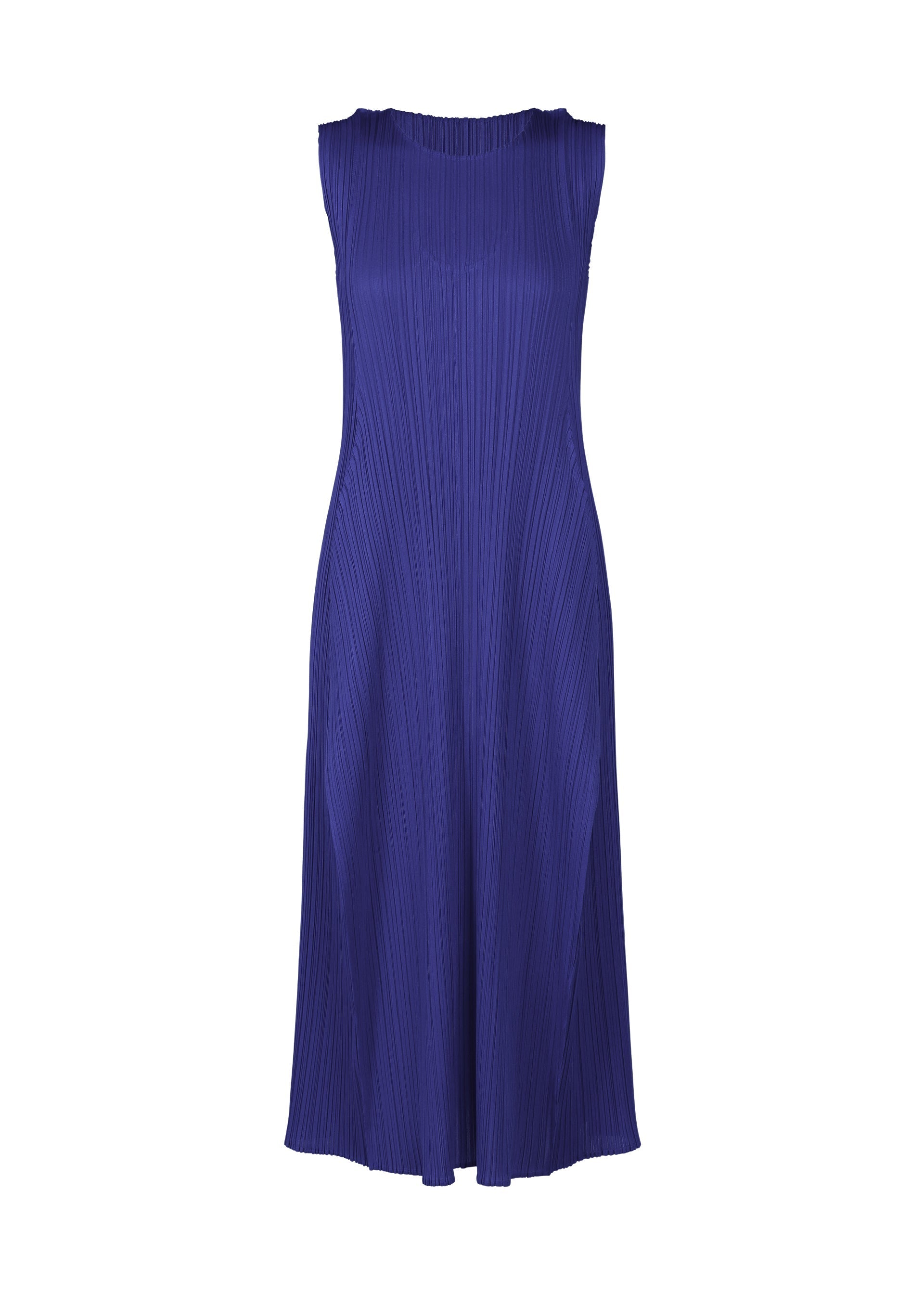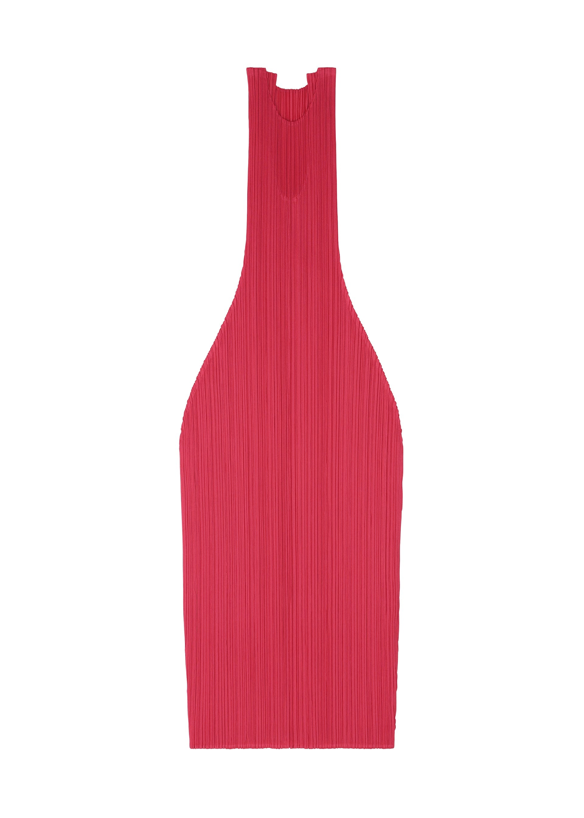 This round-neck, sleeveless dress is characterized by its puffy, three-dimensional silhouette. It is shaped like a wine bottle when laid flat, and has an elegant form when worn.