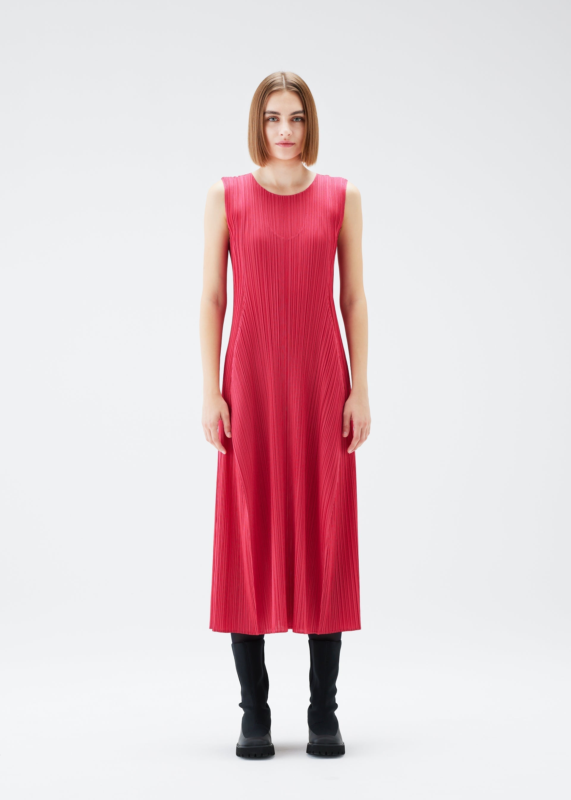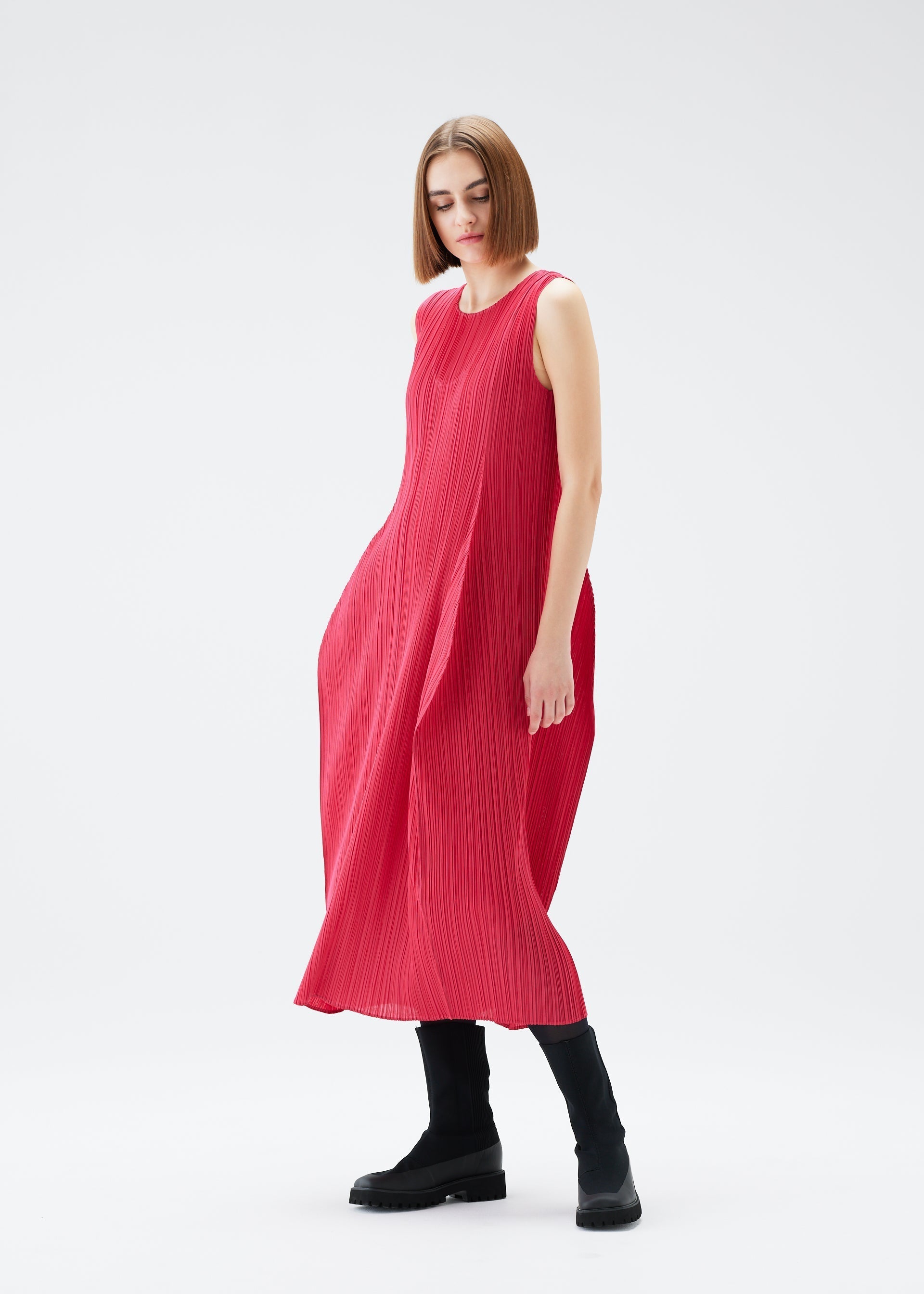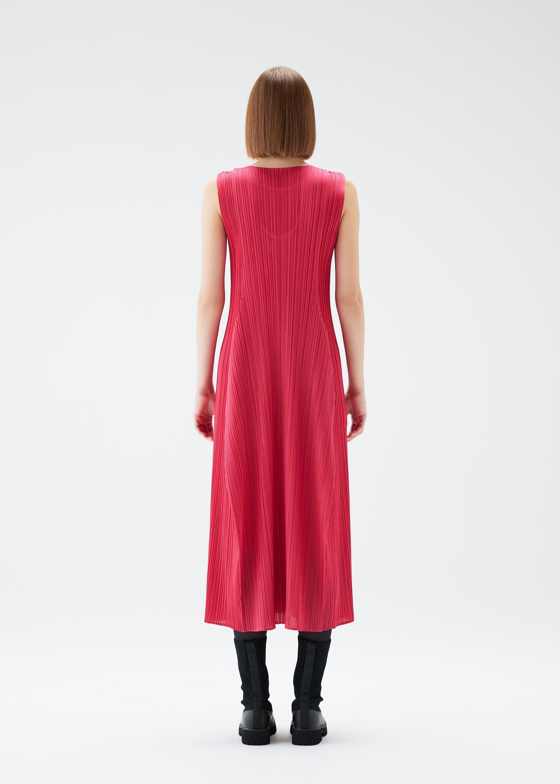 This round-neck, sleeveless dress is characterized by its puffy, three-dimensional silhouette. It is shaped like a wine bottle when laid flat, and has an elegant form when worn.