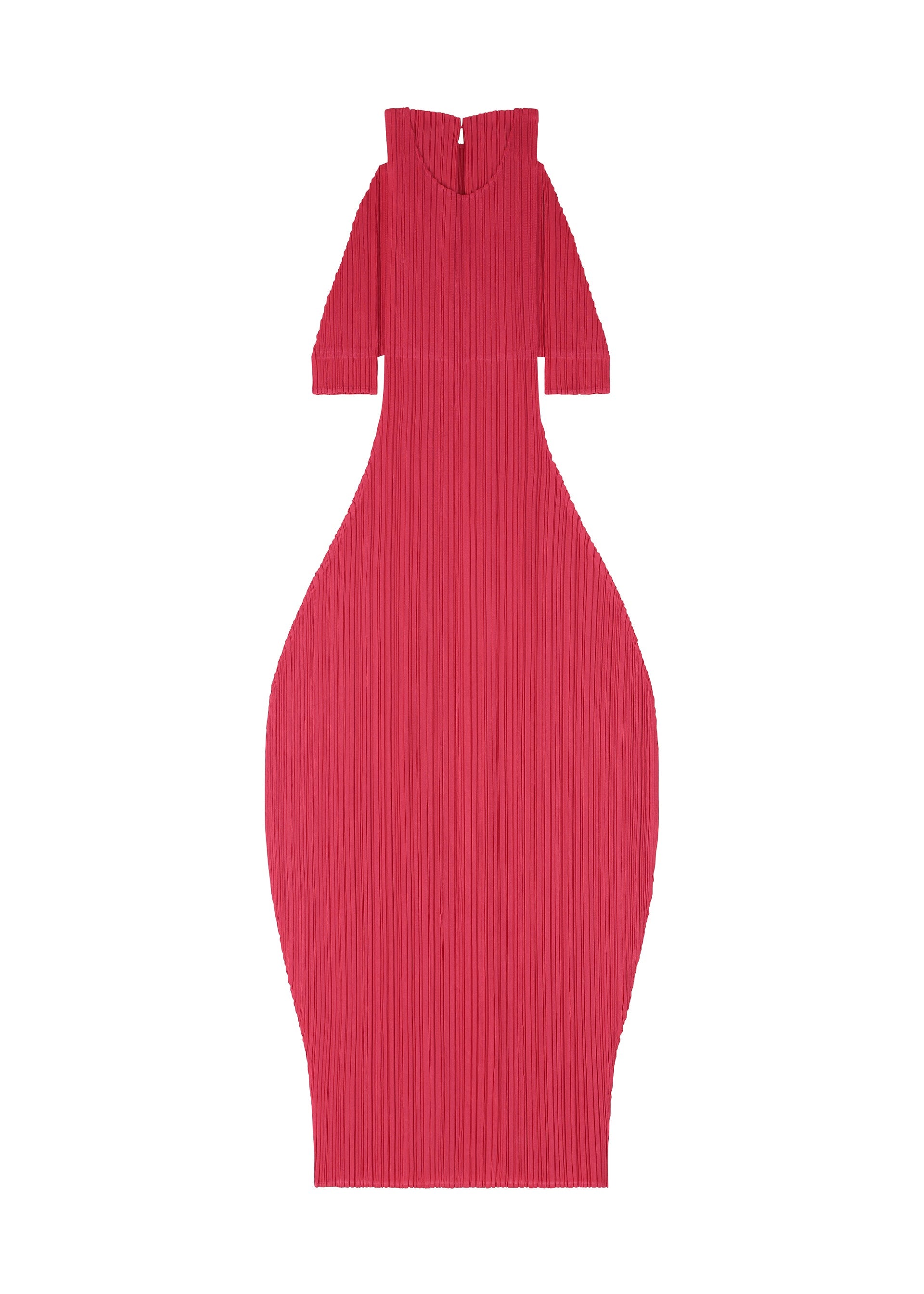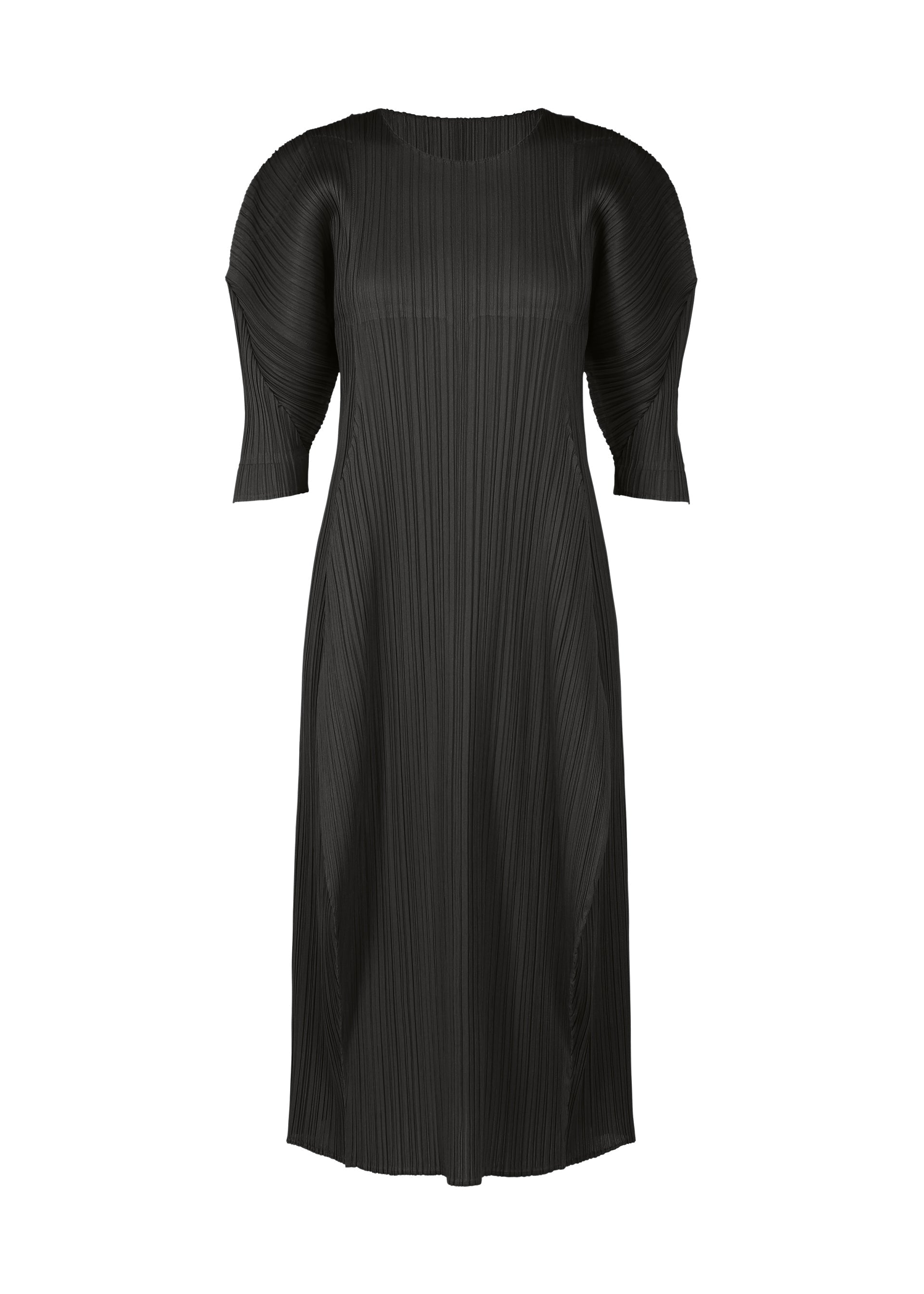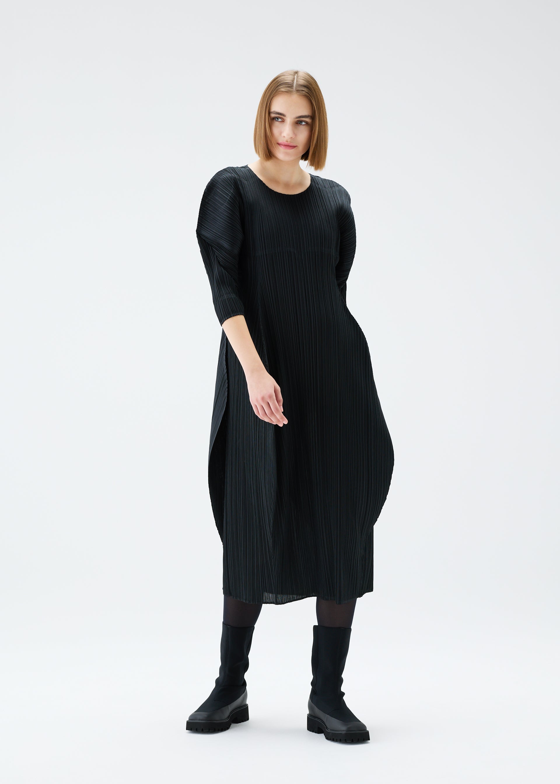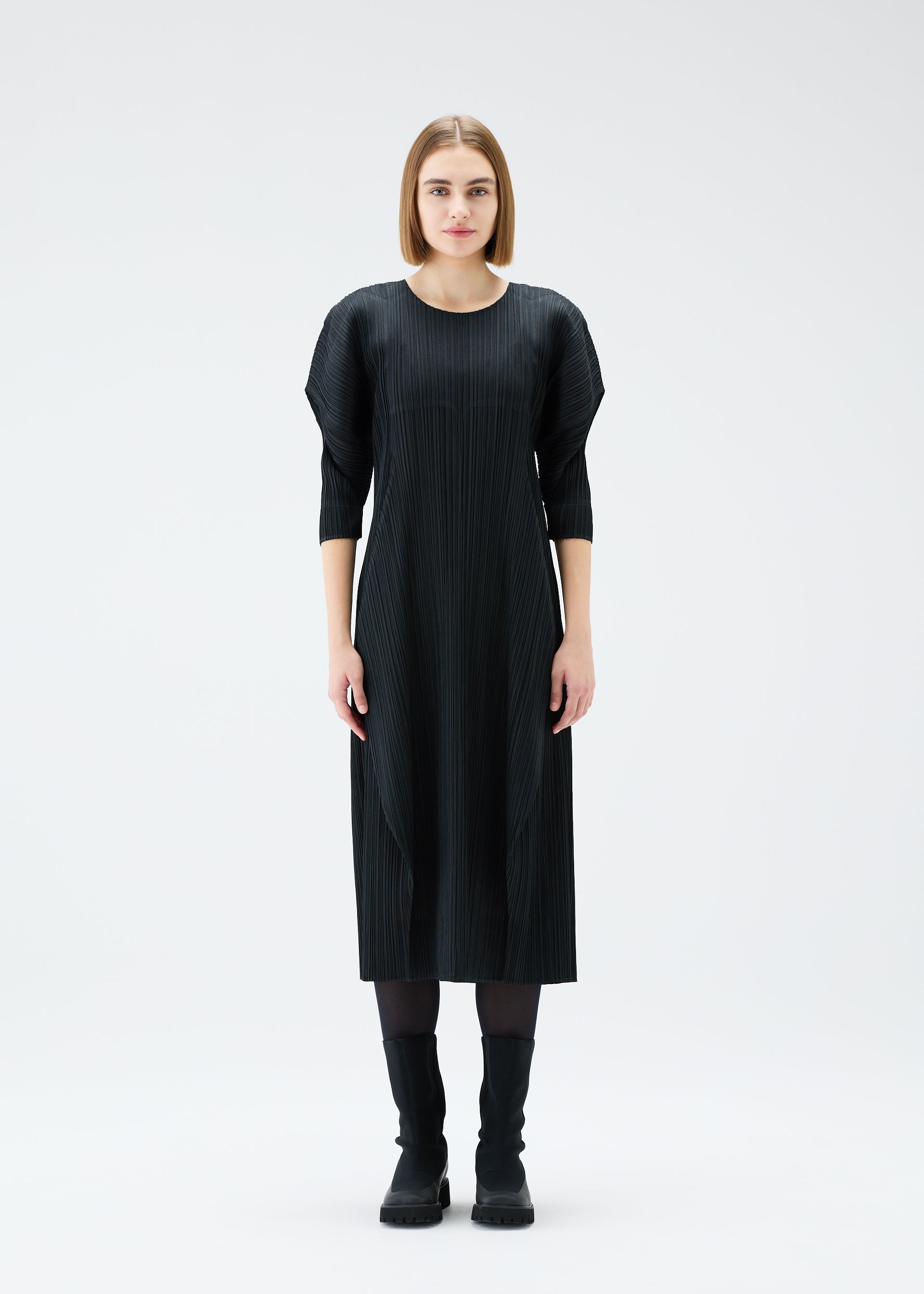 This round-neck, half-sleeve dress is characterized by its puffy, three-dimensional silhouette. It is shaped like a wine bottle when laid flat, and has an elegant form when worn.