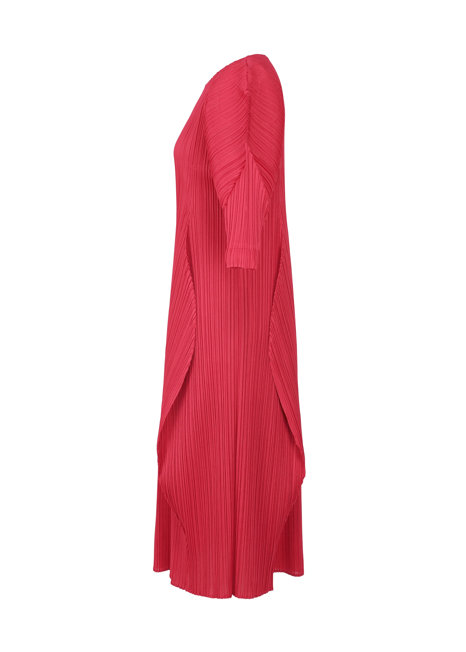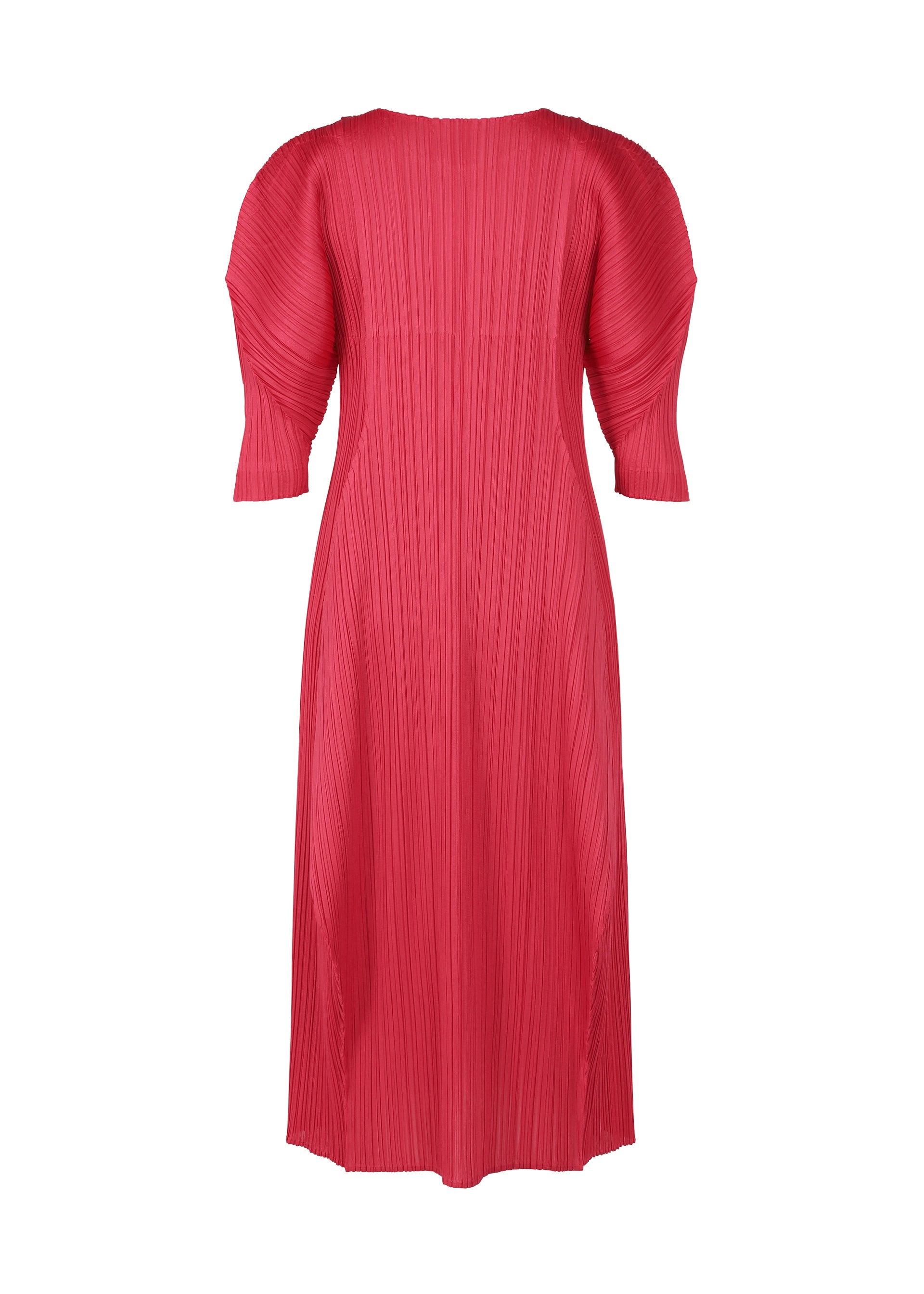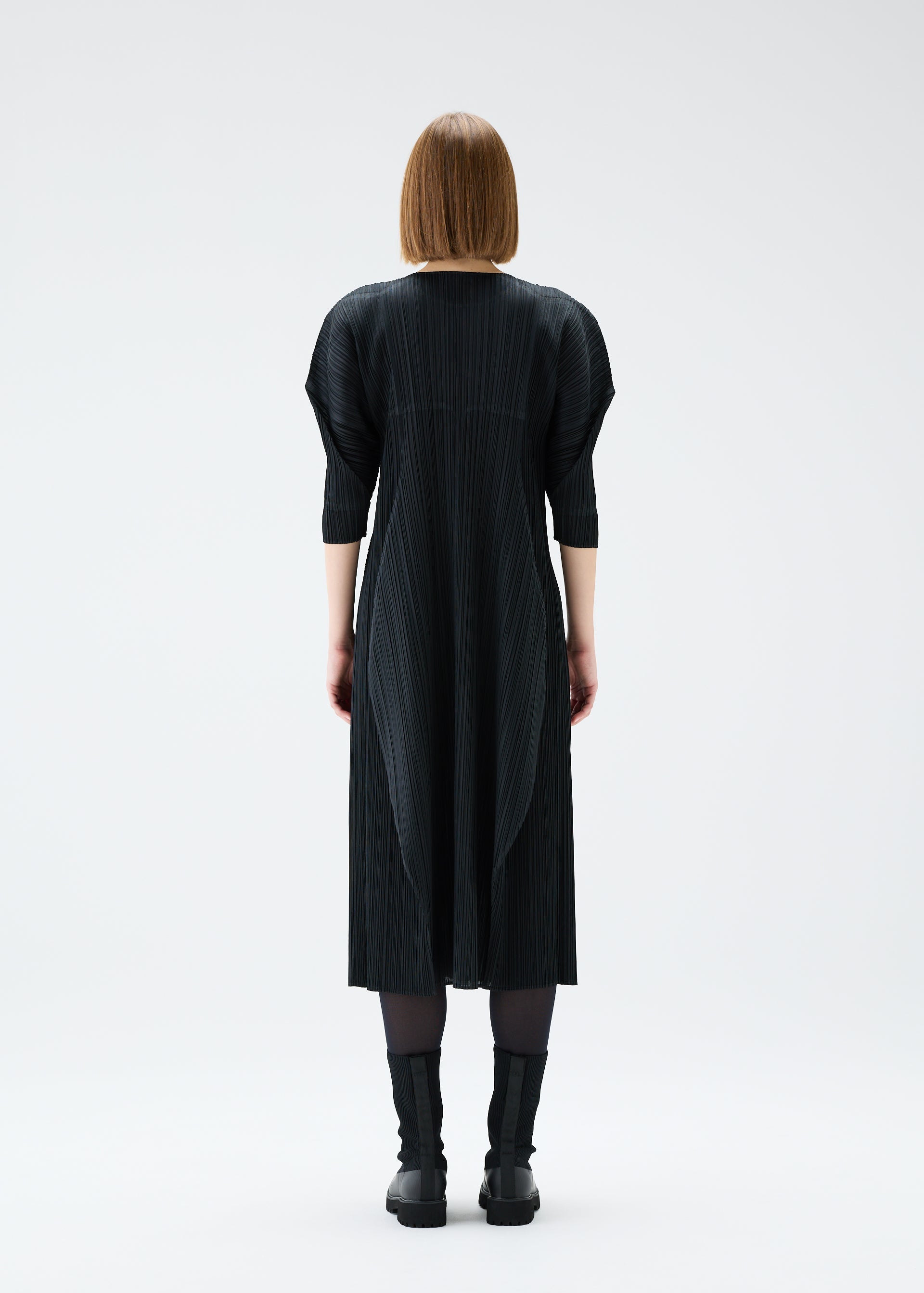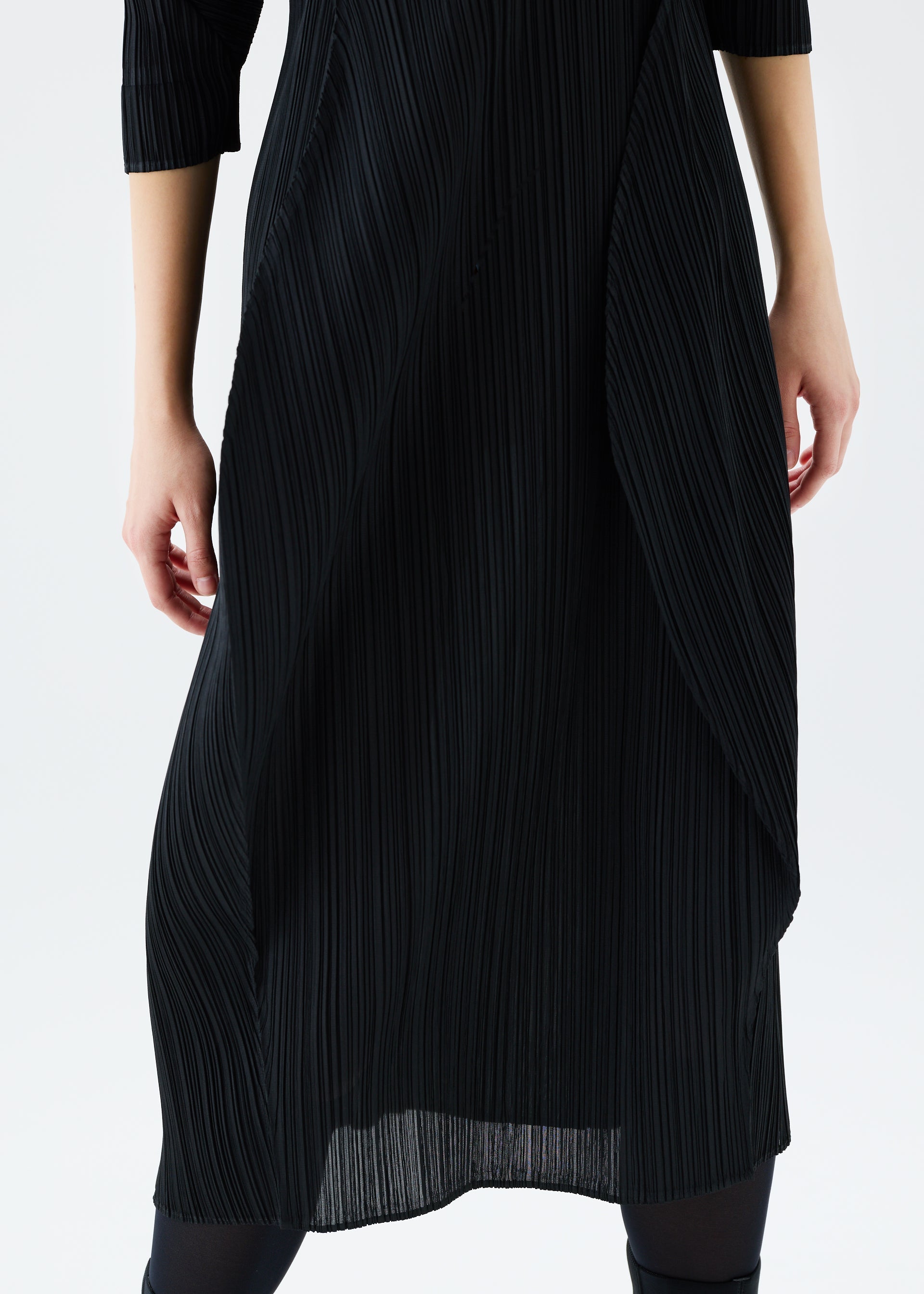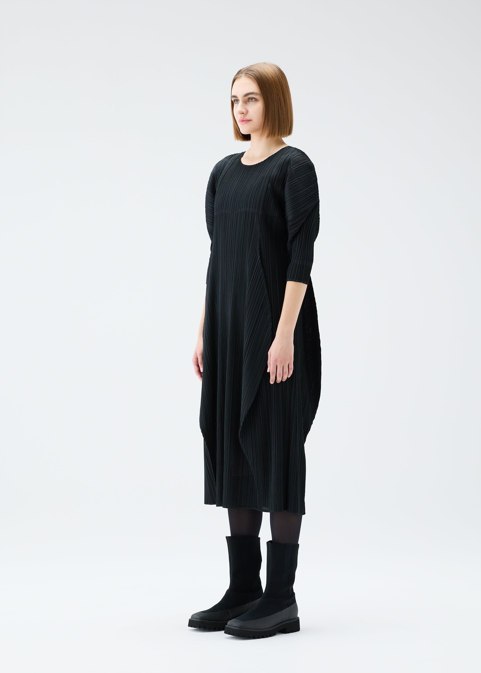 This round-neck, half-sleeve dress is characterized by its puffy, three-dimensional silhouette. It is shaped like a wine bottle when laid flat, and has an elegant form when worn.
