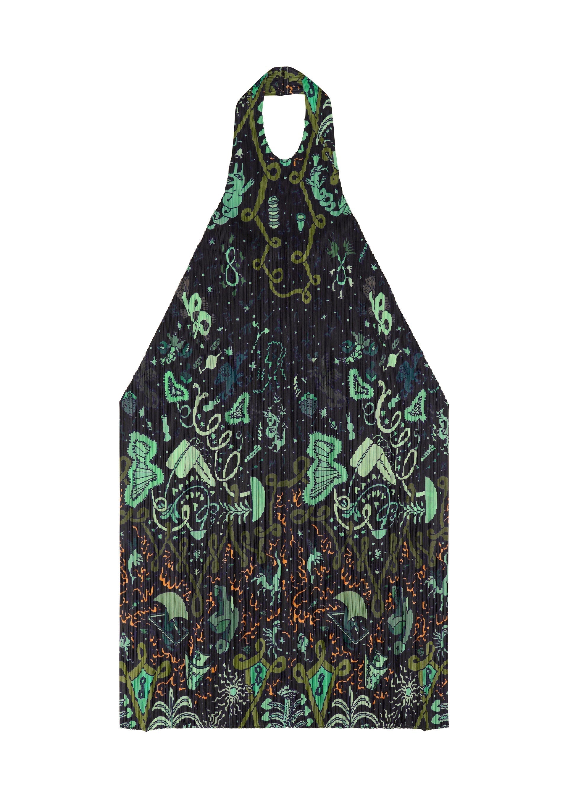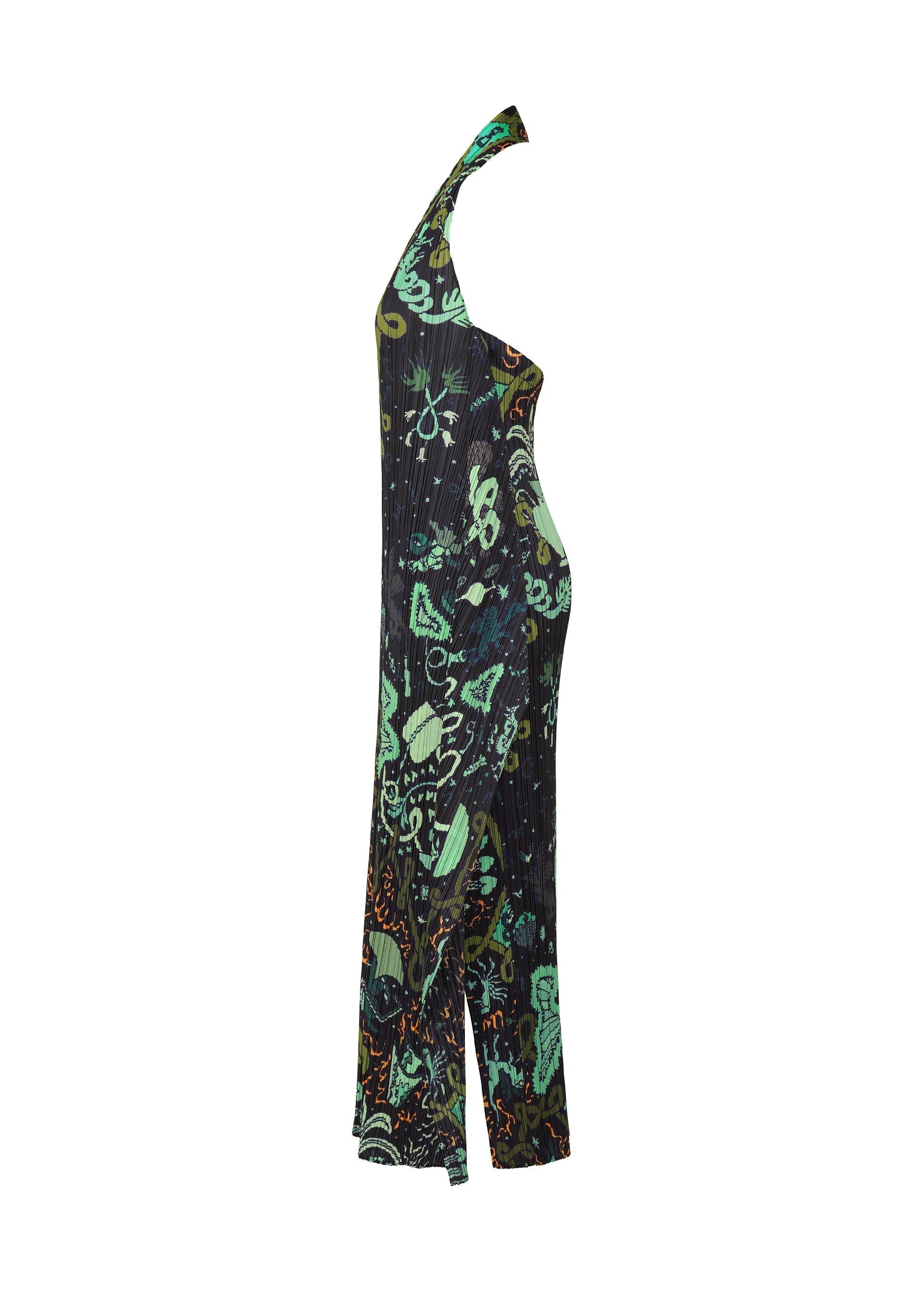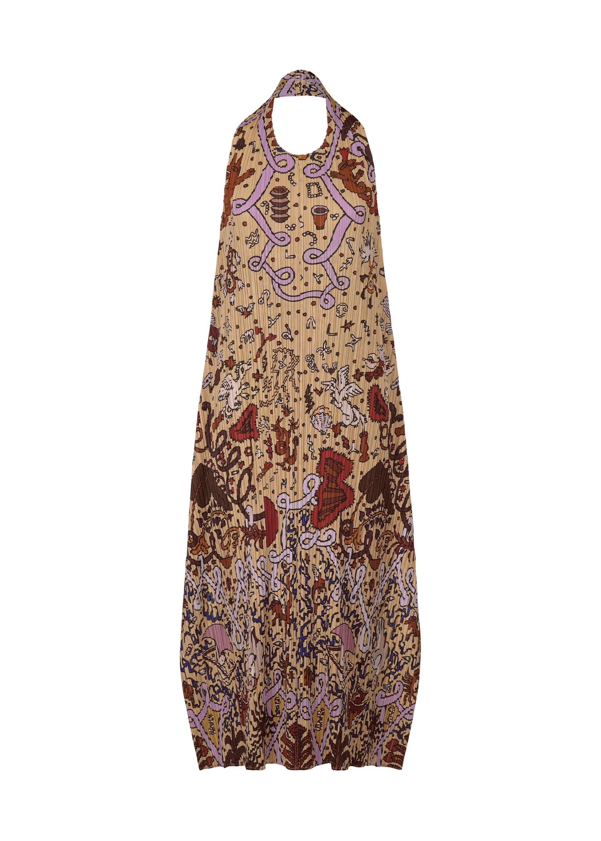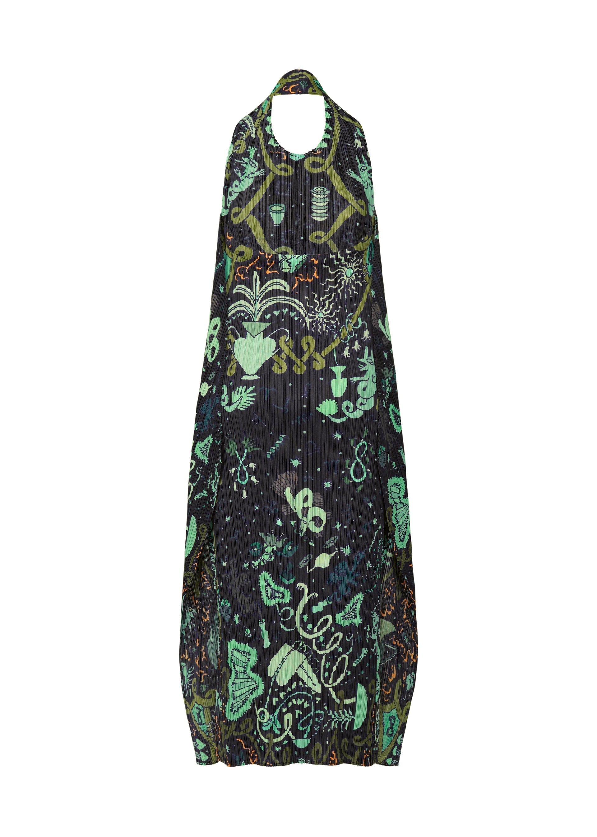 This halterneck dress has a print that depicts exciting imaginary scenery in outer space. It is characterized by its flared silhouette that uses ample fabric to showcase the pattern.