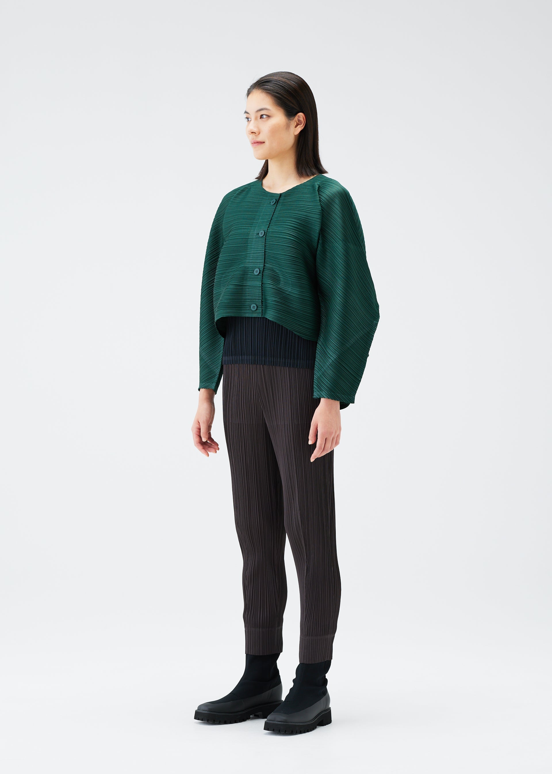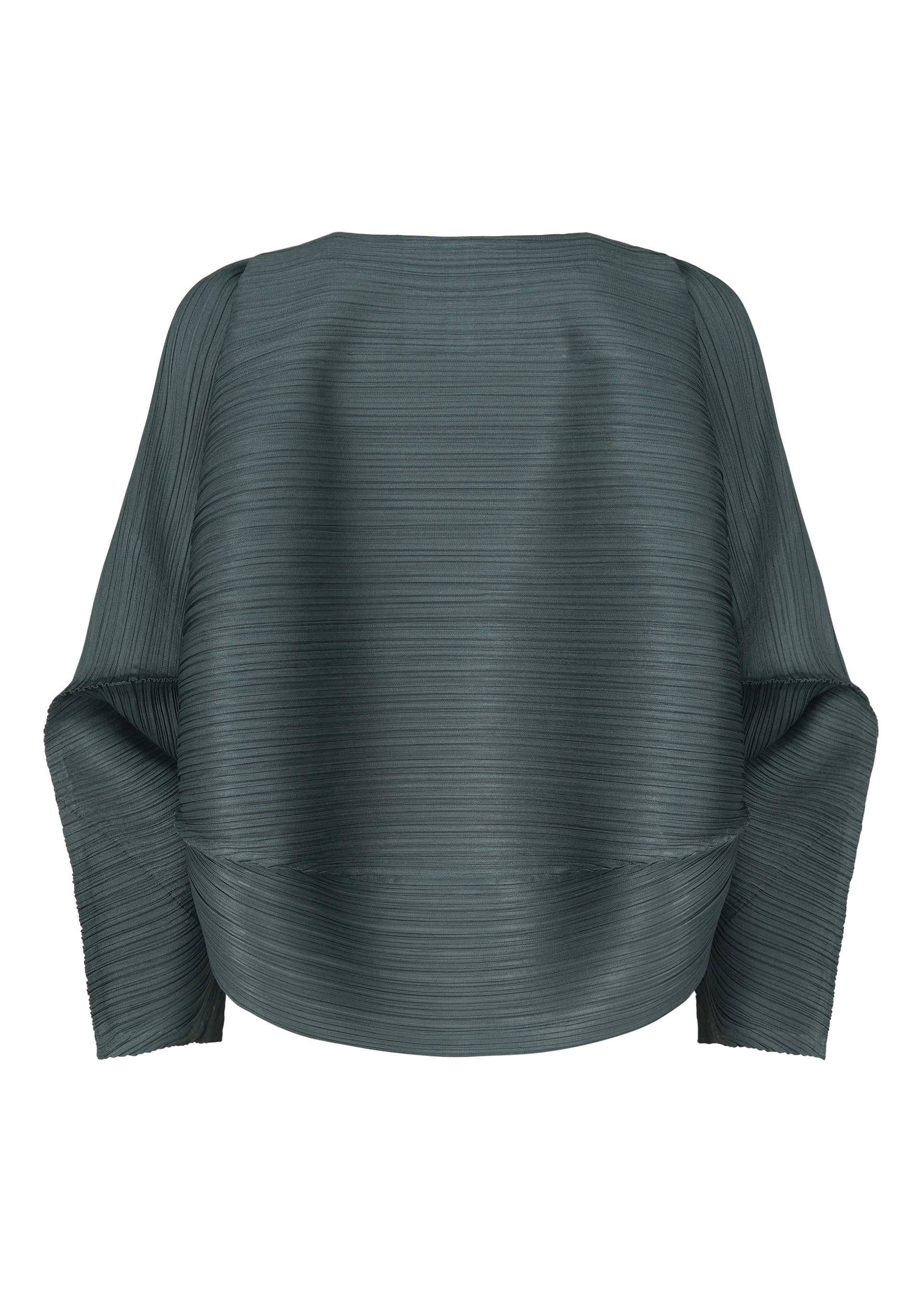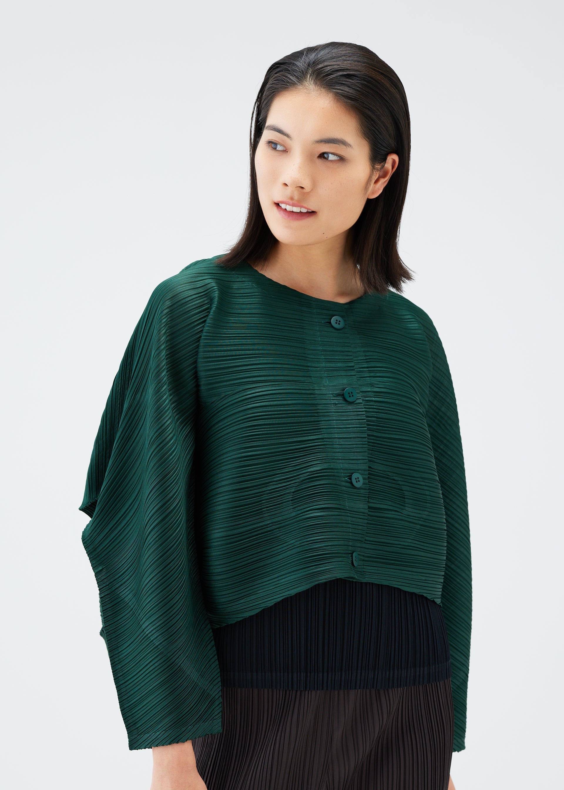 This buttoned round-neck cardigan has the shape of a UFO when laid flat. Its horizontal pleats create a rounded silhouette.