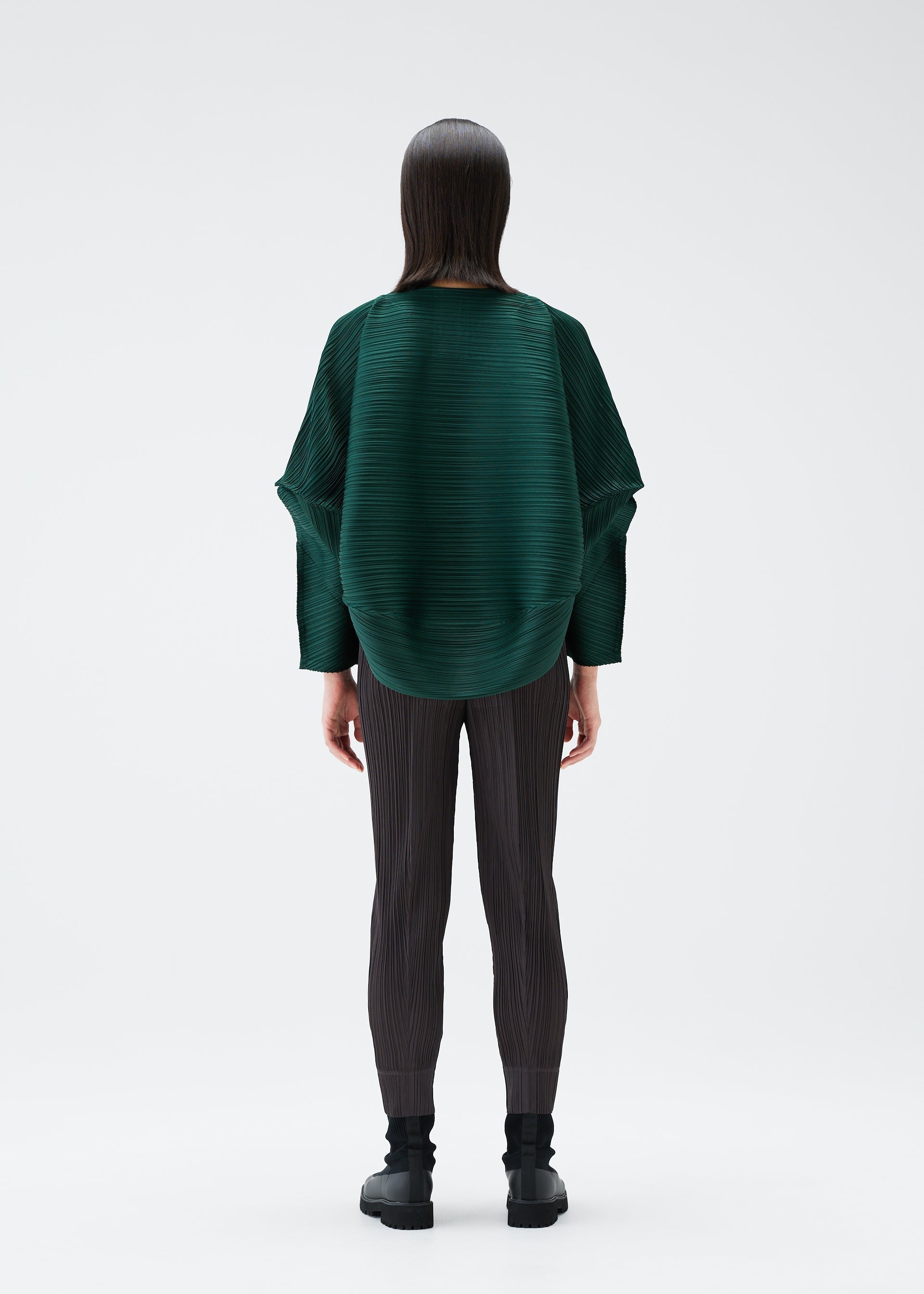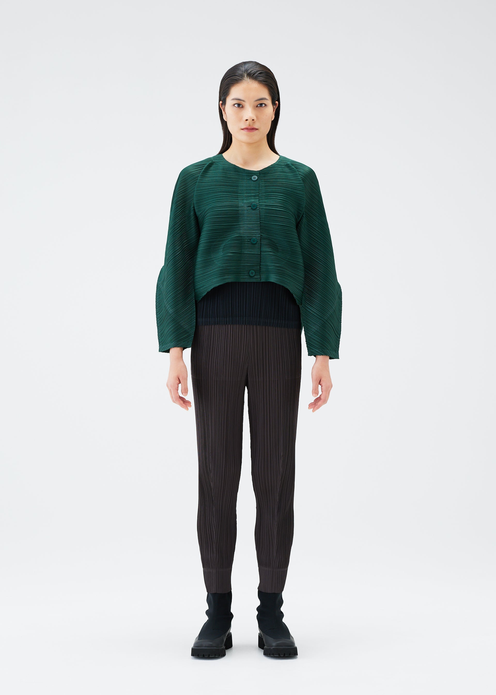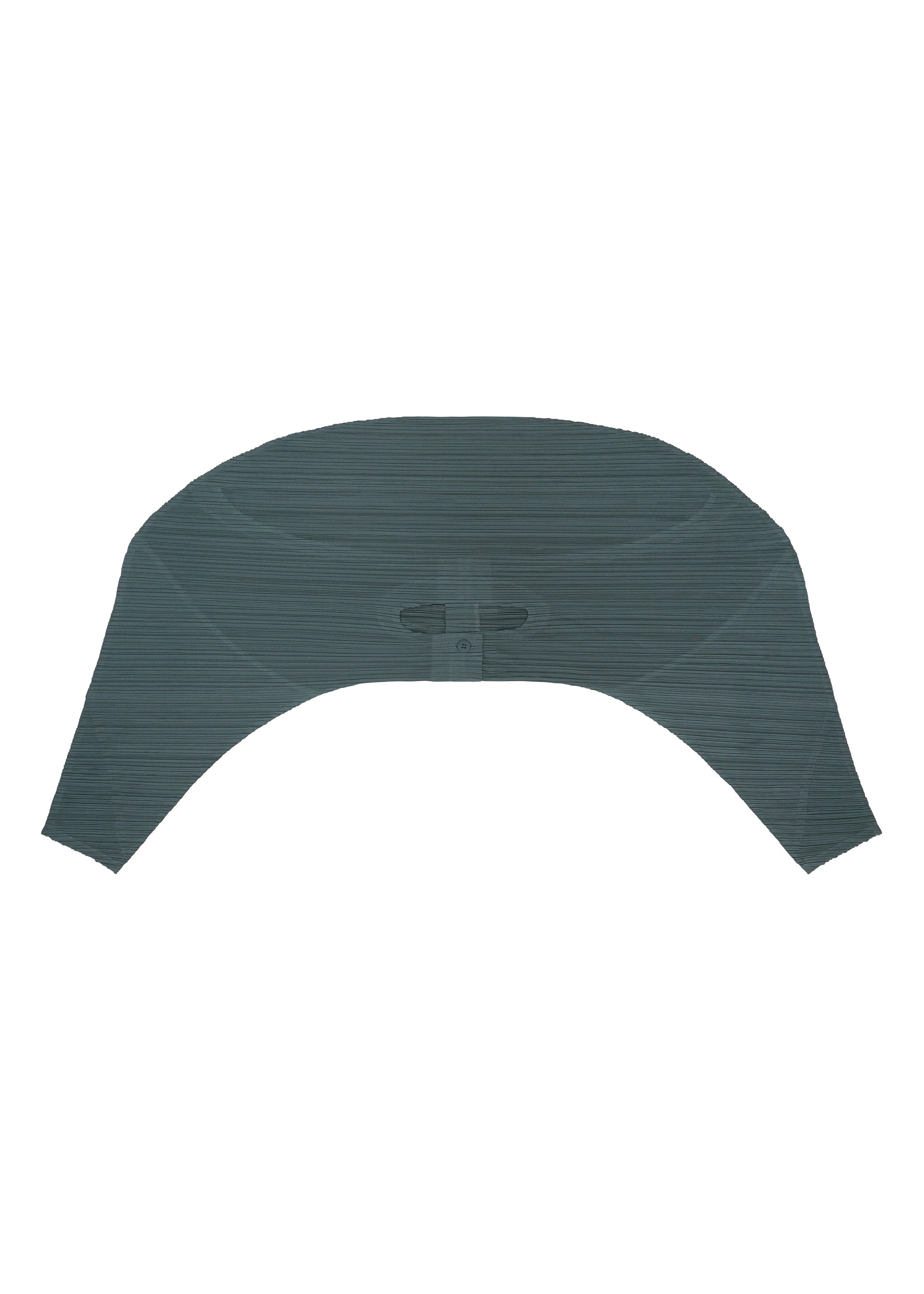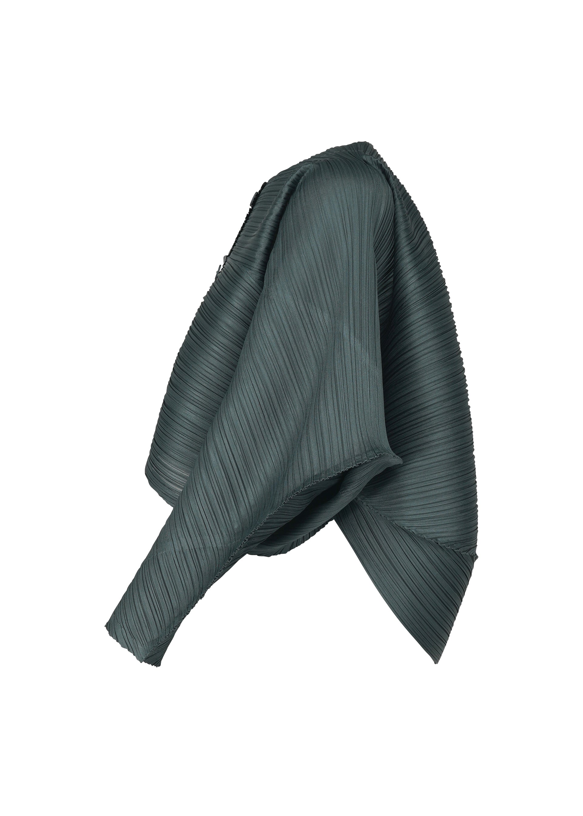 This buttoned round-neck cardigan has the shape of a UFO when laid flat. Its horizontal pleats create a rounded silhouette.