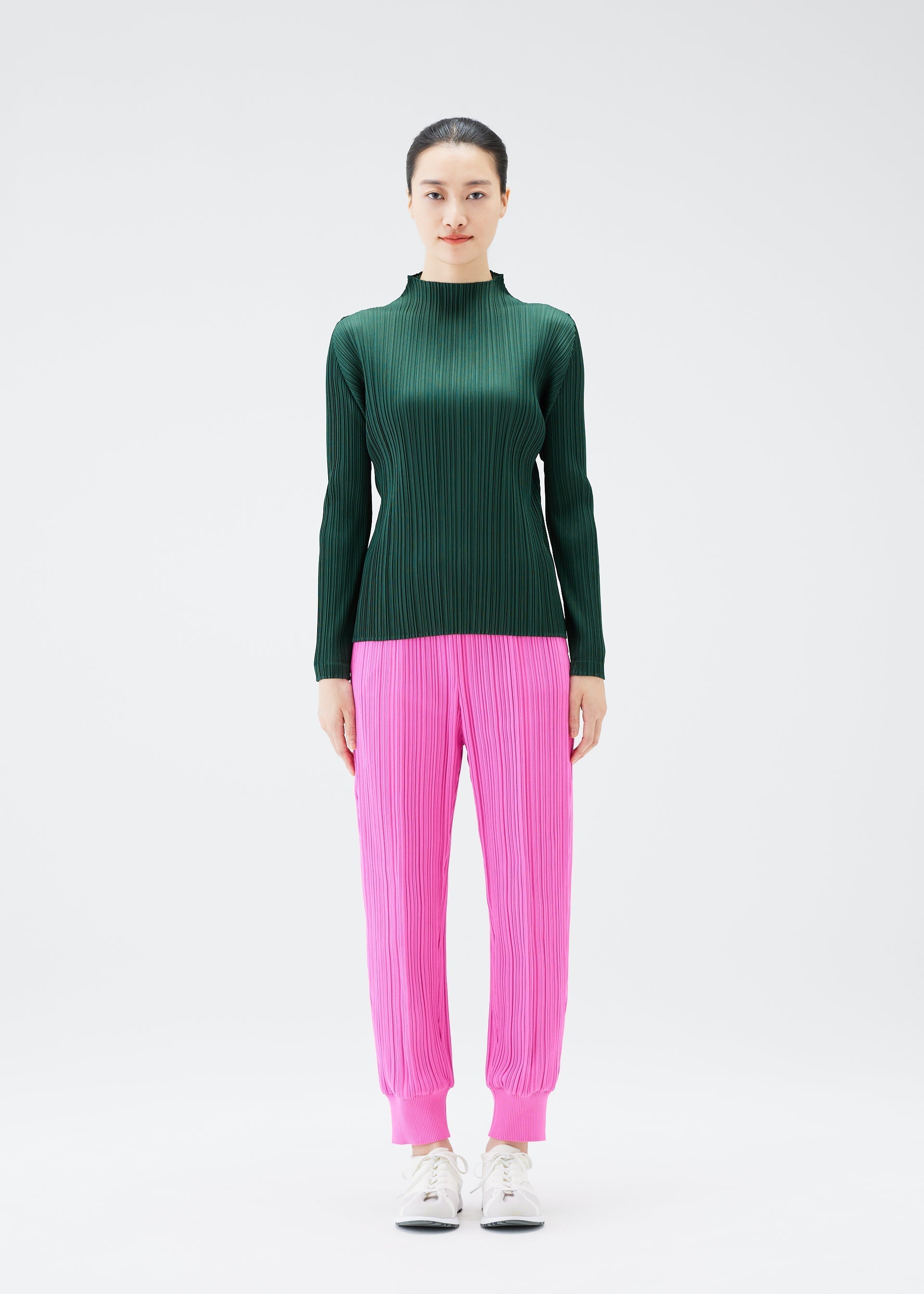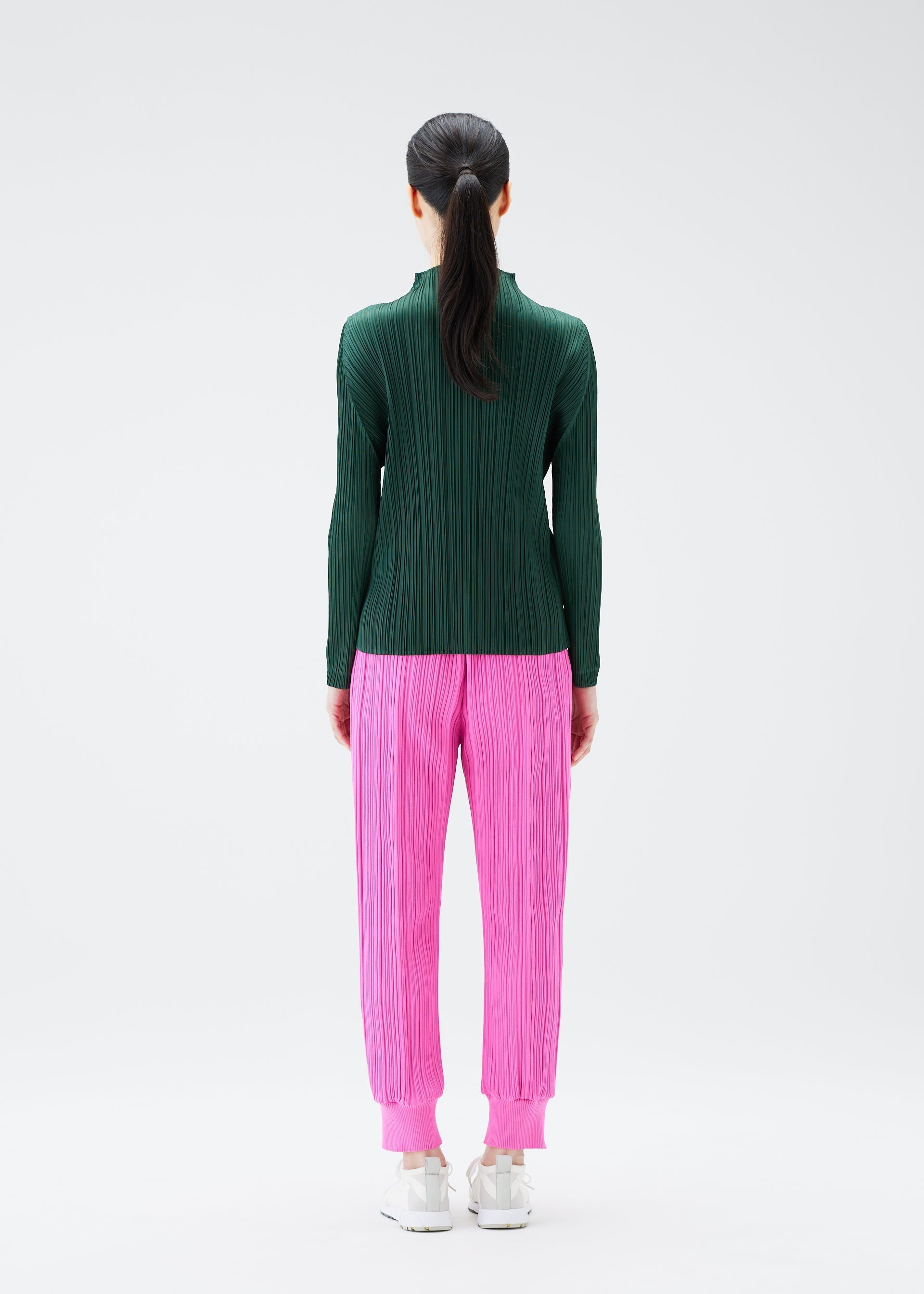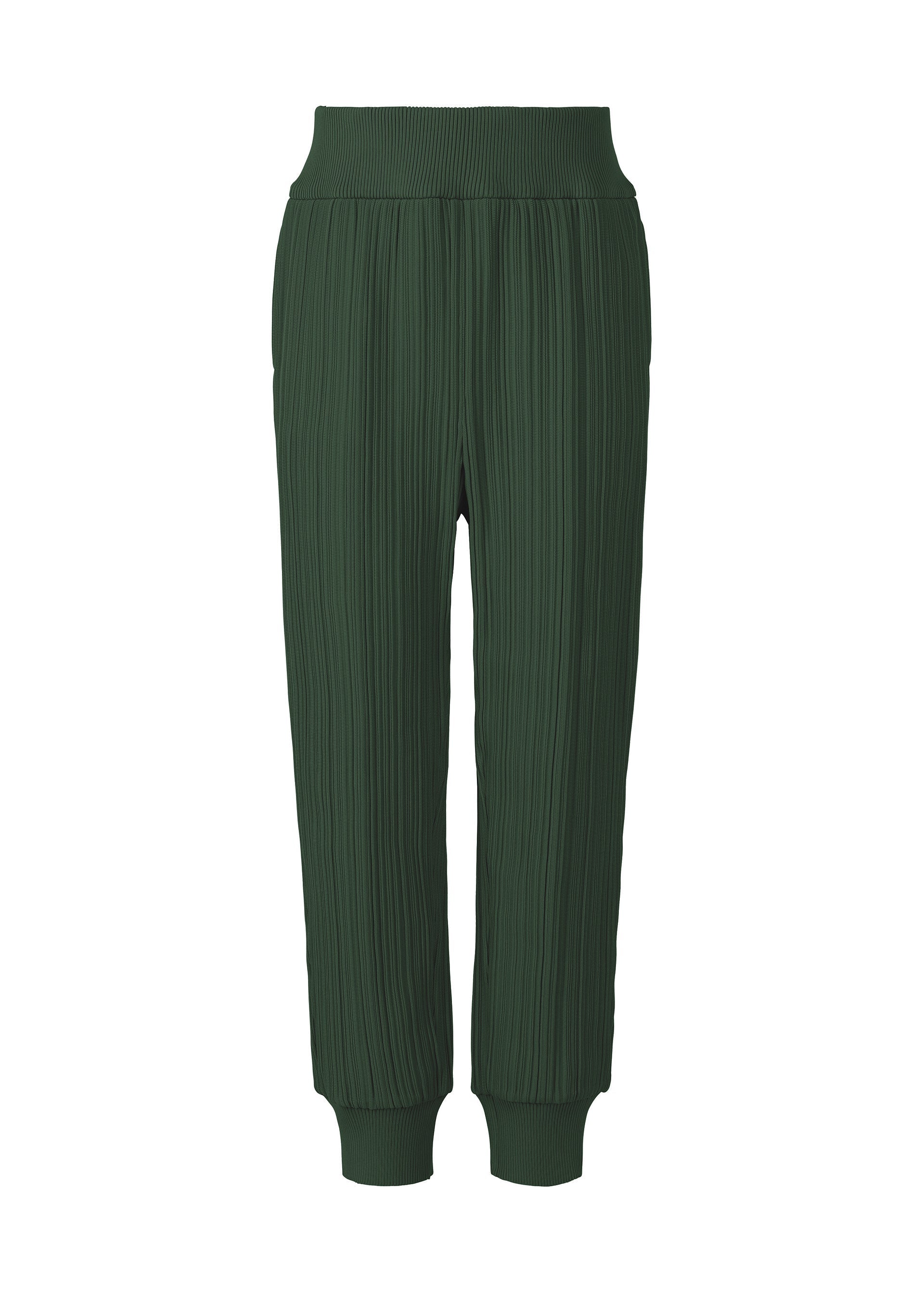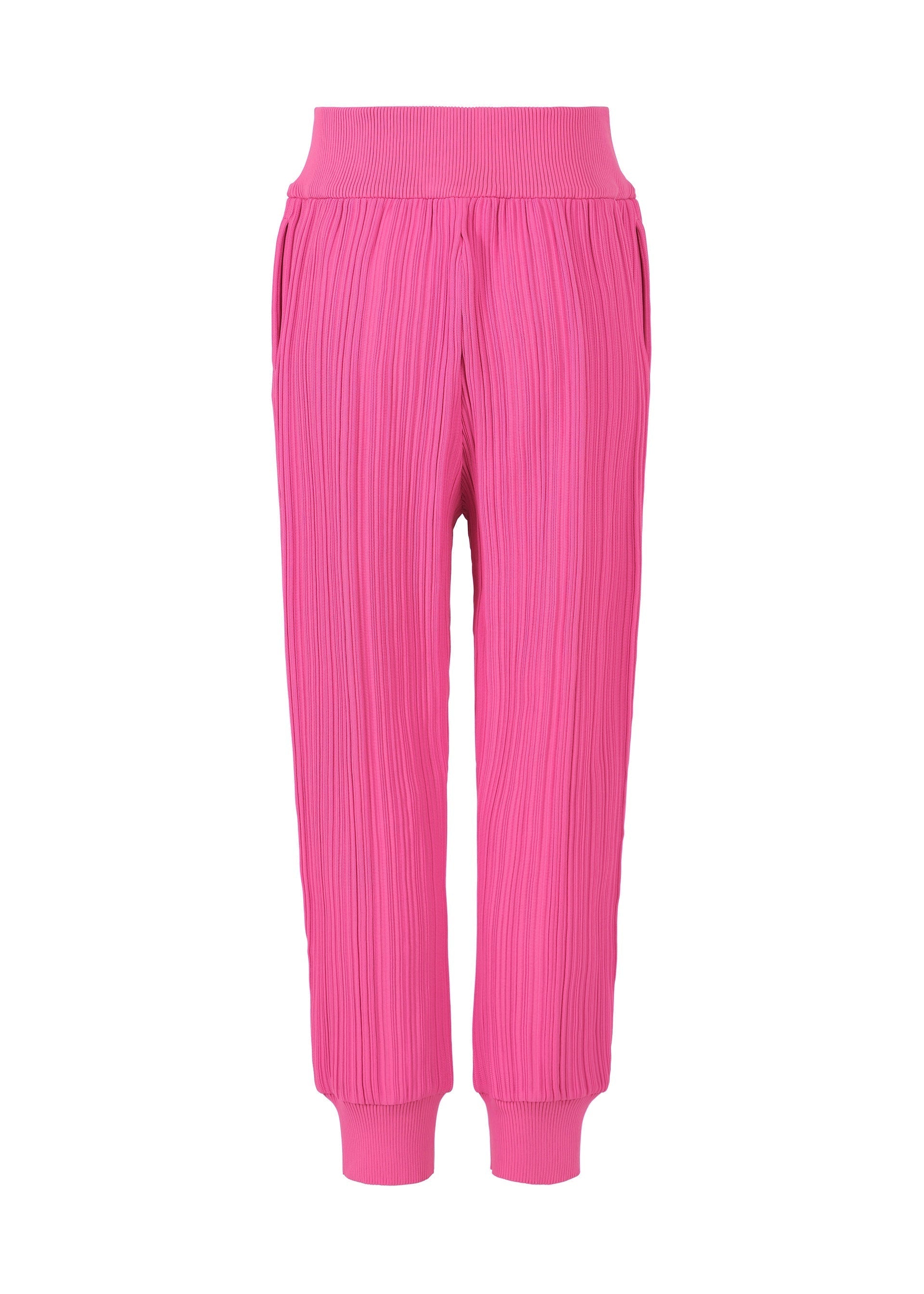 These knit pants feature pleats in a horizontal knitting structure. They are characterized by being easy to care for as they are lightweight and machine-washable due to being made from 100% recycled polyester. There are pockets on both sides.