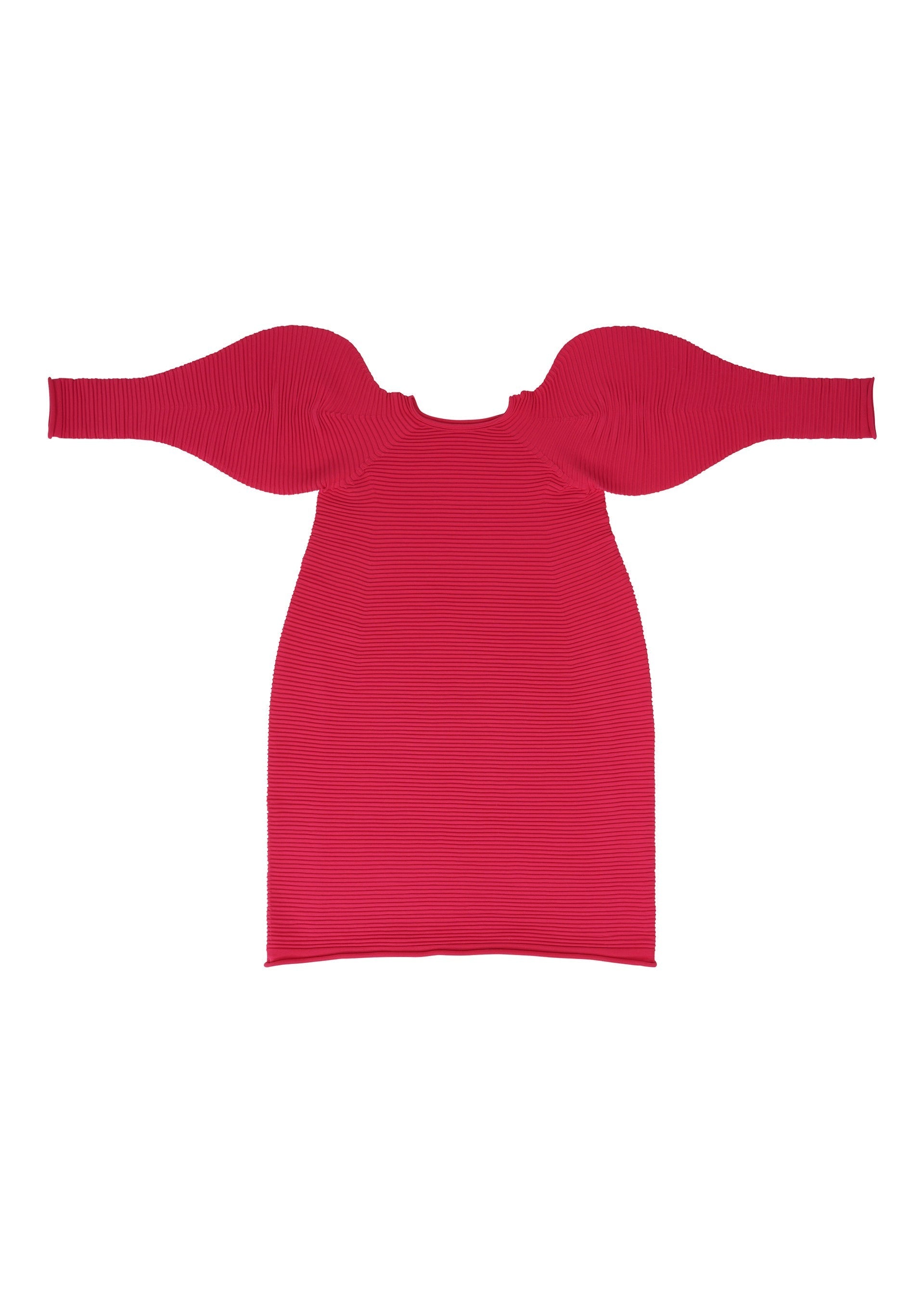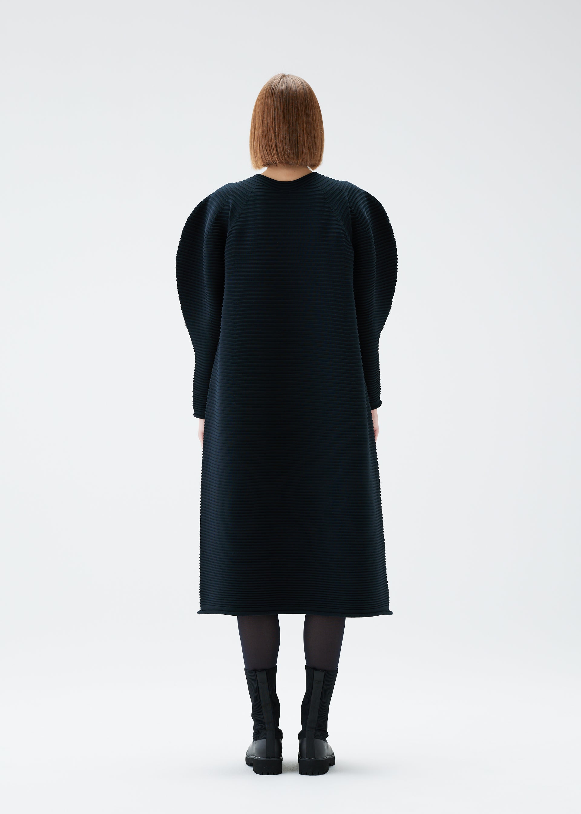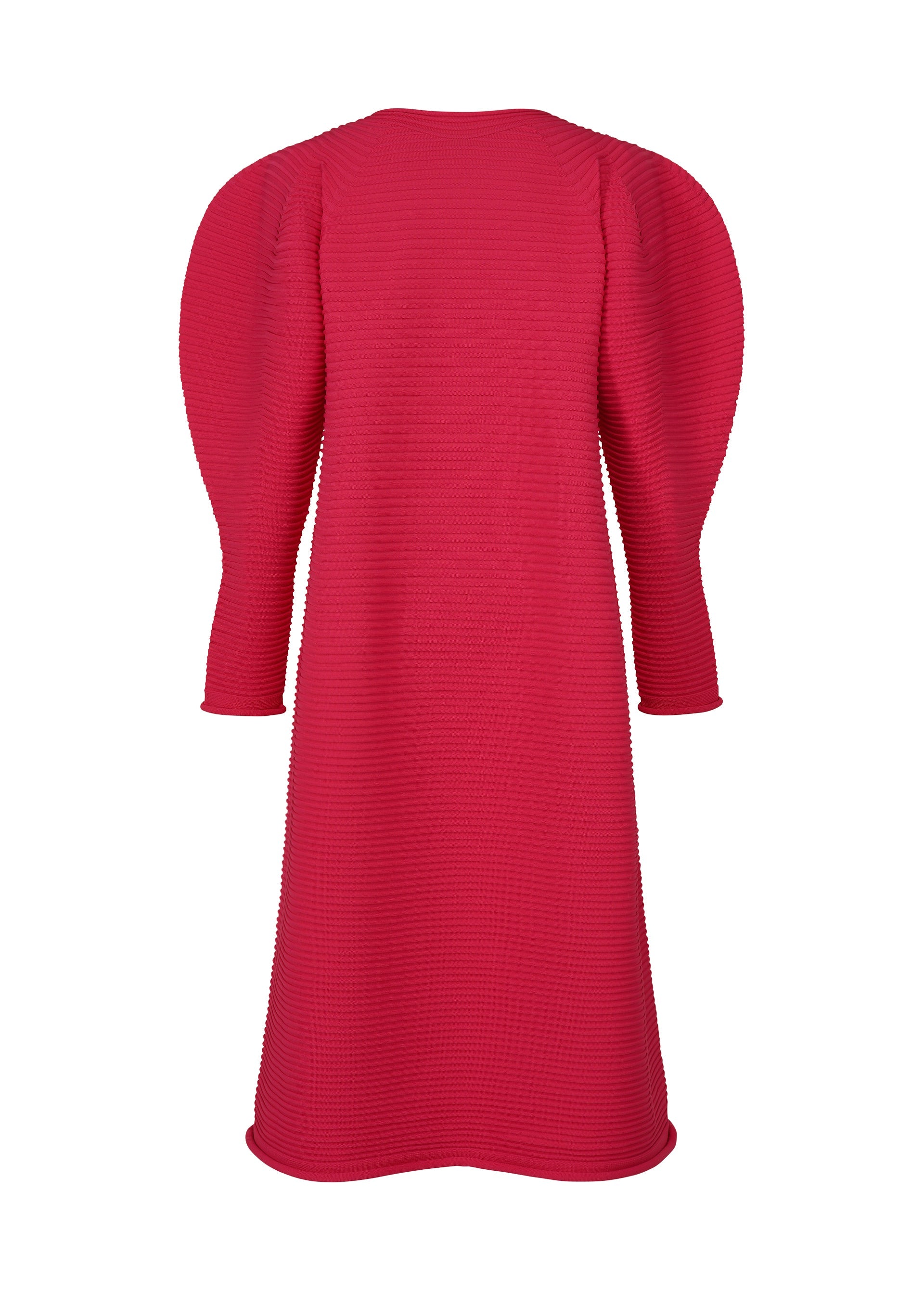 This round-neck, long-sleeved dress is characterized by its puffy, three-dimensional silhouette. It is made using a light material and is machine-washable.