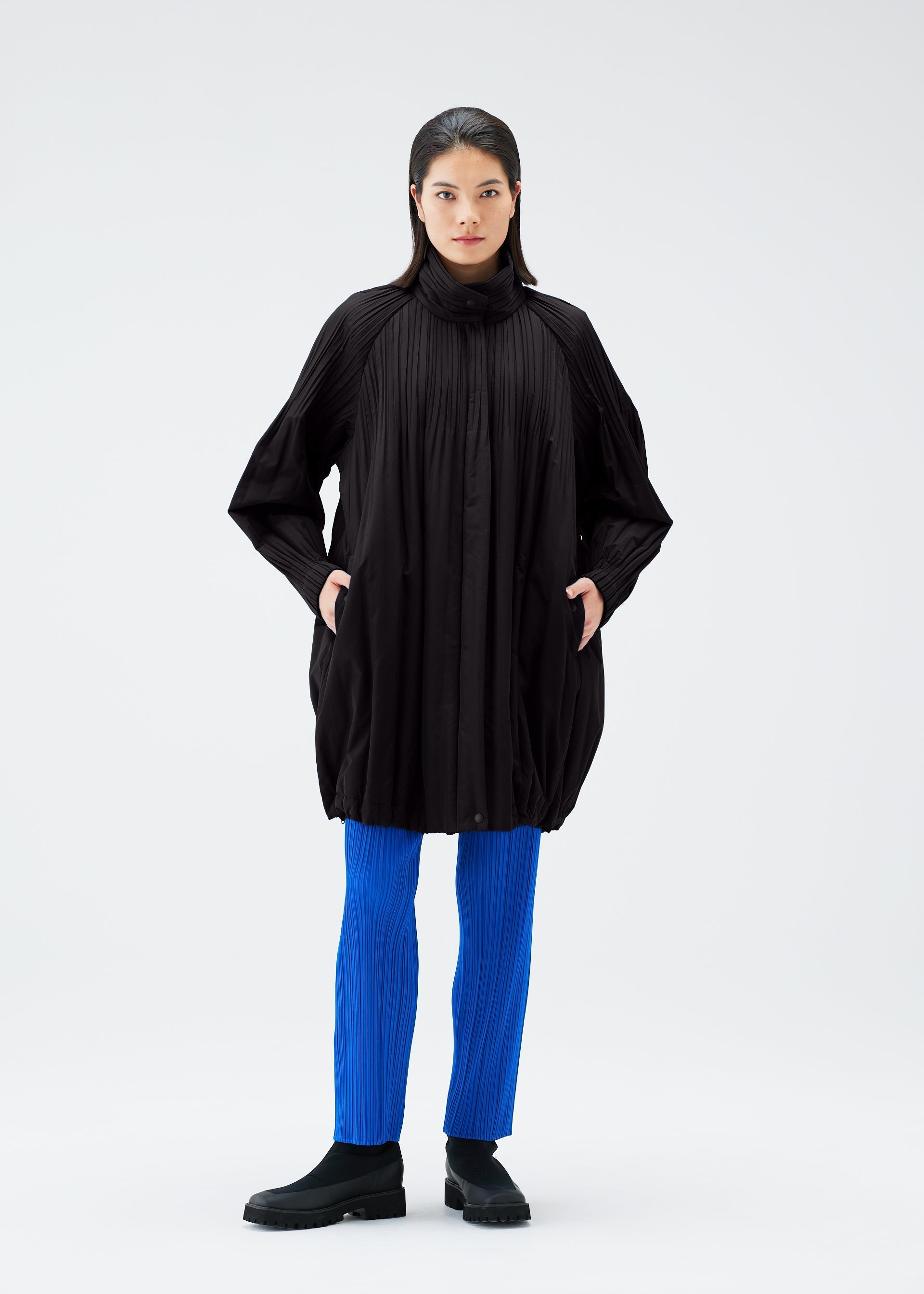 This long coat is made from quilted fabric with cotton padding and has a zipper design with Keshi pleats. It has pockets on both sides.