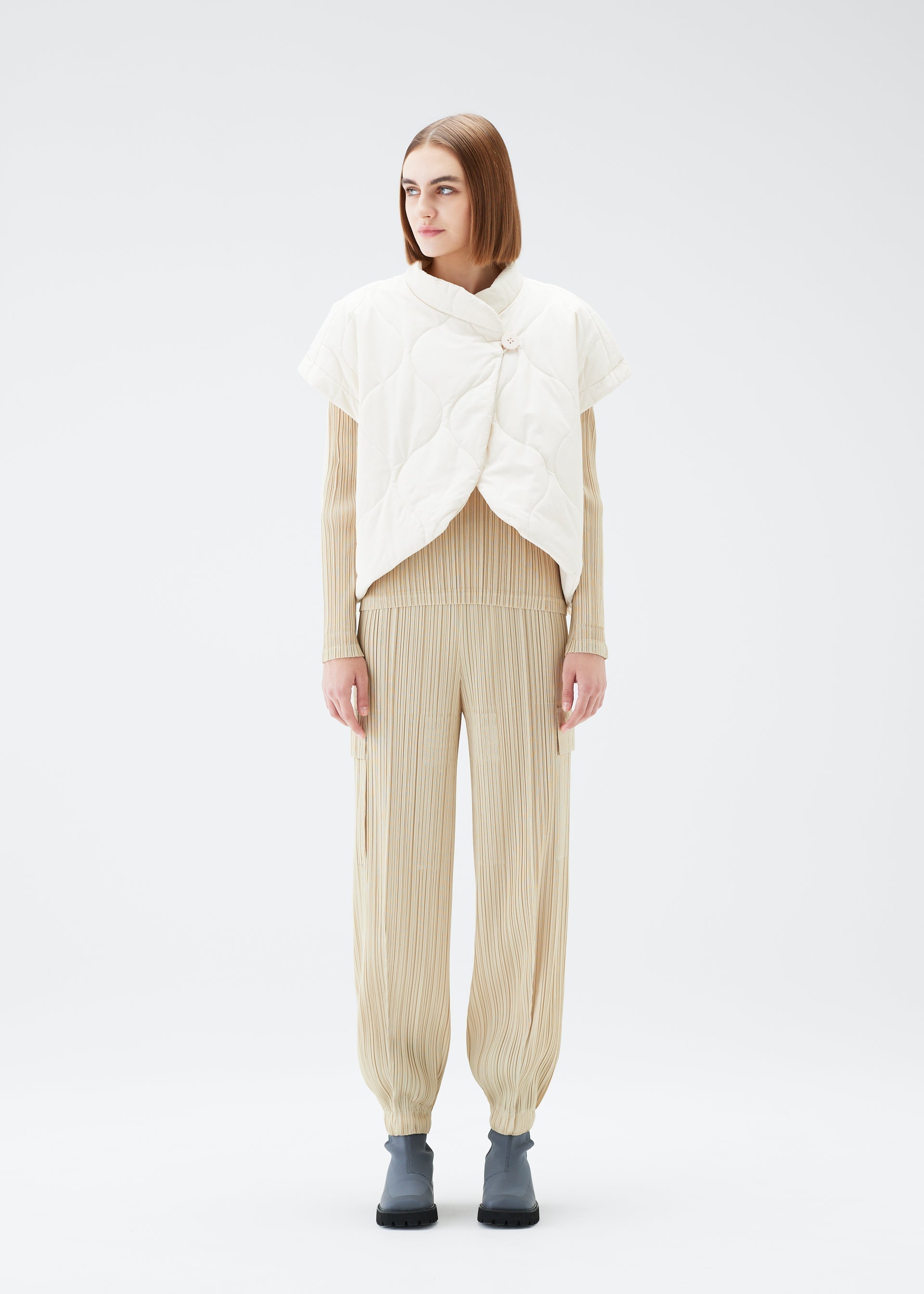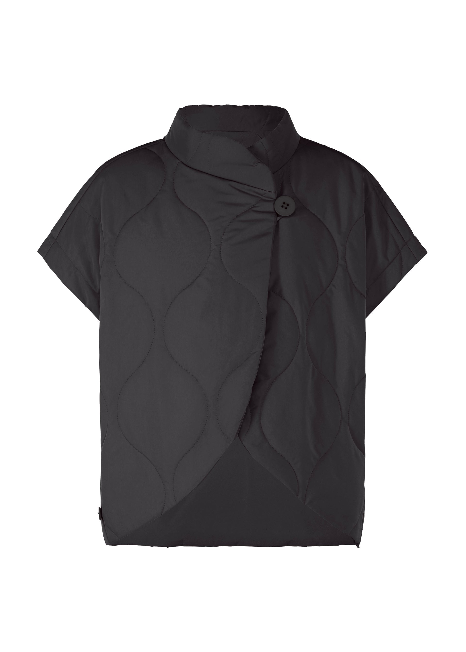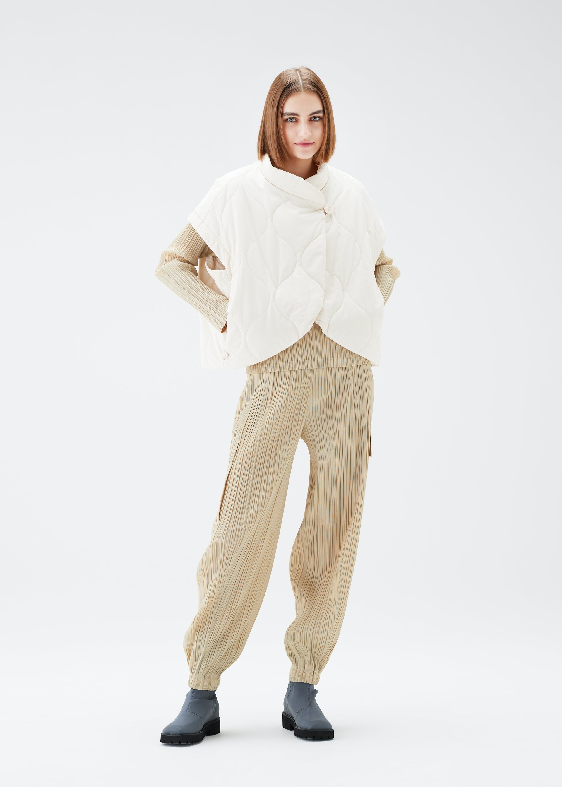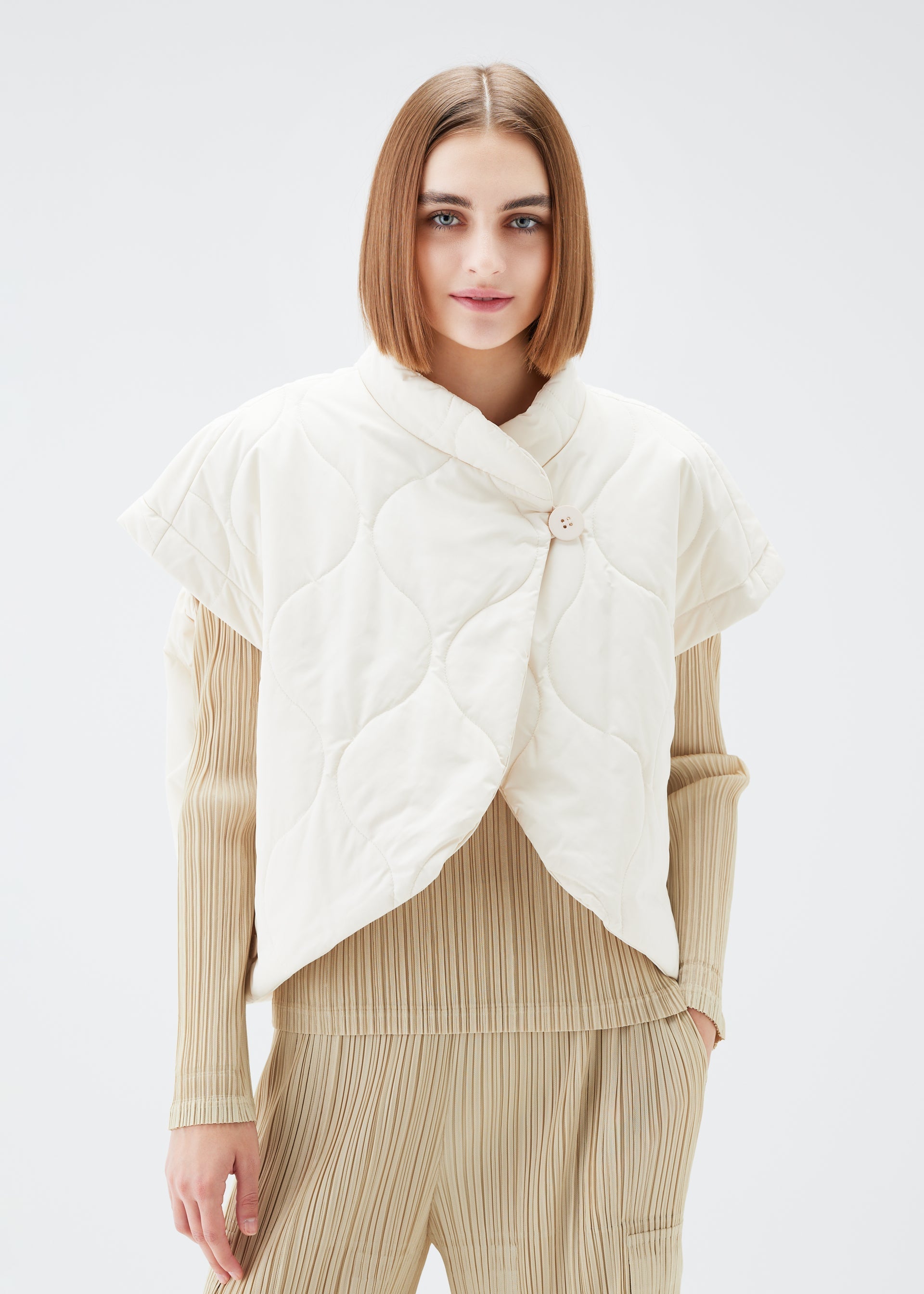 This padded quilted vest can be styled in outfits with pleated items. It can also be worn upside down.