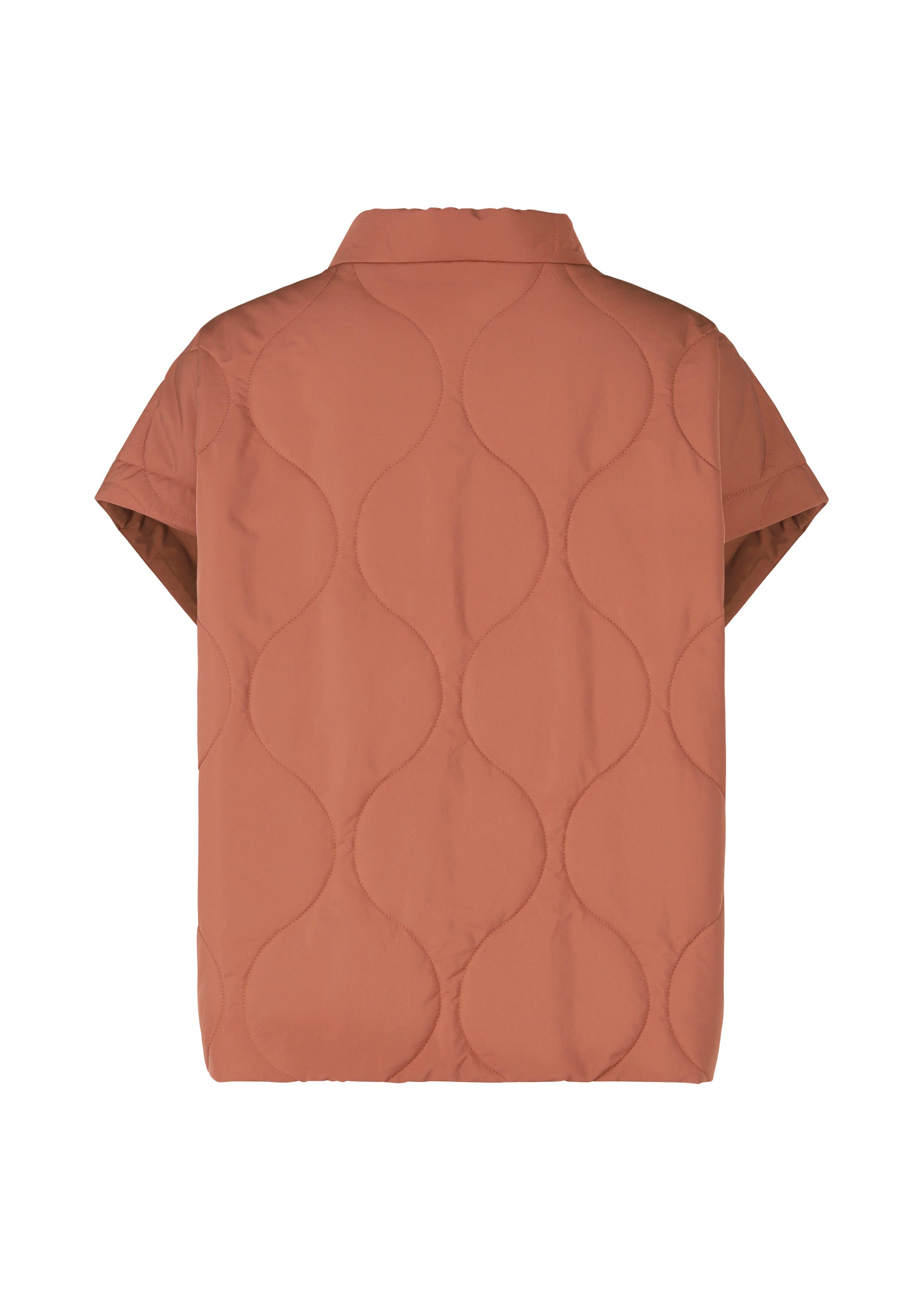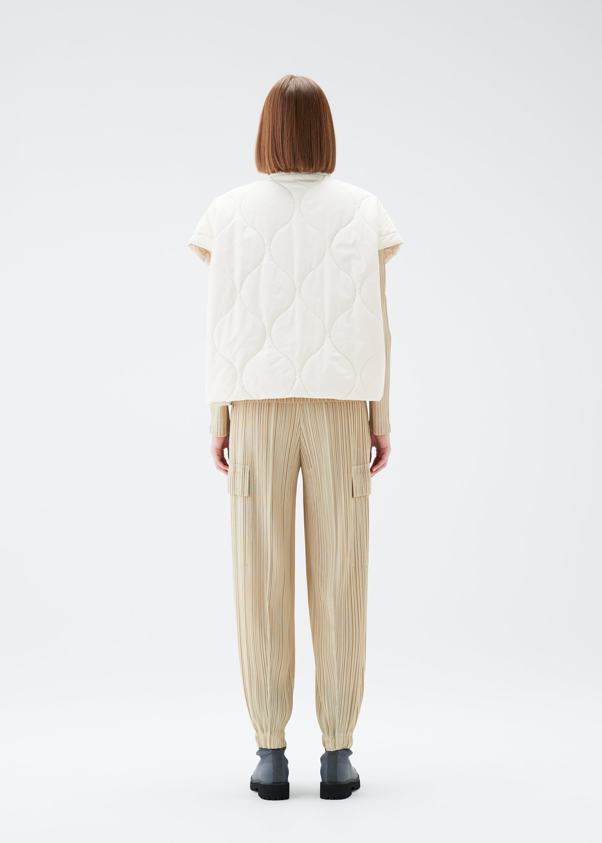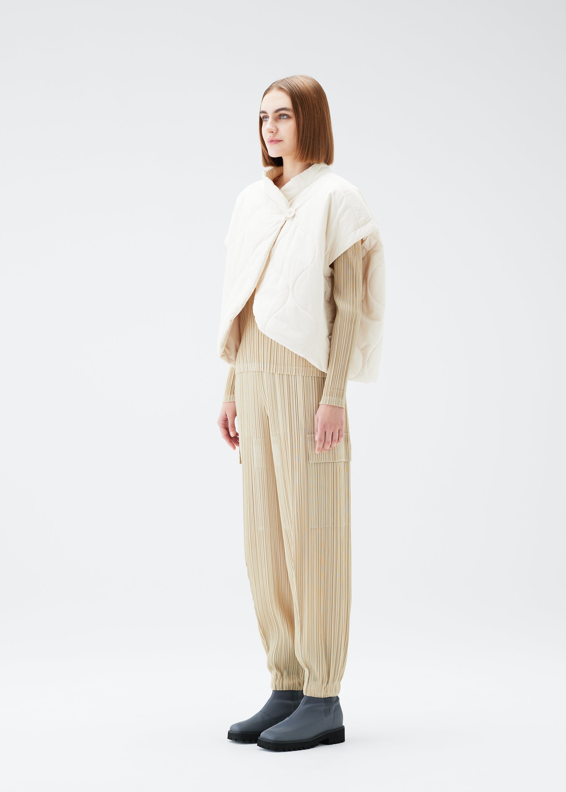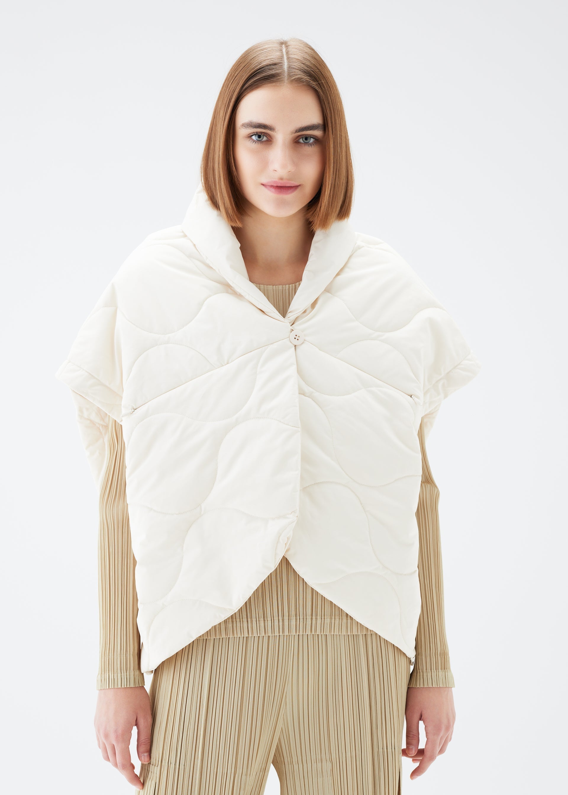 This padded quilted vest can be styled in outfits with pleated items. It can also be worn upside down.