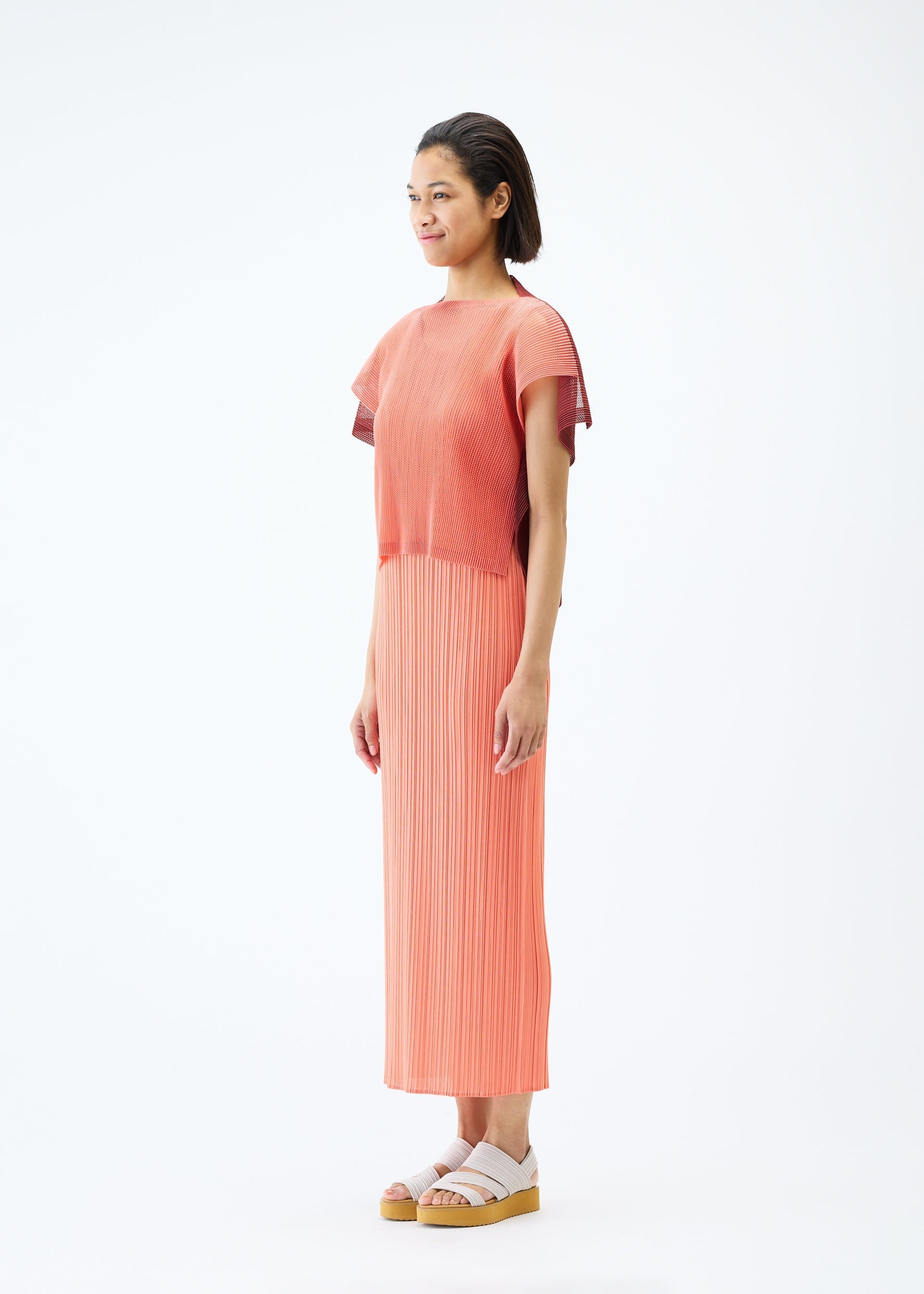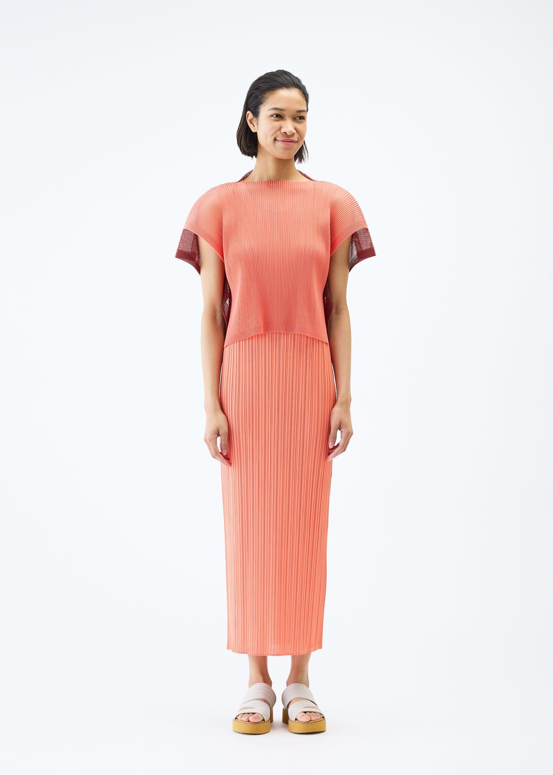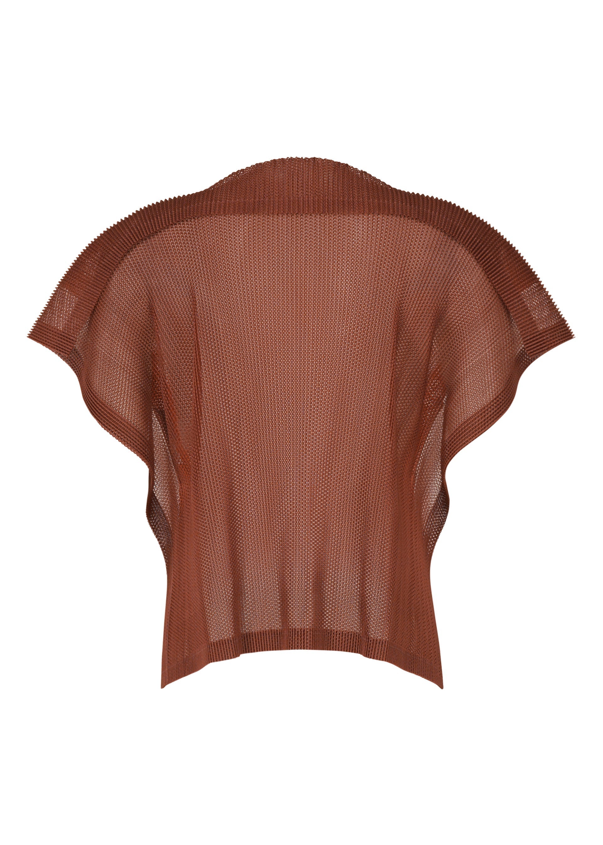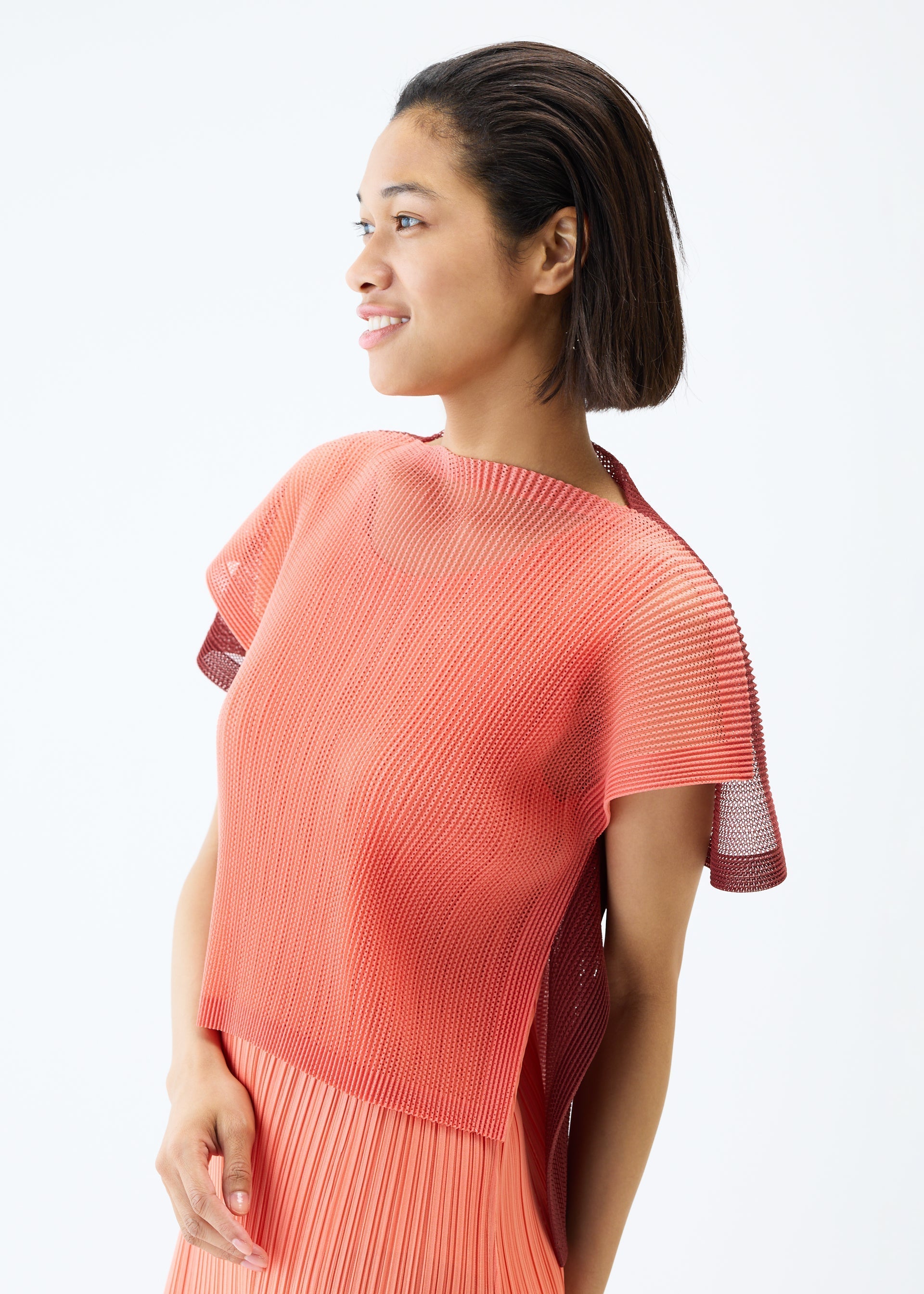 This boat-neck, short-sleeved top utilizes the layering of mesh fabric to express the way X-rays pass through items. The creative use of different fabric colors and sizes adds variation to the simple quadrilateral design. There are slits on both sides.