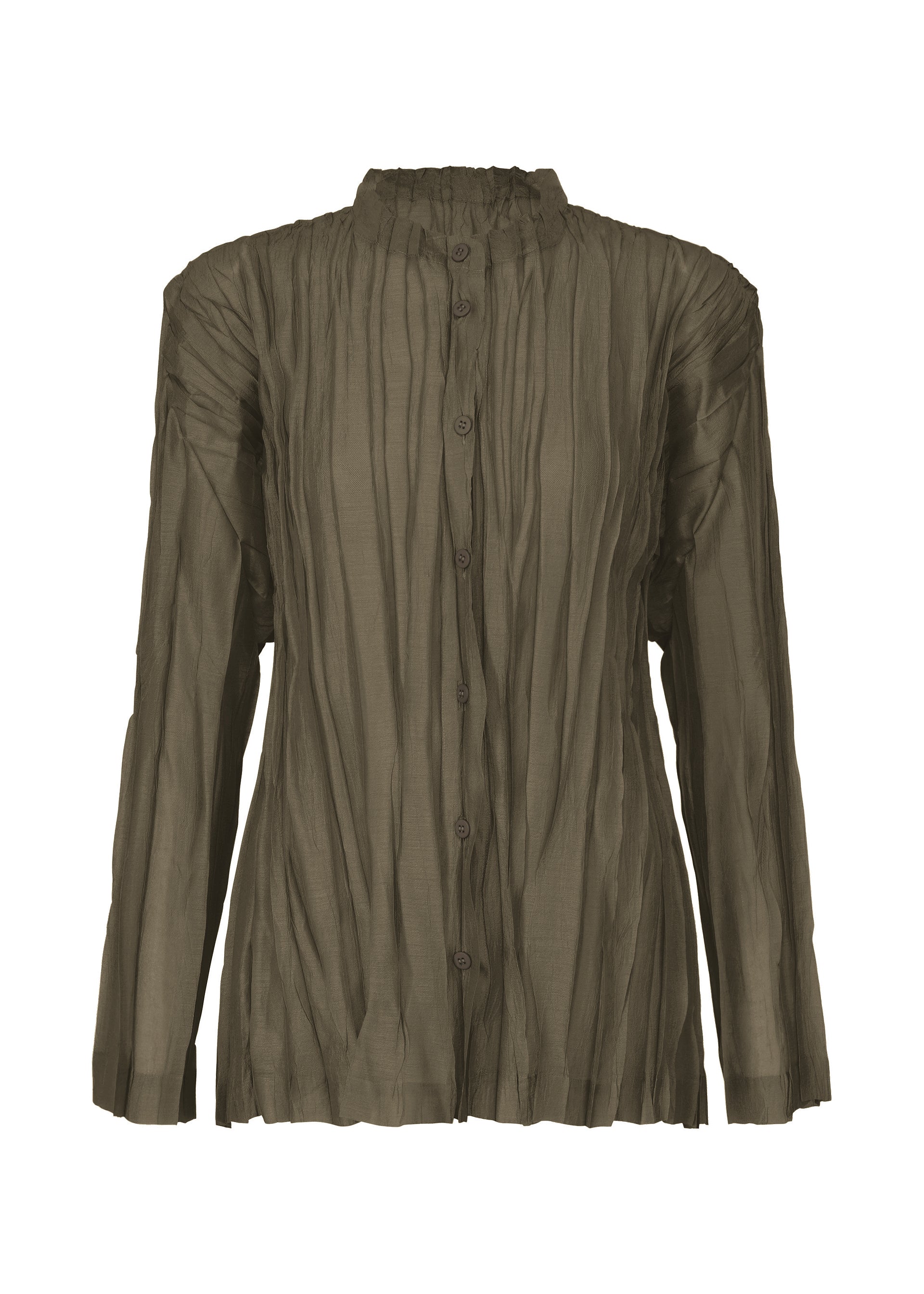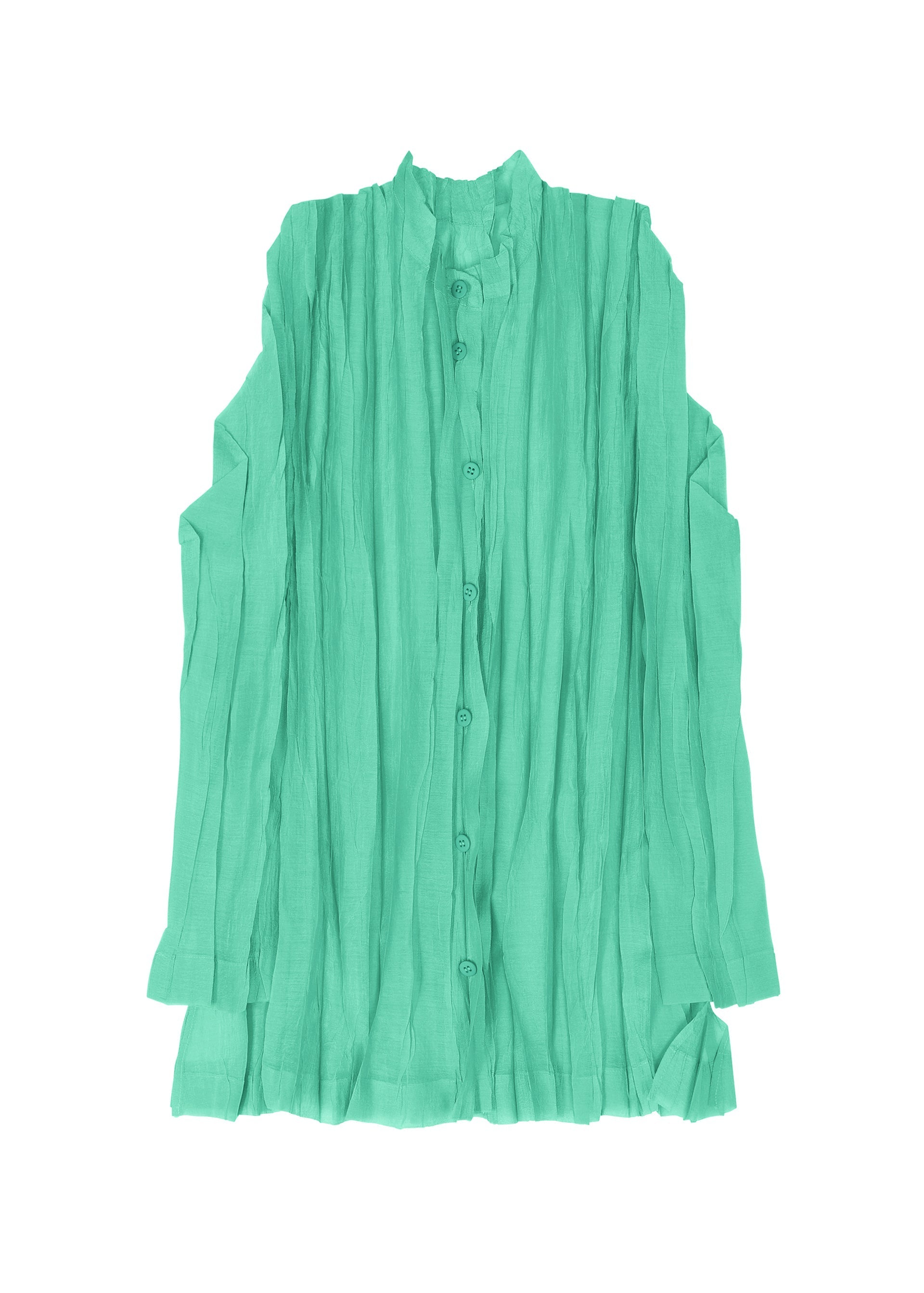 This cardigan is made from light fabric that is twisted and pressed. It is characterized by its summery sheer look. It has a buttoned style with slits on both sides.