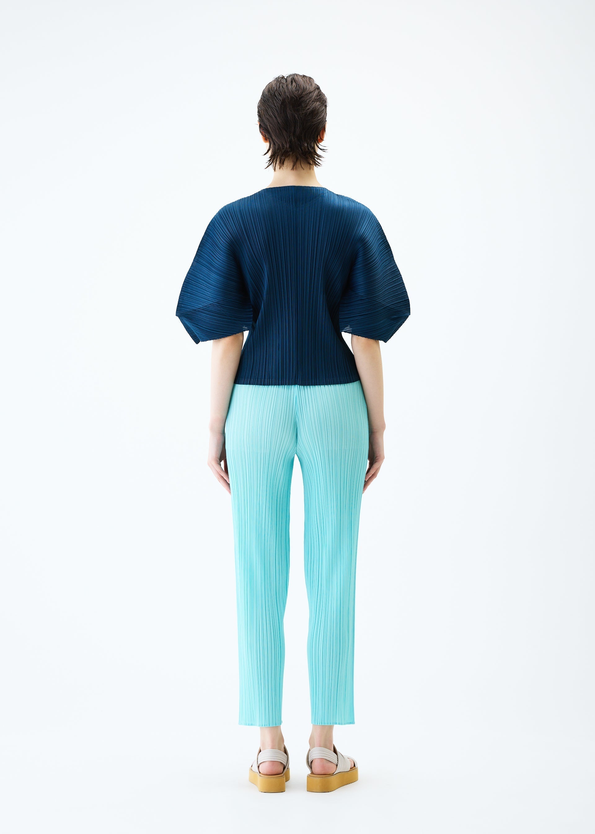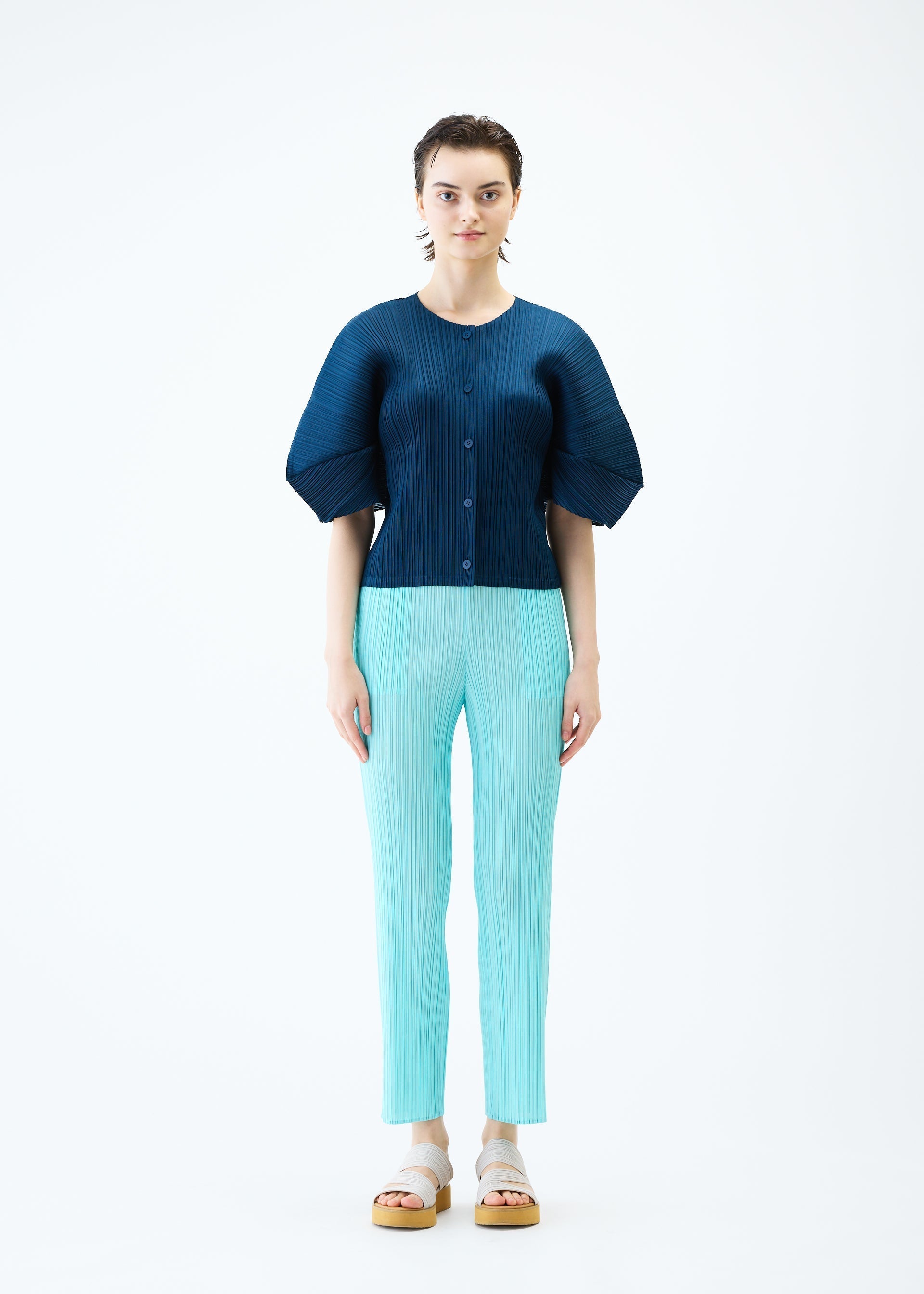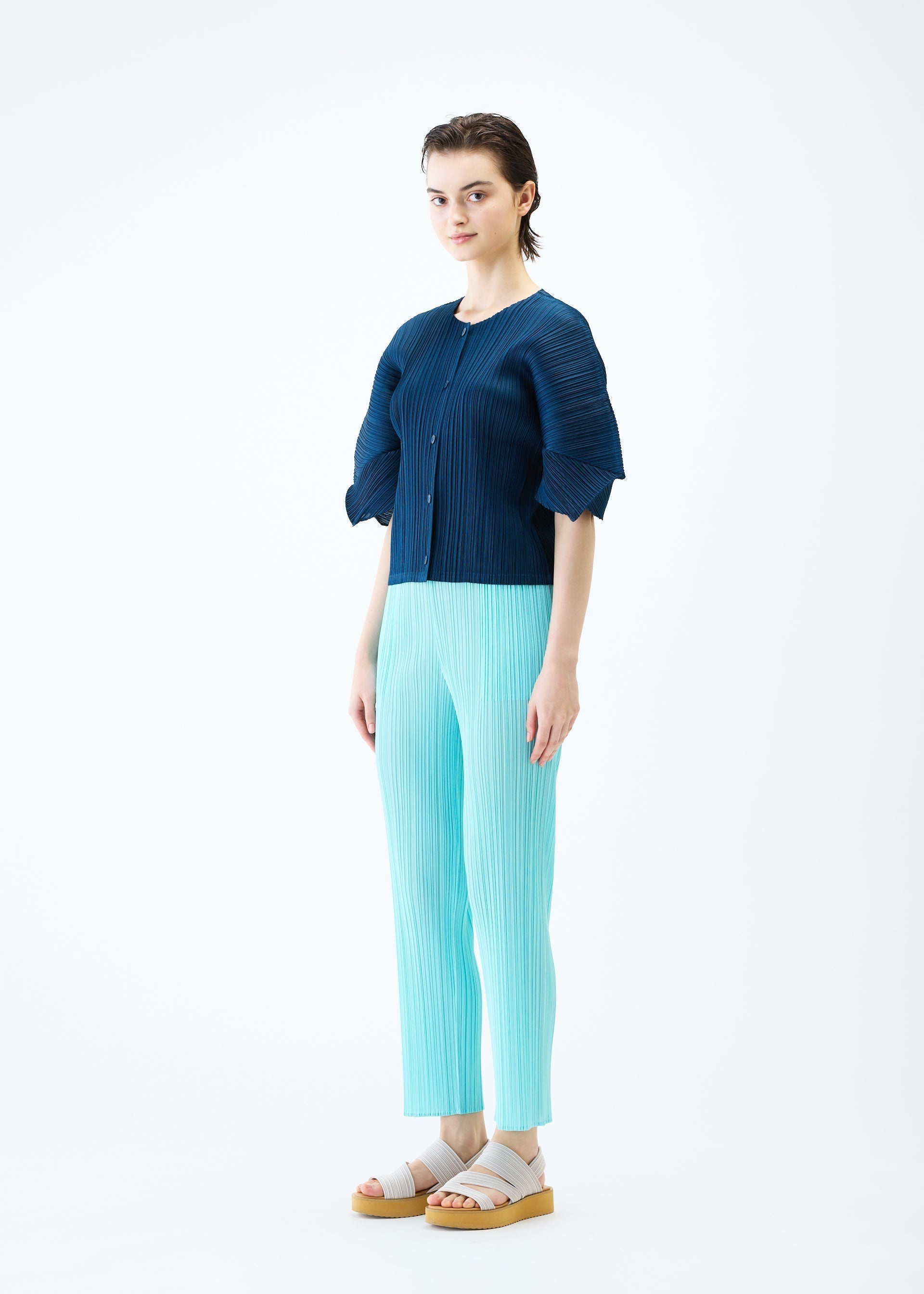 These thin pants are available in colors inspired by the sparkling look of the surface of water. They have pockets on both sides.
