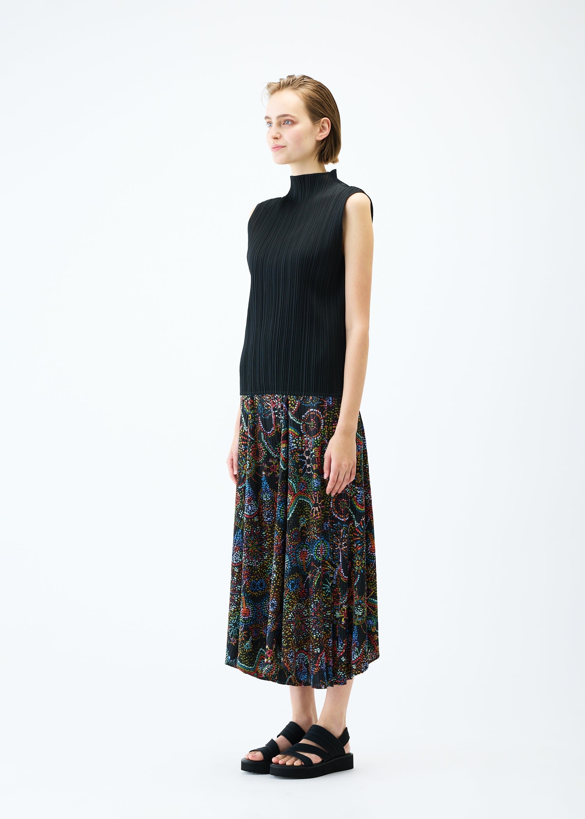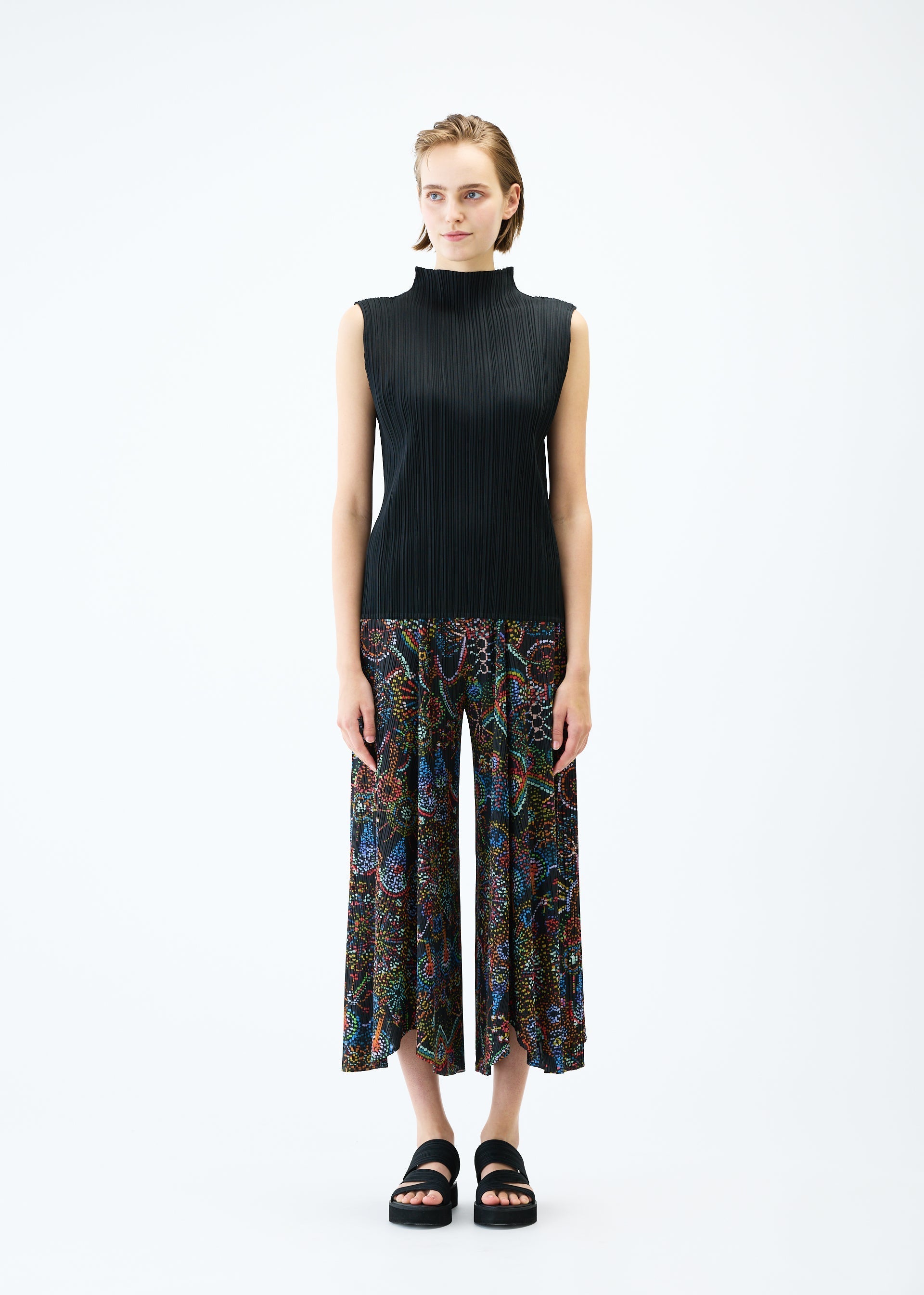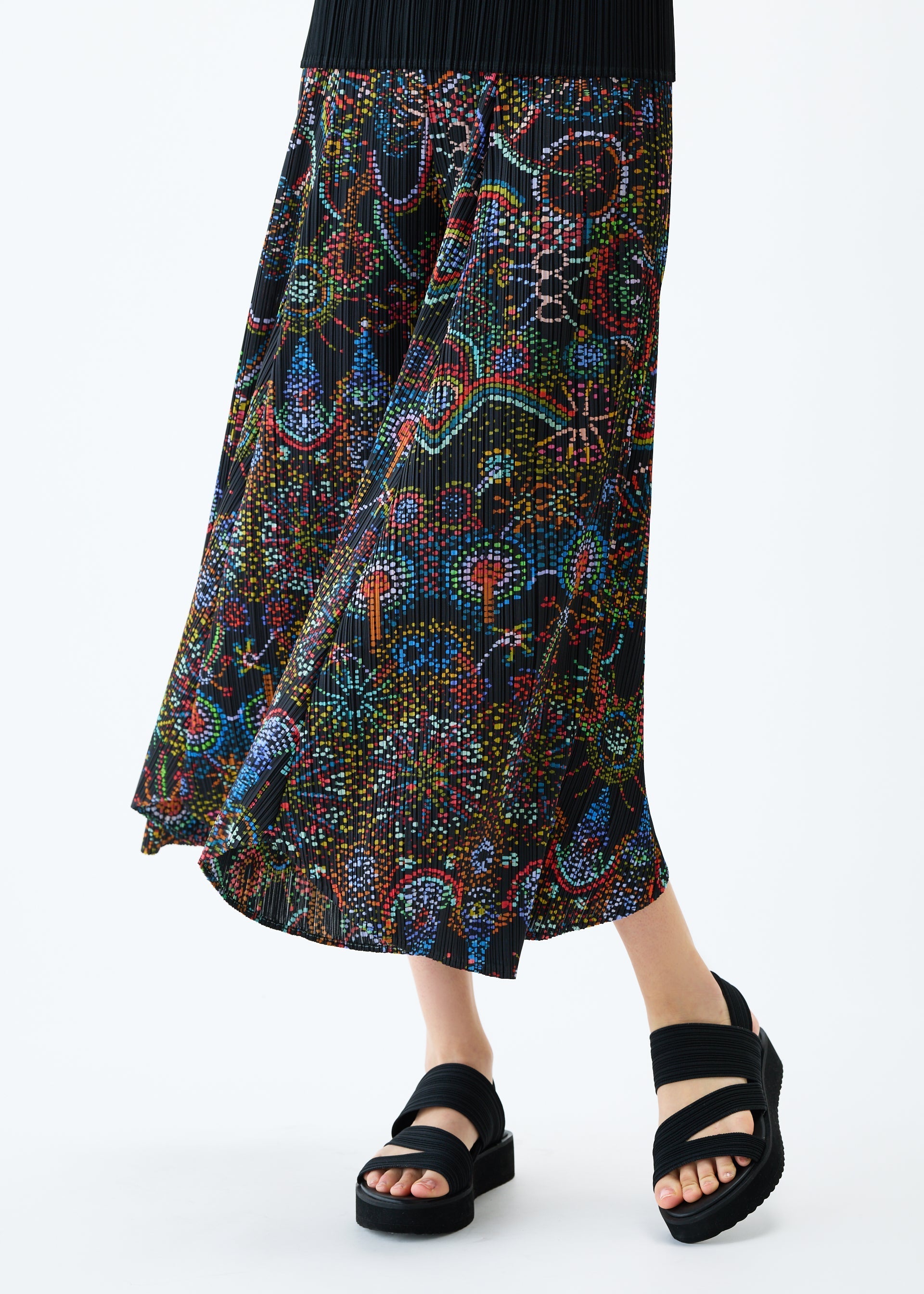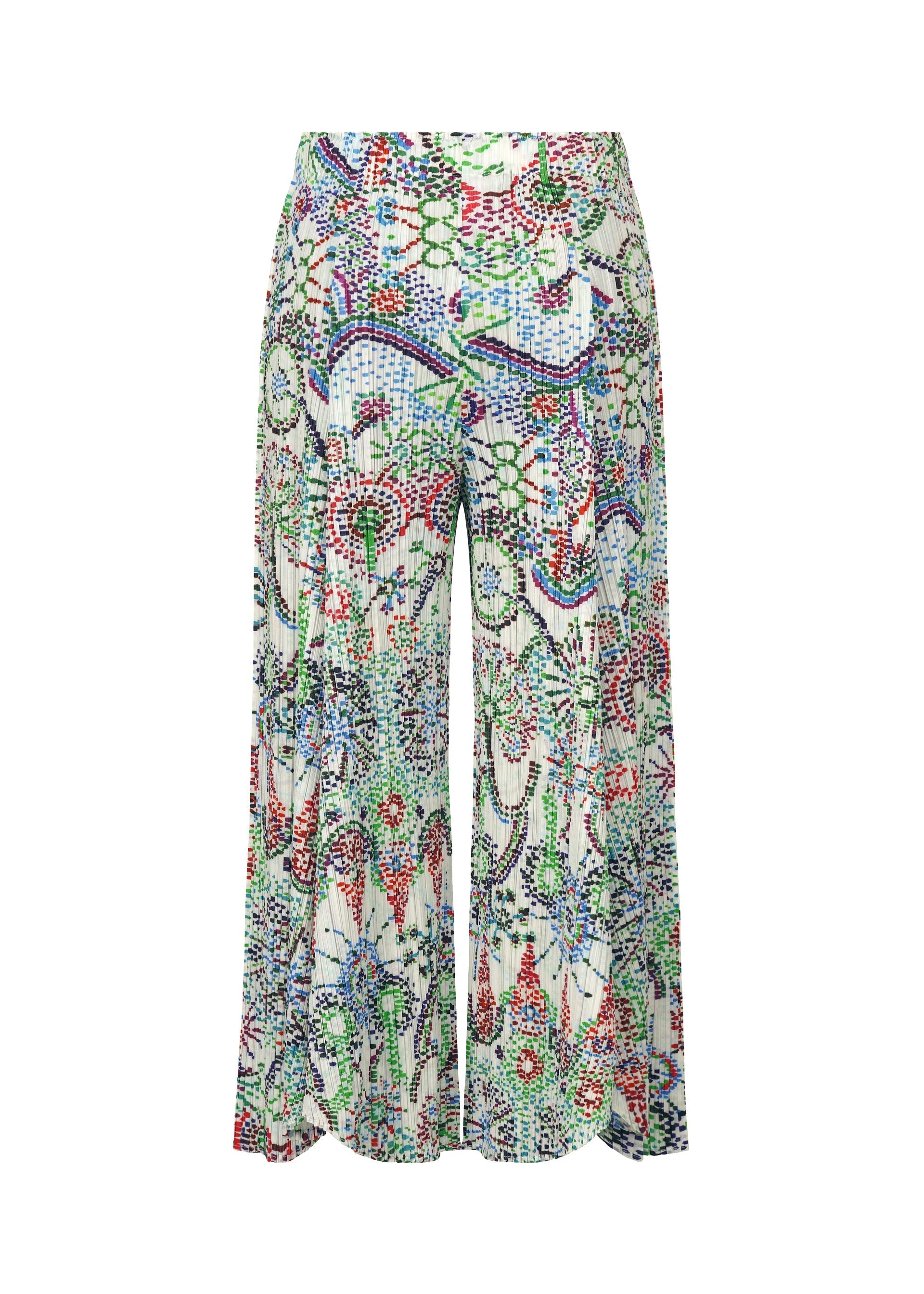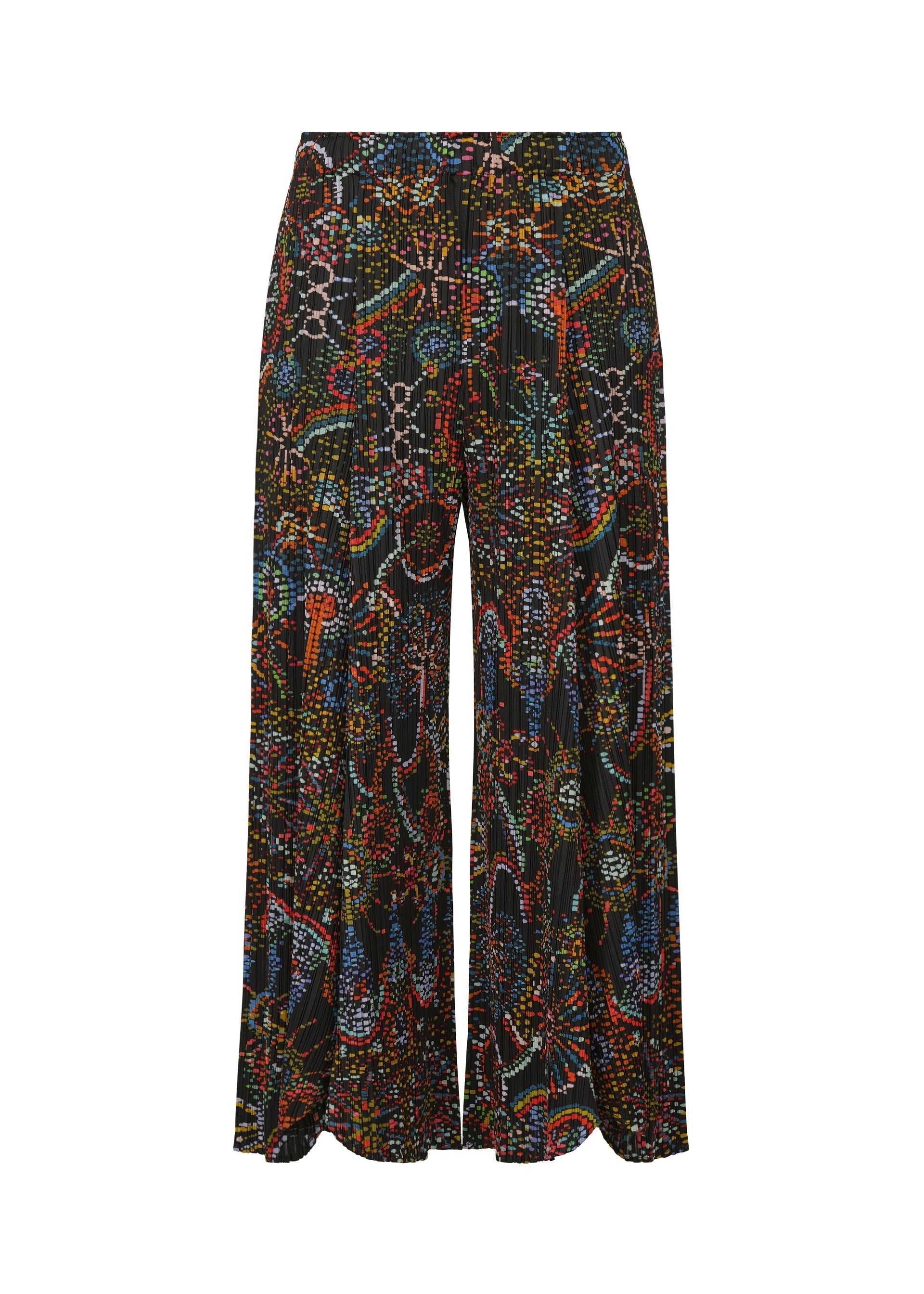 These flared pants have a print featuring the motif of fireworks that evoke a sense of innocence and warmth. They depict fireworks with dots that look like blurred ink. They have pockets on both sides.