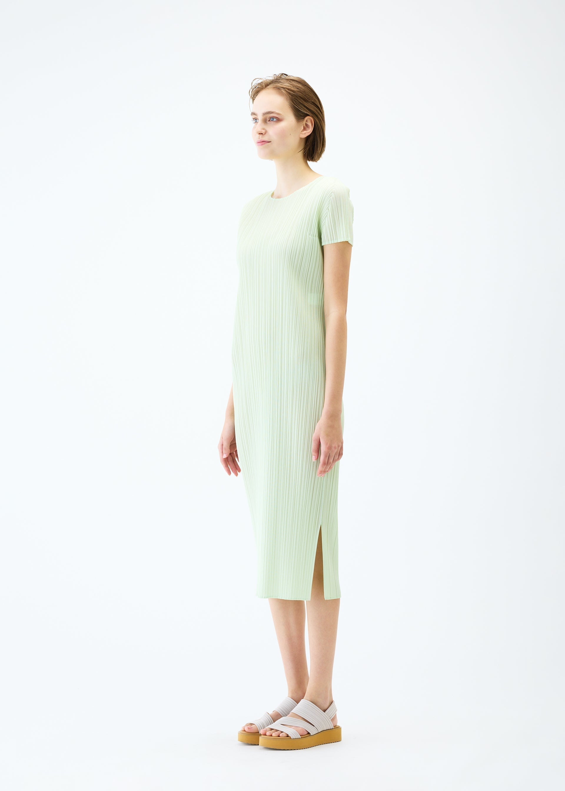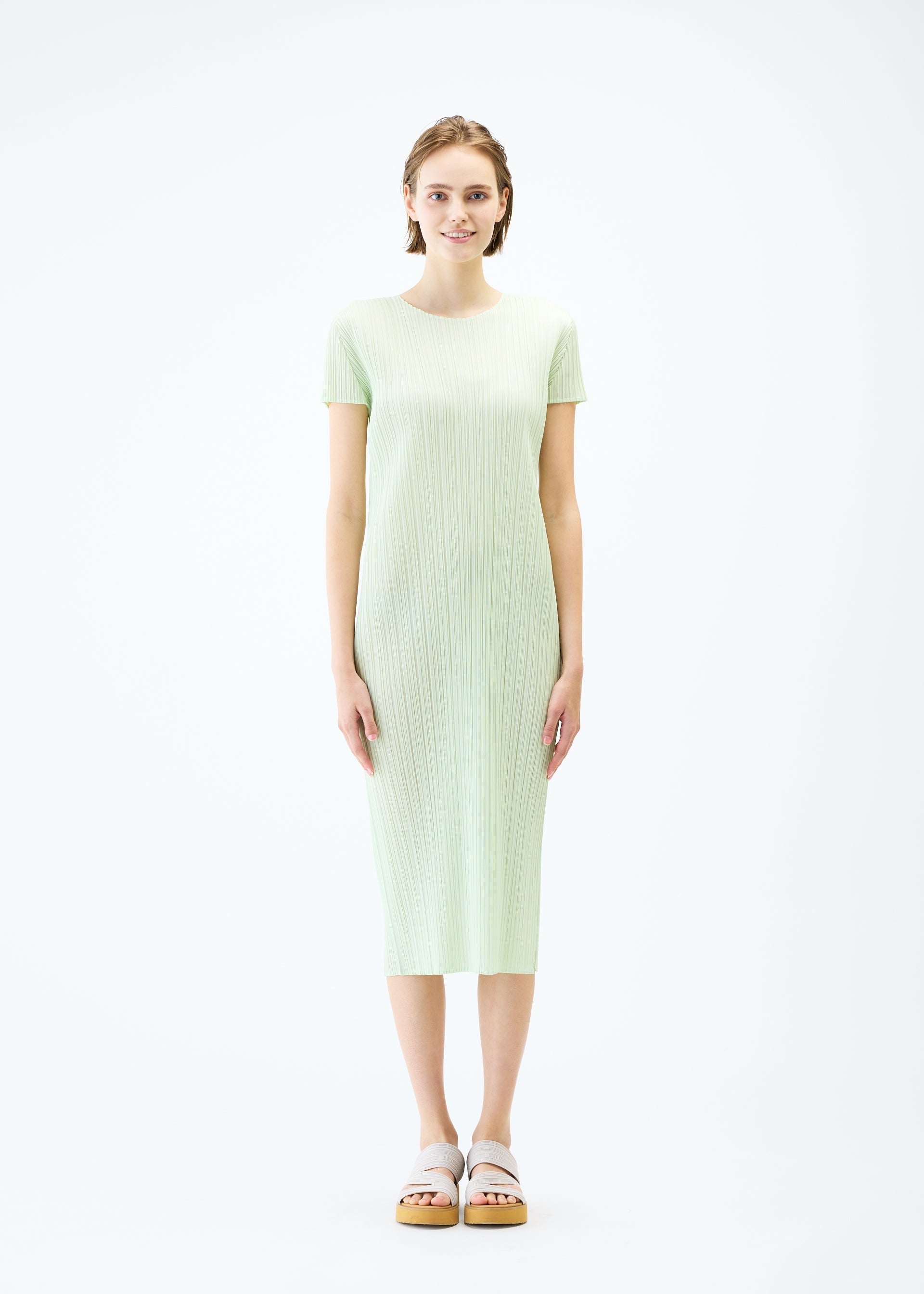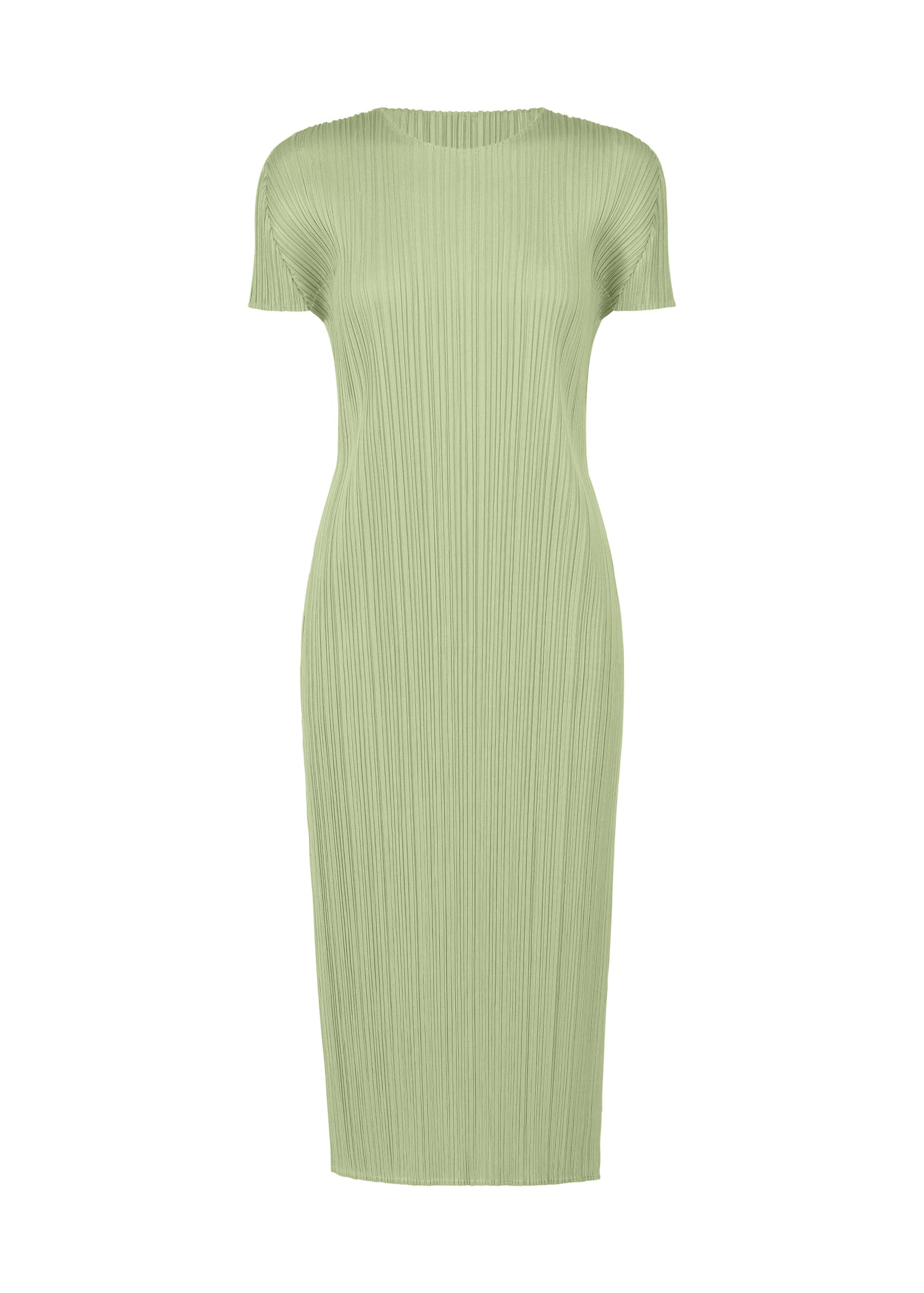 This round-neck, short-sleeved dress is available in colors reminiscent of the gentle light of early summer. The green gradation is expressed in soft, subdued hues. There are pockets on both sides.