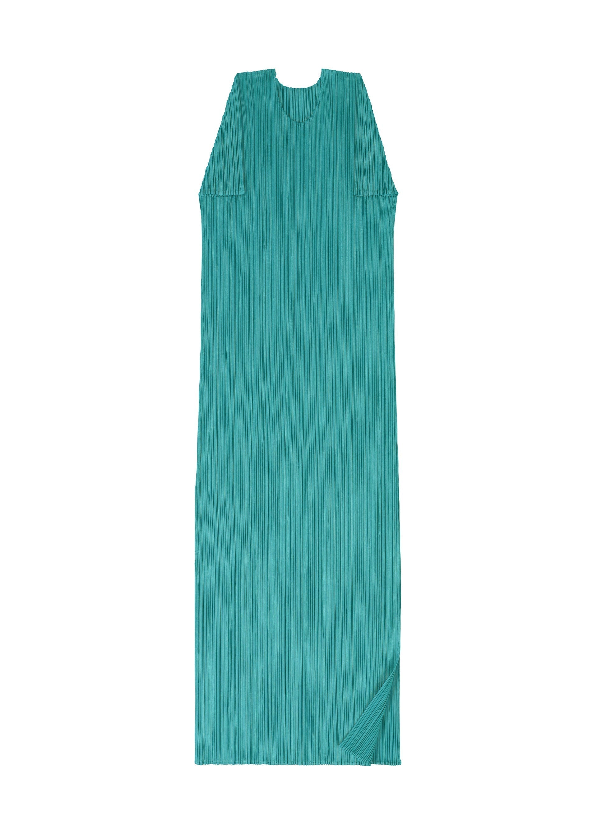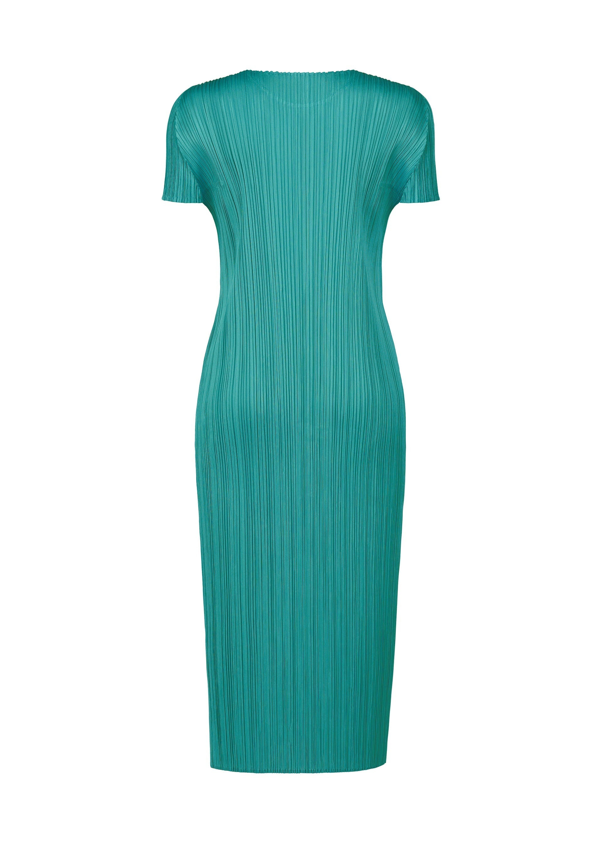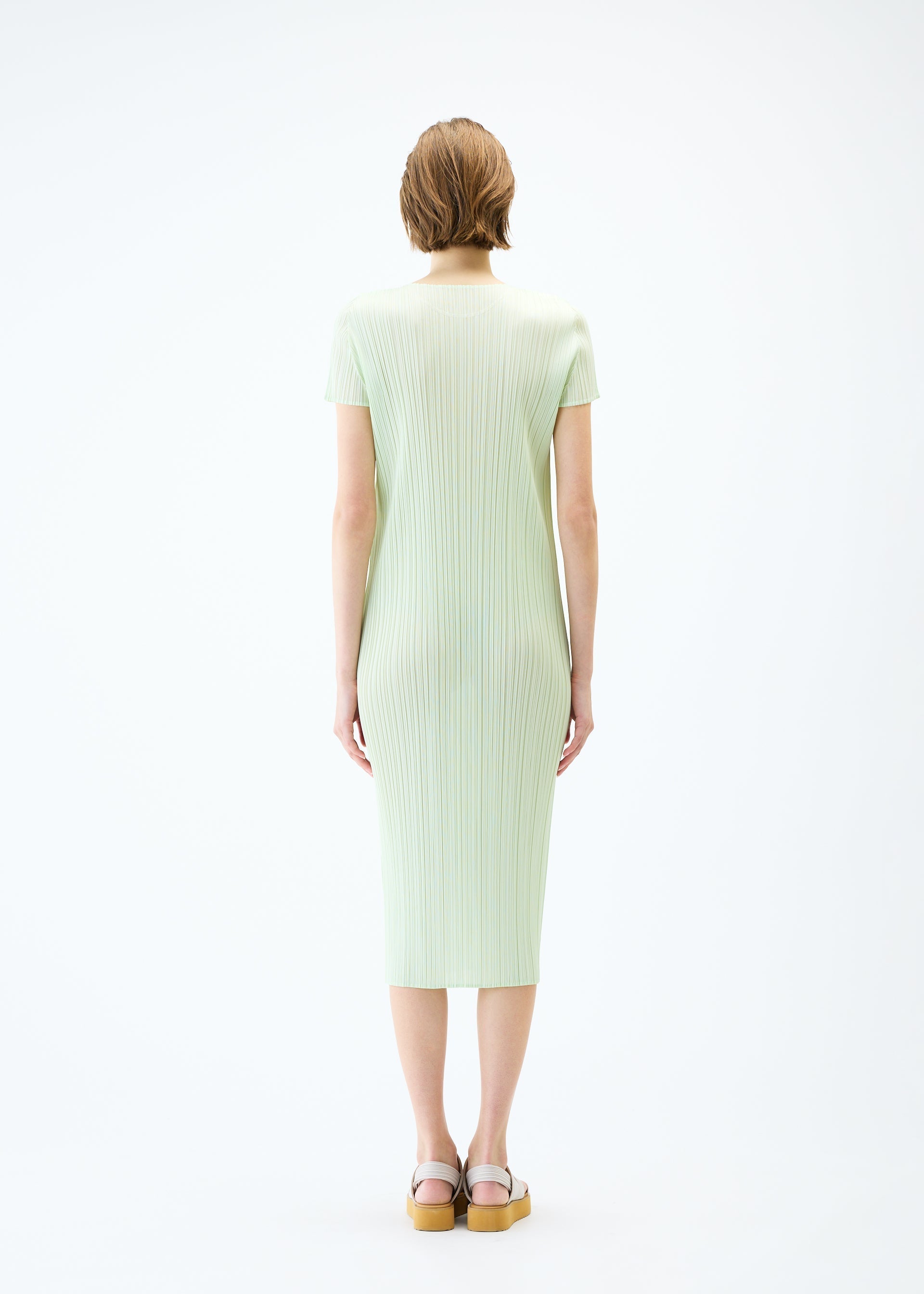 This round-neck, short-sleeved dress is available in colors reminiscent of the gentle light of early summer. The green gradation is expressed in soft, subdued hues. There are pockets on both sides.