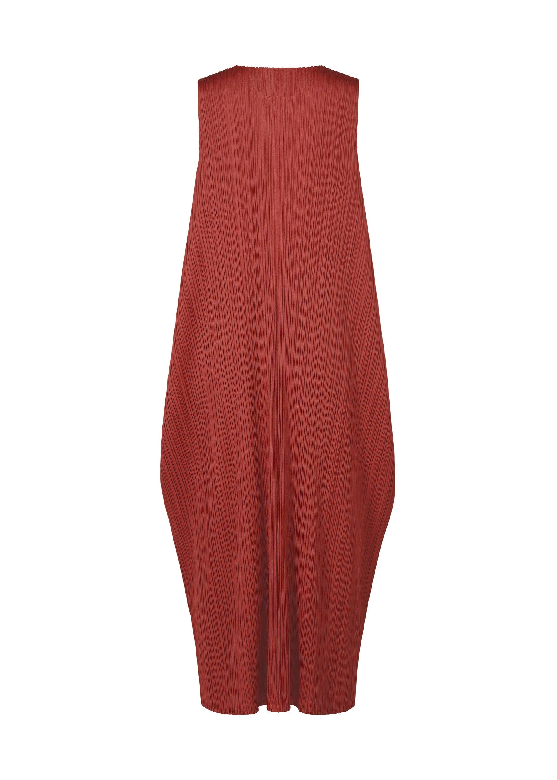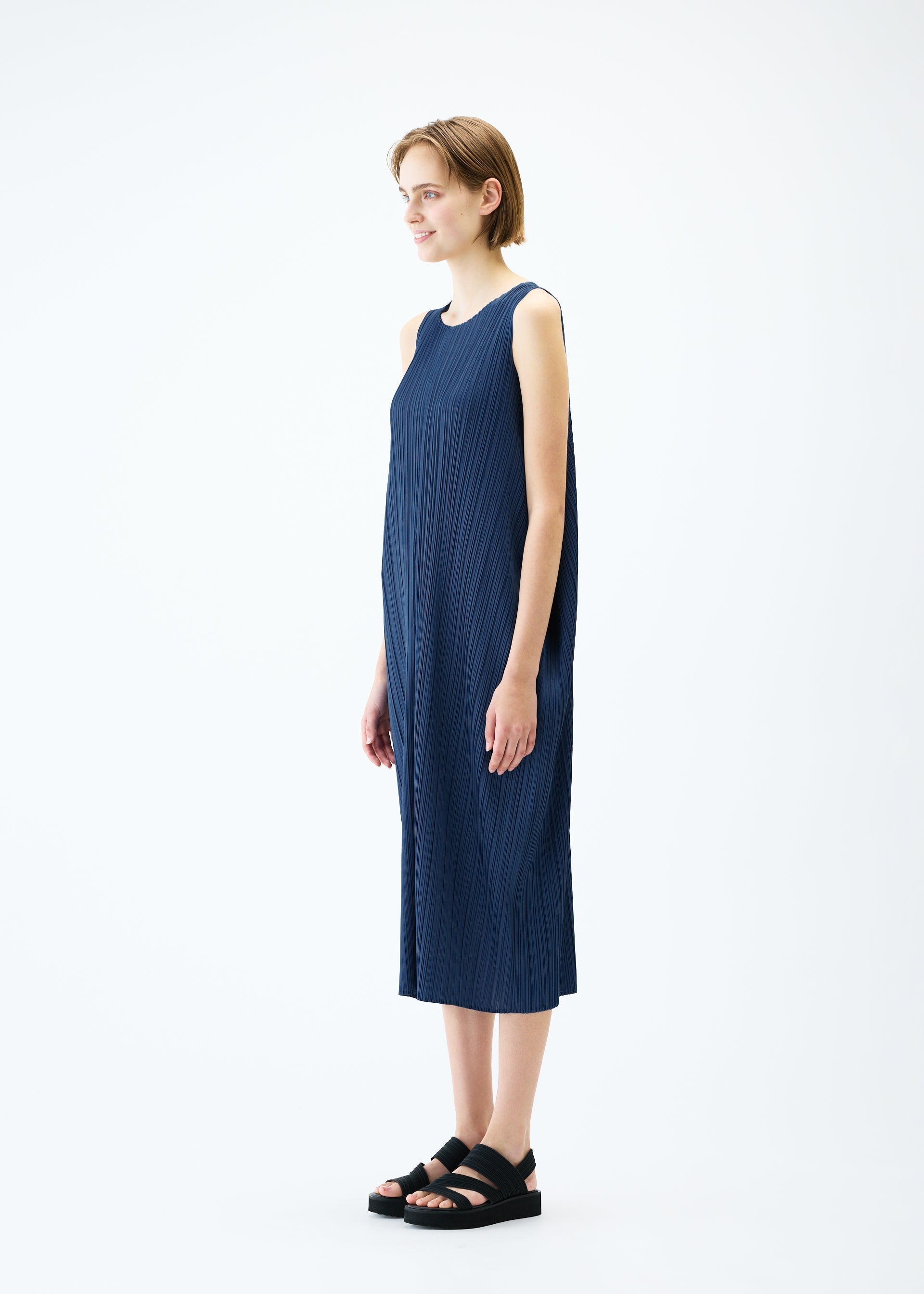 A crew neck sleeveless dress with a dressy and soft silhouette. The space under both sides created by turning it inside out after pleating creates an elegant silhouette.