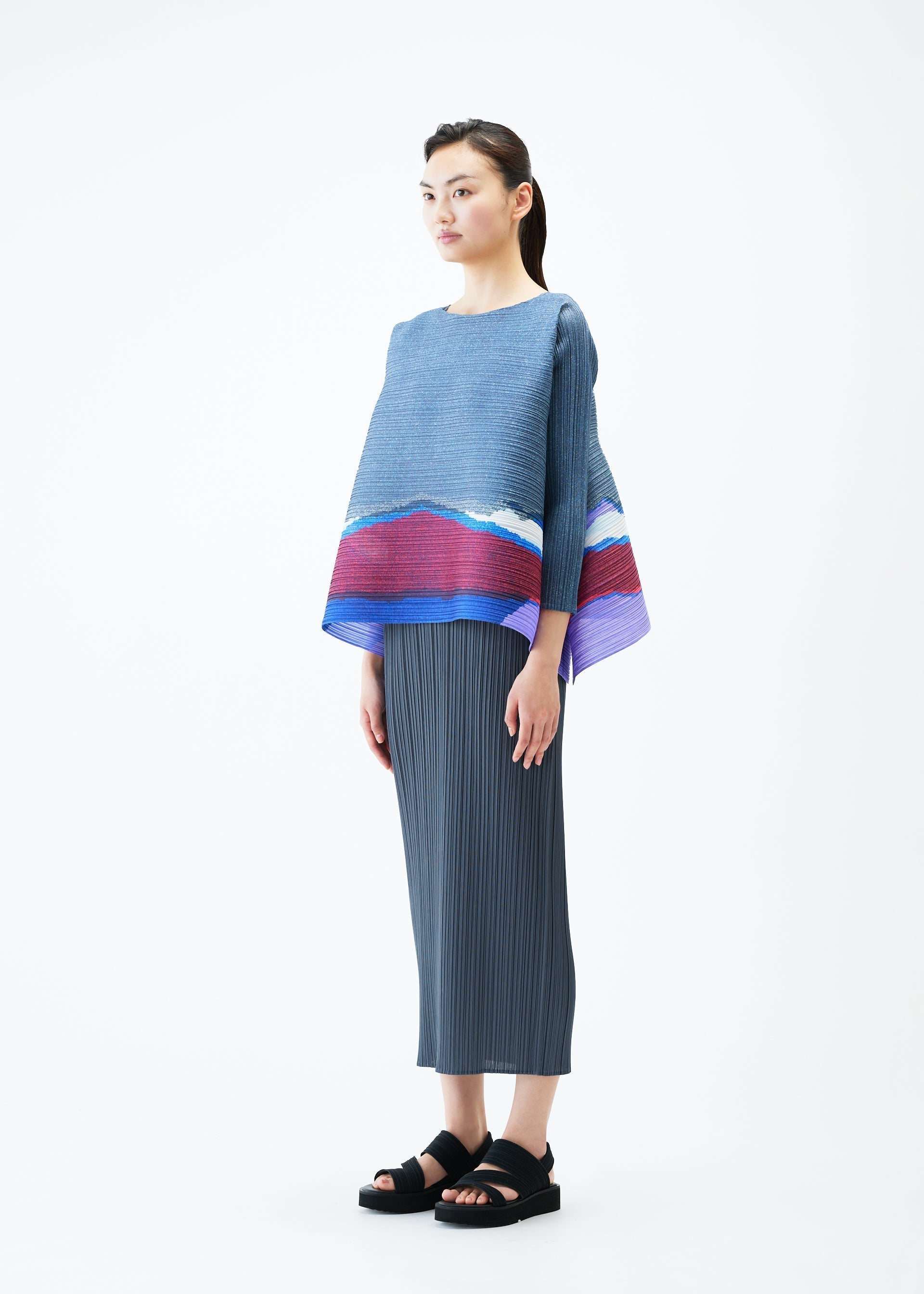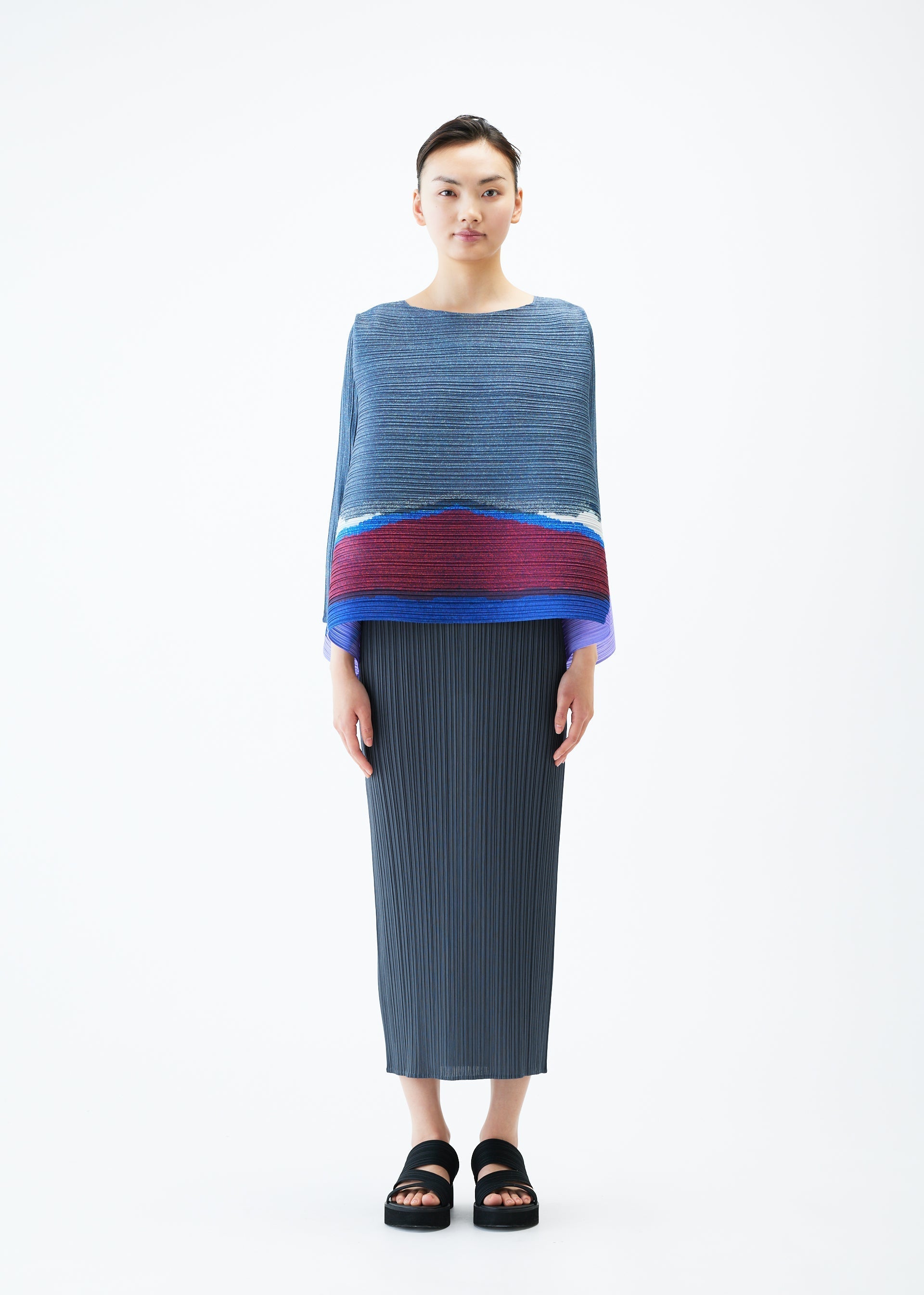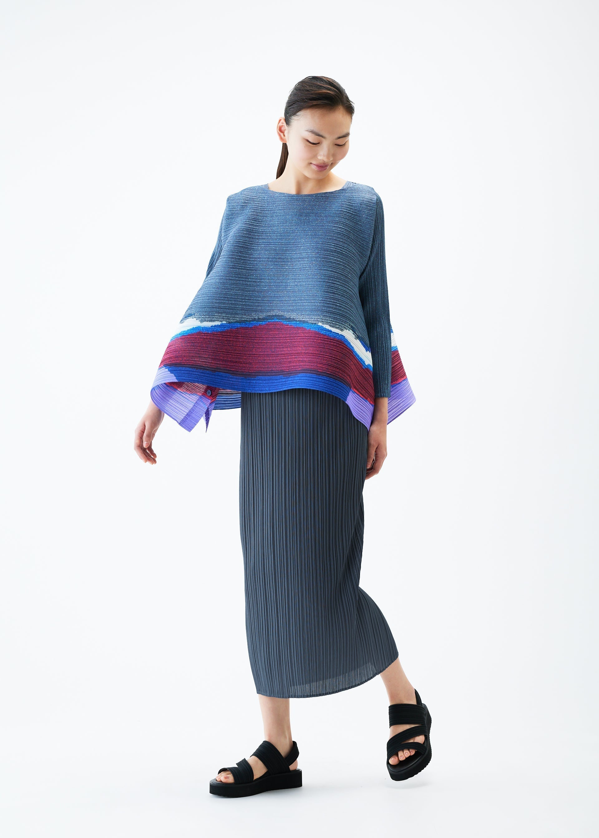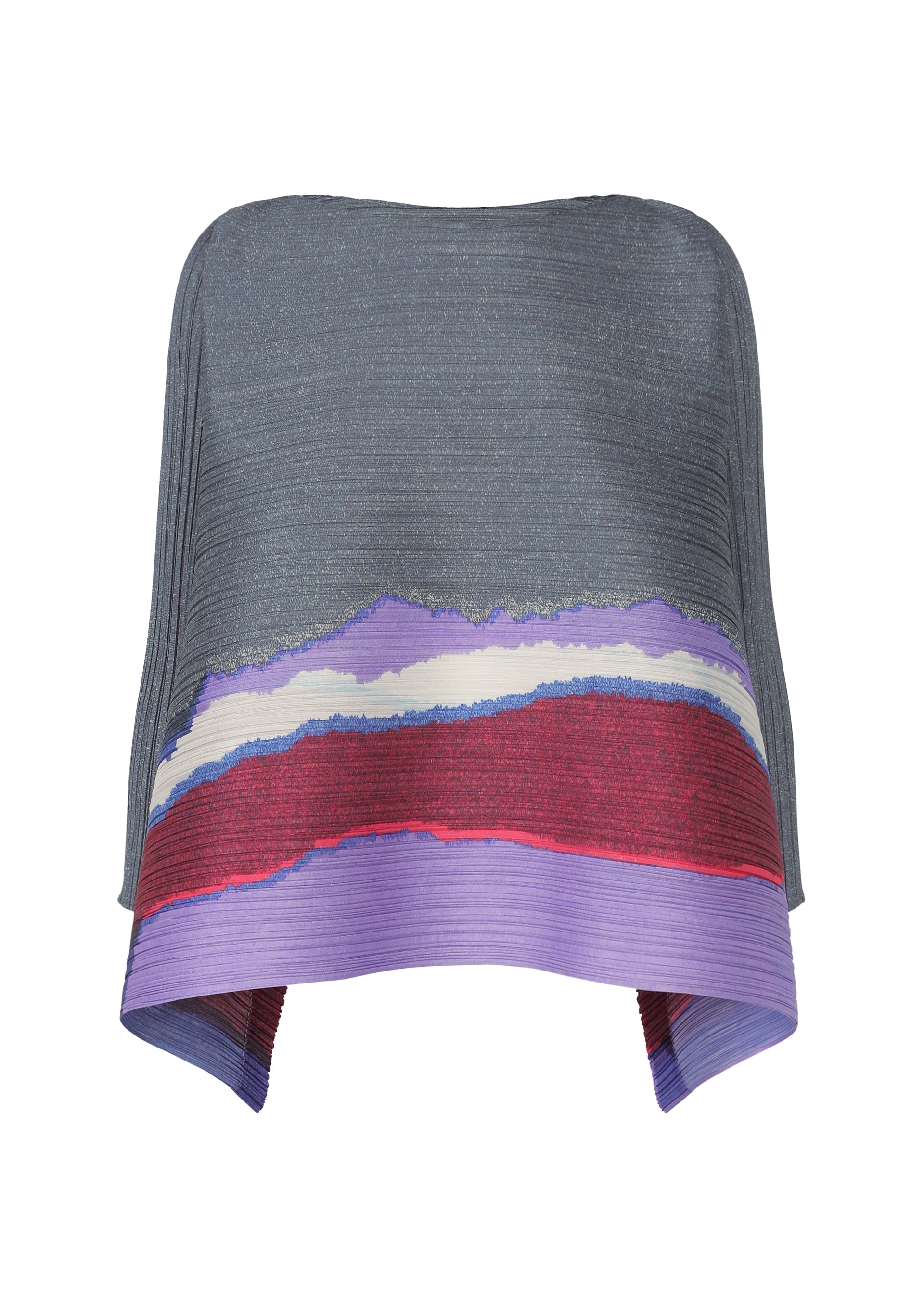 This round-neck, long-sleeved top with horizontal pleats is from a series that uses stencil printing to express a cut-and-pasted pattern of colored paper while preserving the graininess of the colors and misalignment of the print. It has buttons on both sides.
