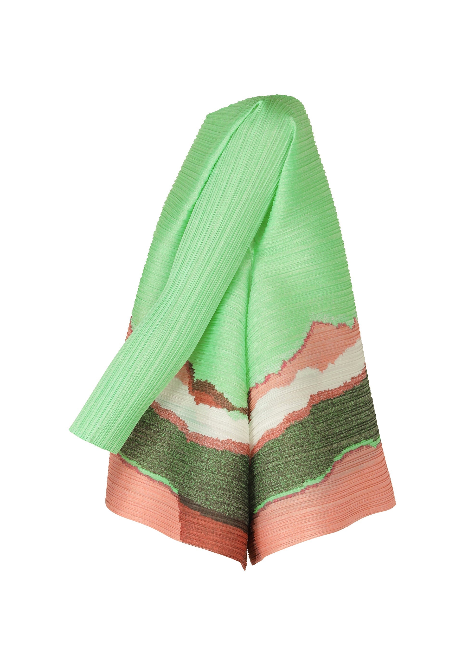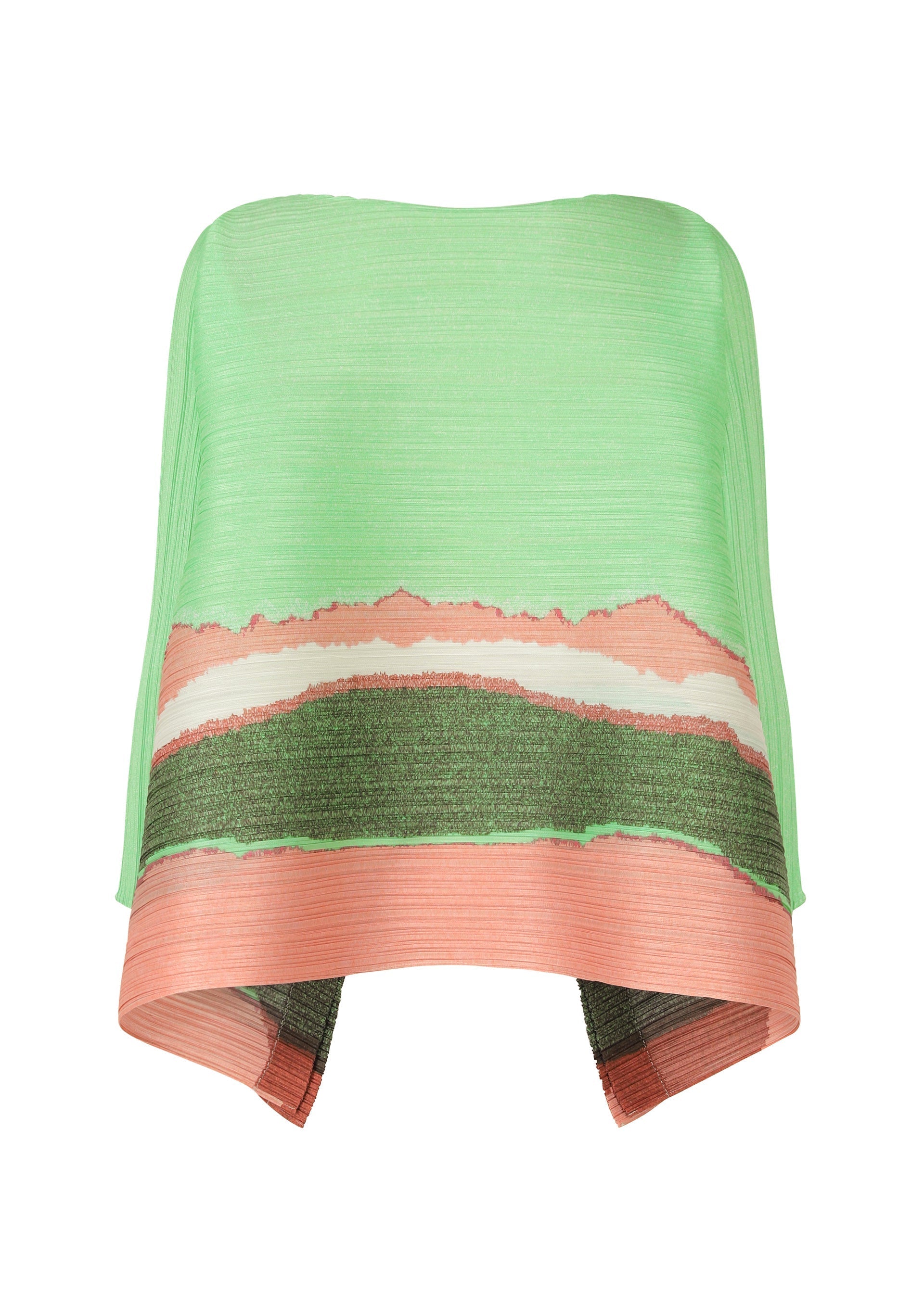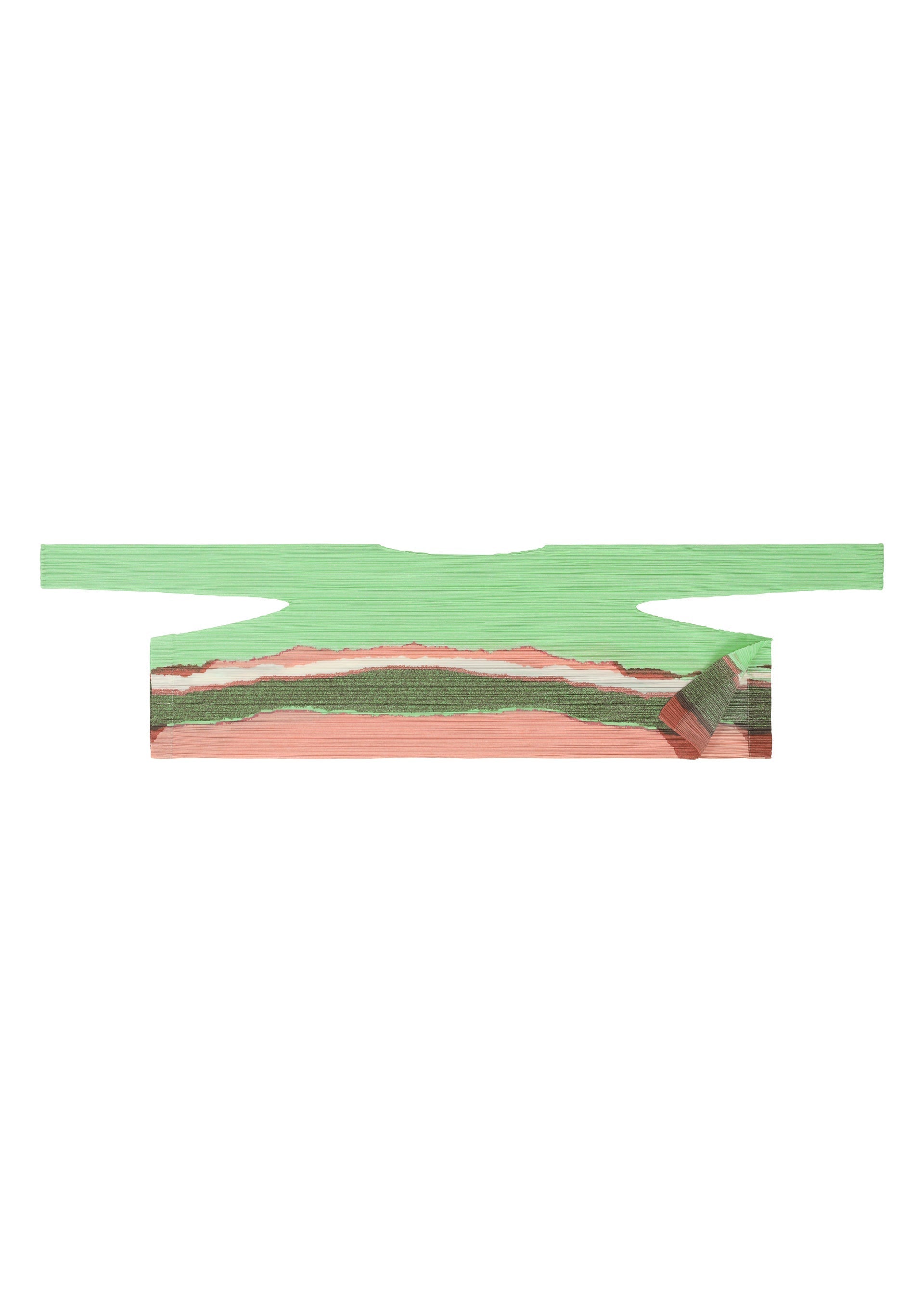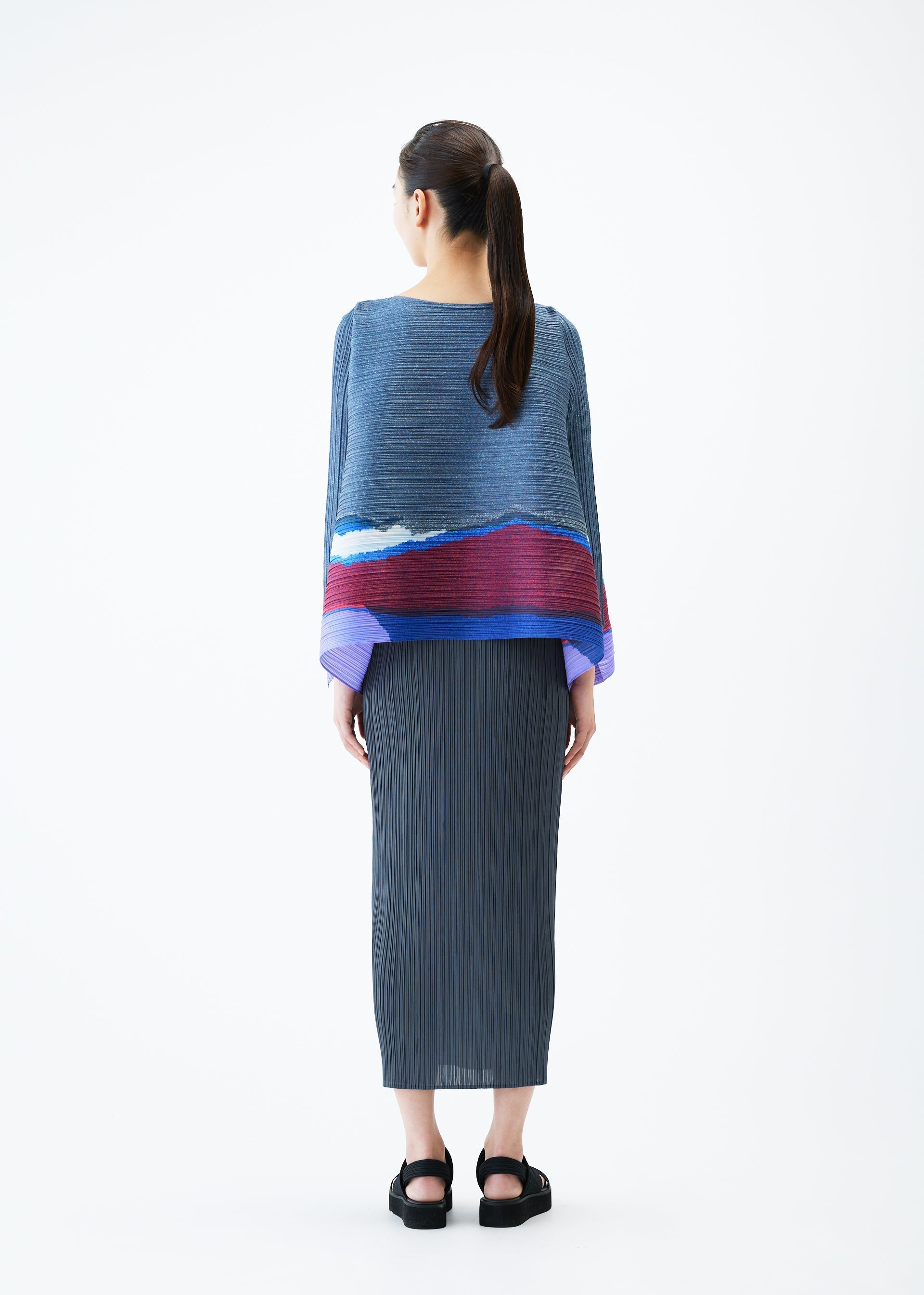 This round-neck, long-sleeved top with horizontal pleats is from a series that uses stencil printing to express a cut-and-pasted pattern of colored paper while preserving the graininess of the colors and misalignment of the print. It has buttons on both sides.