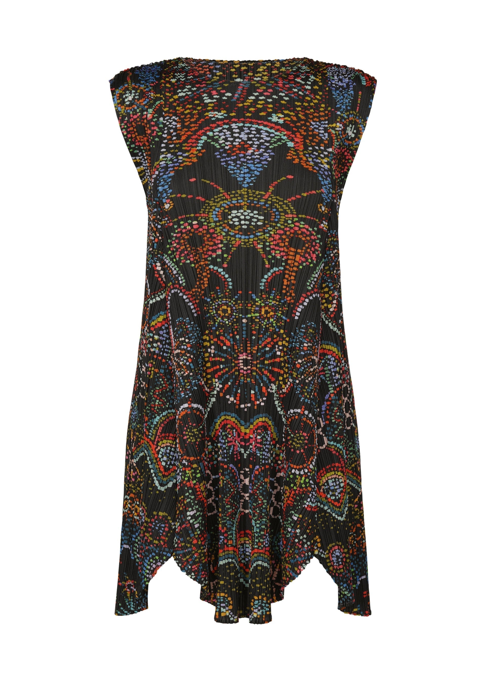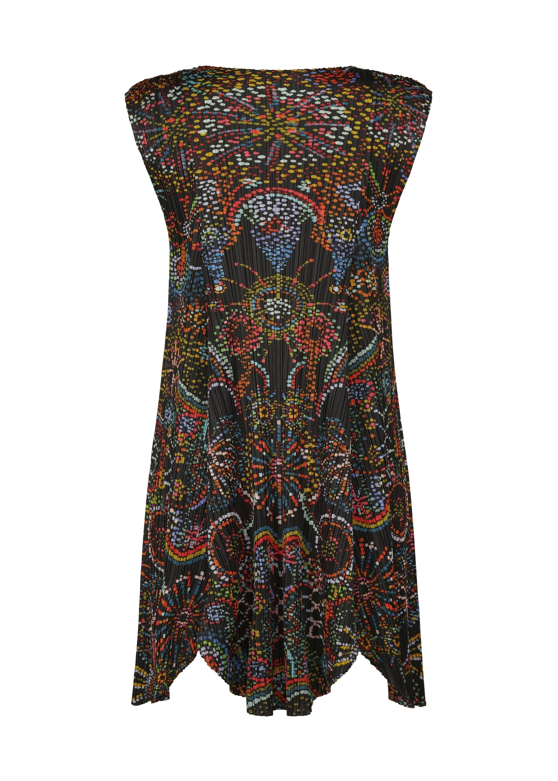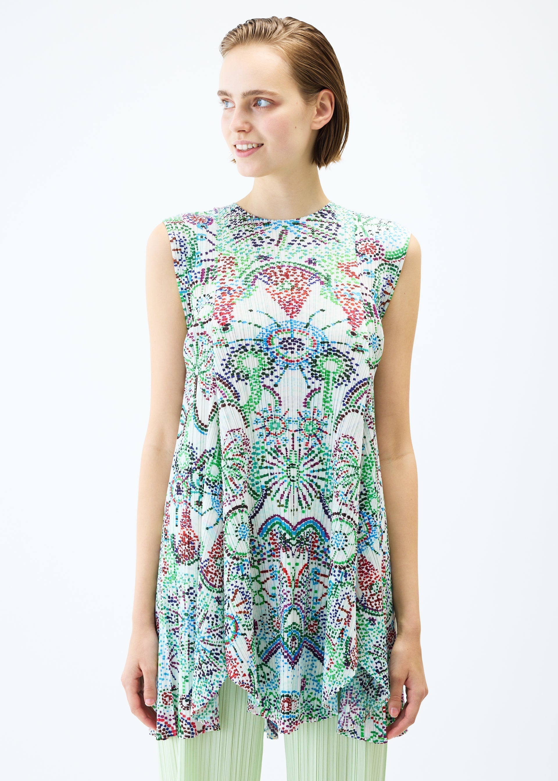 This round-neck, sleeveless tunic has a print featuring the motif of fireworks that evoke a sense of innocence and warmth. It depicts fireworks with dots that look like blurred ink.